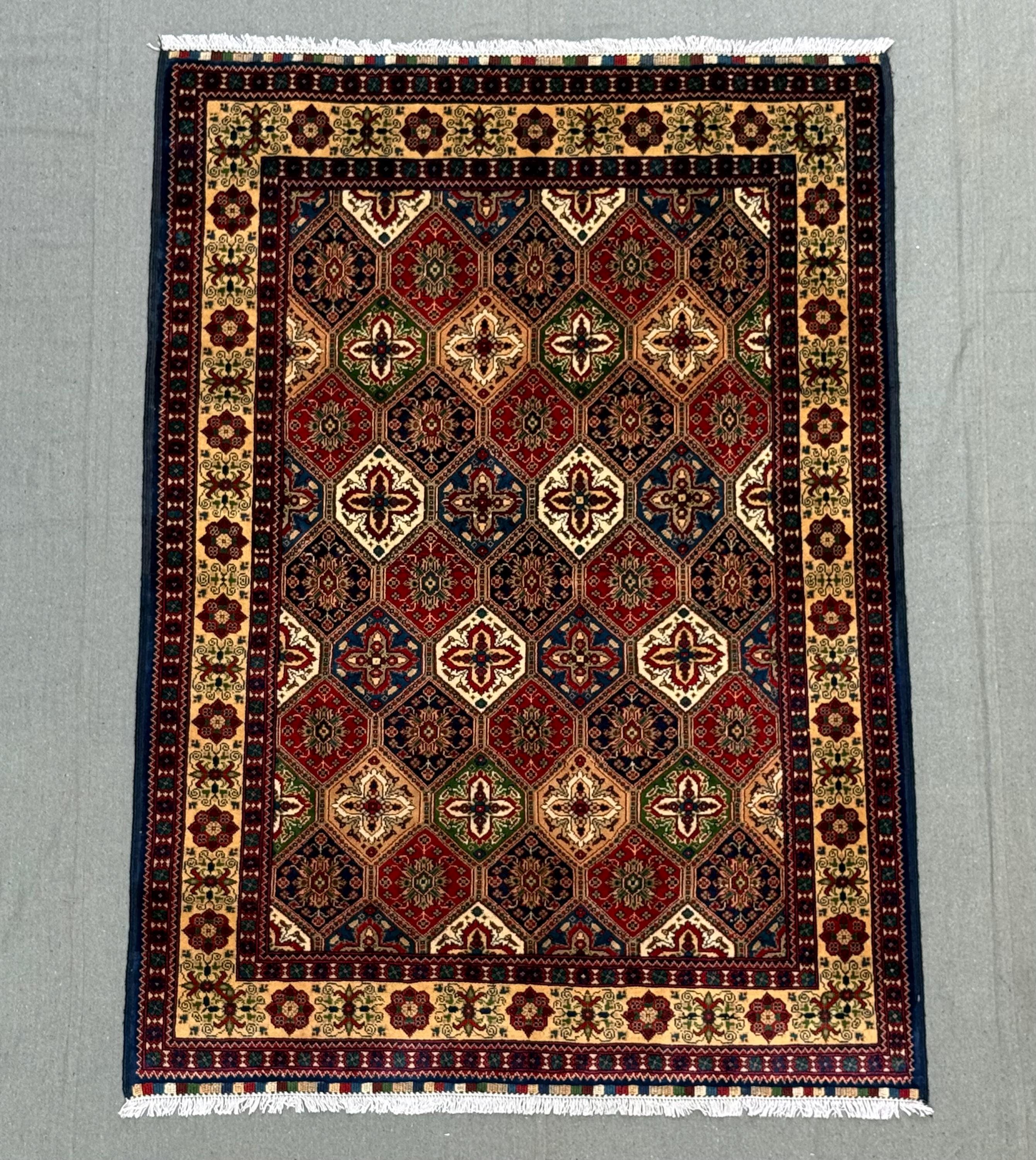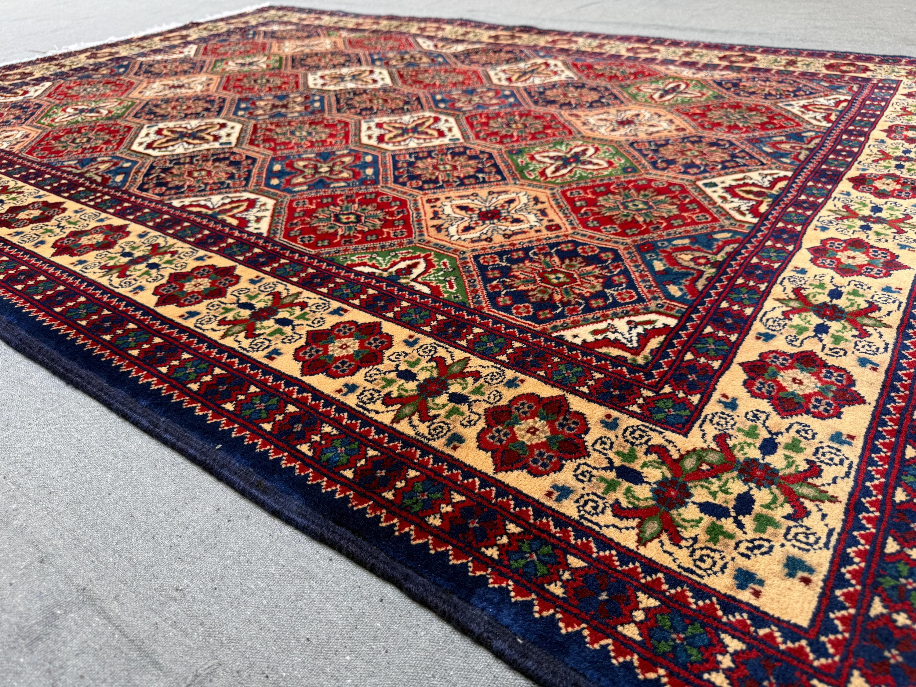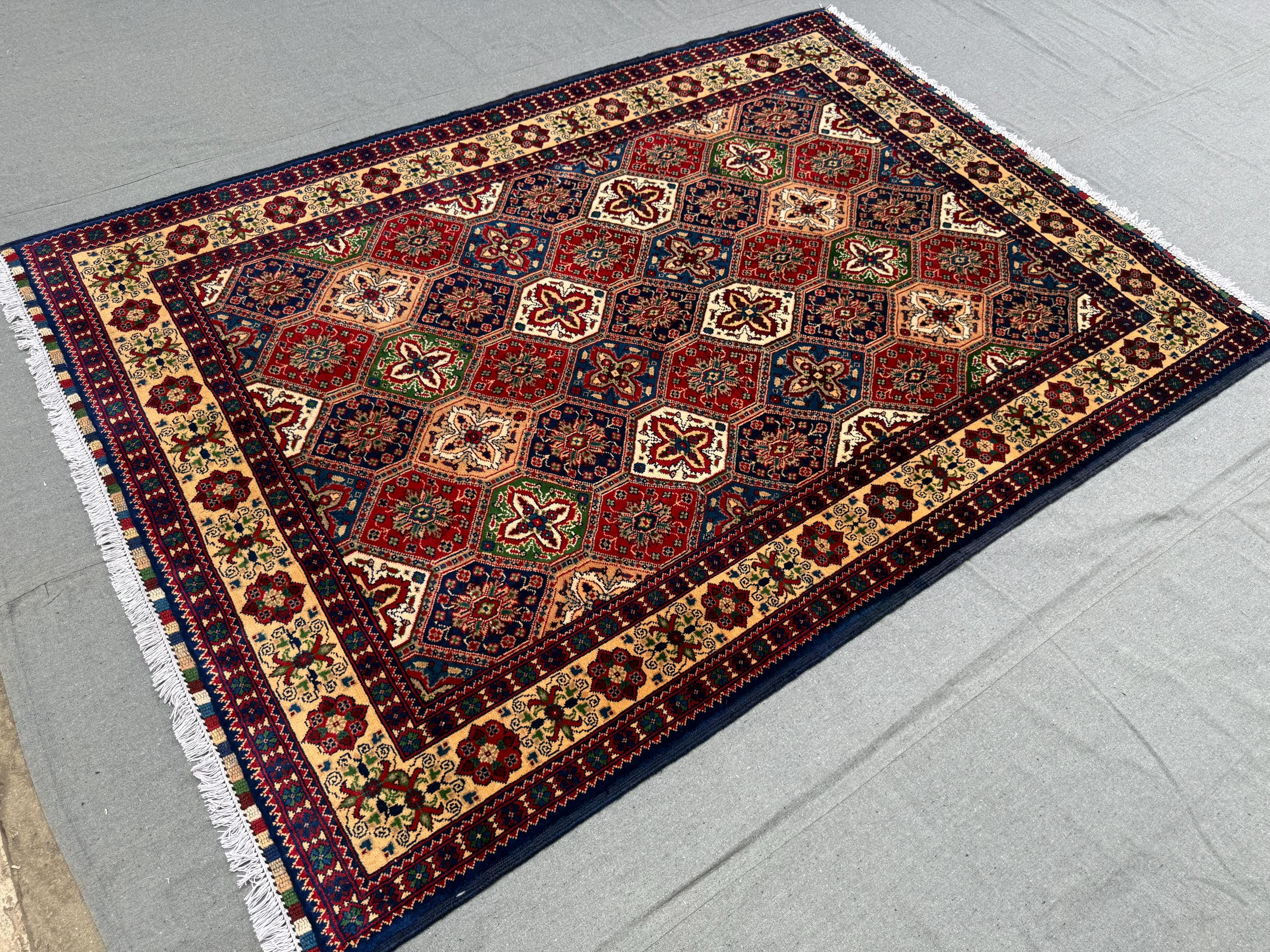 Woven with 100% handspun wool and dyed with natural vegetable colors, this rug delivers both authenticity and durability. Its approx. 5x7 ft size is perfect for medium-sized spaces such as living rooms, dining rooms, or bedrooms.