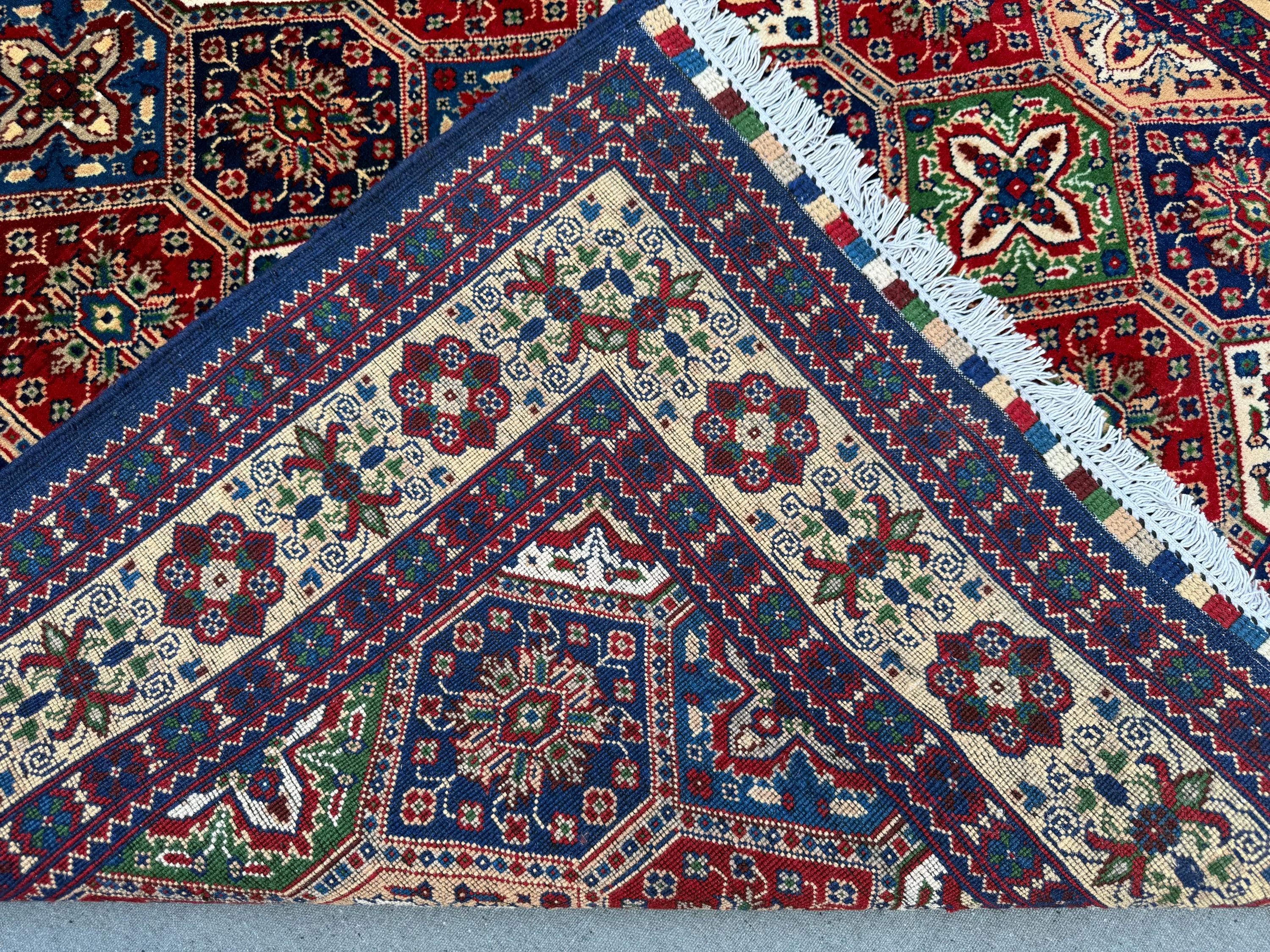 The Maranoos handmade wool rug is a refined and striking piece that features repeated hexagonal floral medallions in warm tones of red, ivory, green, and navy. Its elegant ivory border with detailed motifs enhances the richness of the central design.