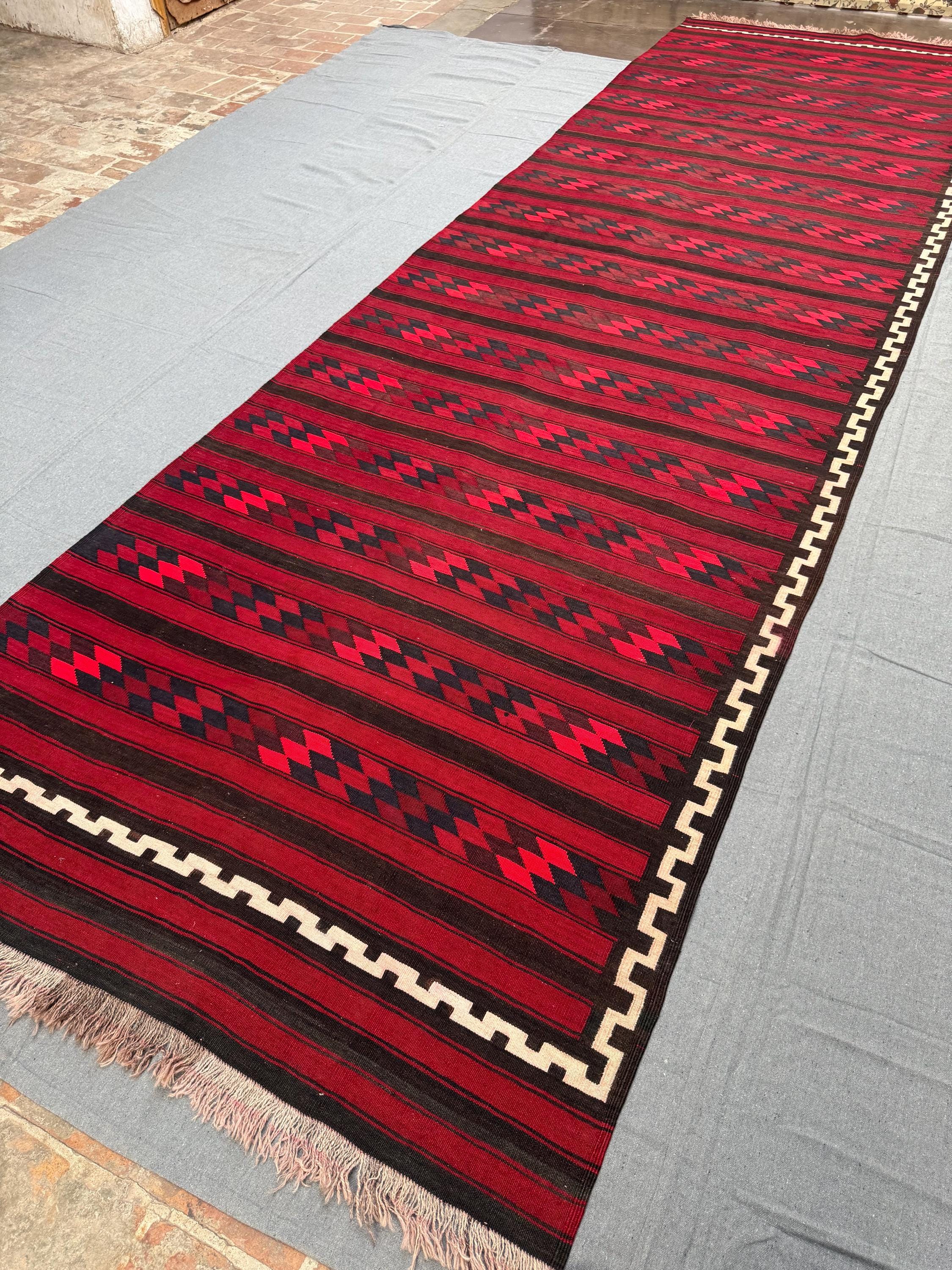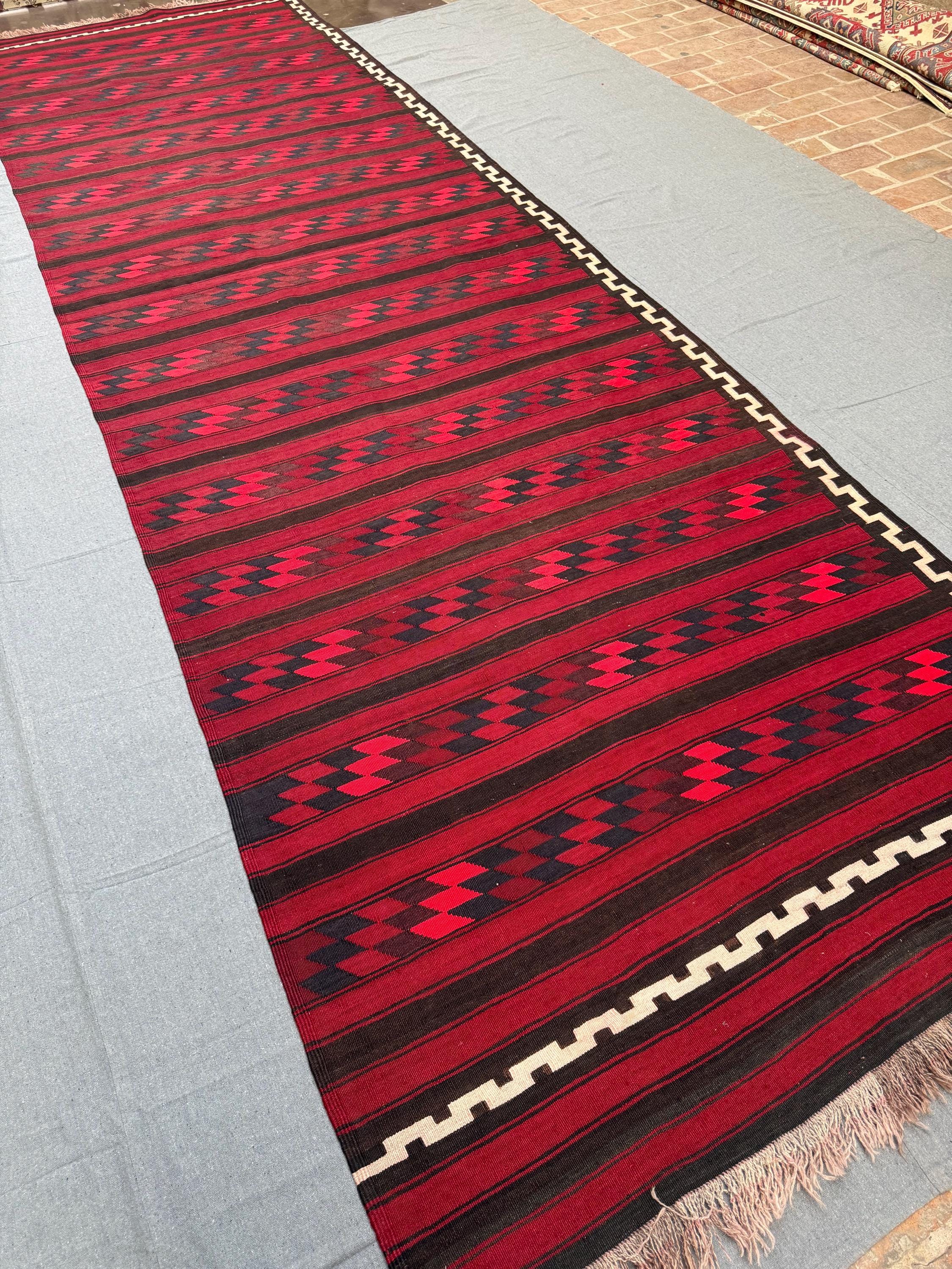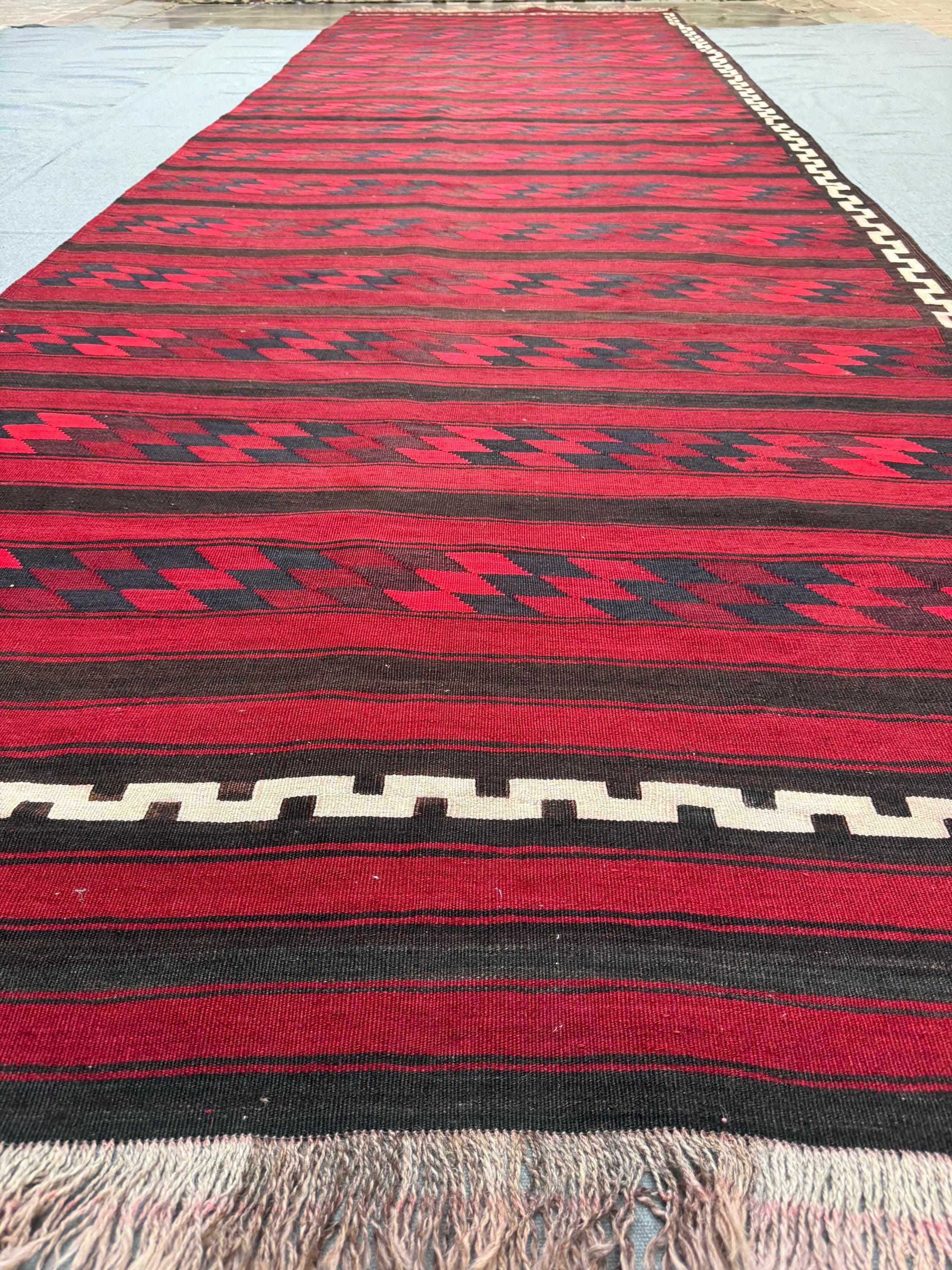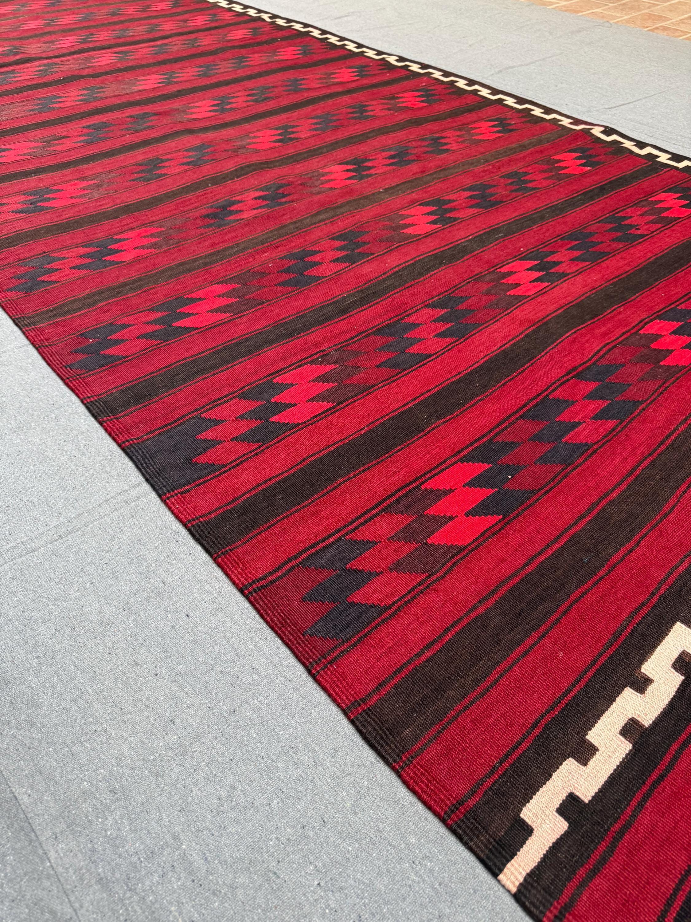 New Kilim Runner Rug 4.10x15.9 ft Handmade Wool Flatweave, Red Black Striped Tribal Carpet, Long Boho Hallway Rug, Geometric Area Décor
