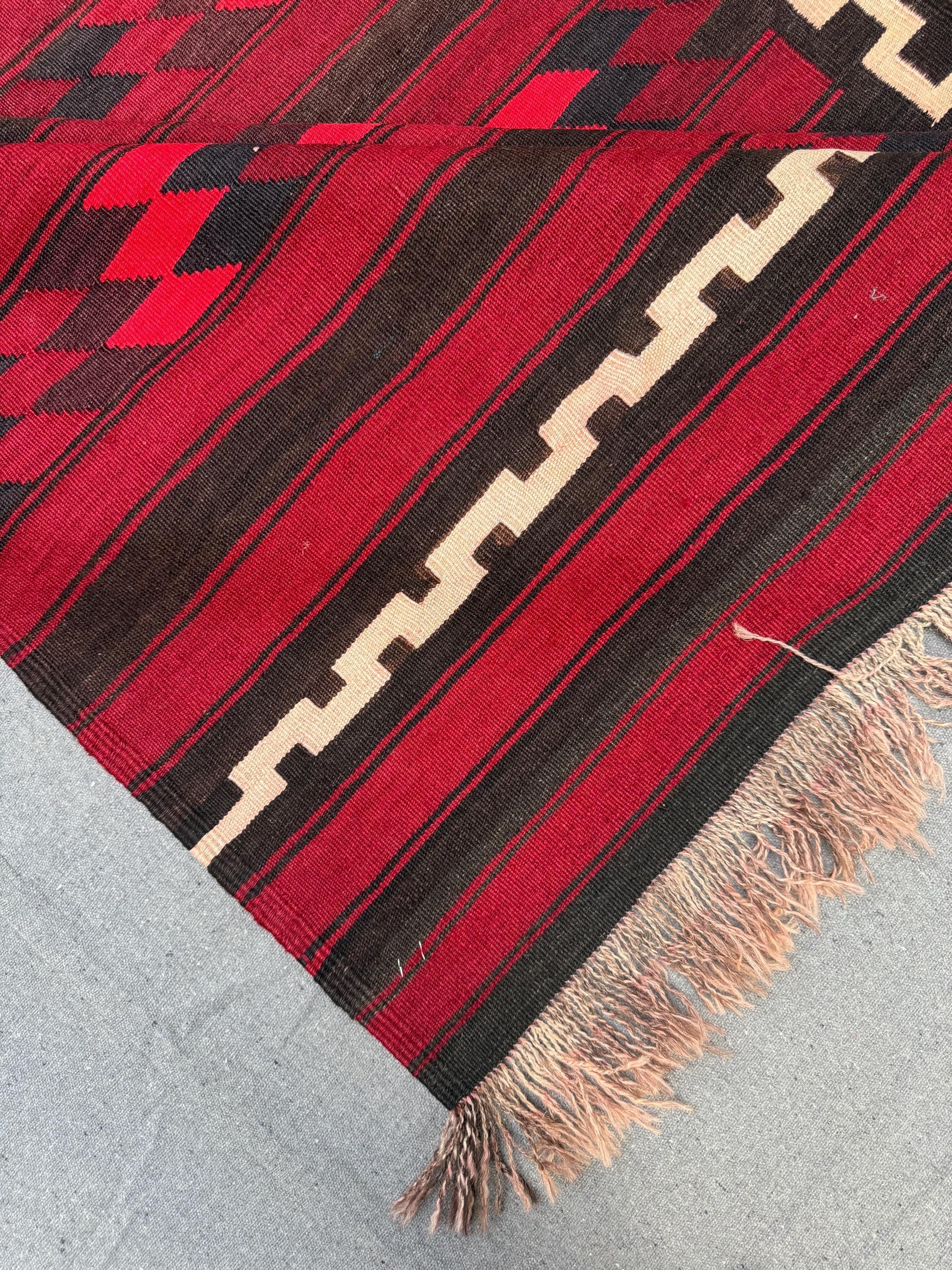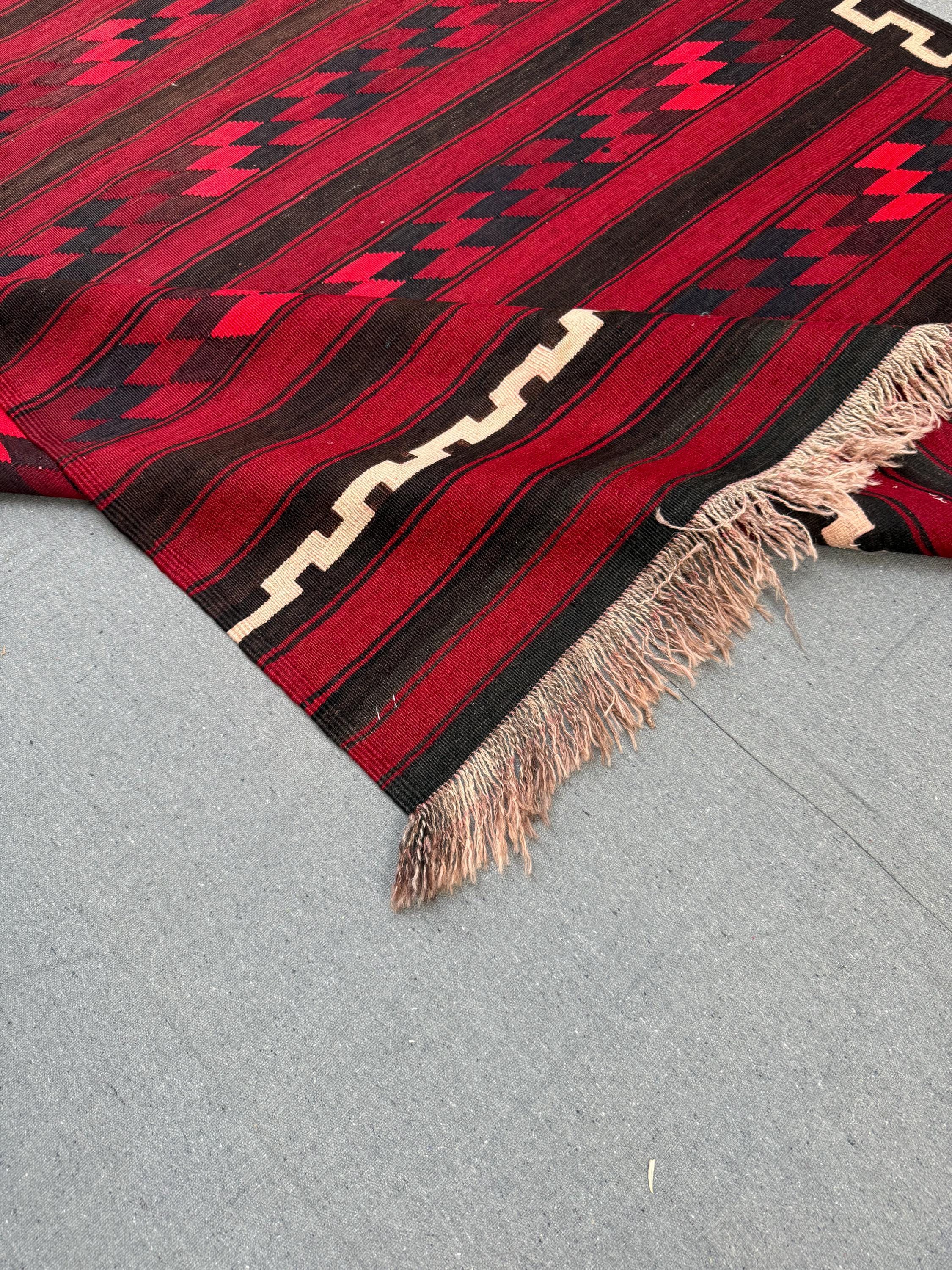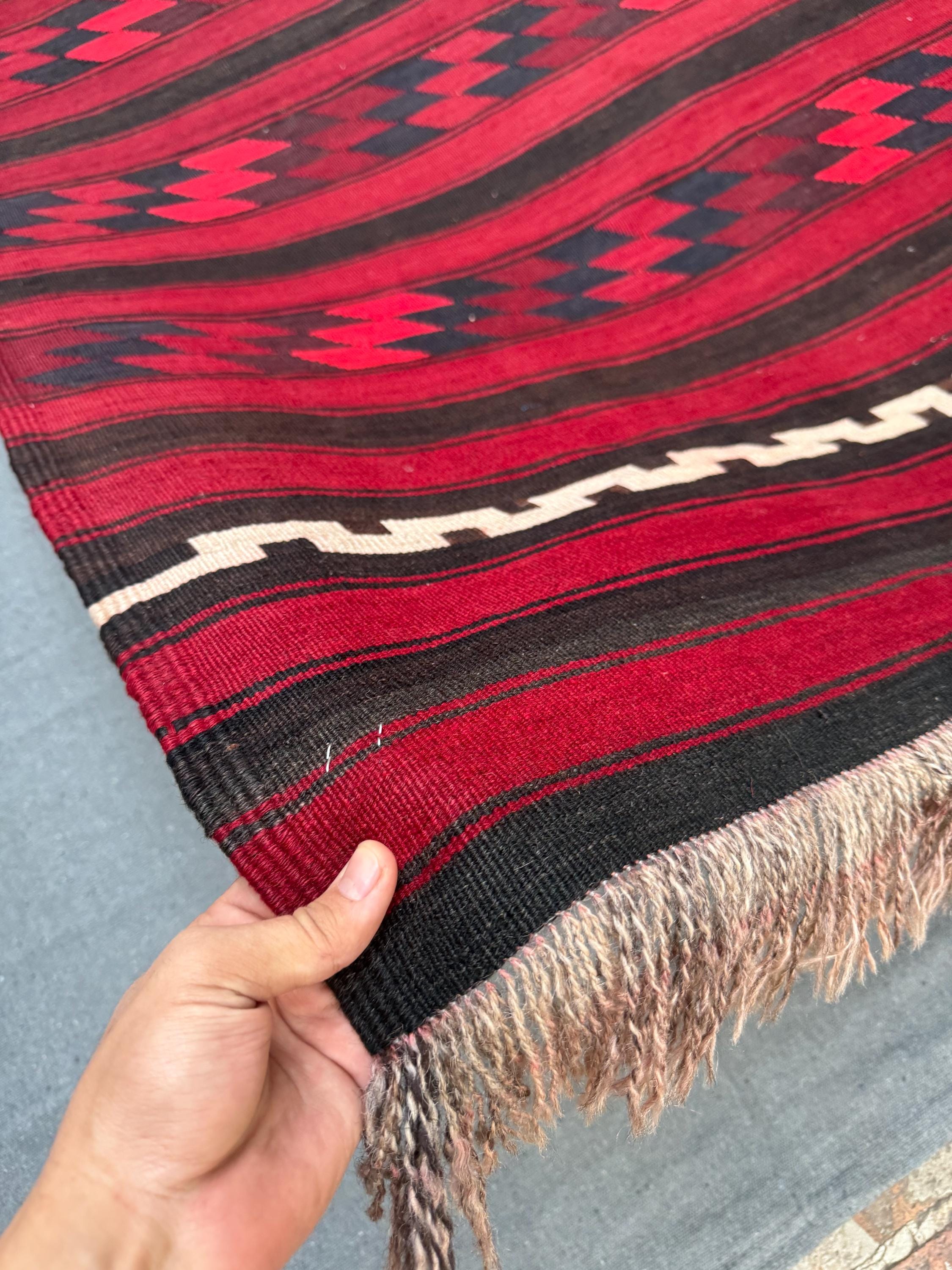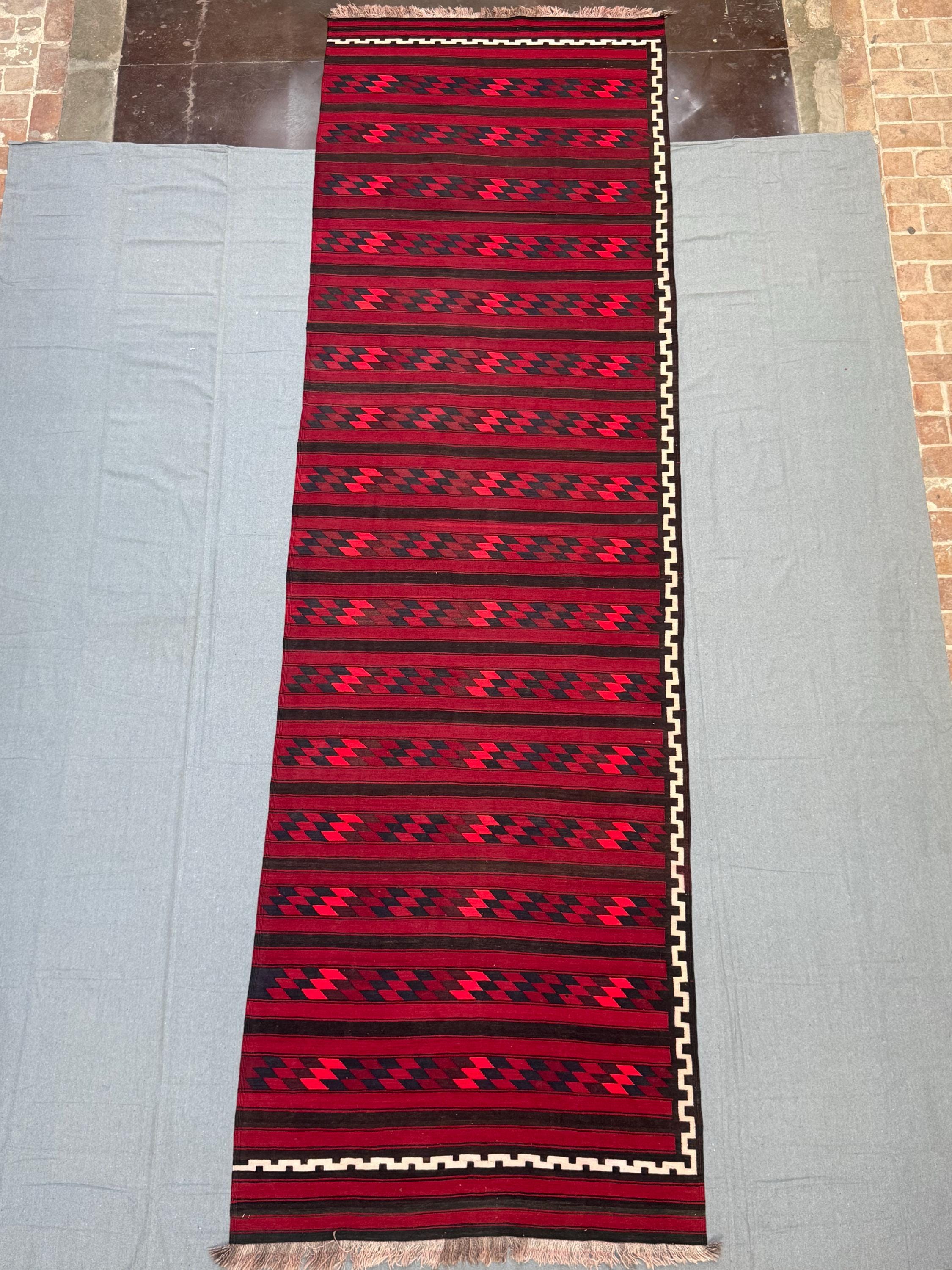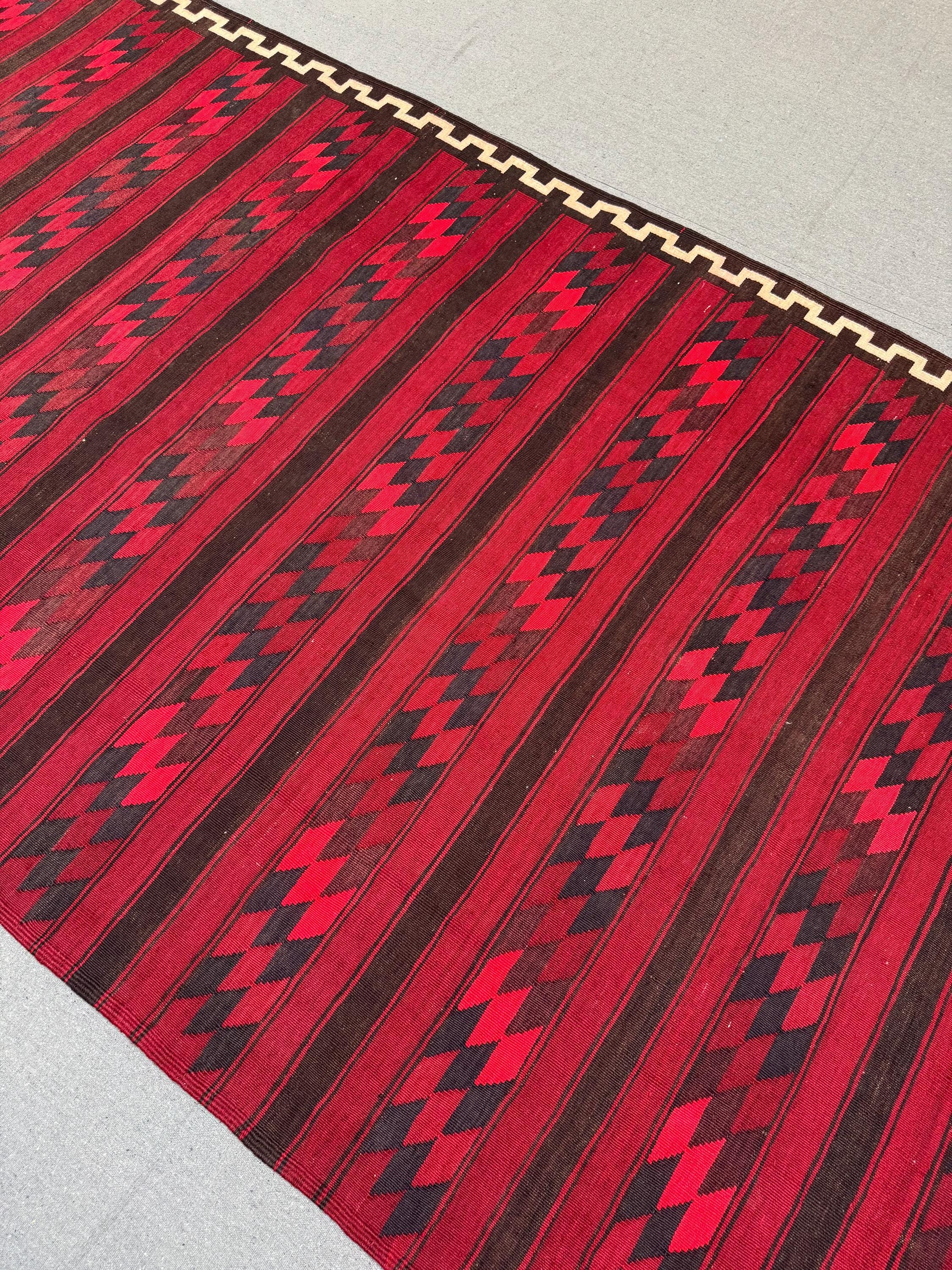 New Kilim Runner Rug 4.10x15.9 ft Handmade Wool Flatweave, Red Black Striped Tribal Carpet, Long Boho Hallway Rug, Geometric Area Décor