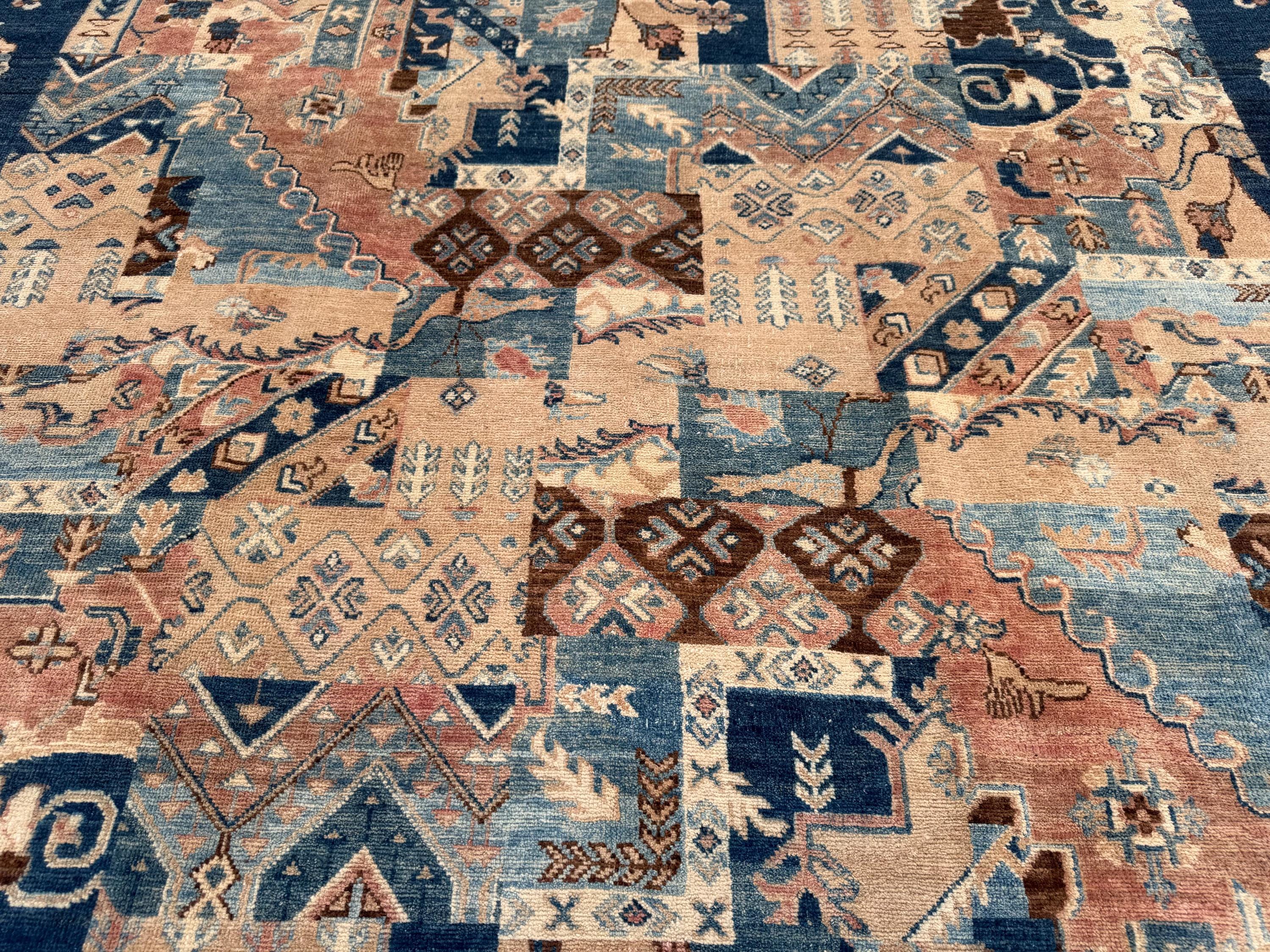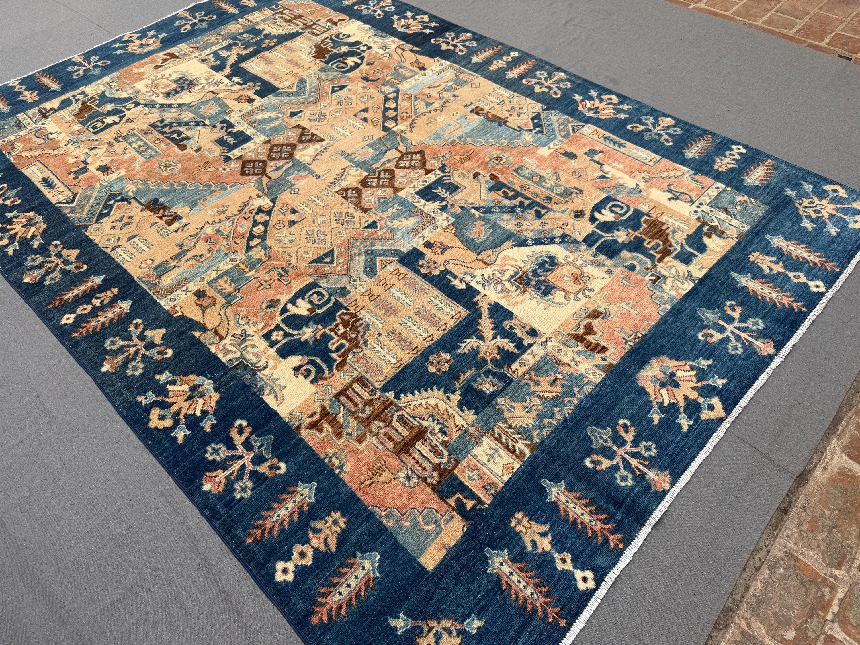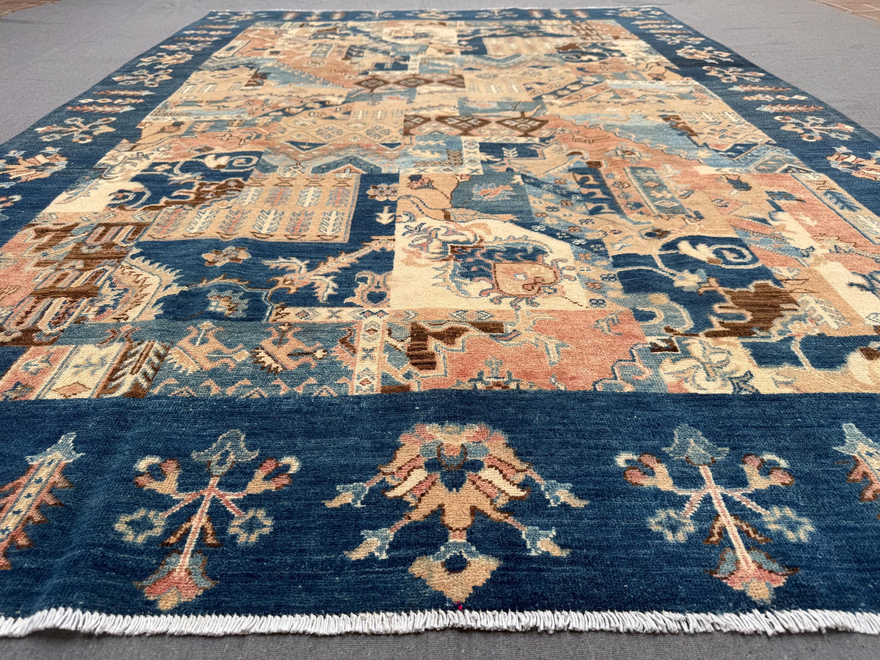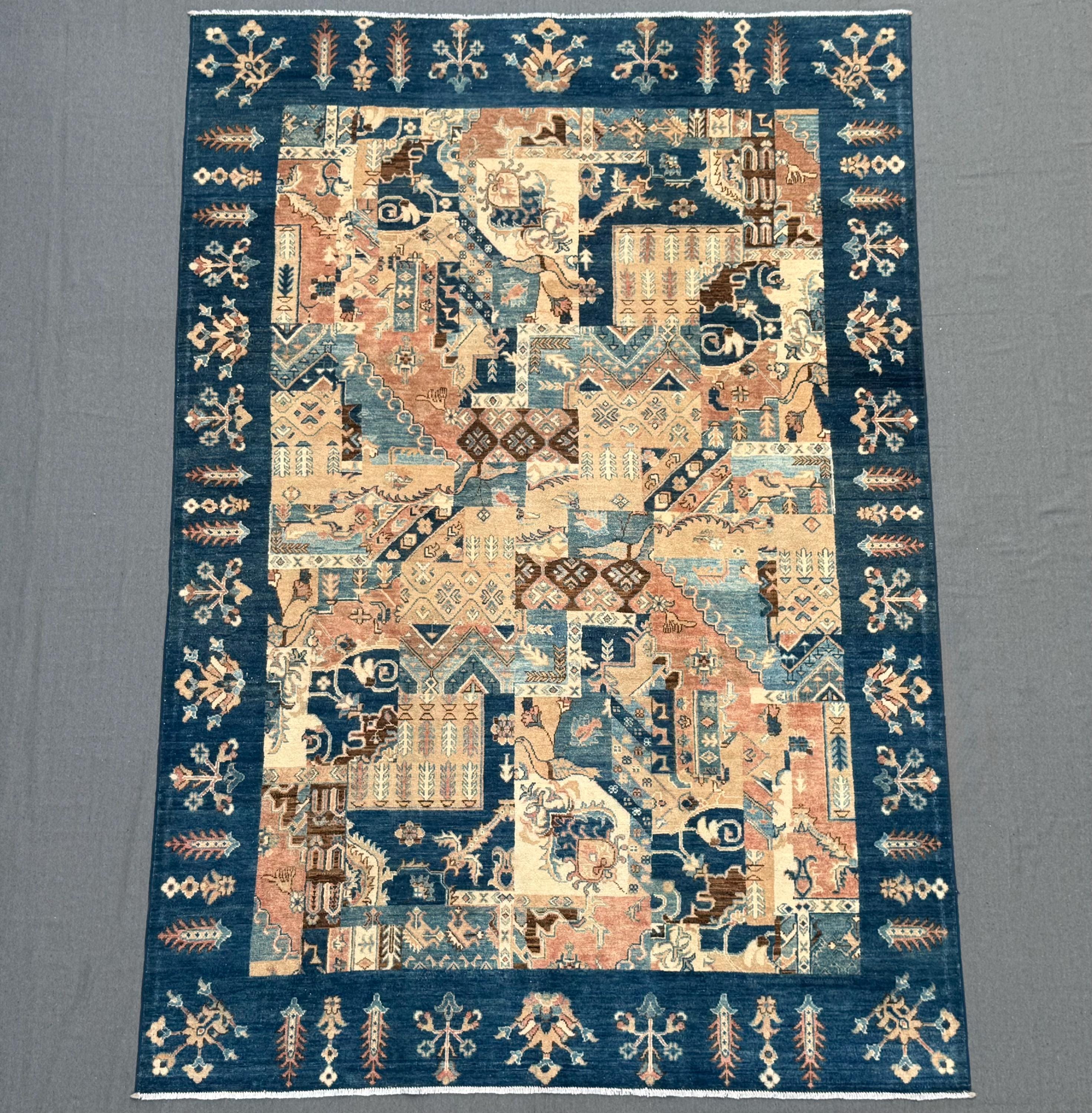 This handmade patchwork wool rug is a striking composition of geometric panels and symbolic motifs, carefully arranged to create a bold yet harmonious design. Rich shades of deep blue, warm beige, soft rust, and muted ivory come together in a balanced patchwork layout that adds depth, movement, and character to any space.