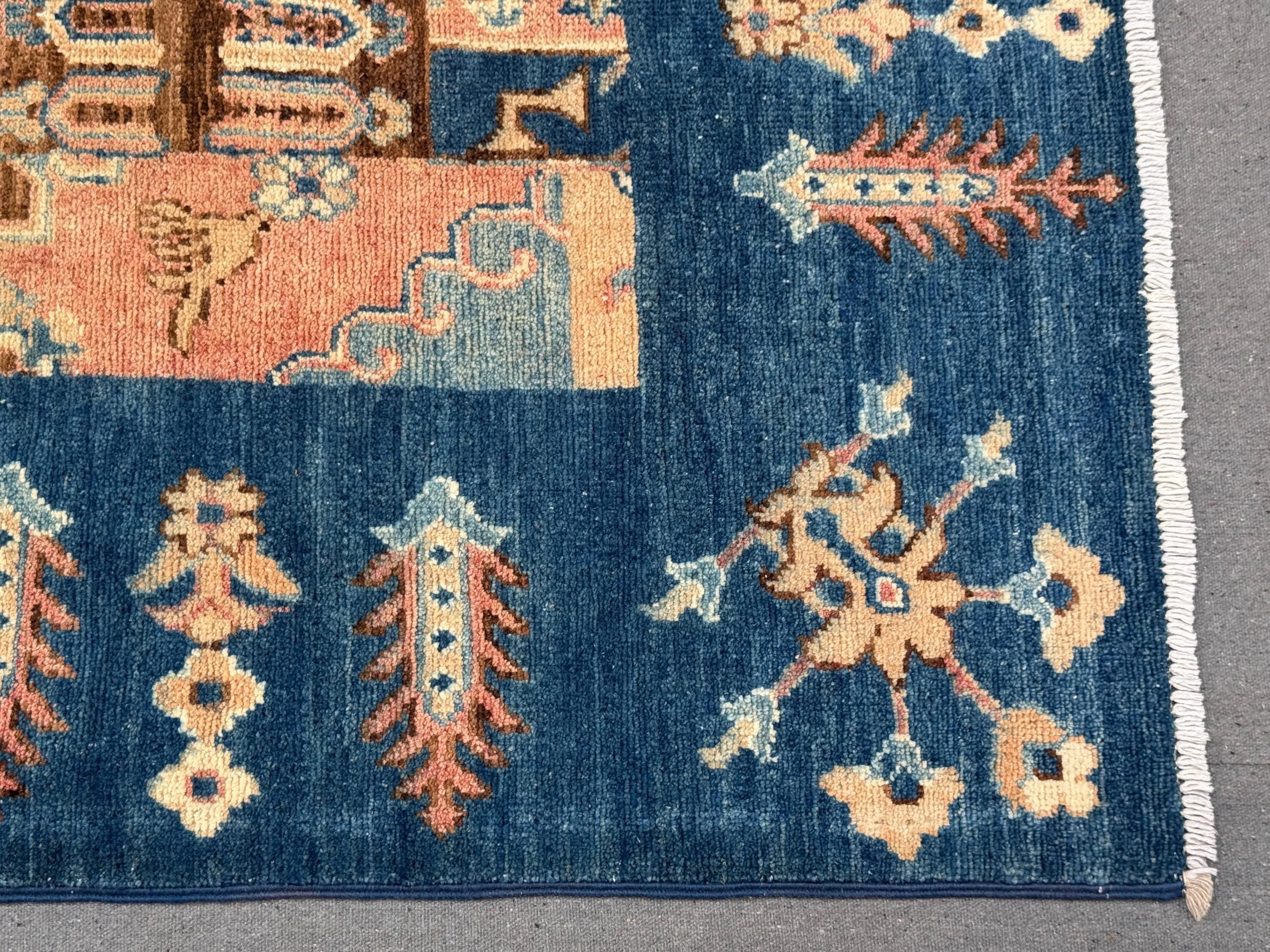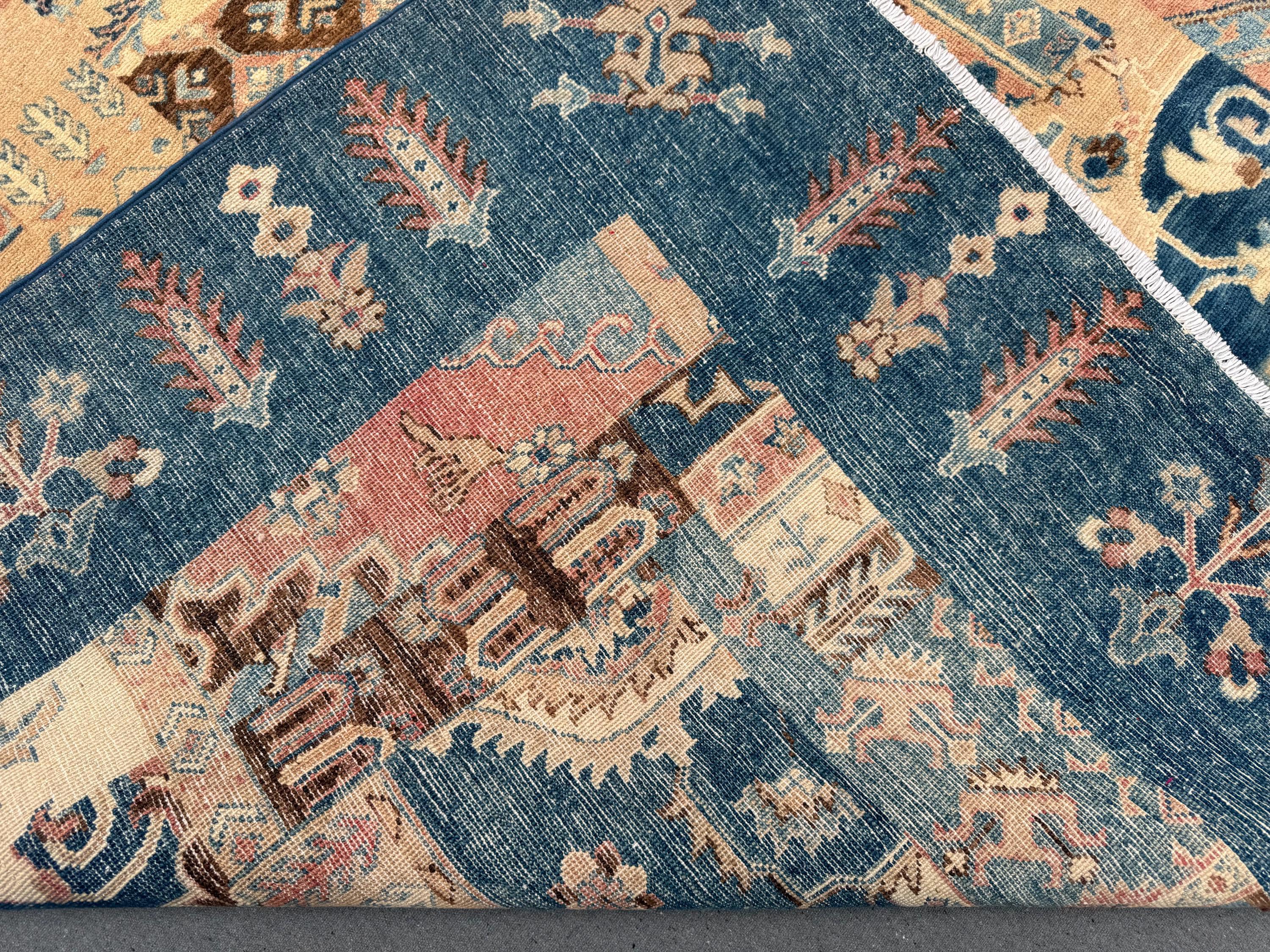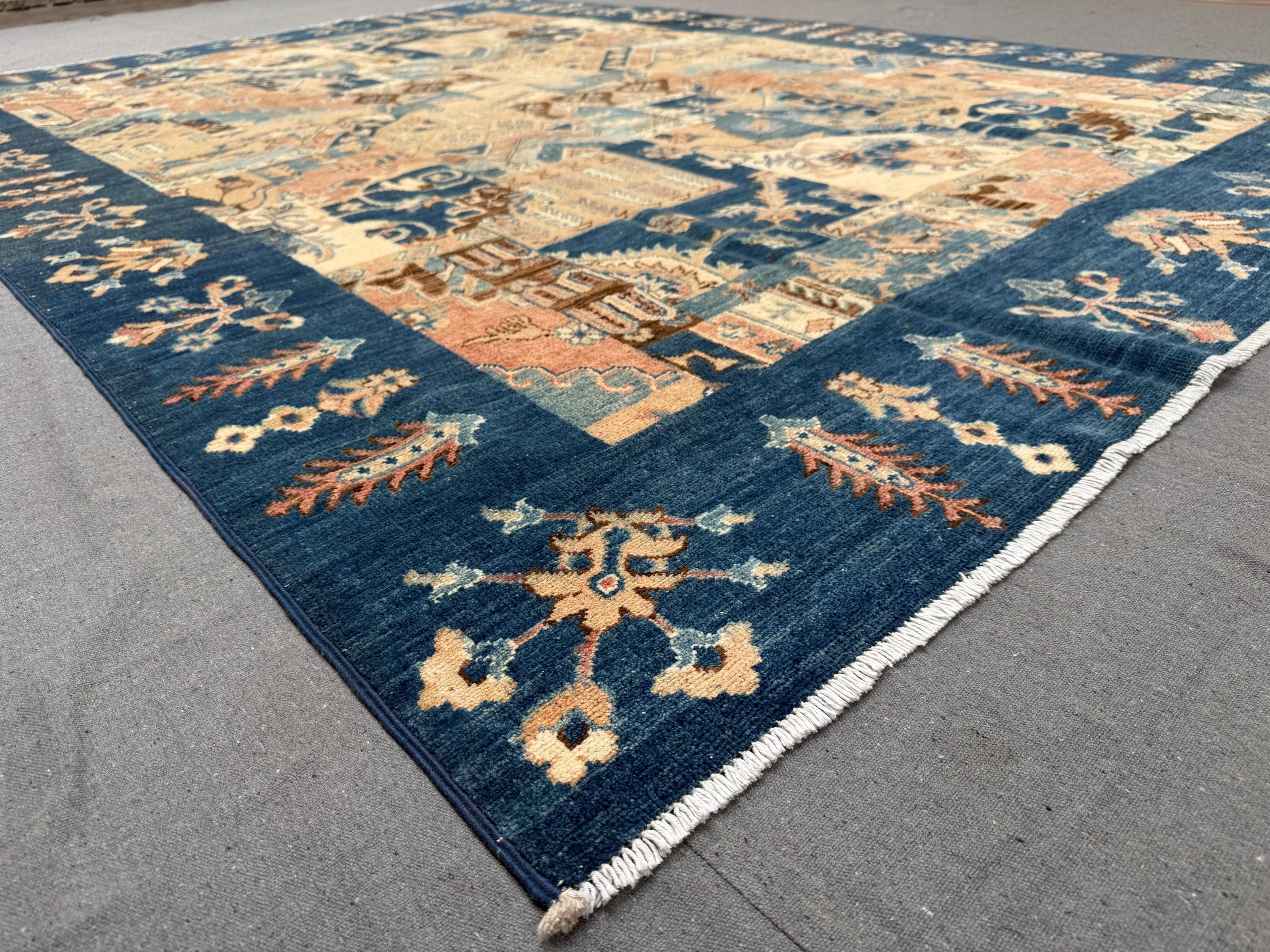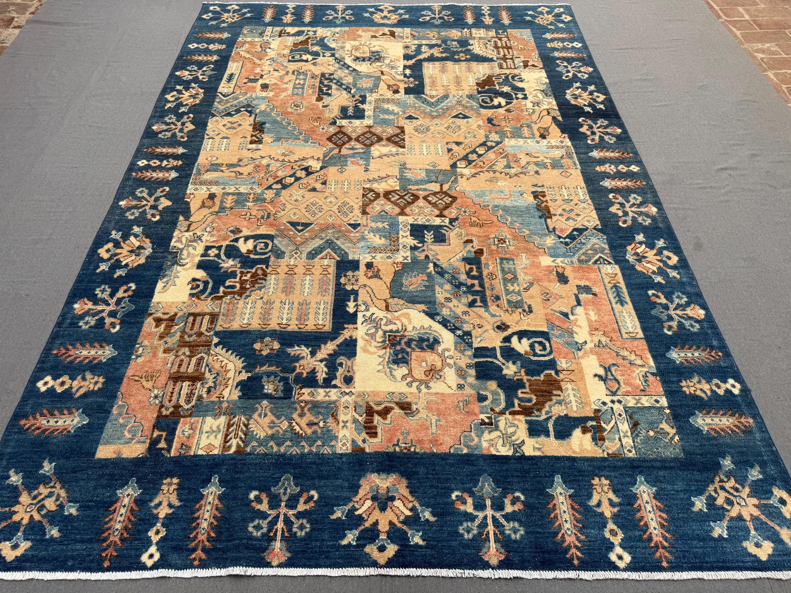 This handmade patchwork wool rug is a striking composition of geometric panels and symbolic motifs, carefully arranged to create a bold yet harmonious design. Rich shades of deep blue, warm beige, soft rust, and muted ivory come together in a balanced patchwork layout that adds depth, movement, and character to any space.