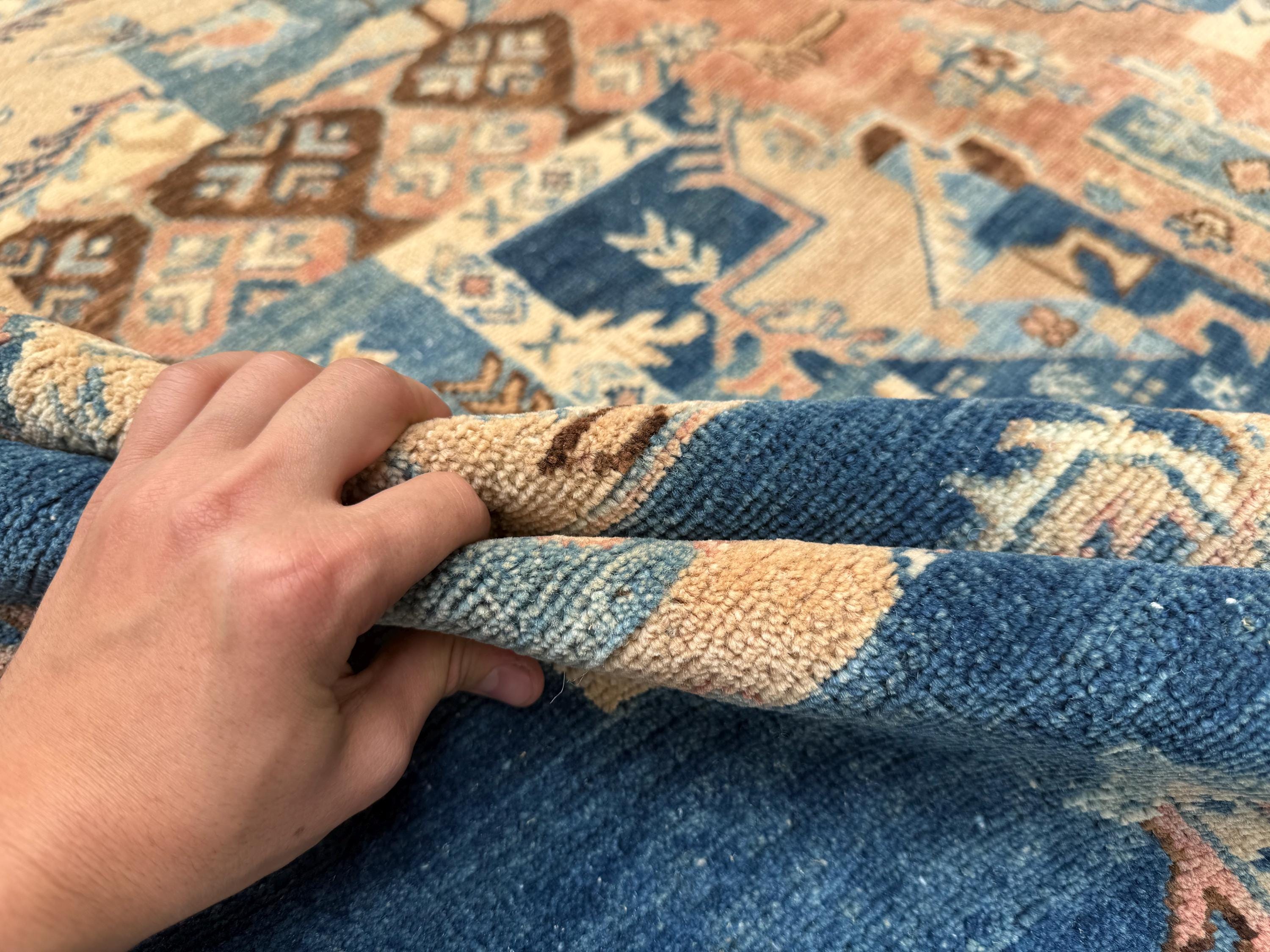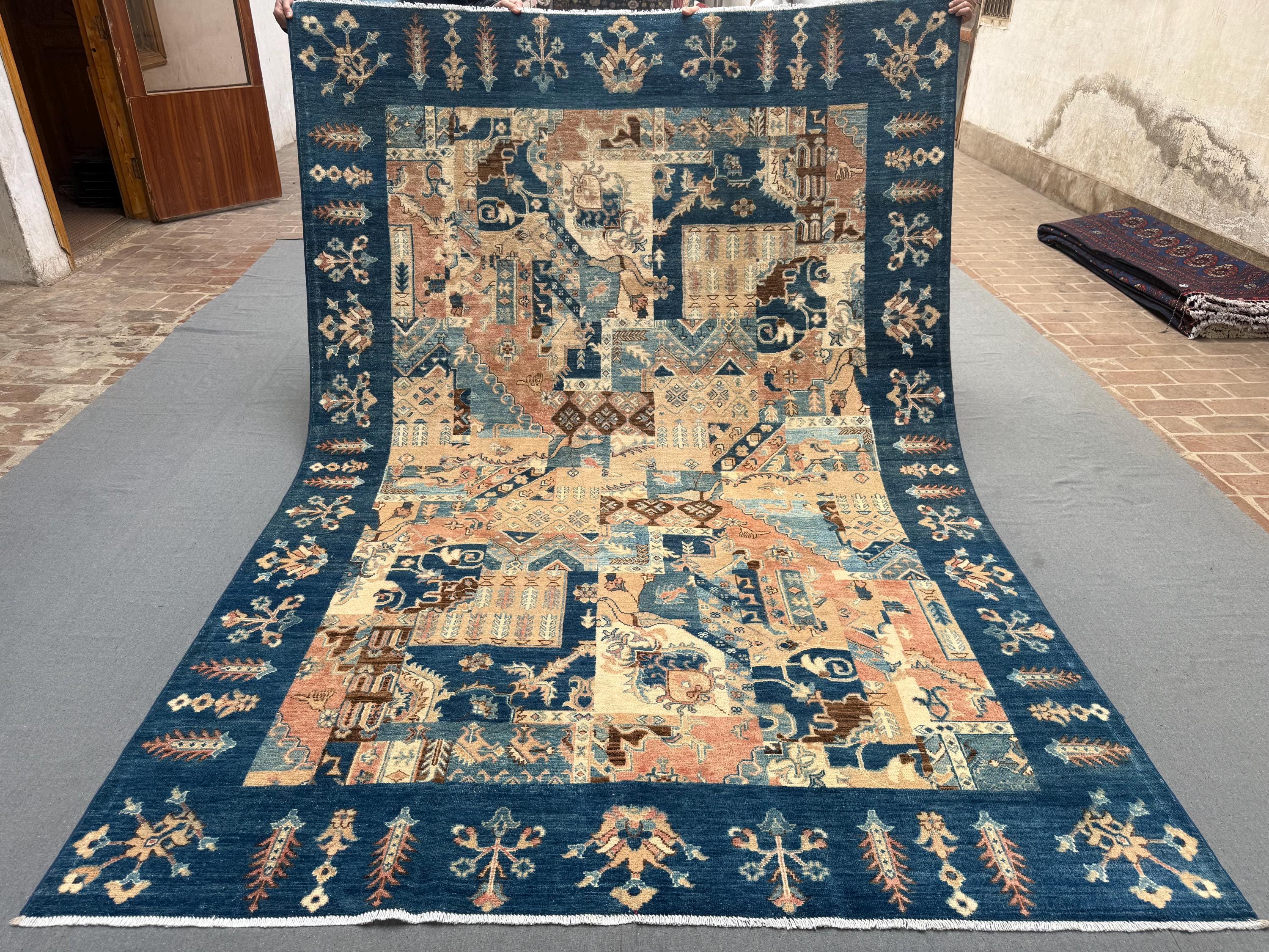 Handmade Patchwork Wool Rug 7x10 ft Blue Beige Geometric Area Rug with Tribal Motifs, Statement Living Room Decor