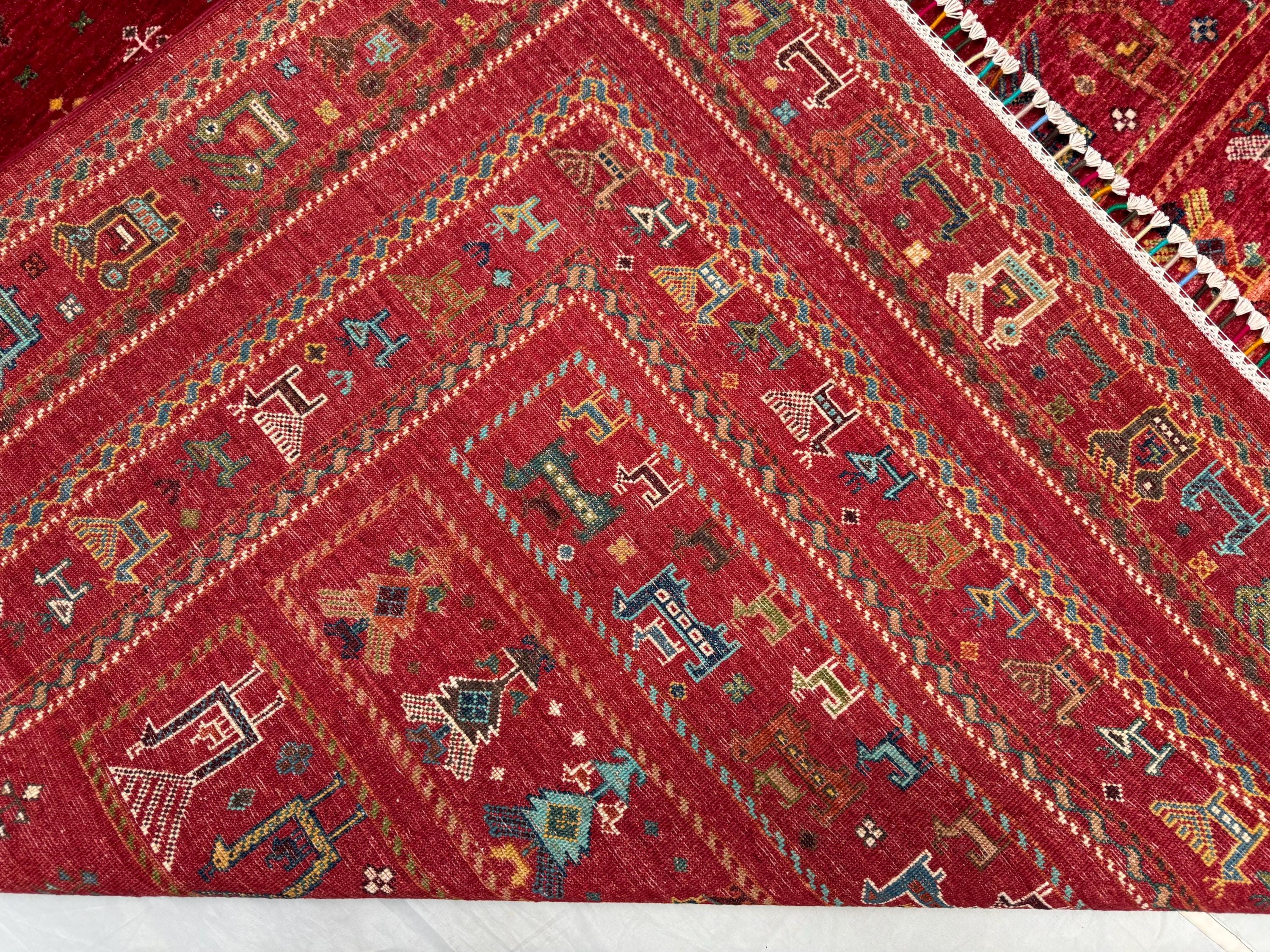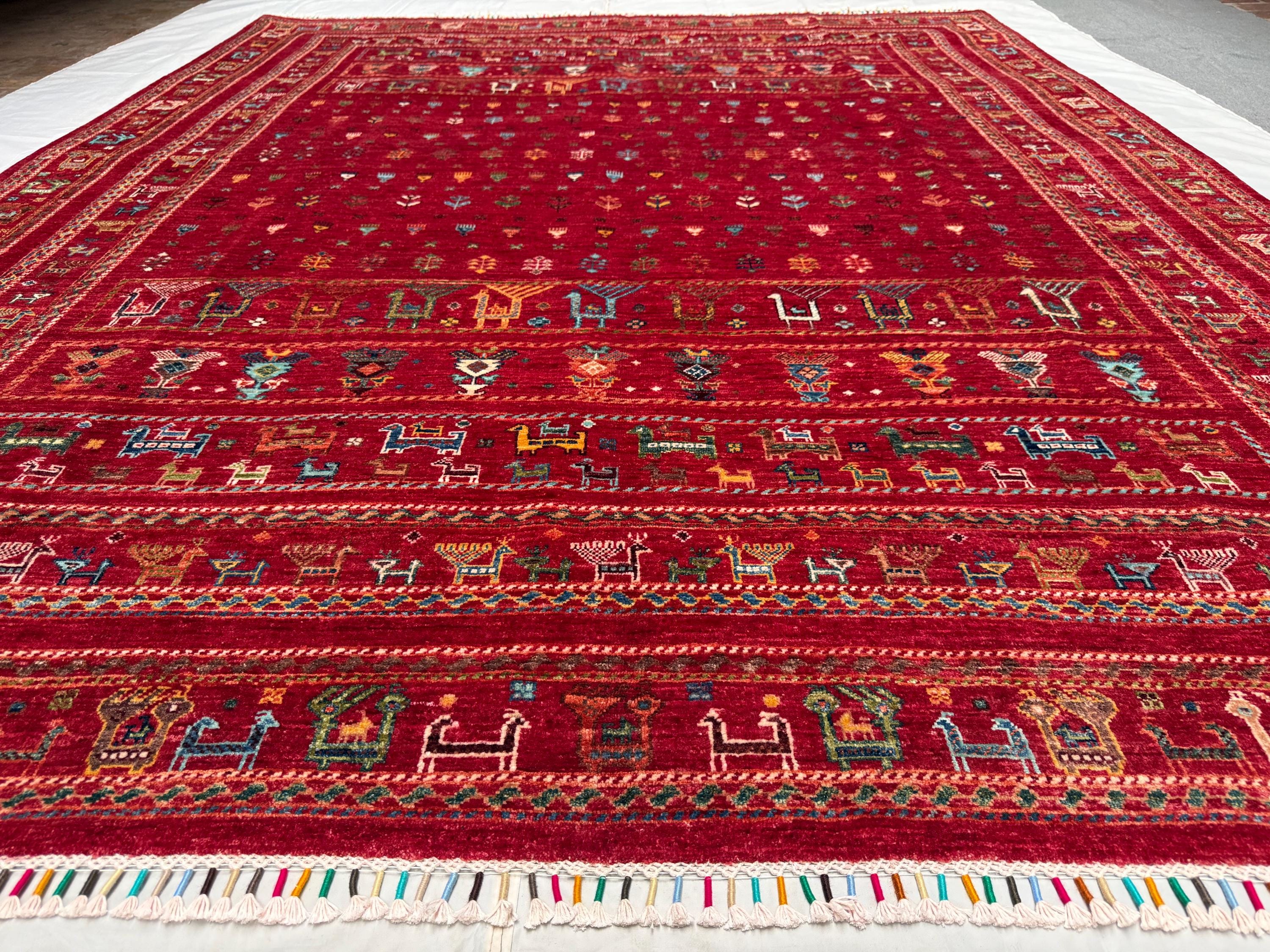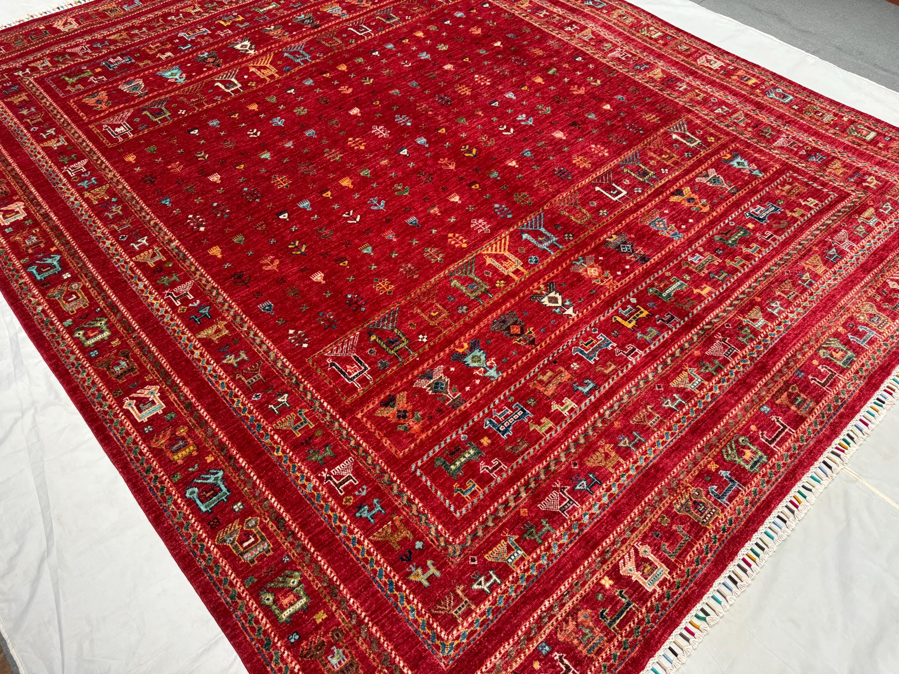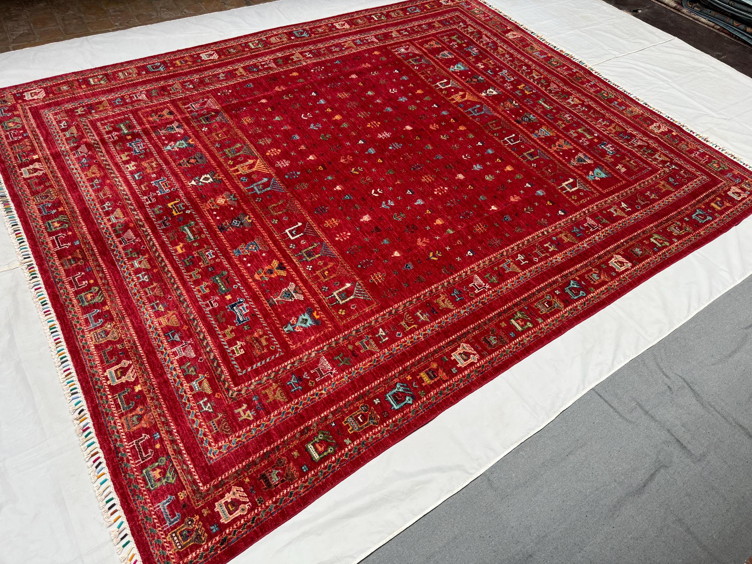 At 8.2x10.1 ft (250x306 cm), this rug is the perfect centerpiece for living rooms, dining spaces, or offices, offering warmth, texture, and timeless beauty. The deep red background paired with multicolor tribal accents brings both vibrancy and depth to your space, creating a rich and inviting atmosphere.