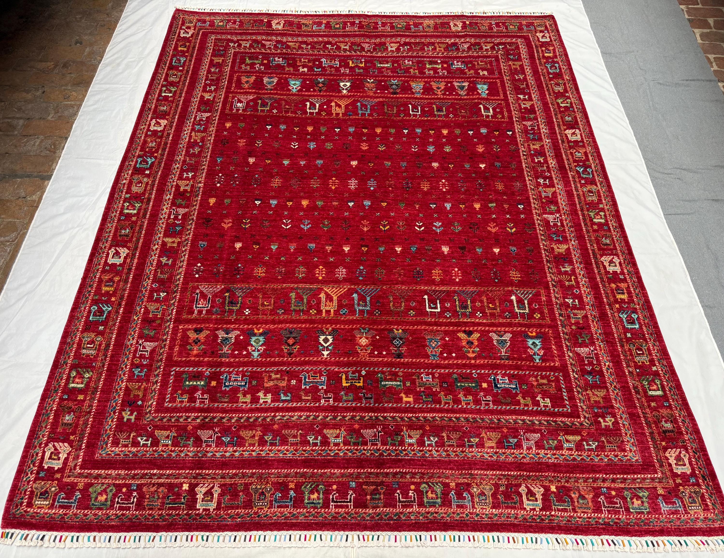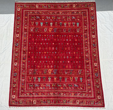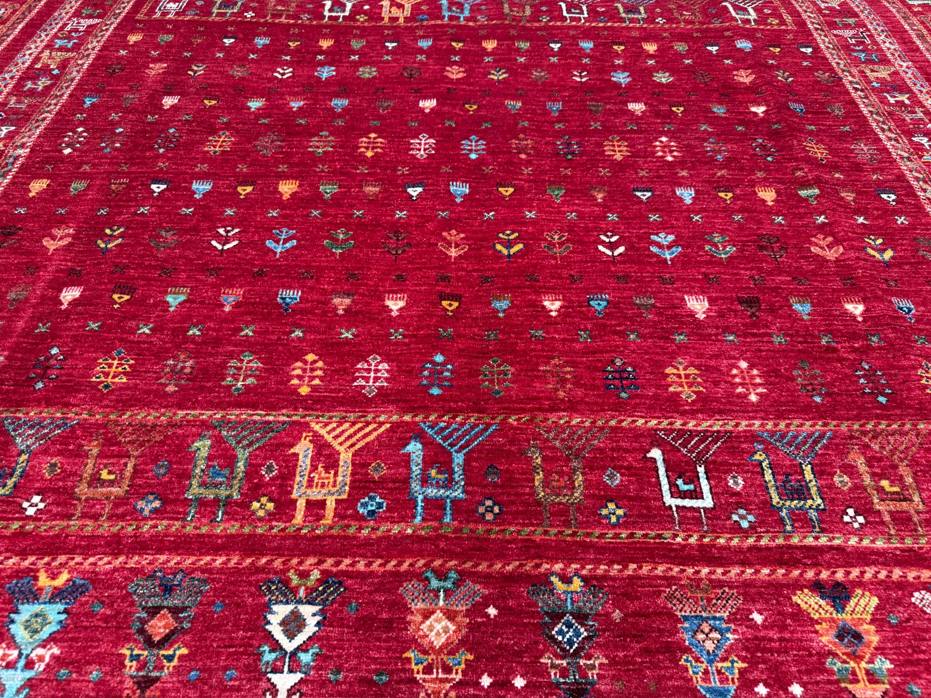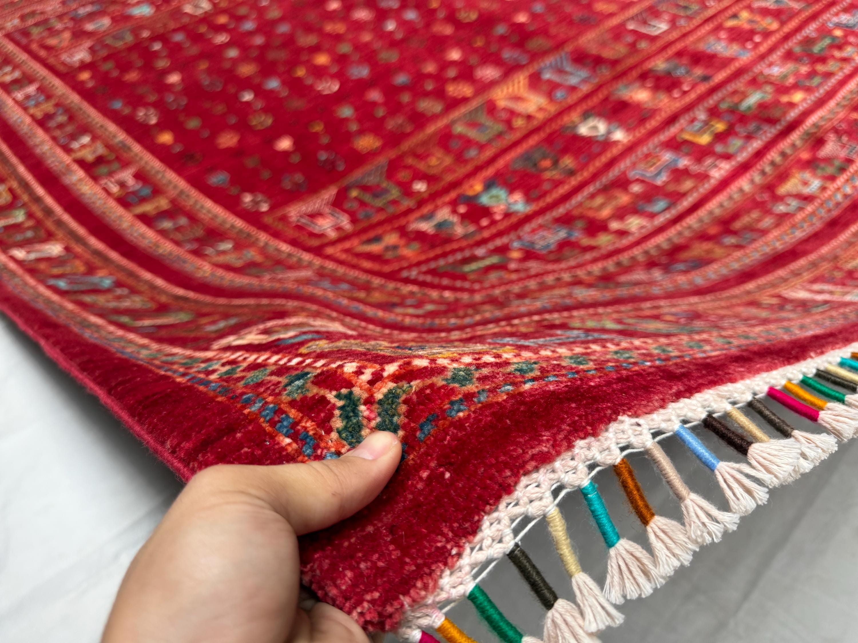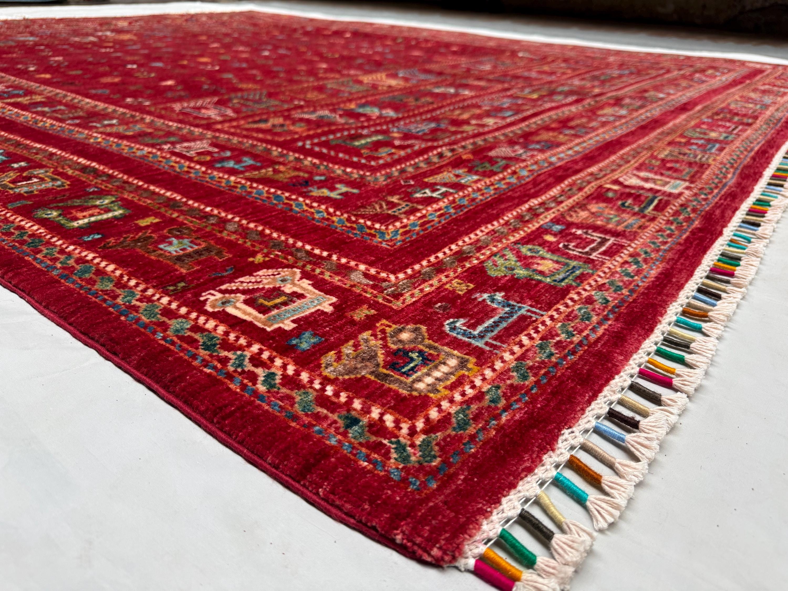 At 8.2x10.1 ft (250x306 cm), this rug is the perfect centerpiece for living rooms, dining spaces, or offices, offering warmth, texture, and timeless beauty. The deep red background paired with multicolor tribal accents brings both vibrancy and depth to your space, creating a rich and inviting atmosphere.