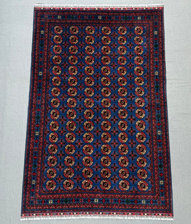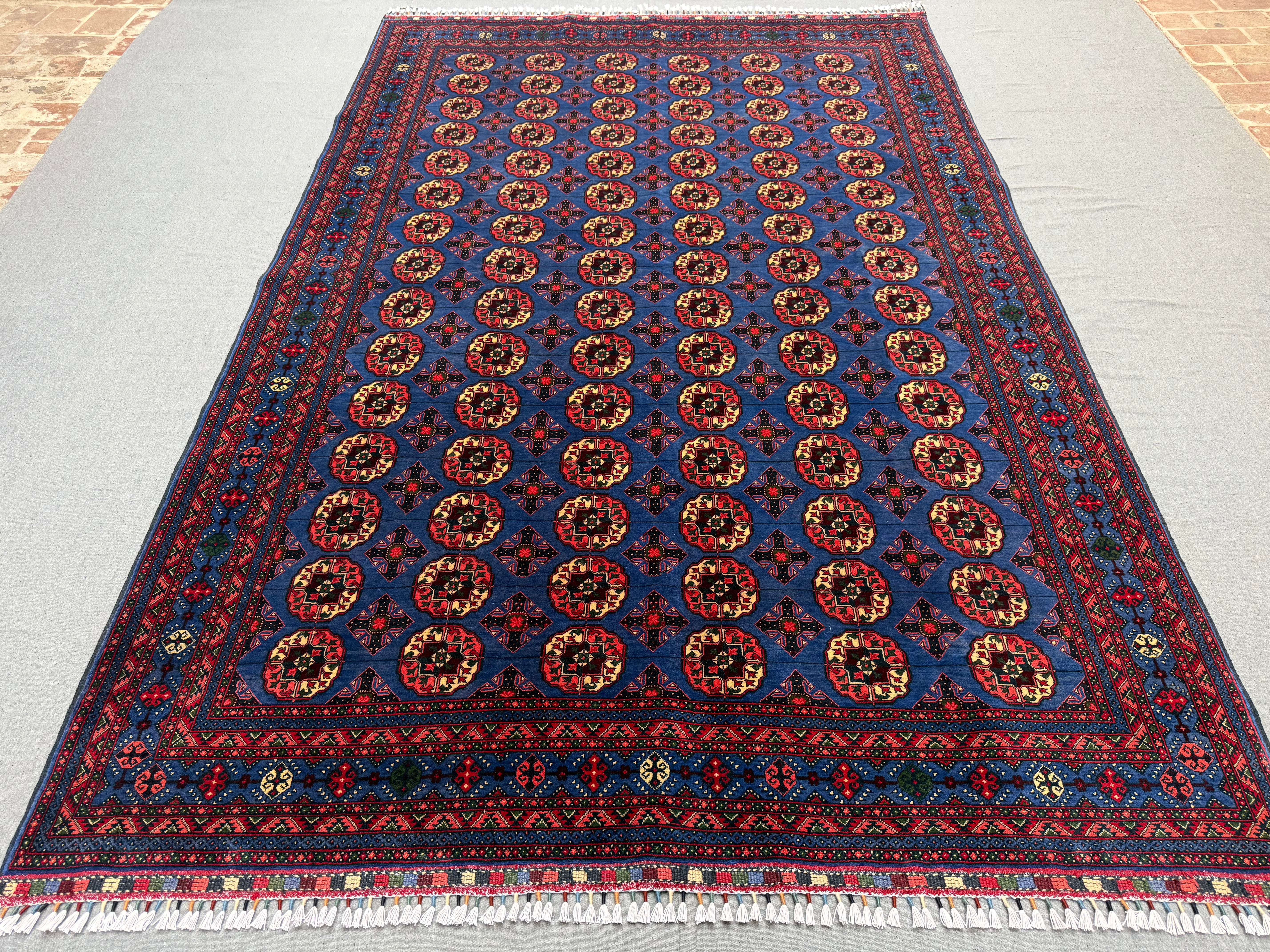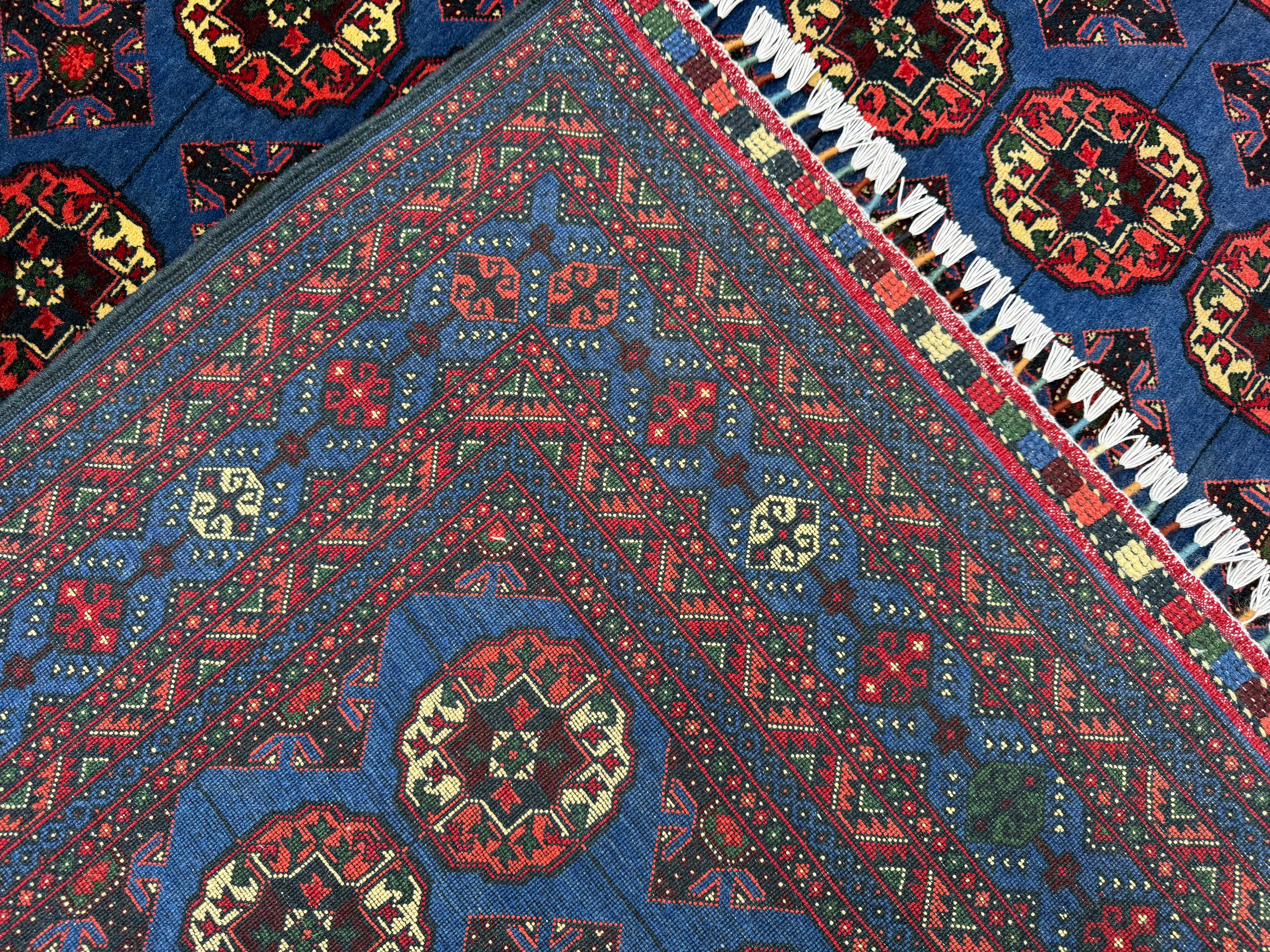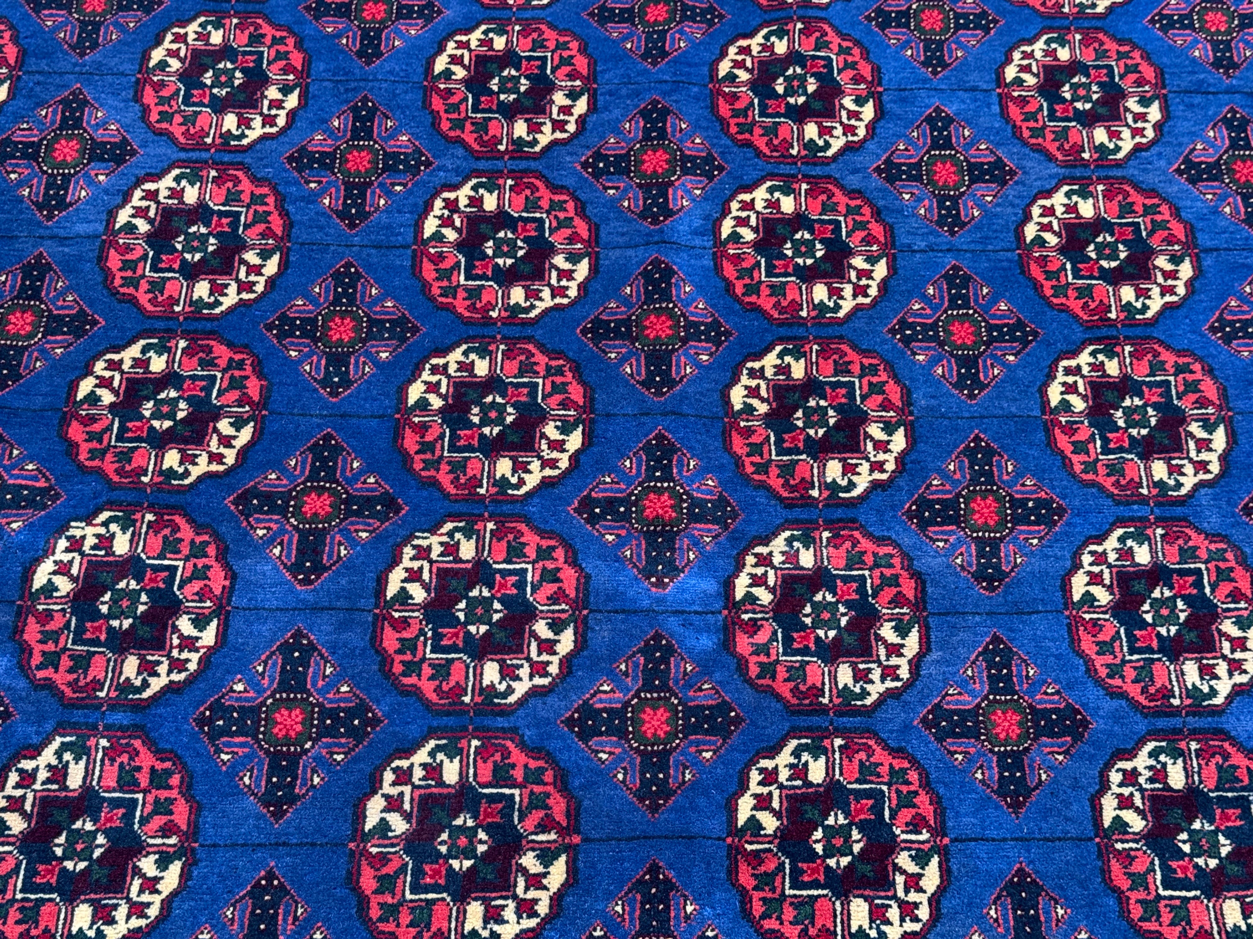 Make a bold statement with this handmade Pilpai-pattern area rug, featuring a striking deep blue field filled with repeating geometric medallions in rich red, ivory, and subtle accents. The dense, fine knotting creates crisp detail and a balanced, rhythmic design that instantly anchors a space.