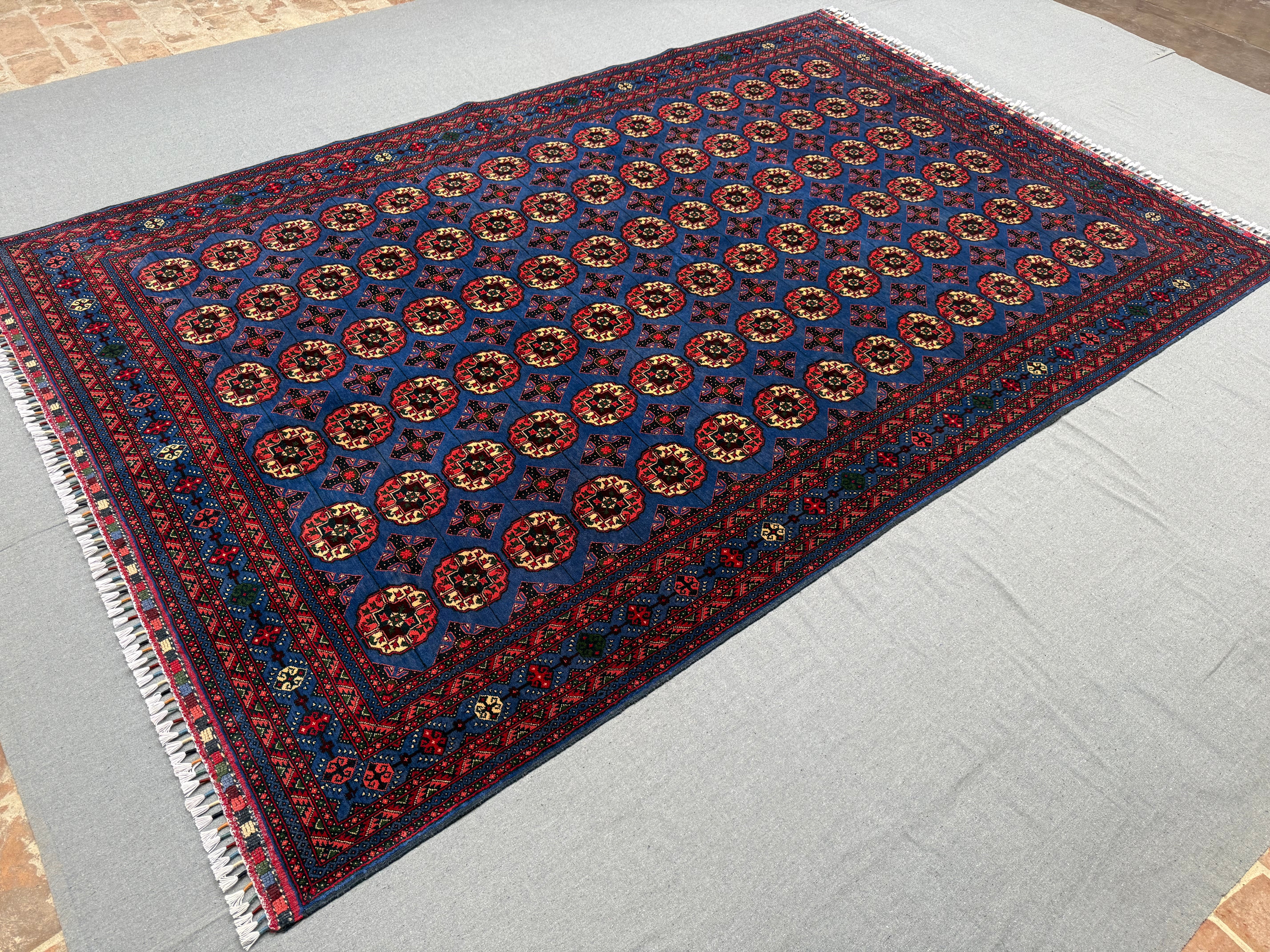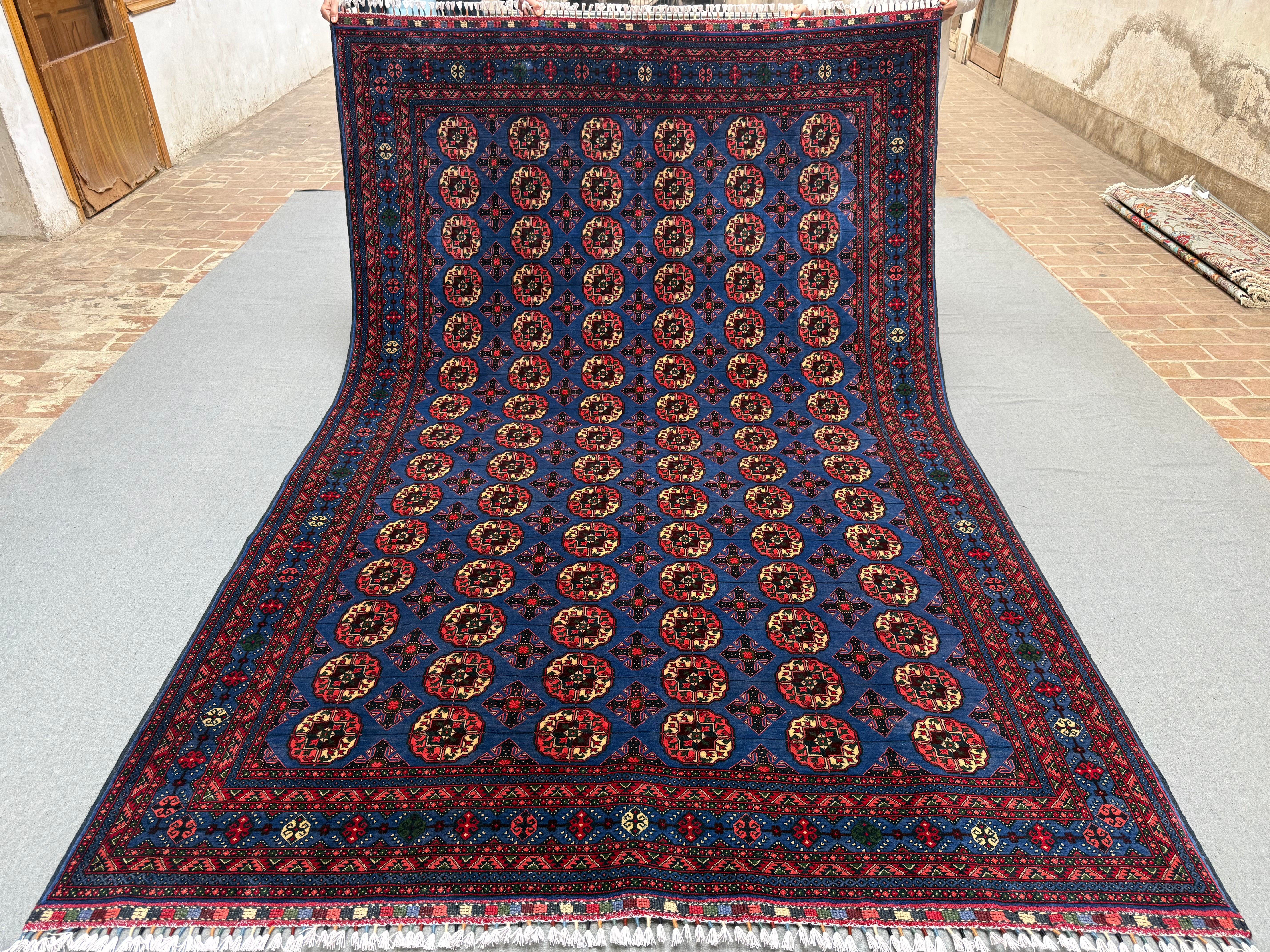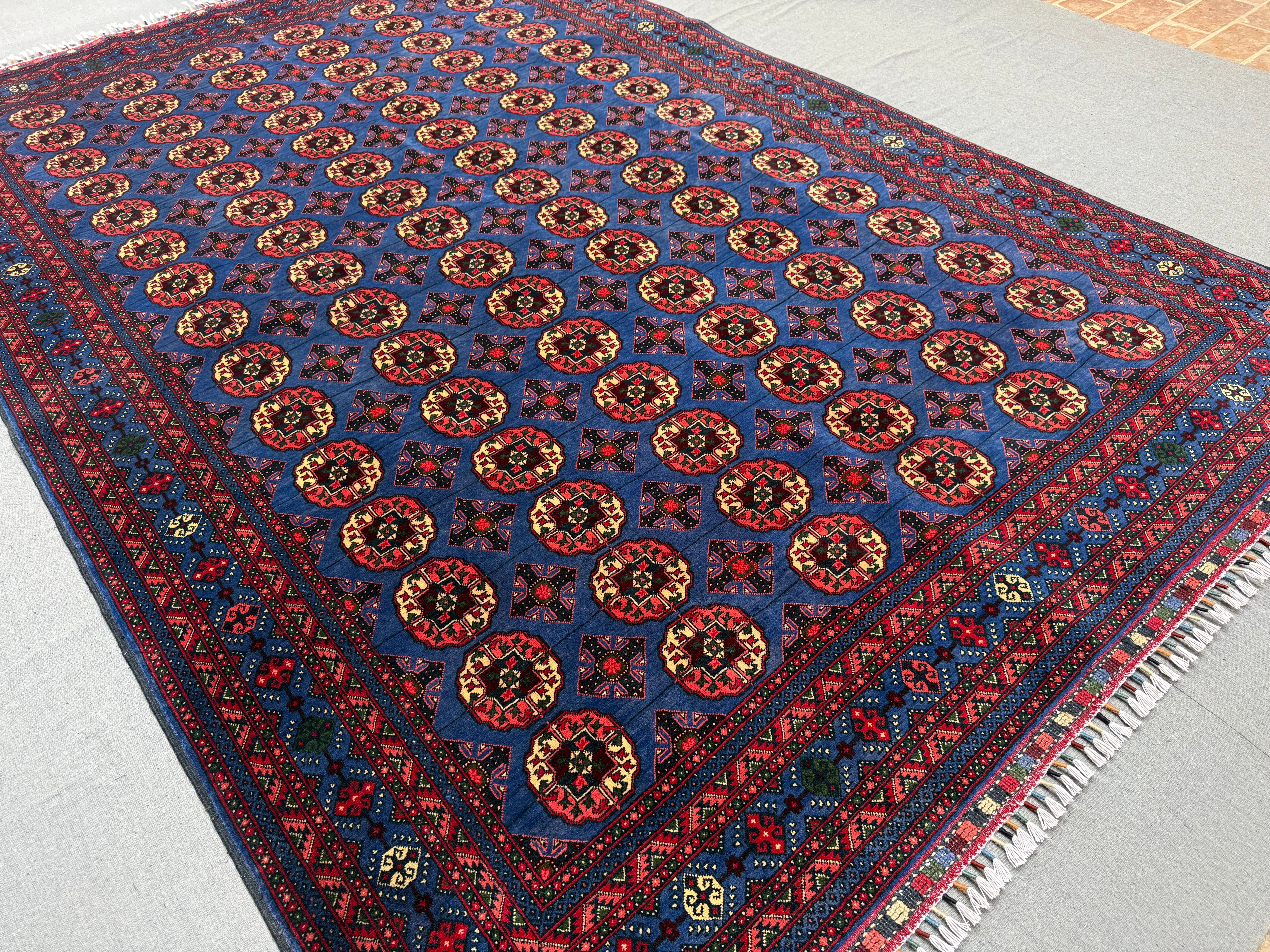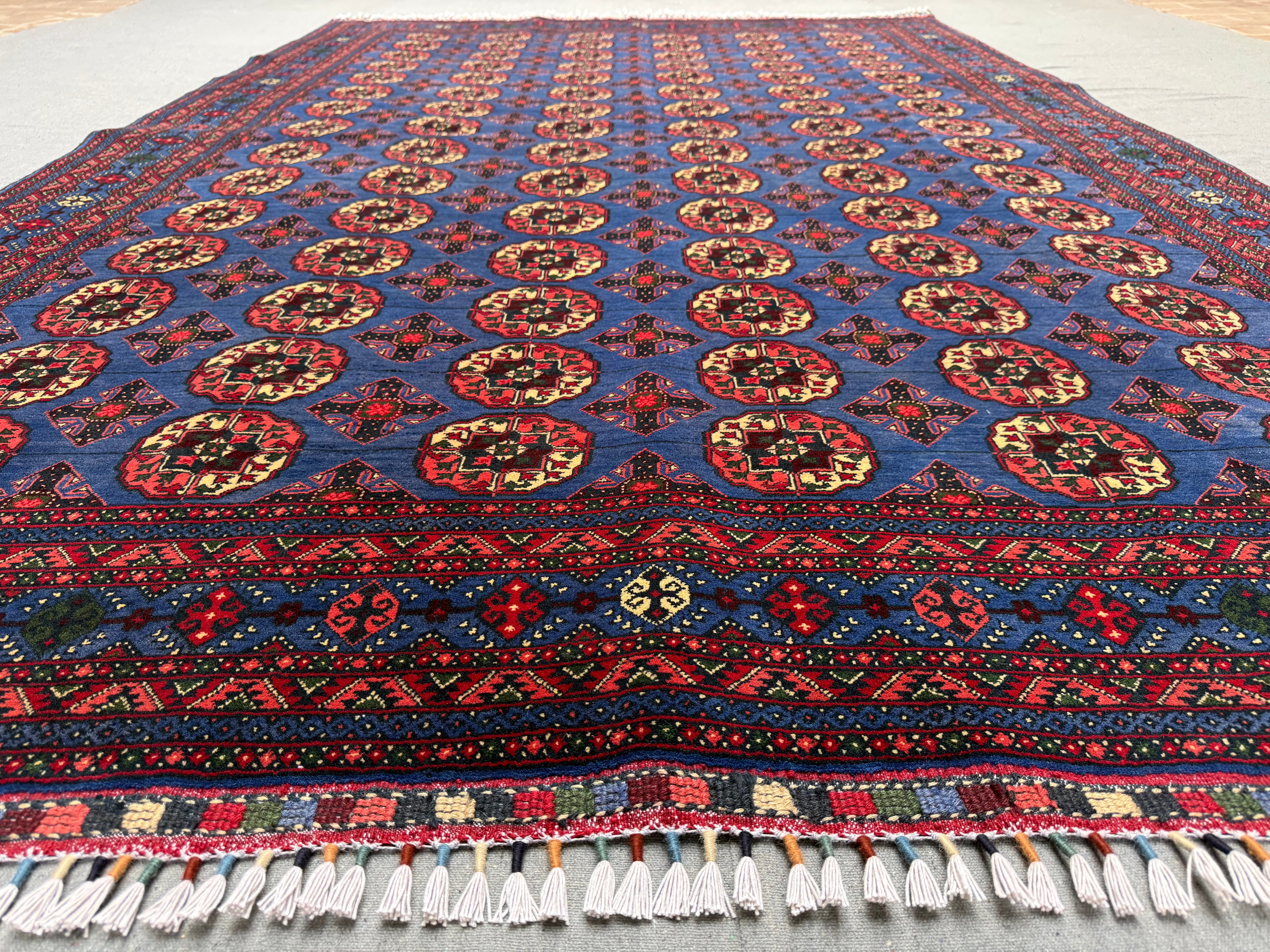 Make a bold statement with this handmade Pilpai-pattern area rug, featuring a striking deep blue field filled with repeating geometric medallions in rich red, ivory, and subtle accents. The dense, fine knotting creates crisp detail and a balanced, rhythmic design that instantly anchors a space.