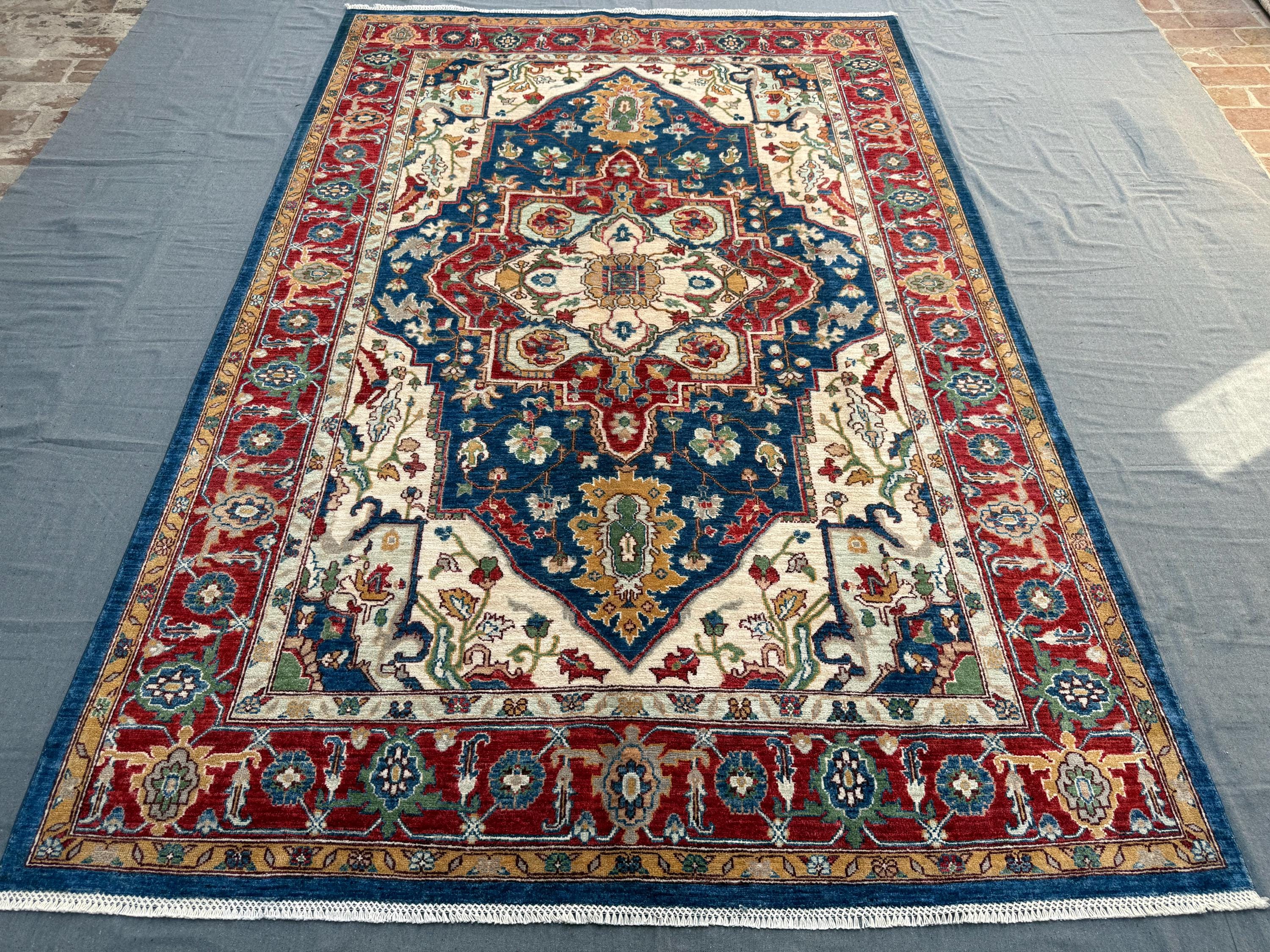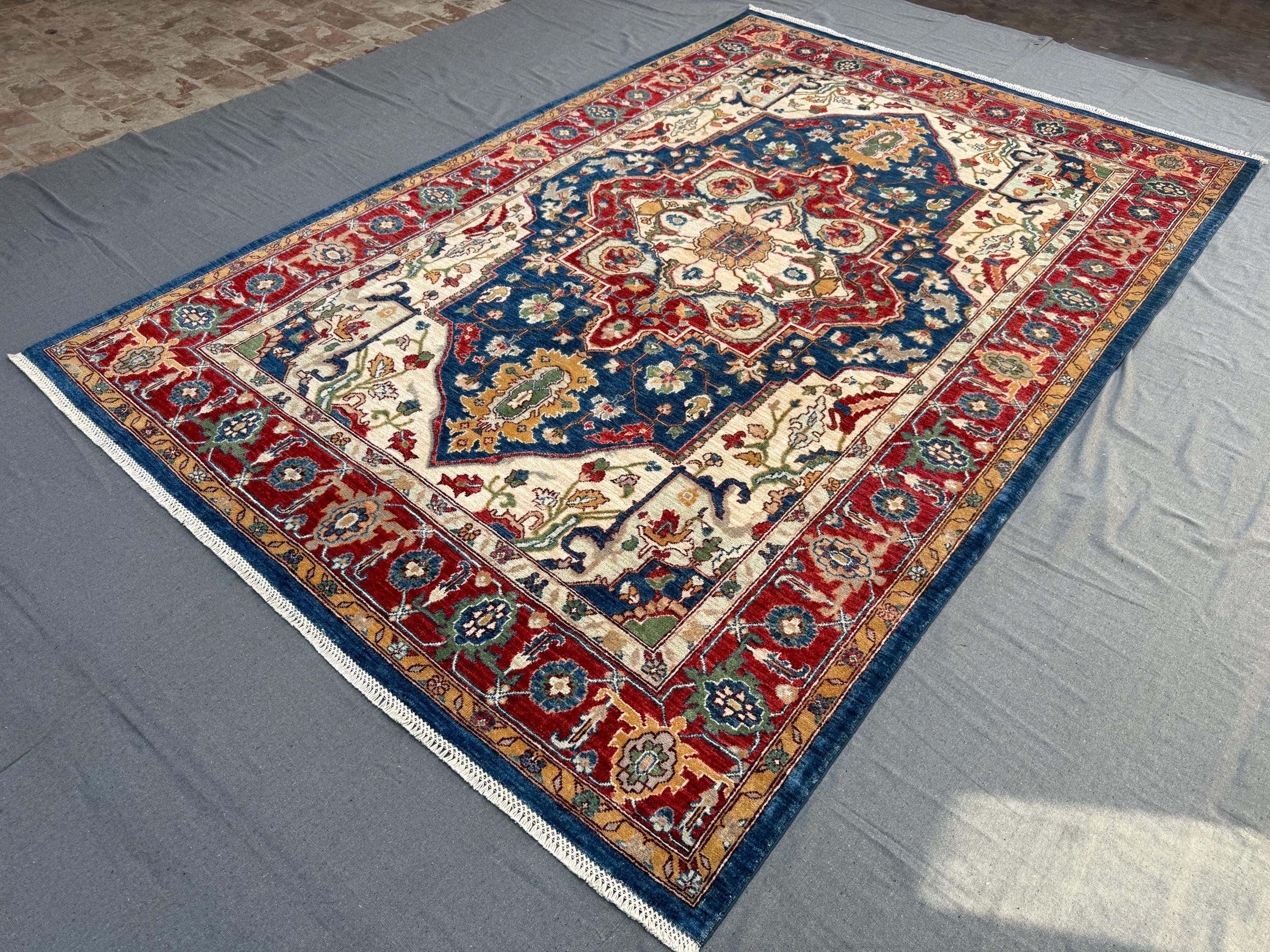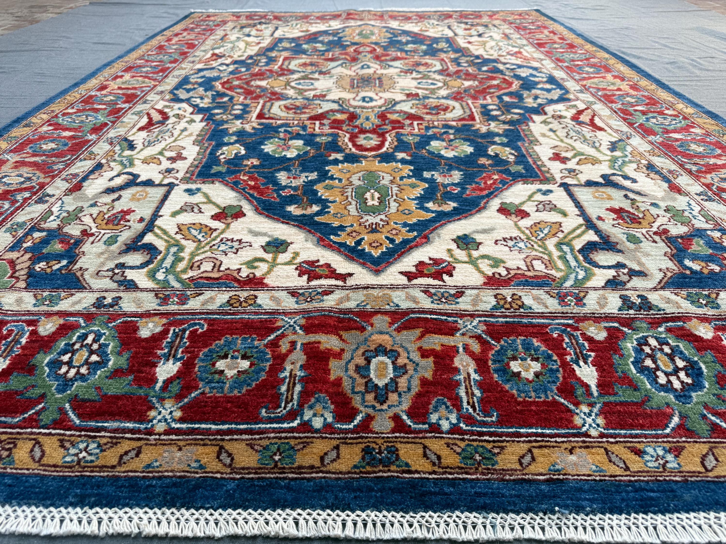 Royal Blue Heriz Rug 7x9 ft Handmade Wool Geometric Medallion Carpet, Red & Ivory Tribal Area Rug