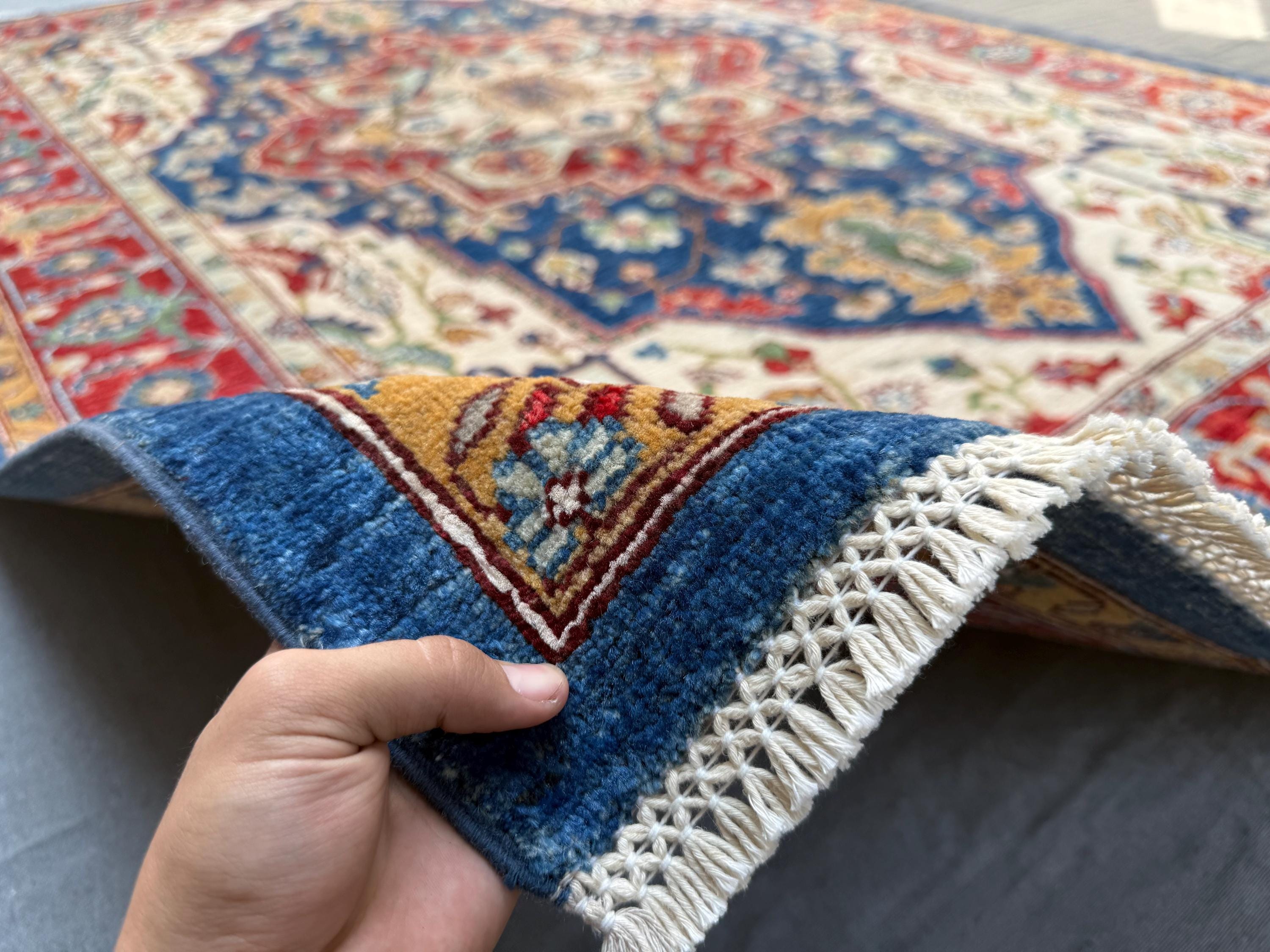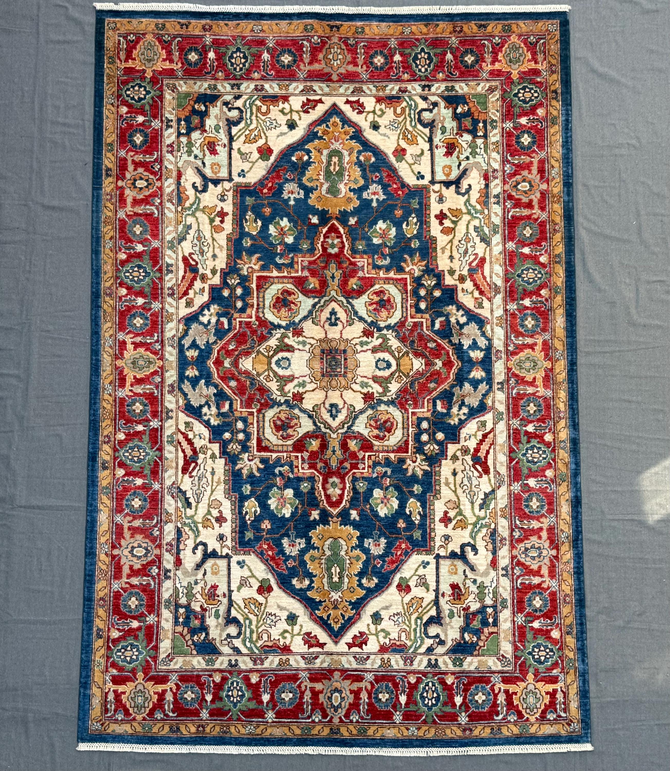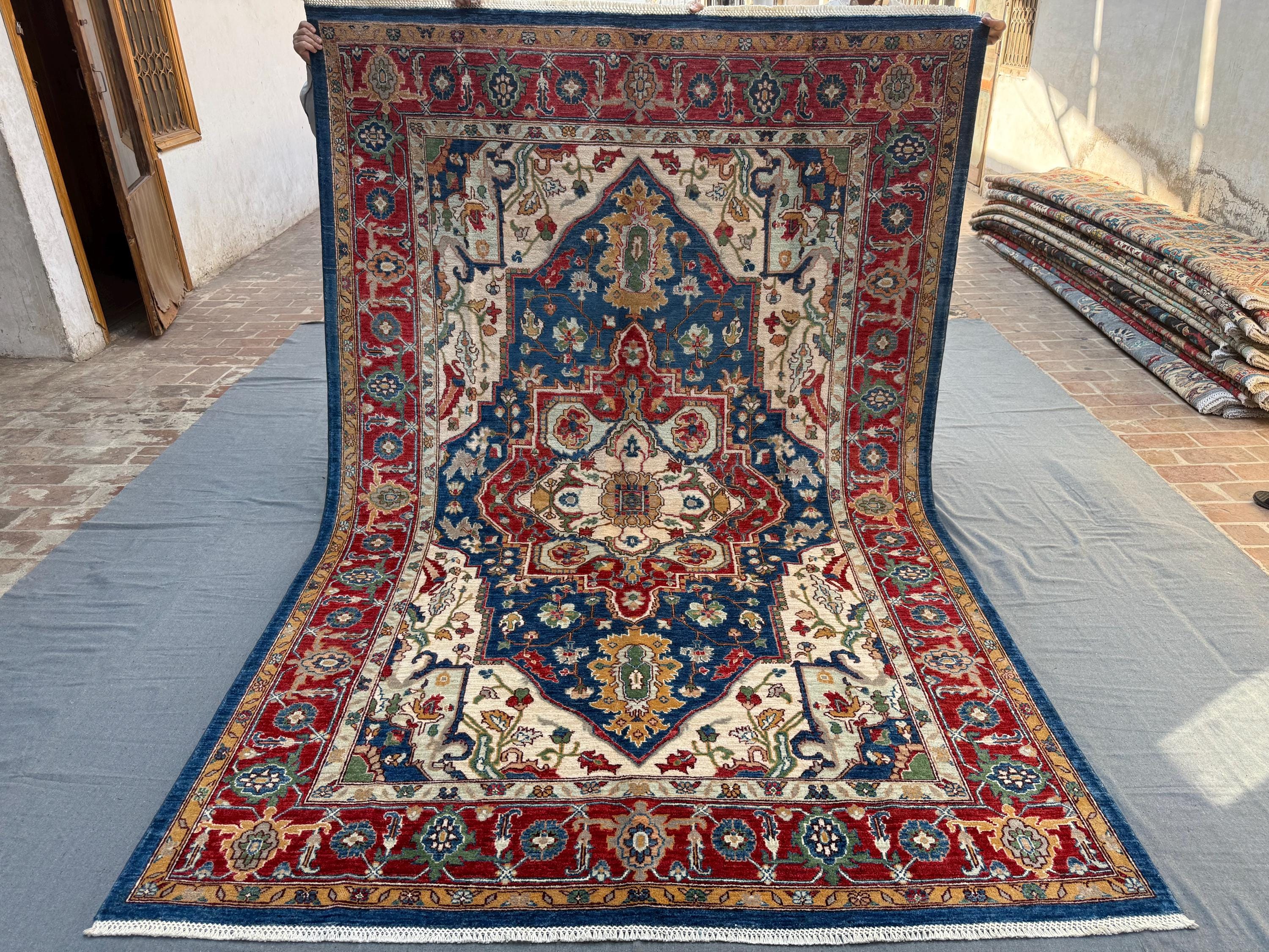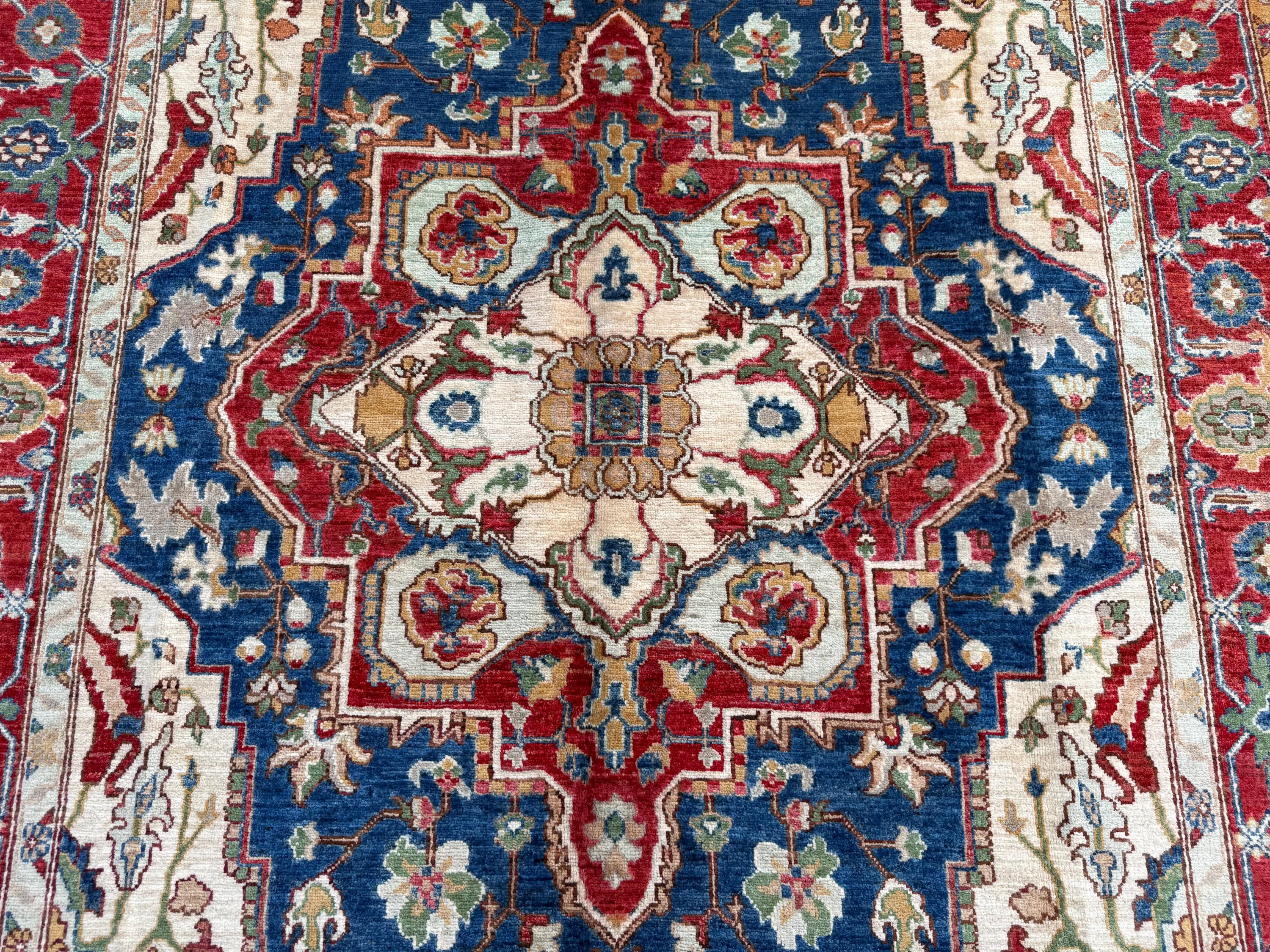 Royal Blue Heriz Rug 7x9 ft Handmade Wool Geometric Medallion Carpet, Red & Ivory Tribal Area Rug
