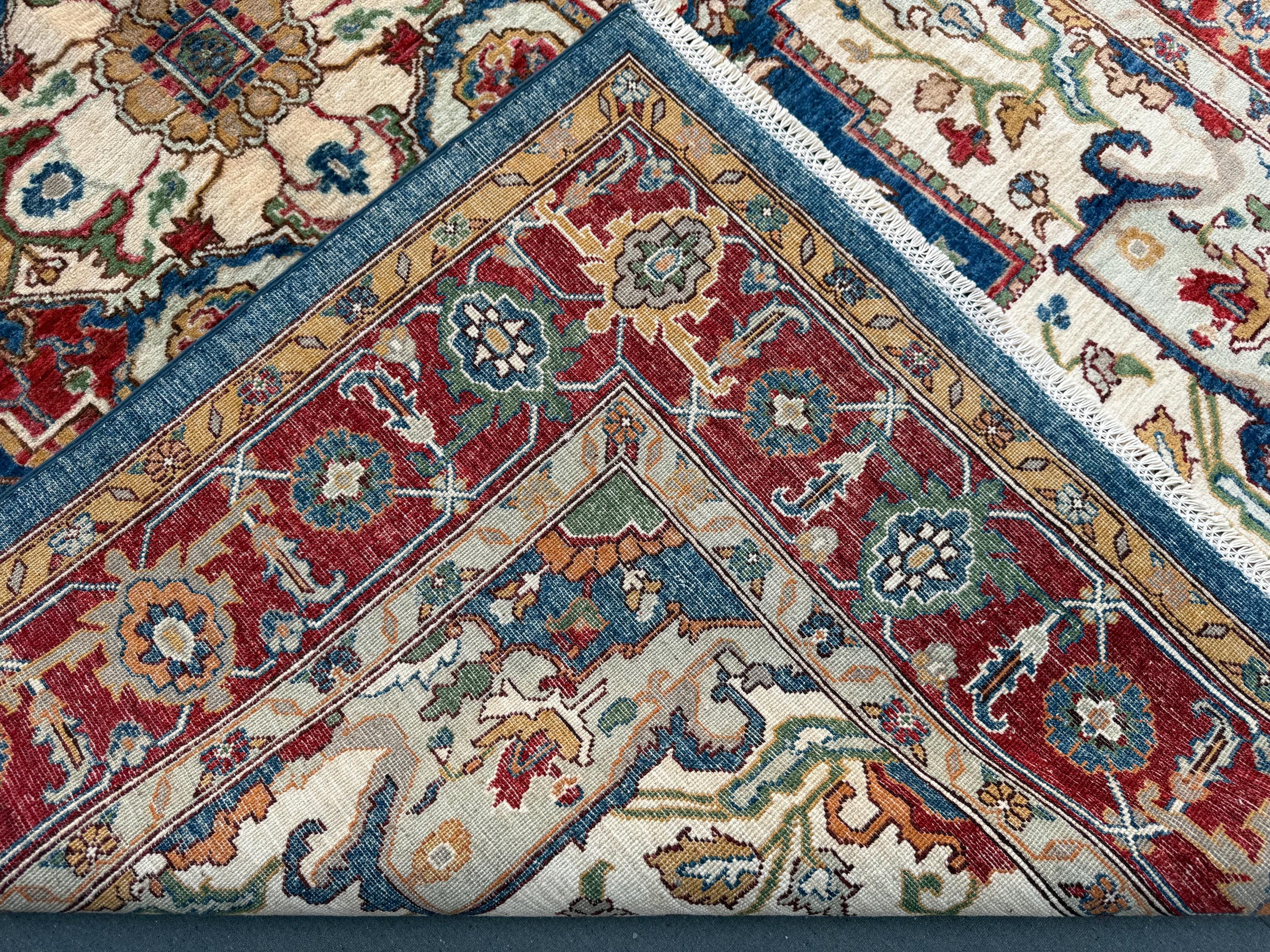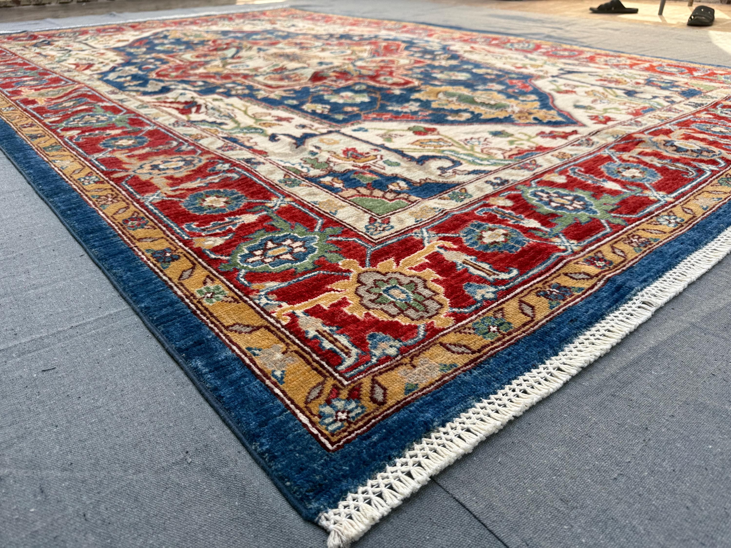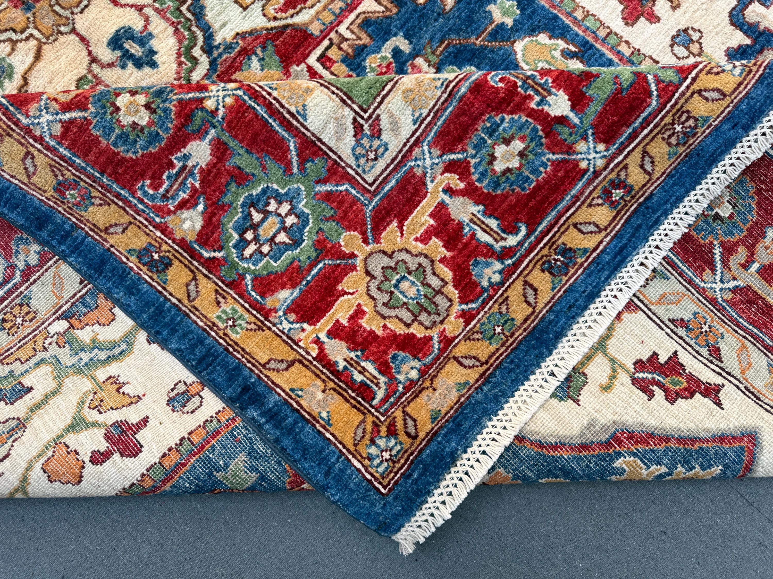 This rug blends red, navy, ivory, gold, sage green, and teal accents in a beautifully balanced layout. Hand-knotted from durable wool, it offers a soft, comfortable pile while maintaining the resilience Heriz rugs are known for. Perfect for heavy-use areas without sacrificing beauty.