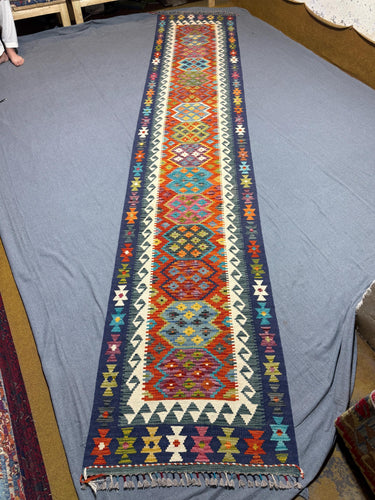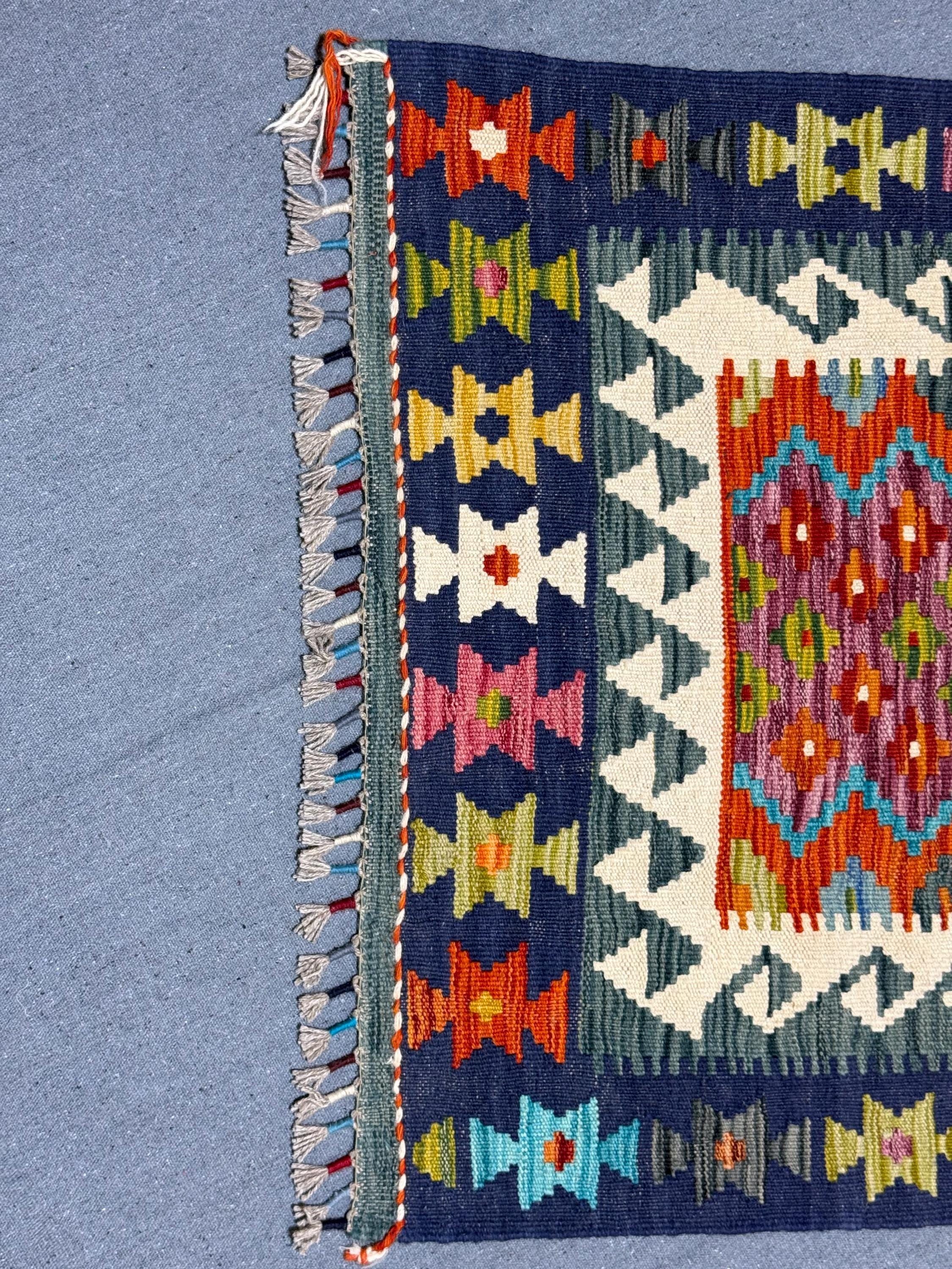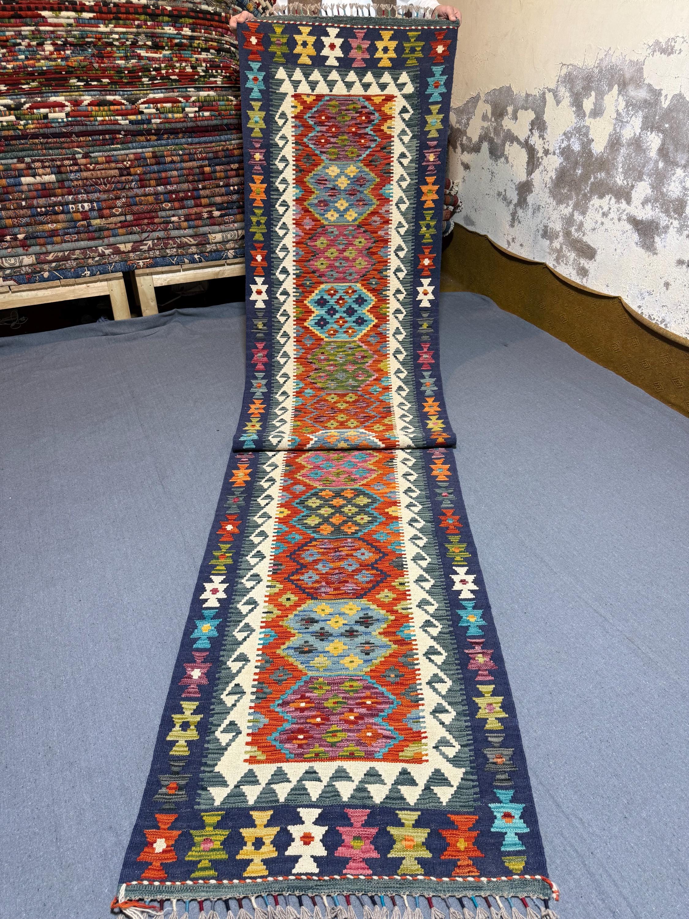 Elevate your hallway or entryway with this stunning handwoven Turkish Kilim runner rug, crafted using traditional techniques and 100% wool. Measuring 2.7 x 13.2 feet (79 x 401 cm), this vintage runner features a bold geometric tribal pattern in rich, vibrant colors including navy blue, ivory, terracotta, mustard yellow, turquoise, plum, and hints of green.