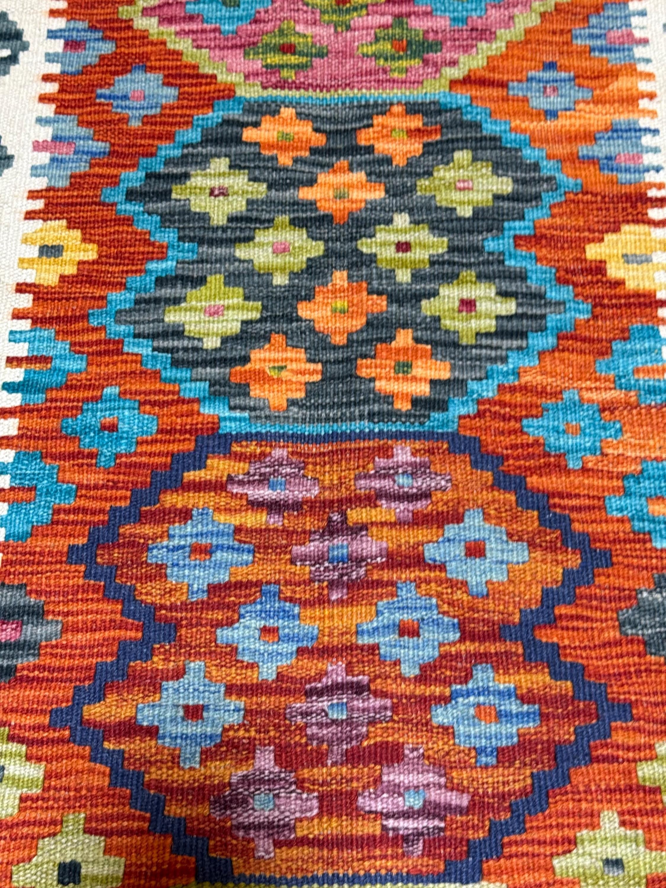 Whether your space leans bohemian, eclectic, or modern, this one-of-a-kind kilim runner adds warmth, texture, and a pop of color that instantly transforms the atmosphere.