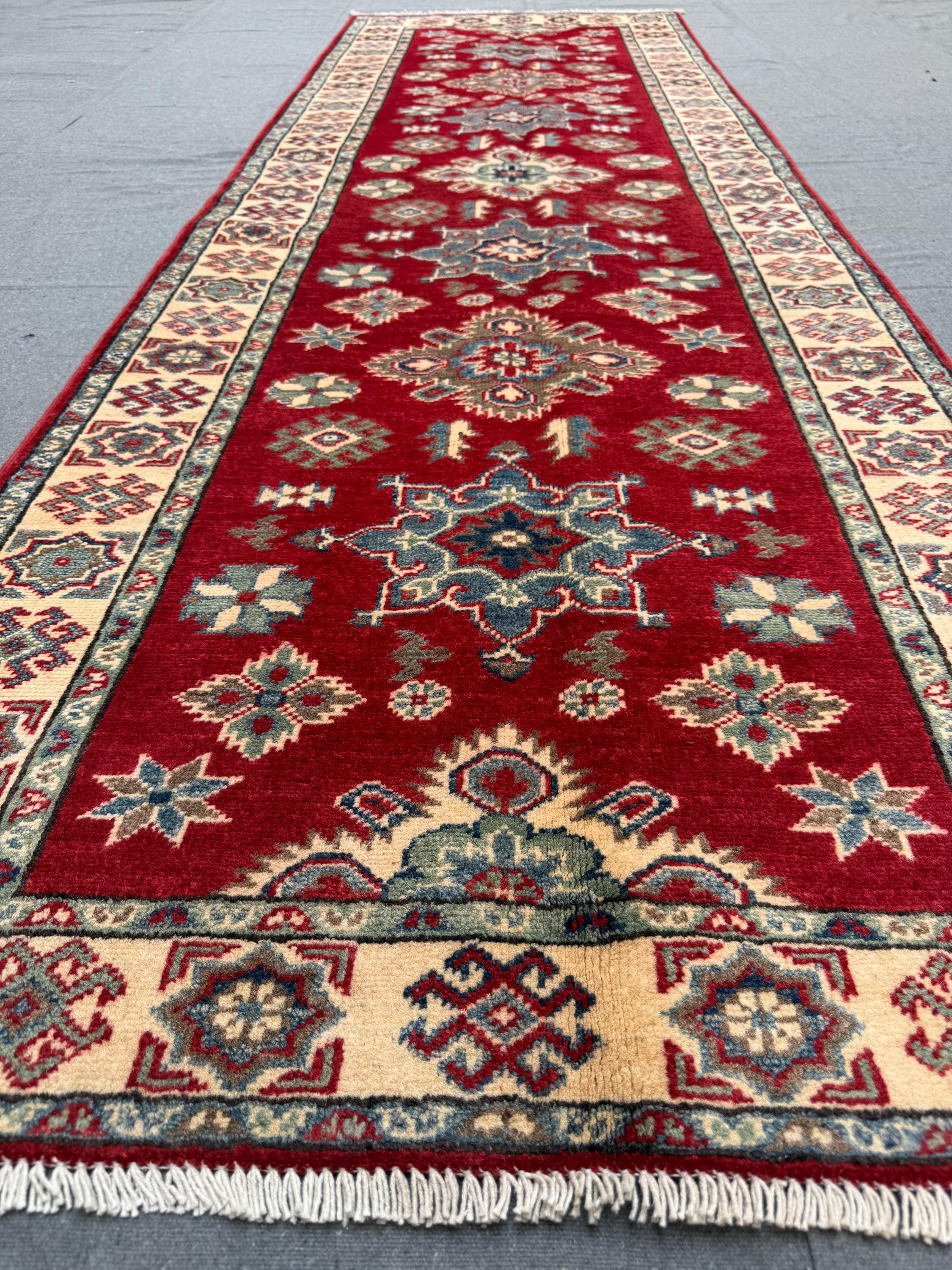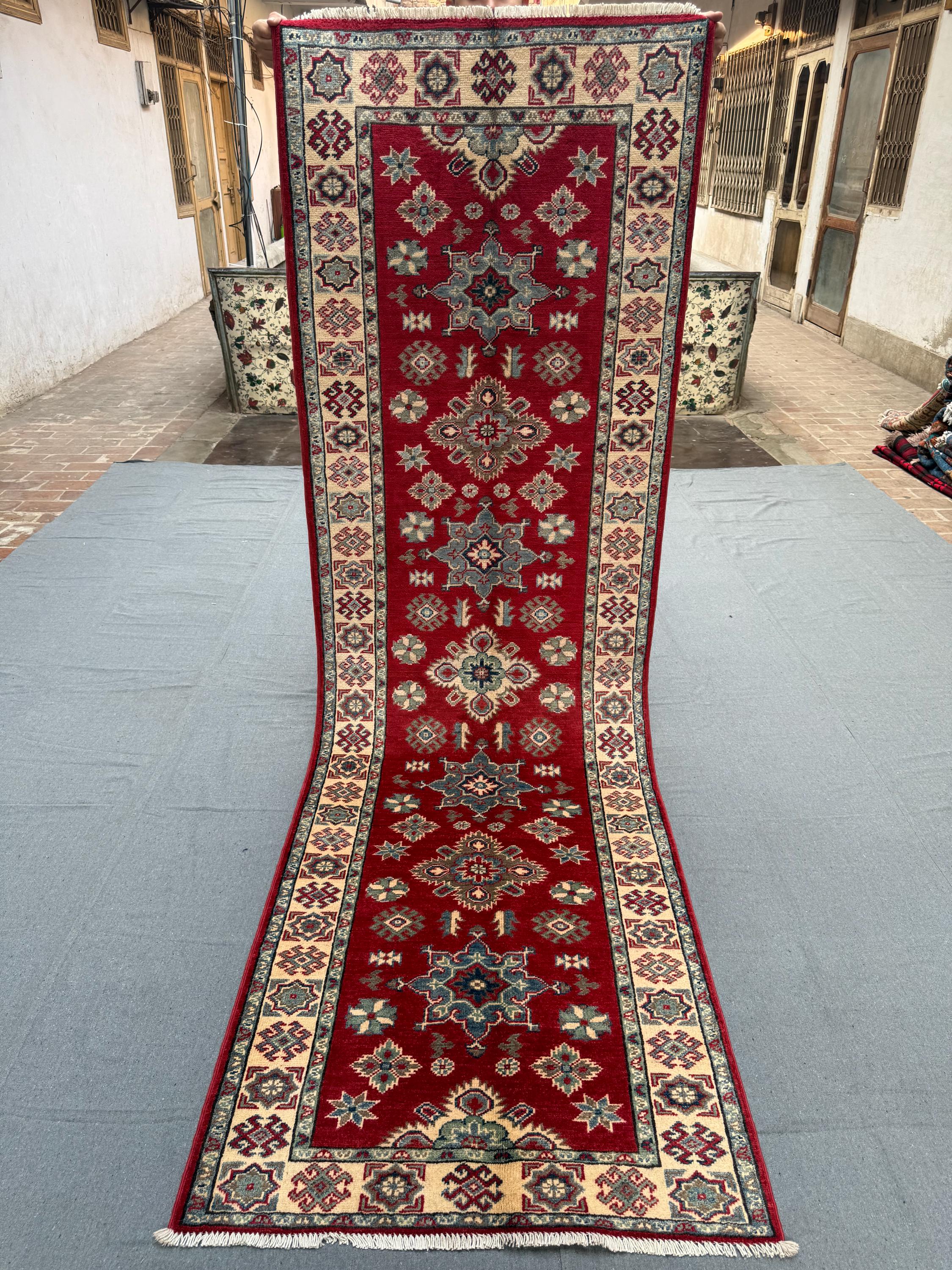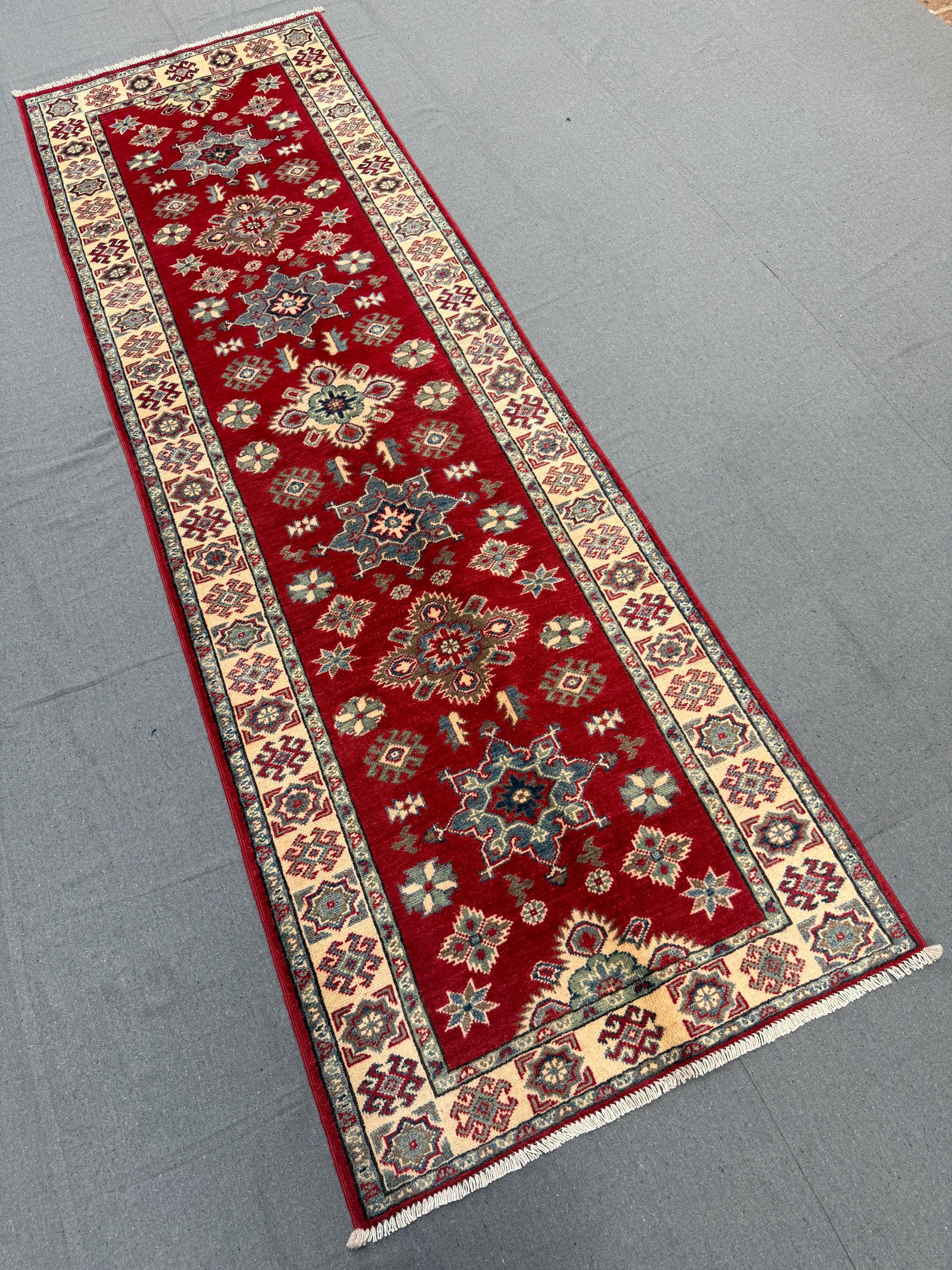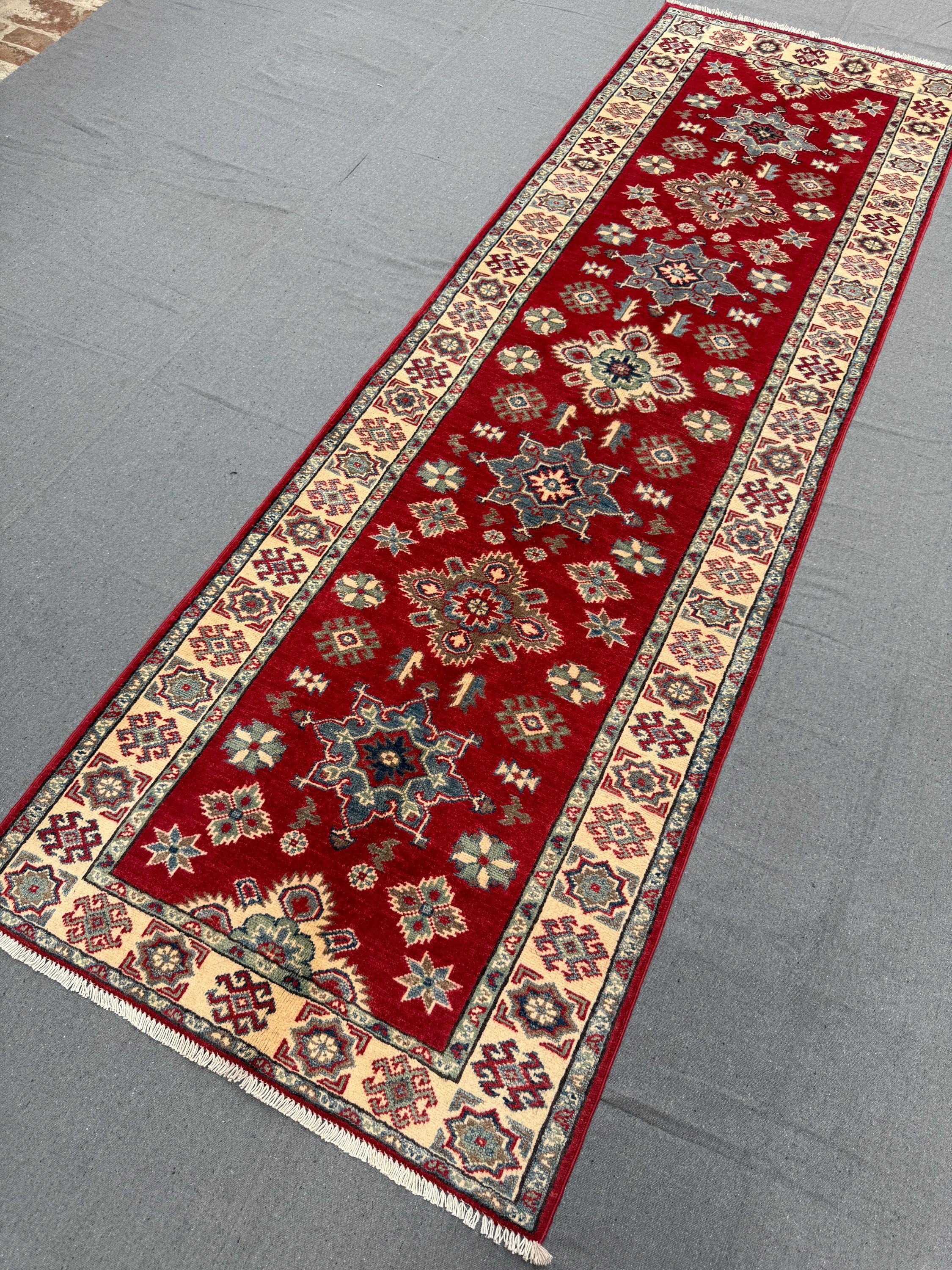 Kazak Runner Rug 2.9x9 ft Hand-Knotted Wool Afghan Runner, Red Geometric Hallway Rug, Oriental Tribal Wool Carpet for Entryway