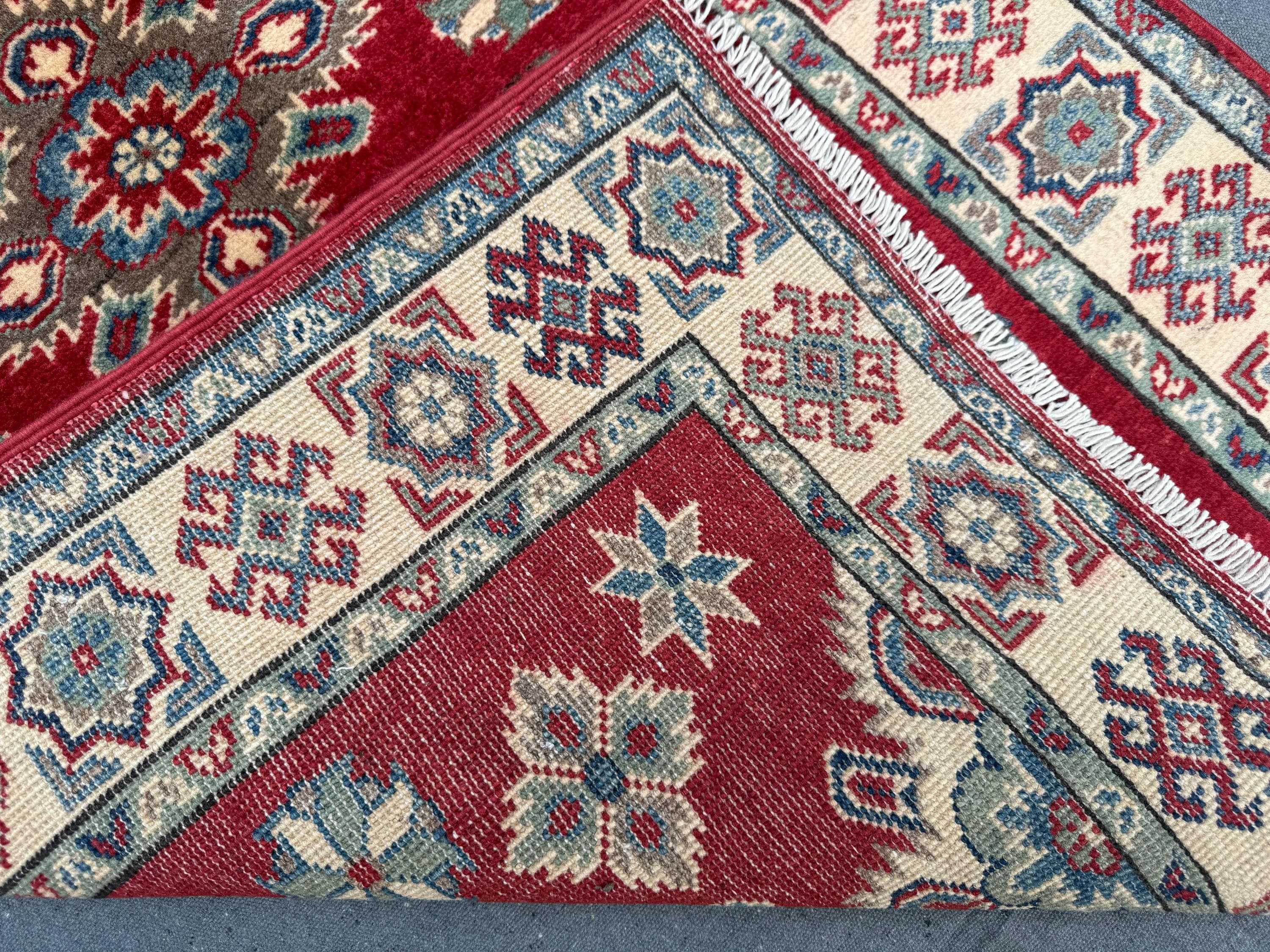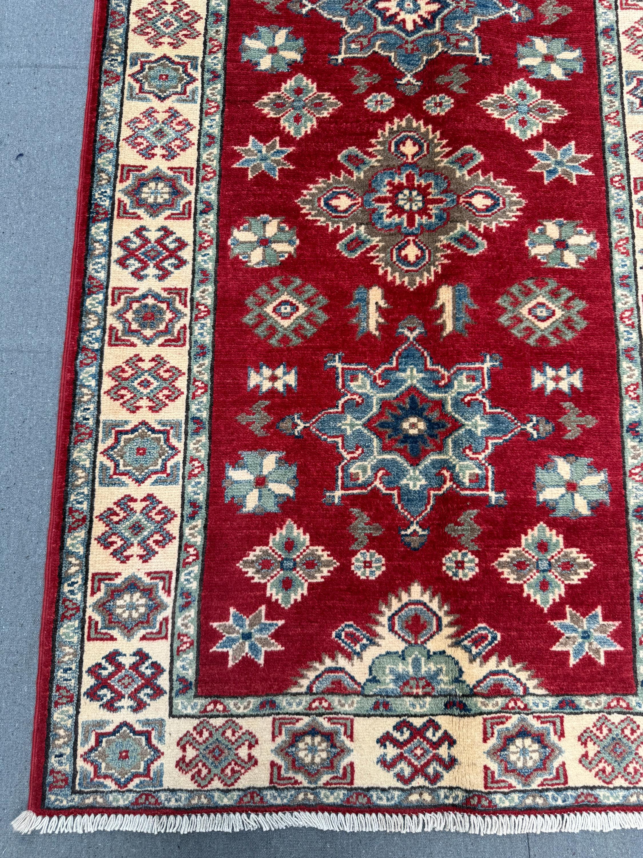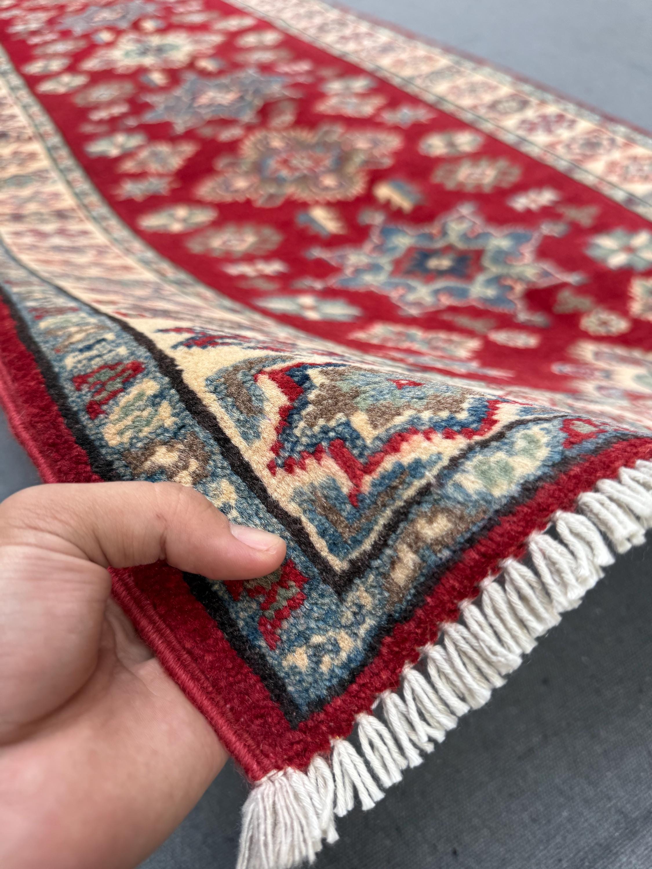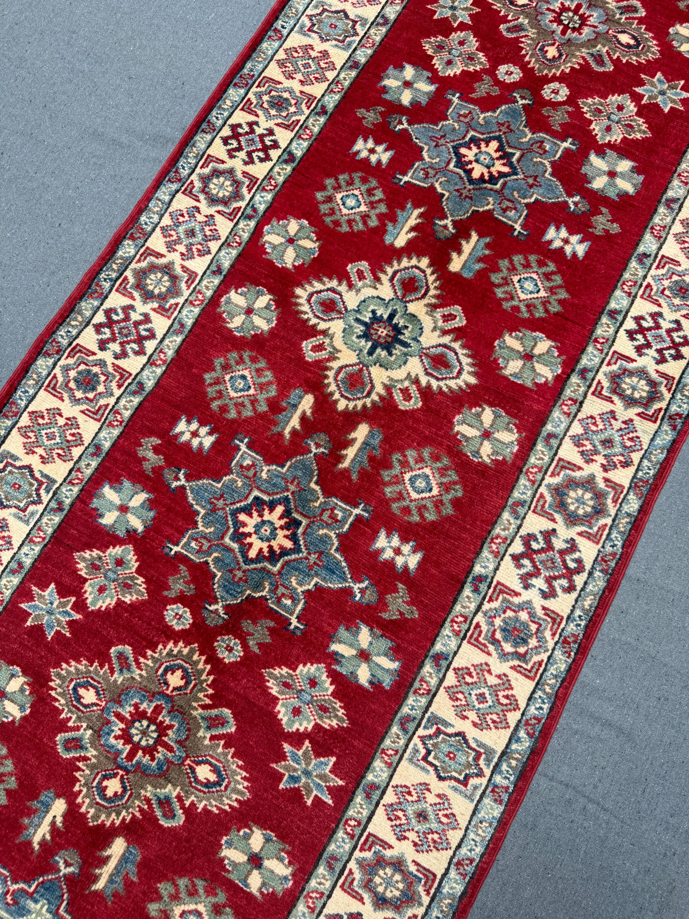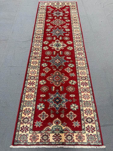 Kazak Runner Rug 2.9x9 ft Hand-Knotted Wool Afghan Runner, Red Geometric Hallway Rug, Oriental Tribal Wool Carpet for Entryway