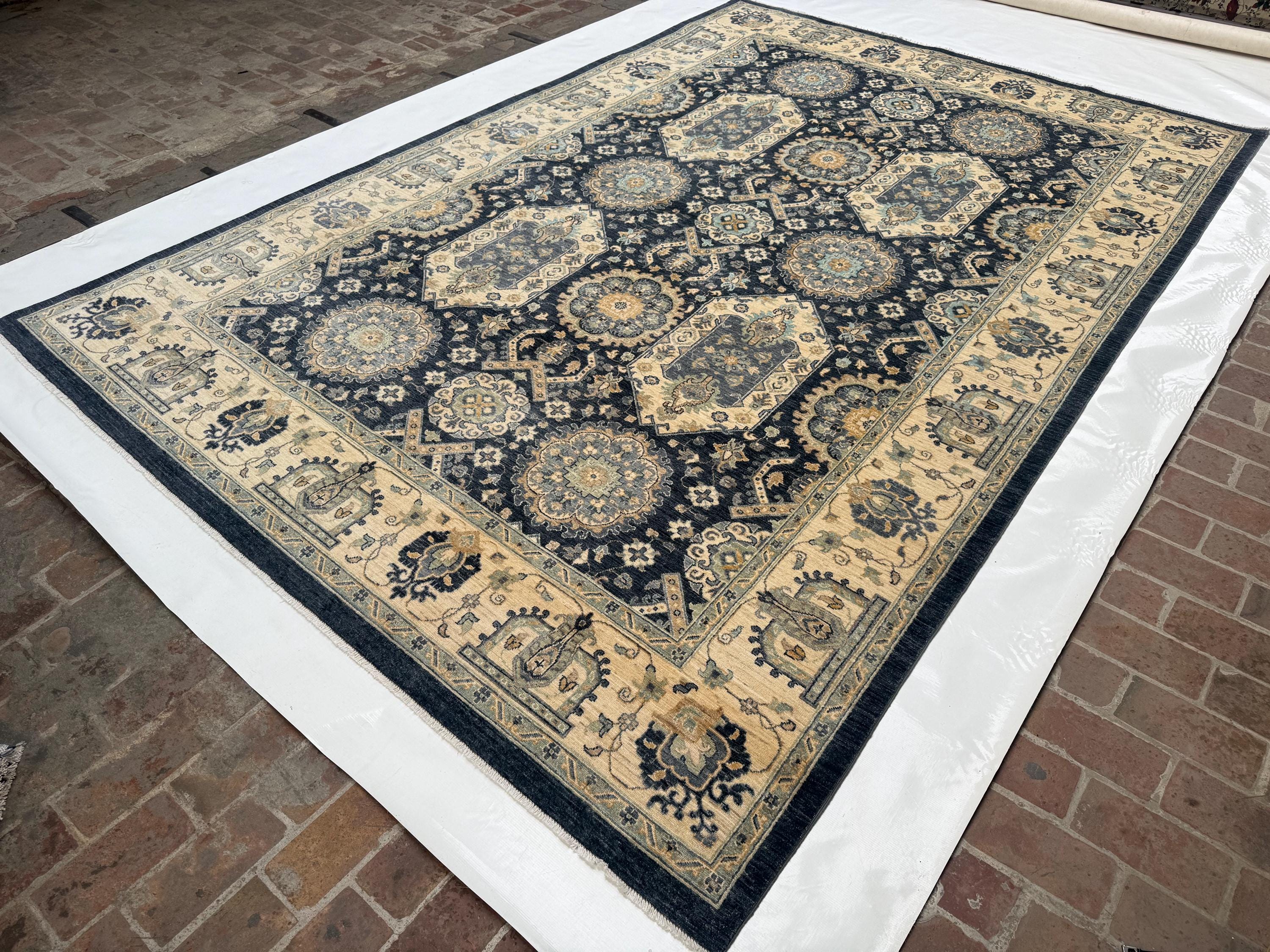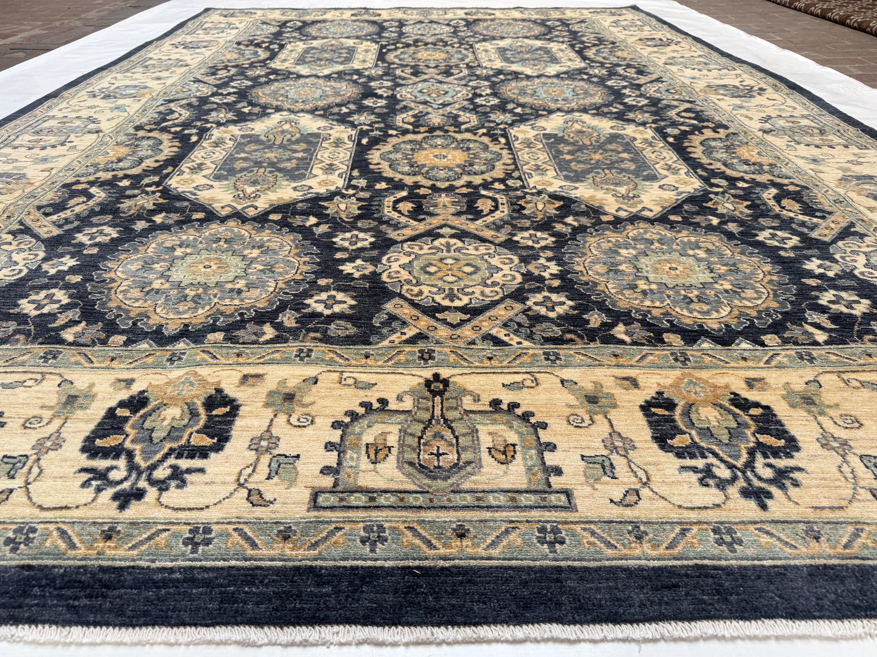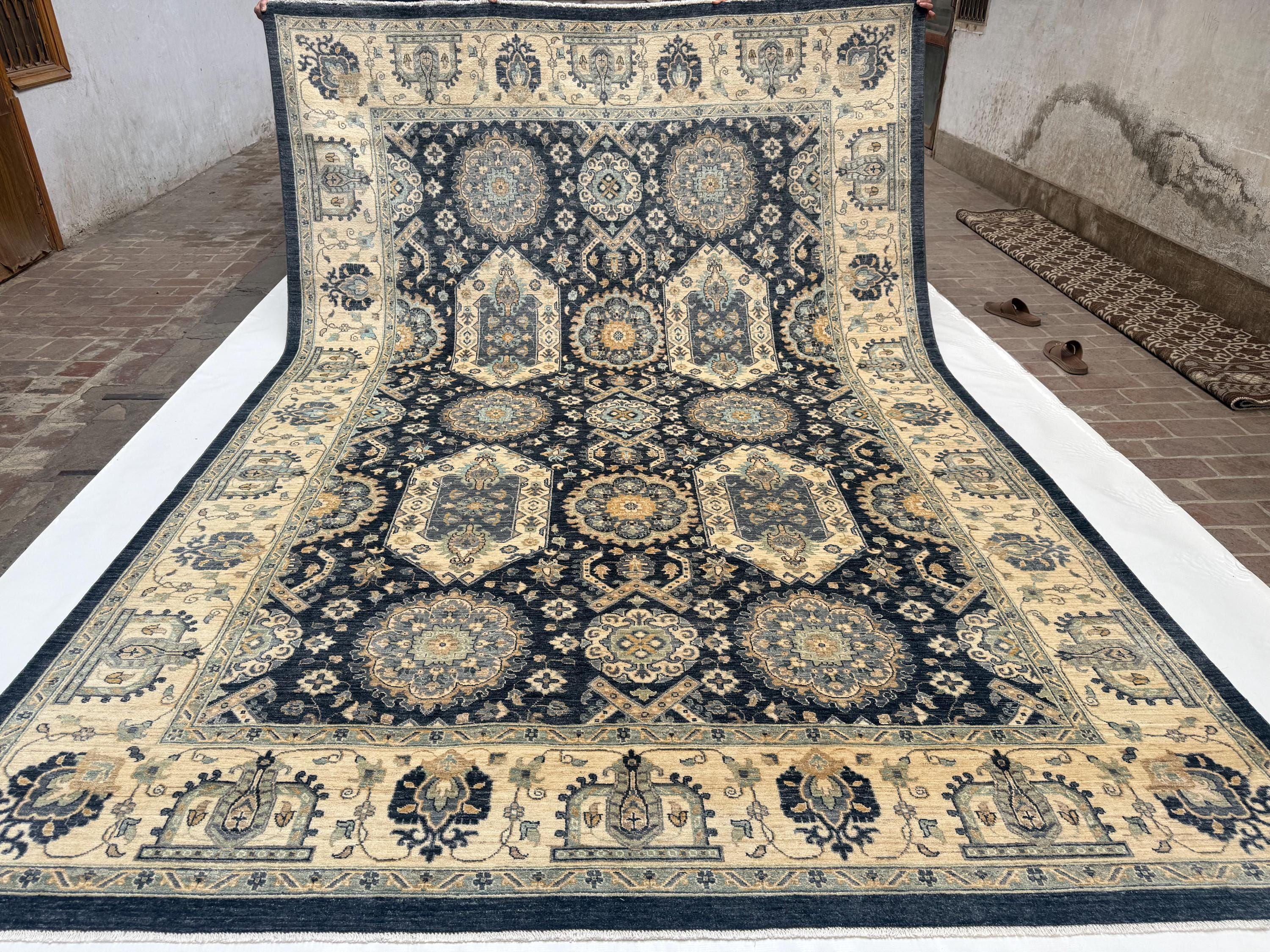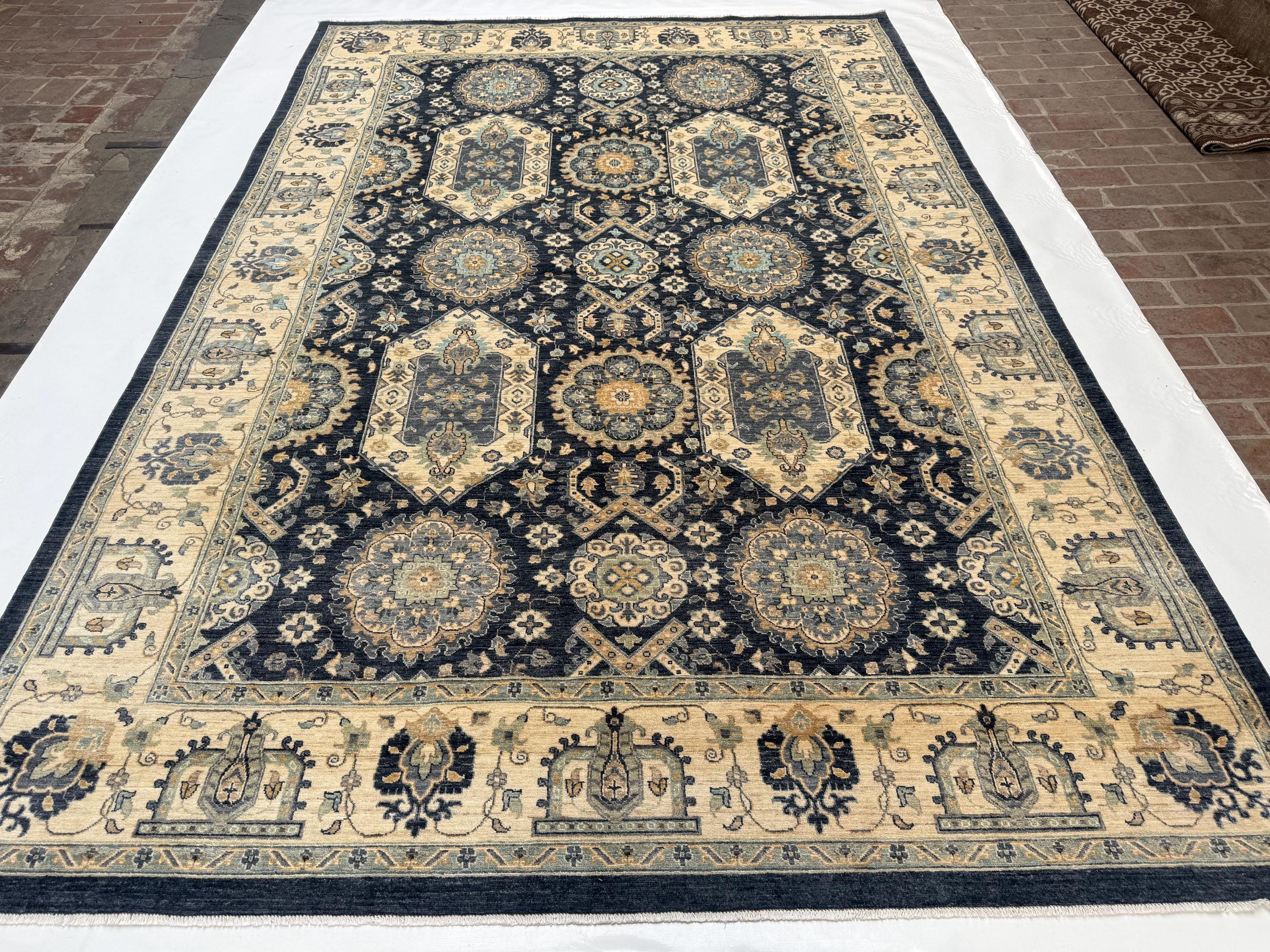 Transform your living space with this stunning handwoven Waziri rug, a masterpiece of Afghan craftsmanship. Measuring 8.8 x 12.10 feet (263 x 390 cm), this generously sized wool area rug features a striking geometric medallion pattern that effortlessly blends traditional Oriental aesthetics with a timeless color palette of deep navy, warm beige, ivory, and muted gold.