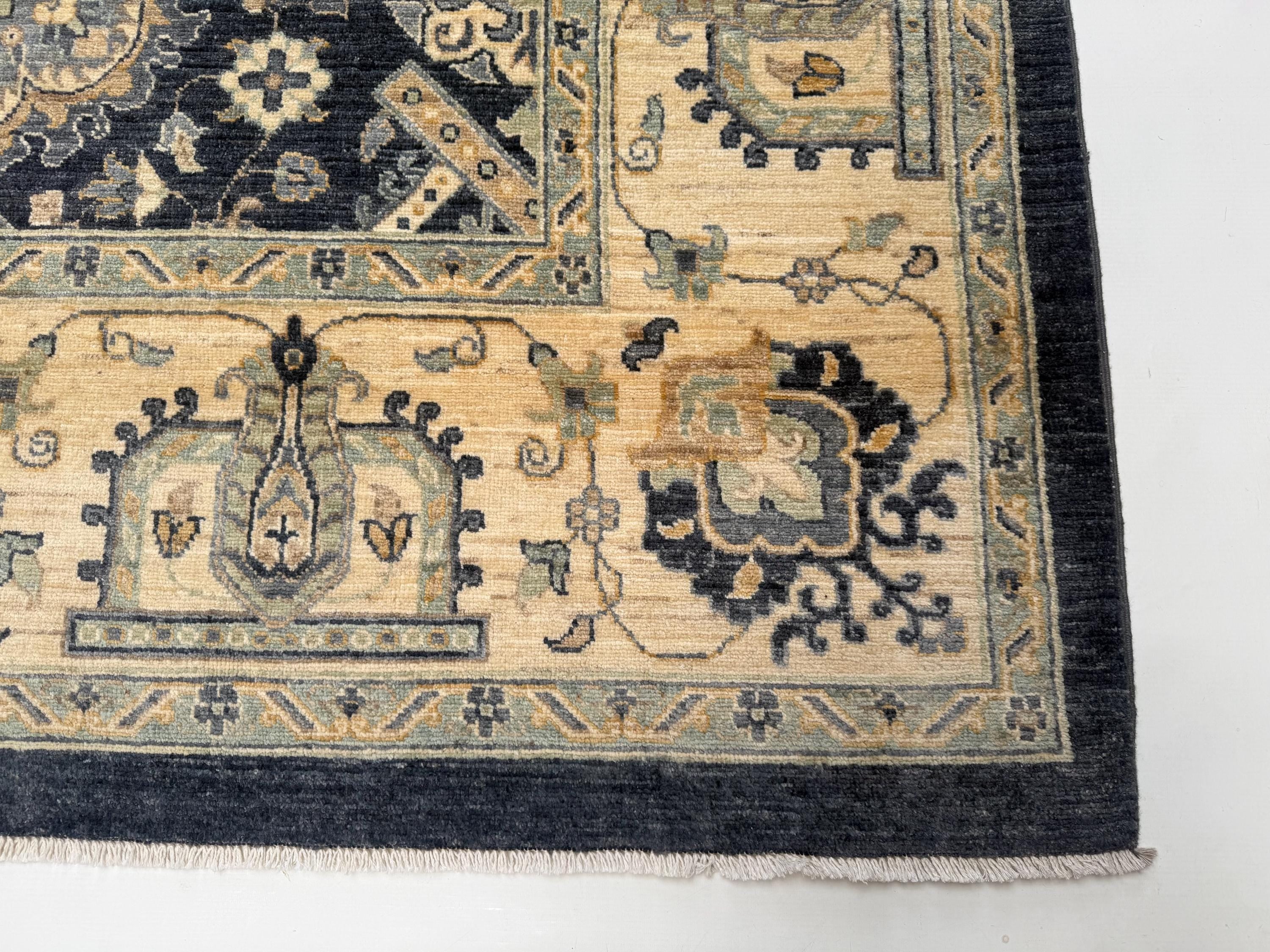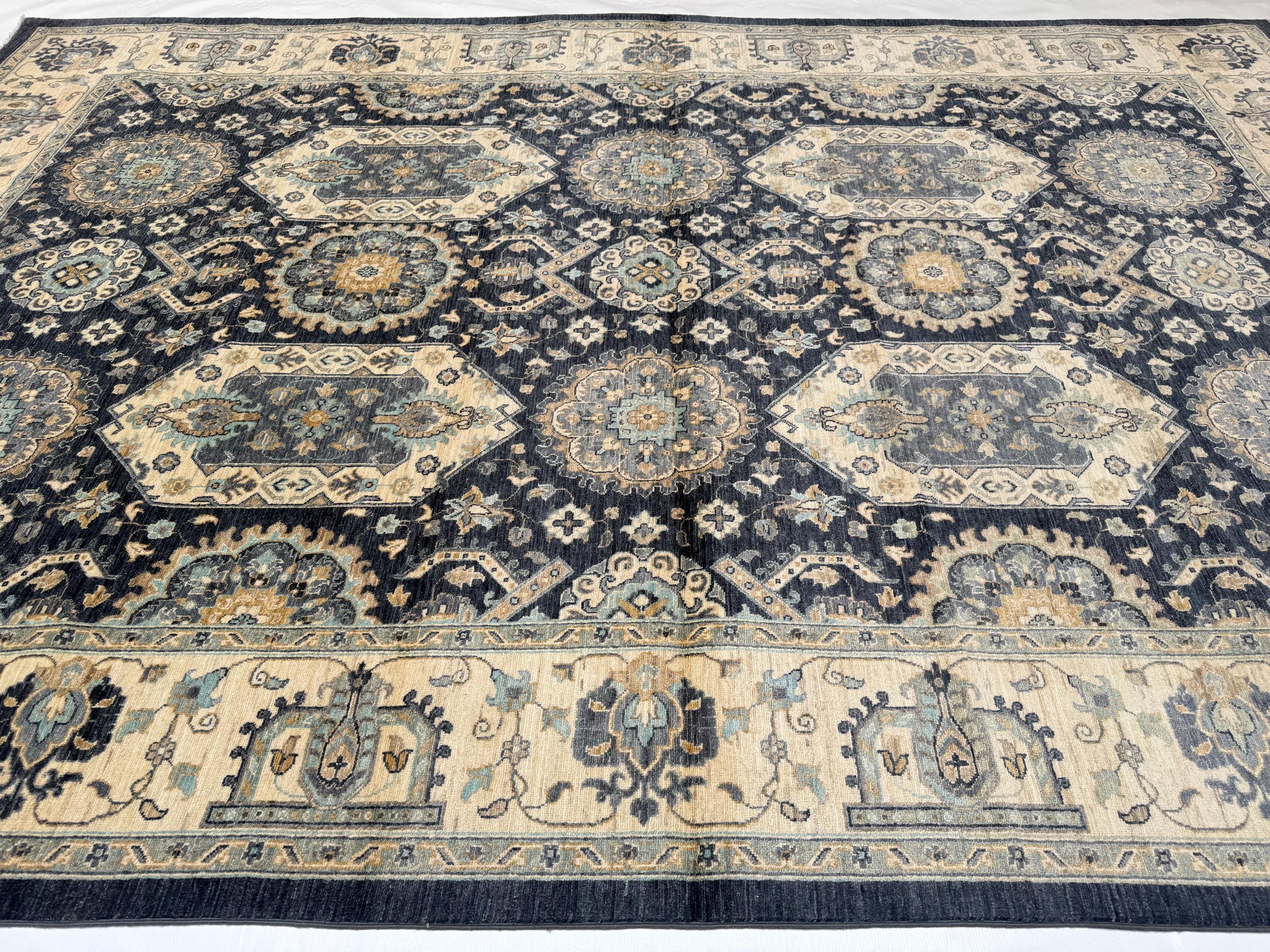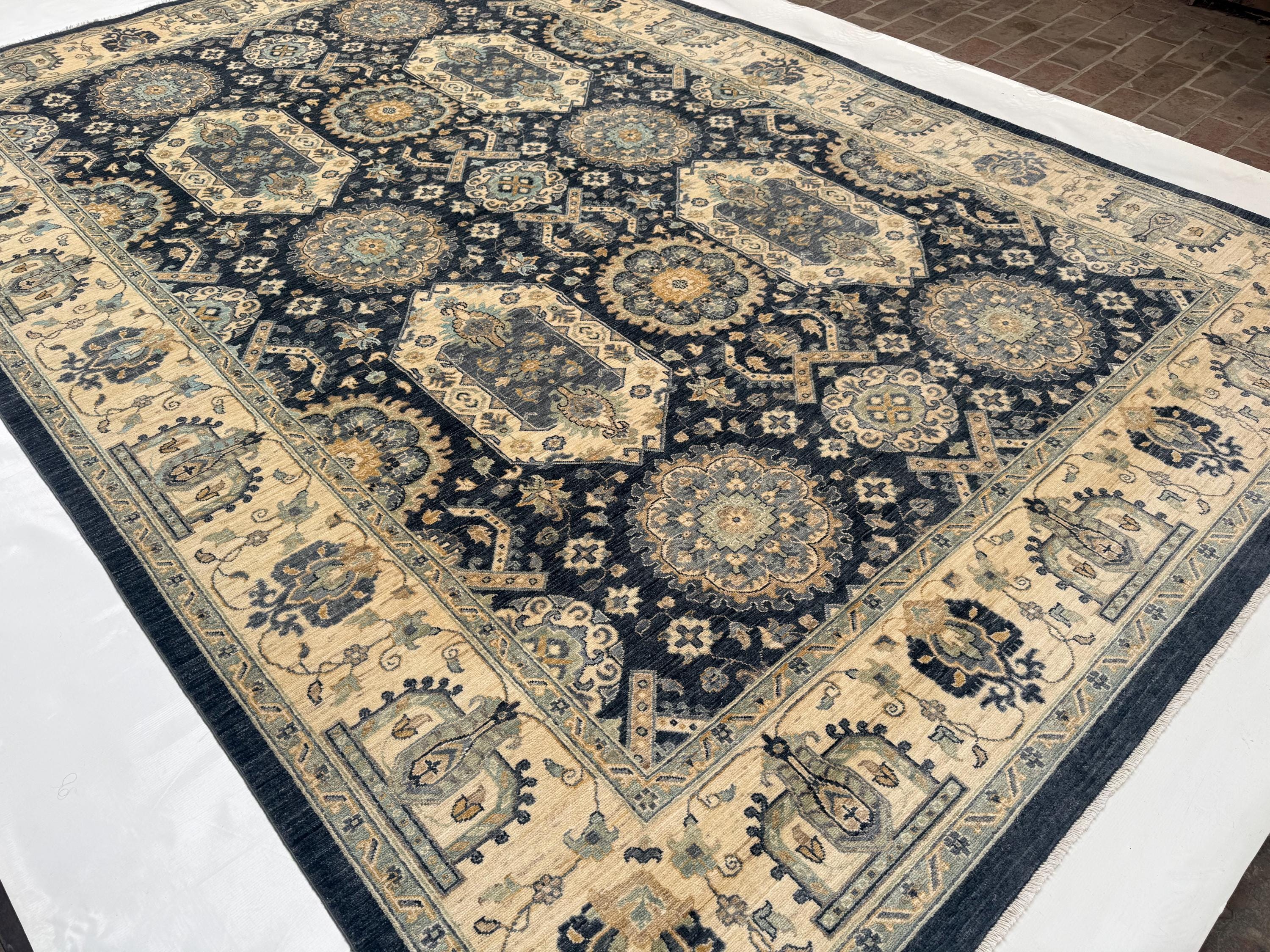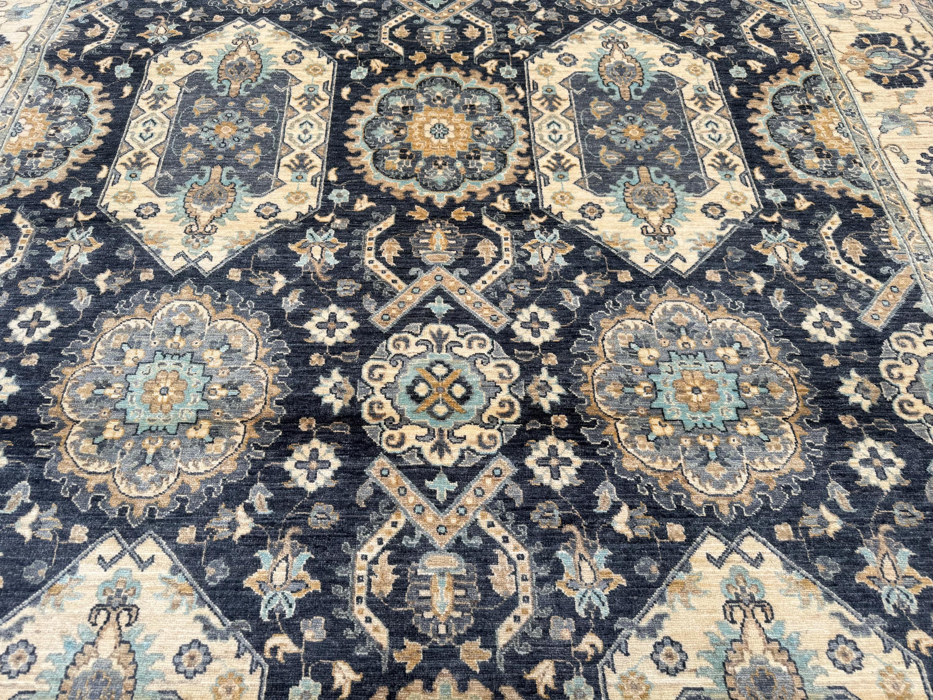 Transform your living space with this stunning handwoven Waziri rug, a masterpiece of Afghan craftsmanship. Measuring 8.8 x 12.10 feet (263 x 390 cm), this generously sized wool area rug features a striking geometric medallion pattern that effortlessly blends traditional Oriental aesthetics with a timeless color palette of deep navy, warm beige, ivory, and muted gold.
