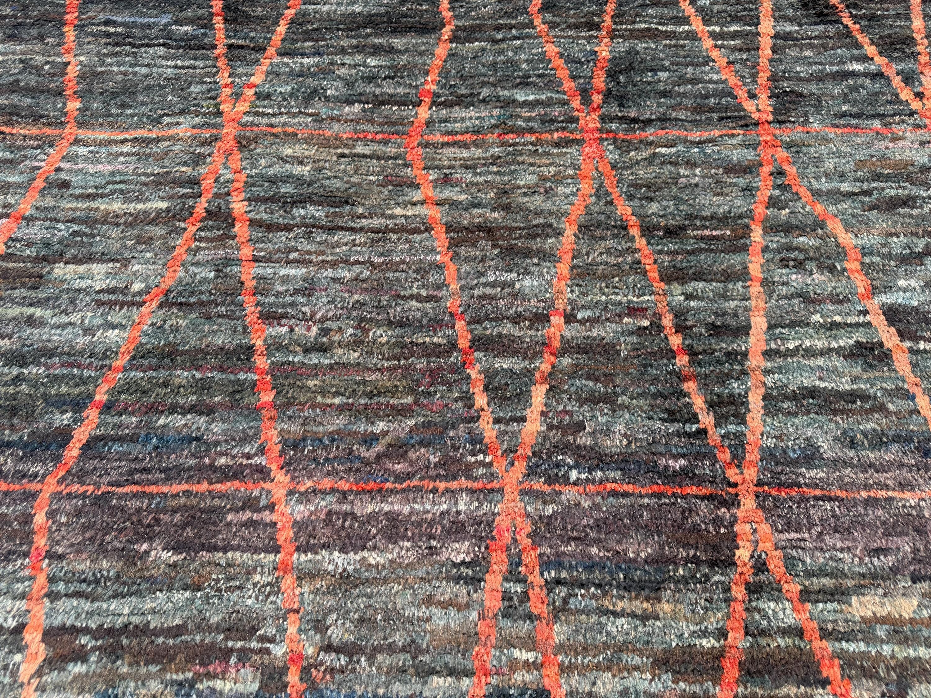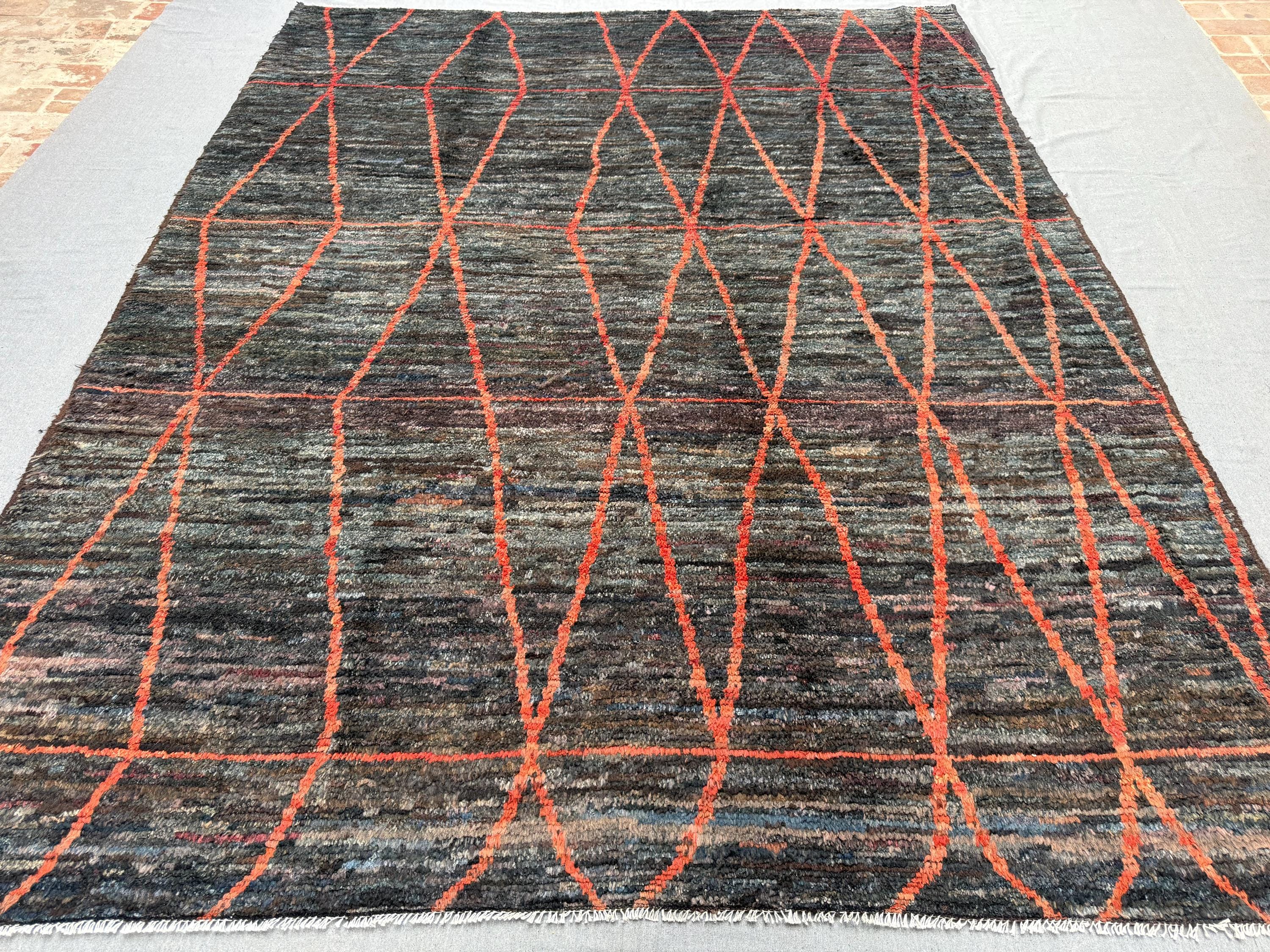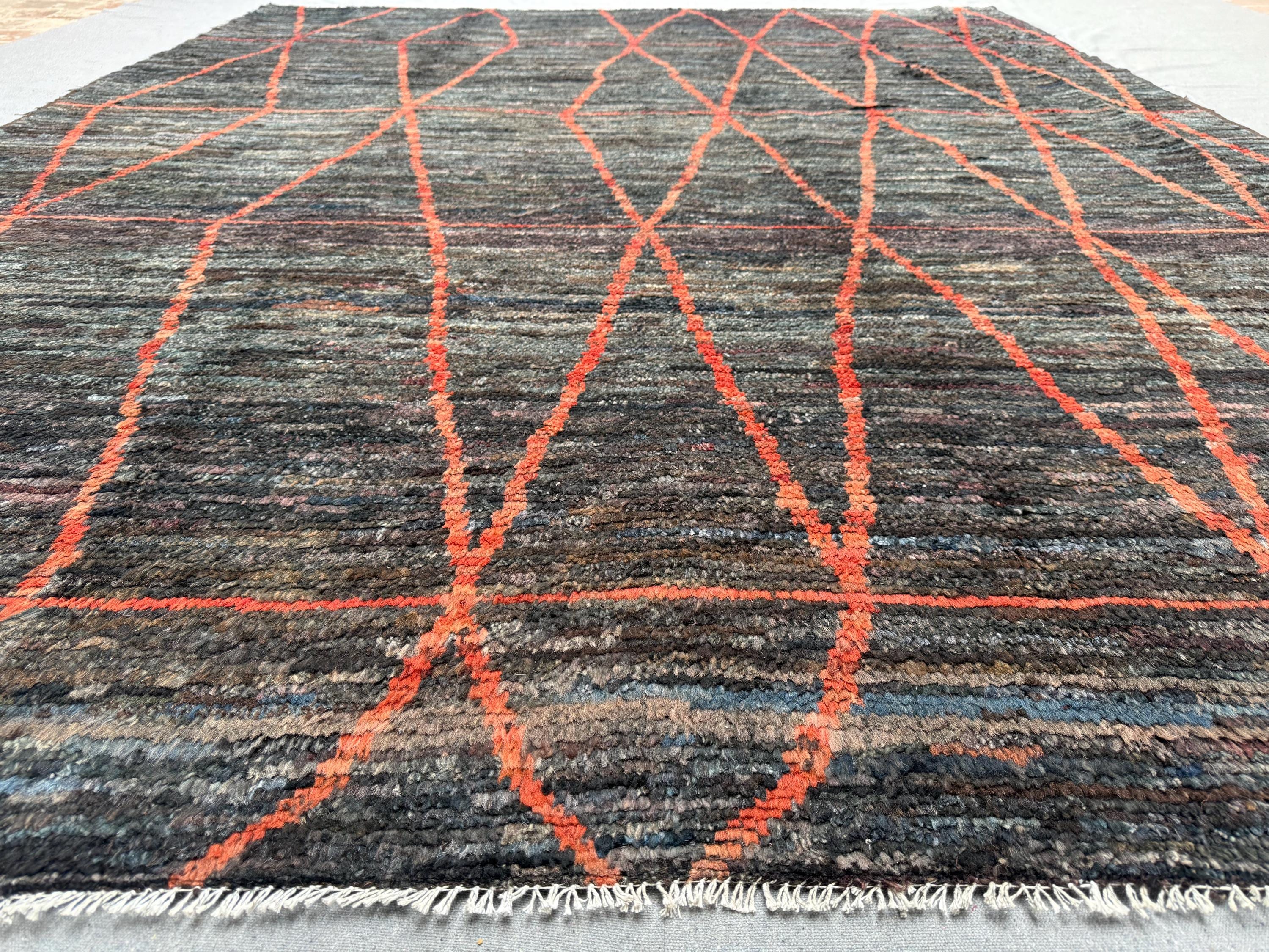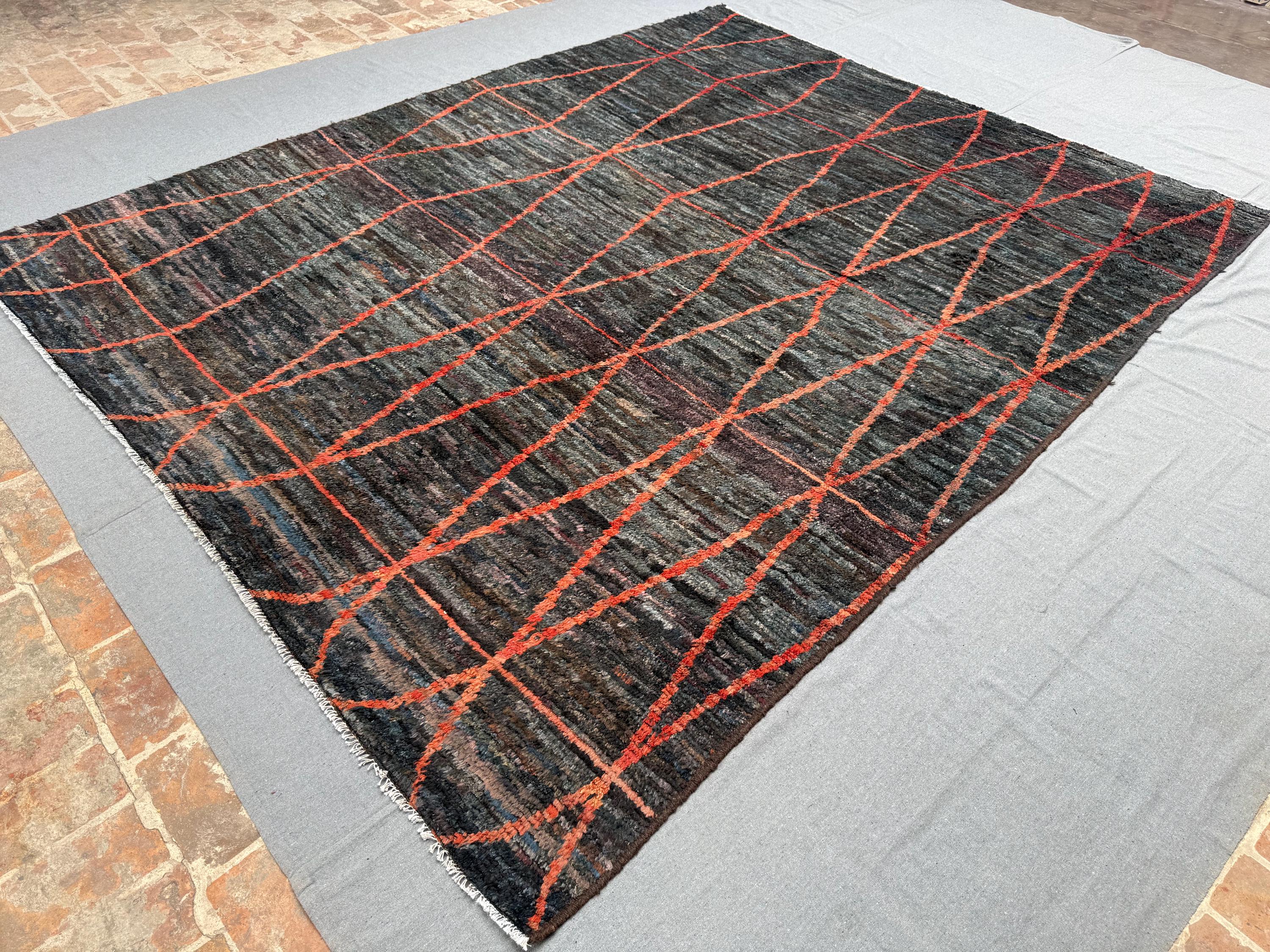Handmade Geometric Wool Rug 8x10 ft Modern Tribal Area Rug in Charcoal Gray with Burnt Orange Line Design