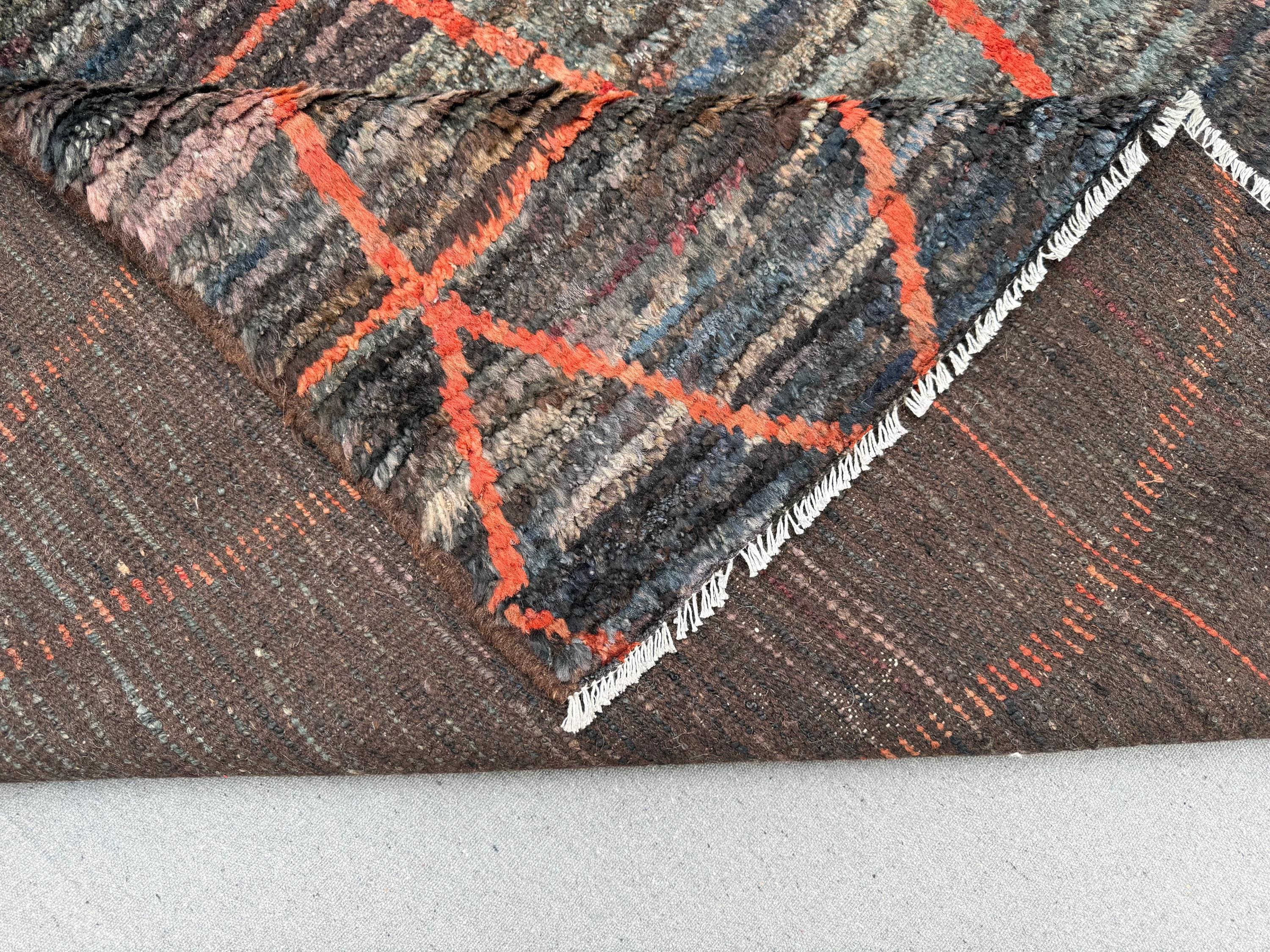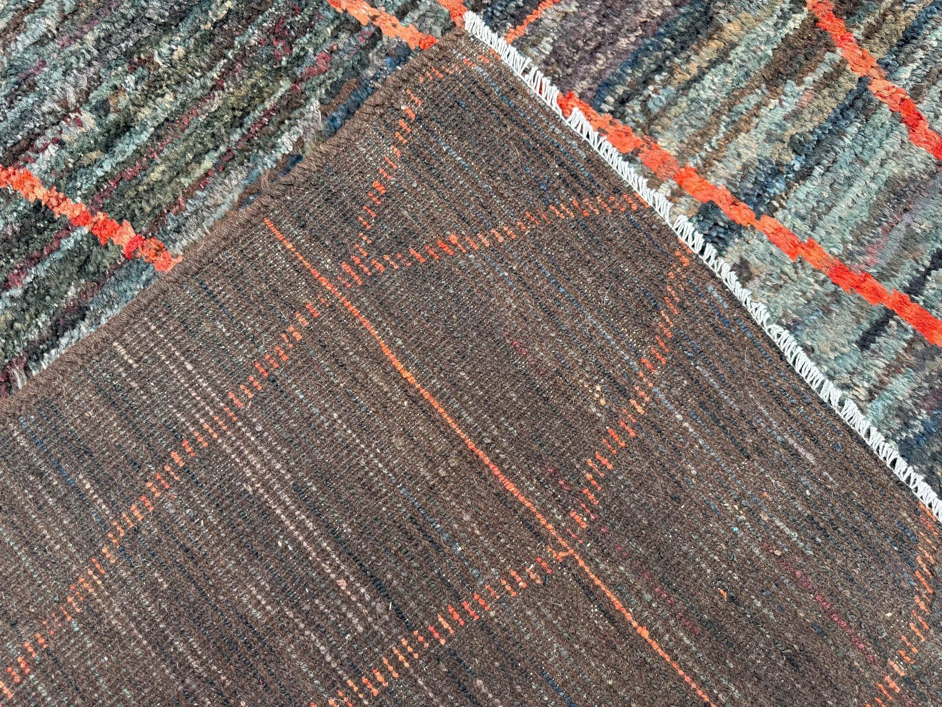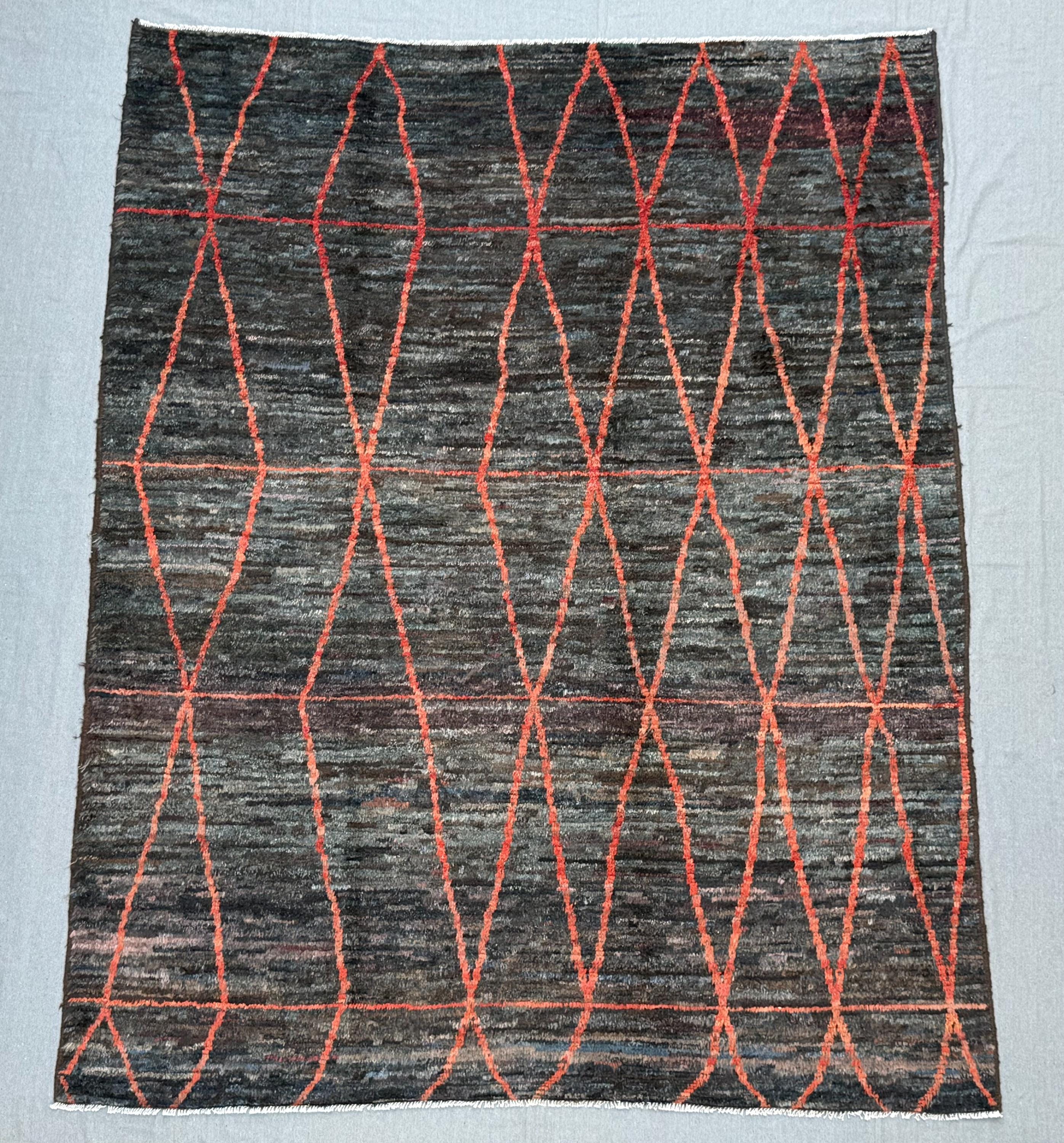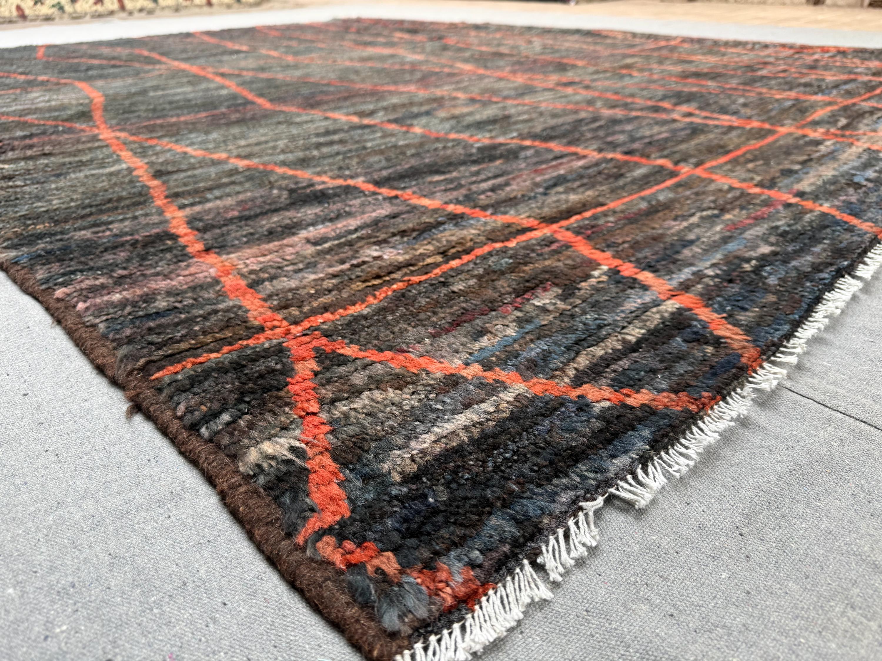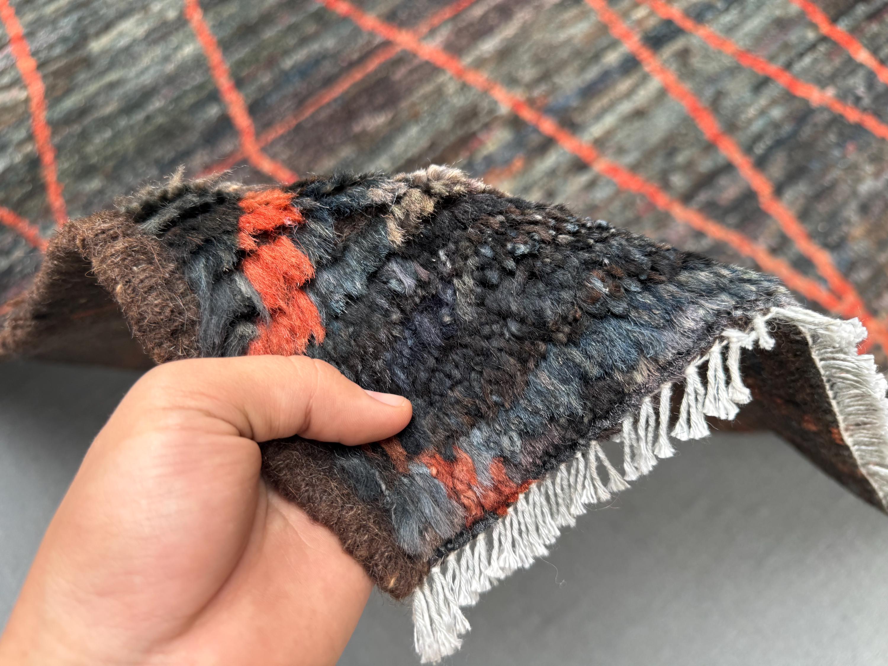 Handmade Geometric Wool Rug 8x10 ft Modern Tribal Area Rug in Charcoal Gray with Burnt Orange Line Design