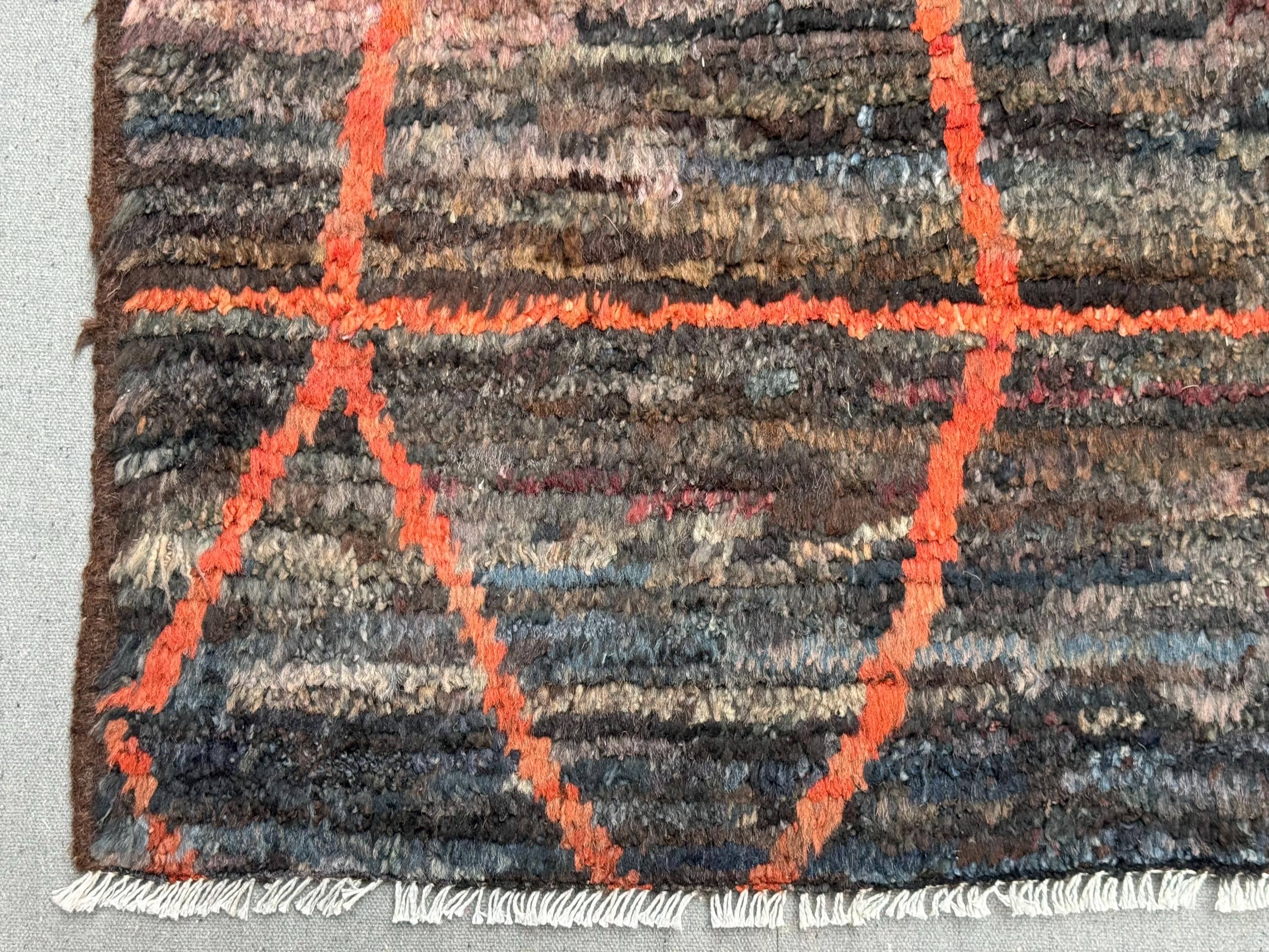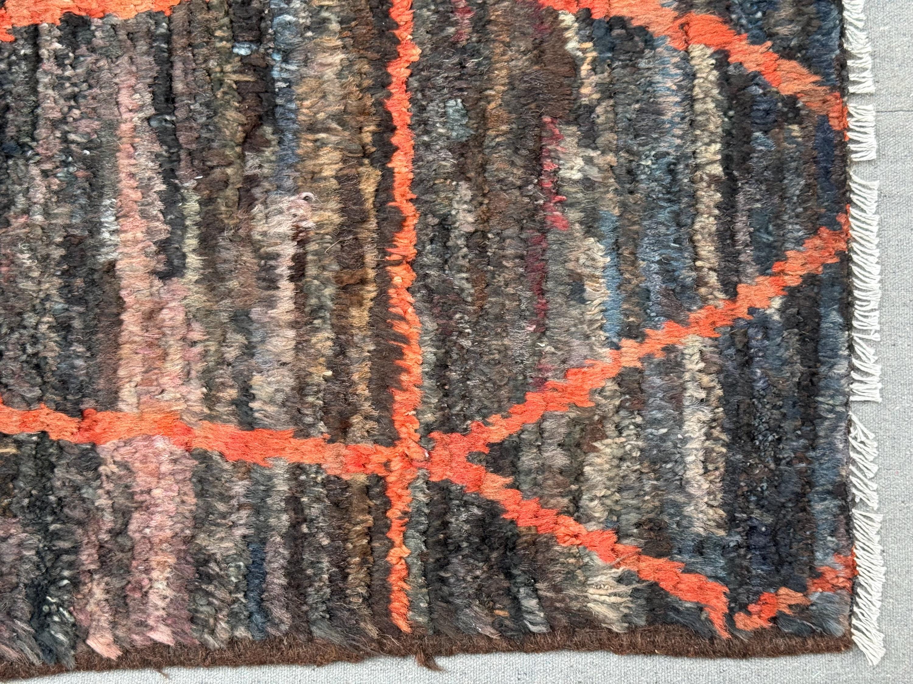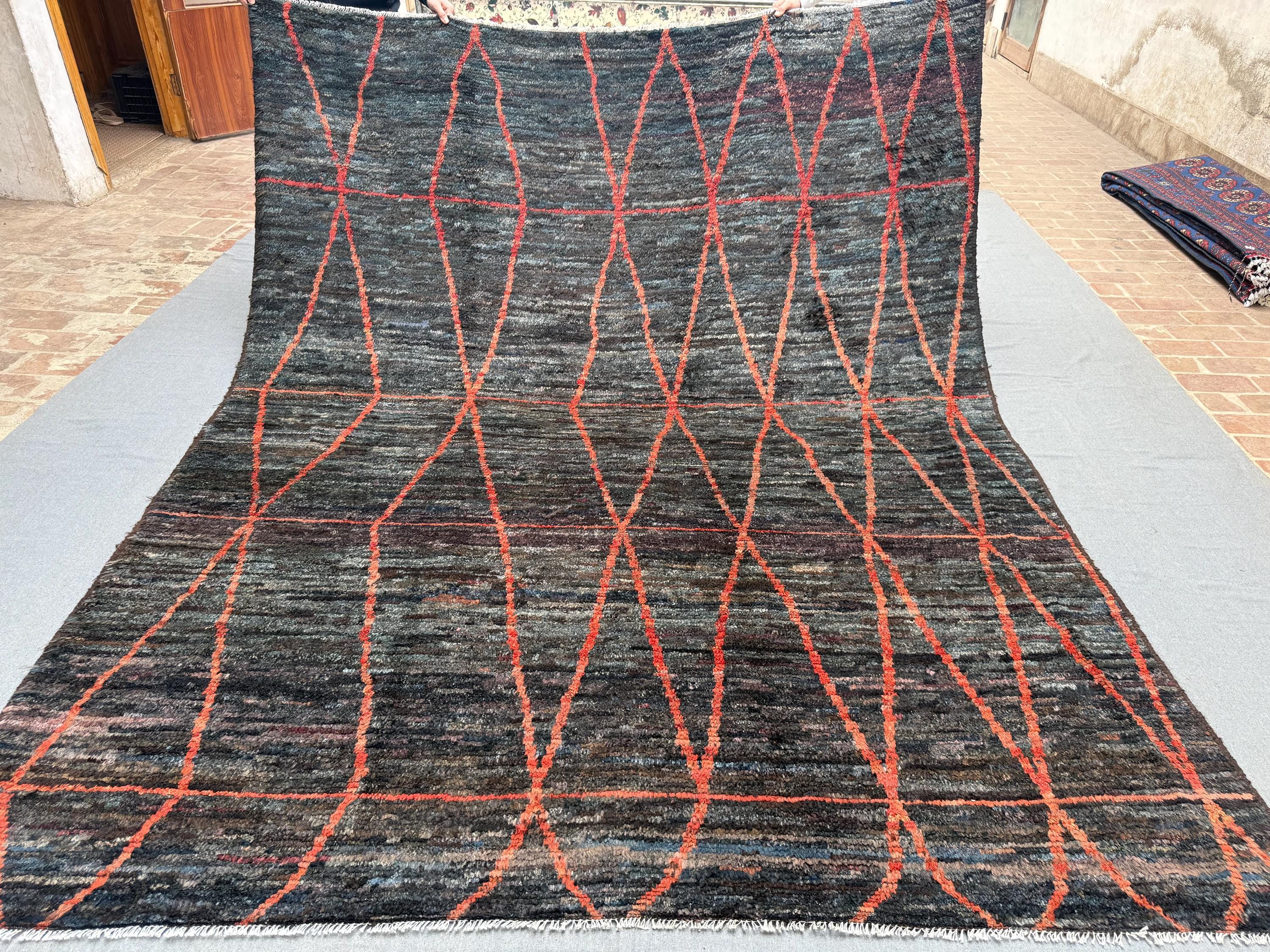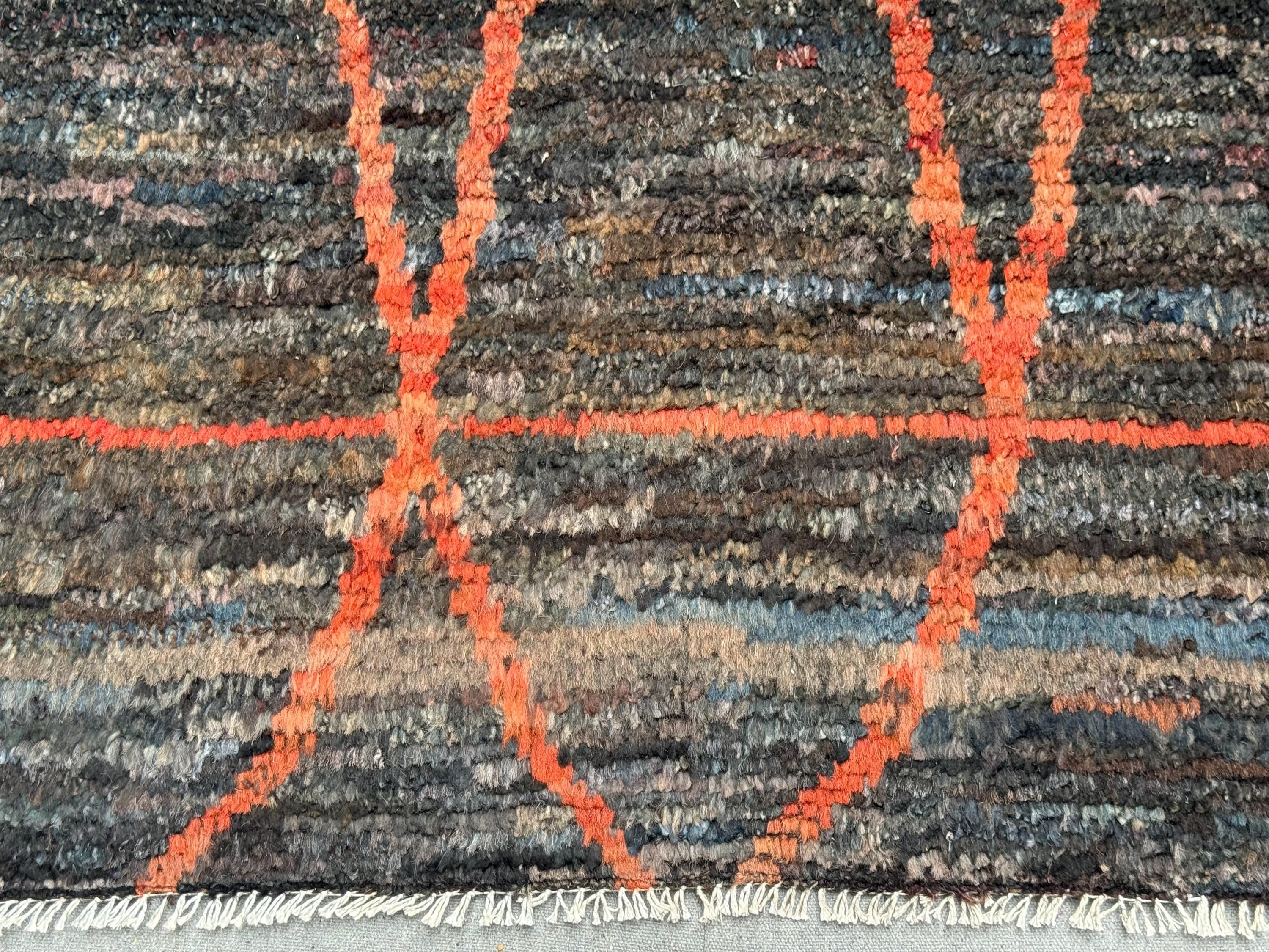 This handmade geometric wool rug features a bold, modern tribal pattern with flowing burnt orange linework set against a richly textured charcoal and dark gray background. The repeating linear design creates movement and rhythm while maintaining a clean, contemporary aesthetic.