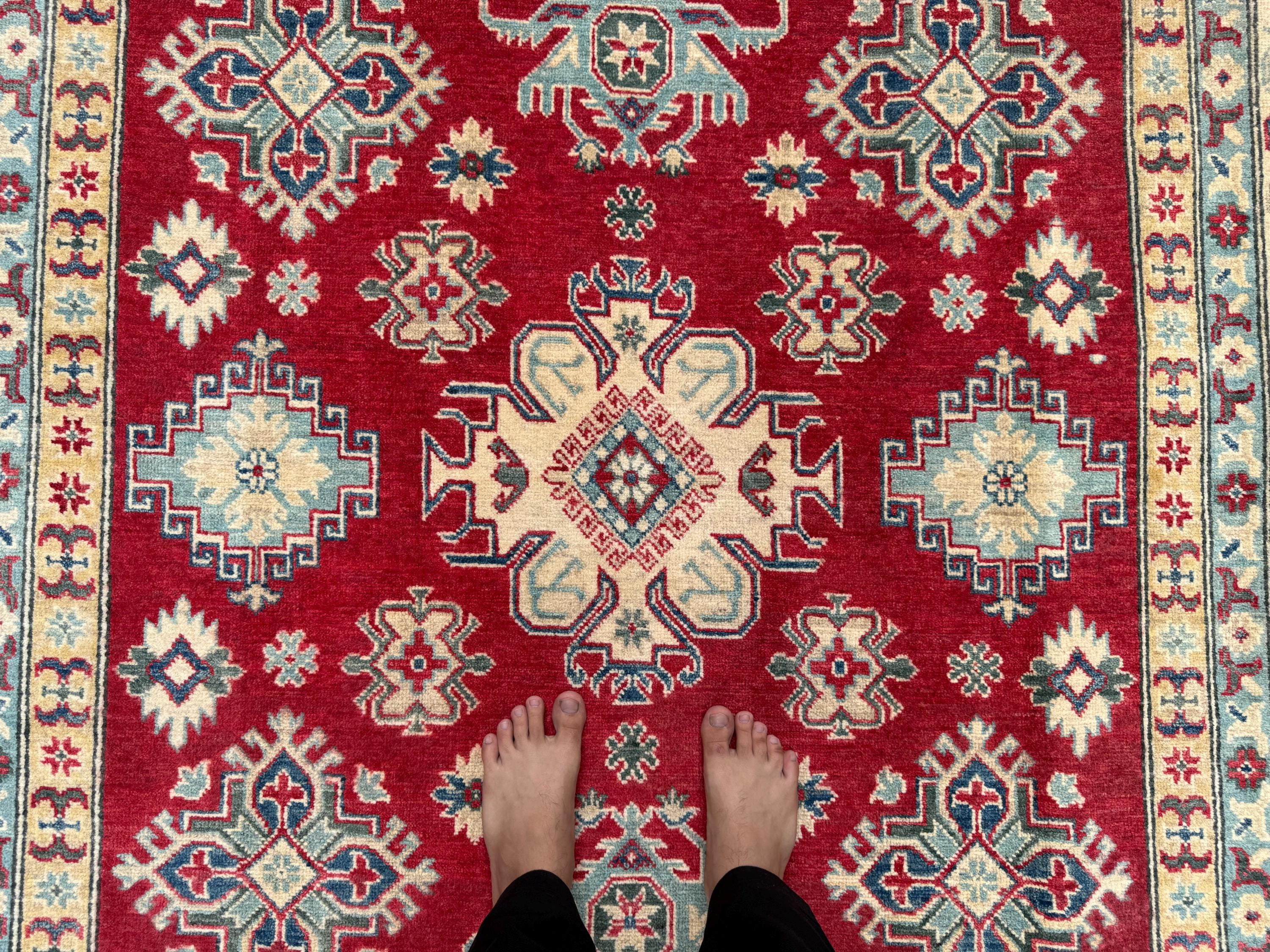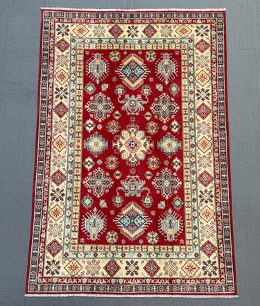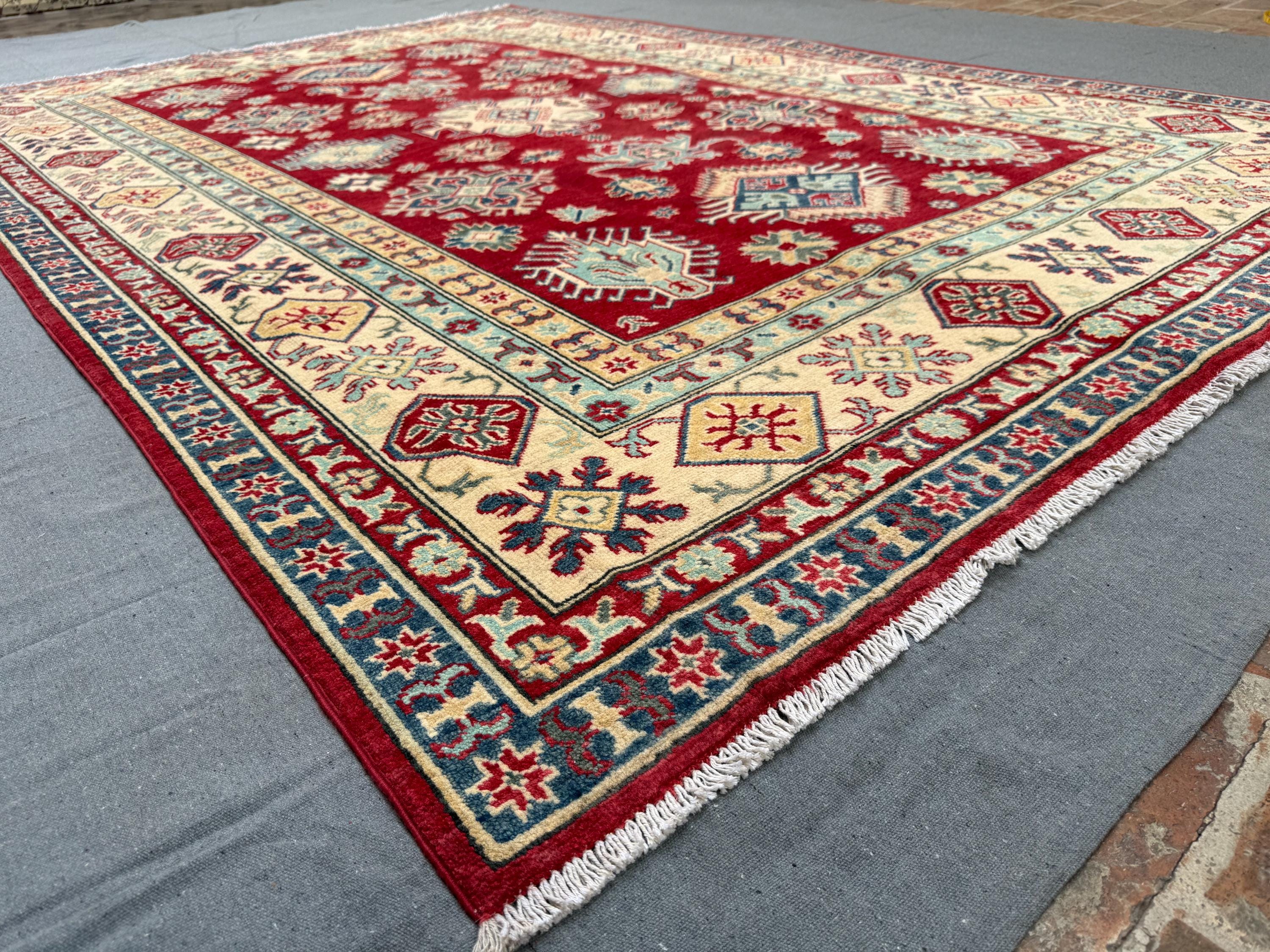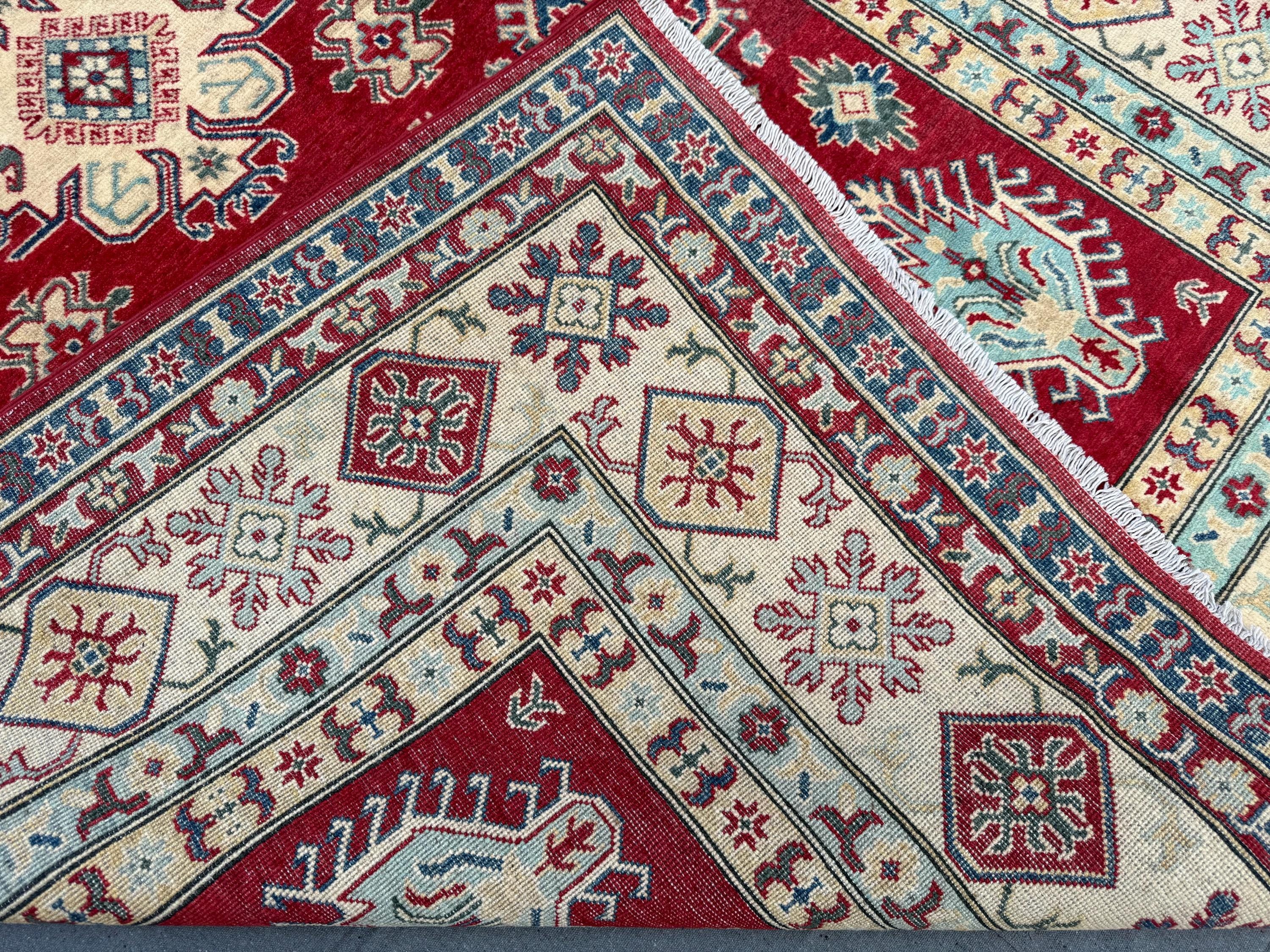 Hand-knotted from 100% premium wool, the rug feels both soft and durable underfoot — perfect for high-traffic spaces like living rooms, dining rooms, or home offices. Its strong visual balance of deep red, ivory, and blue tones gives it an elegant, statement-making look while staying true to the Kazak heritage.
