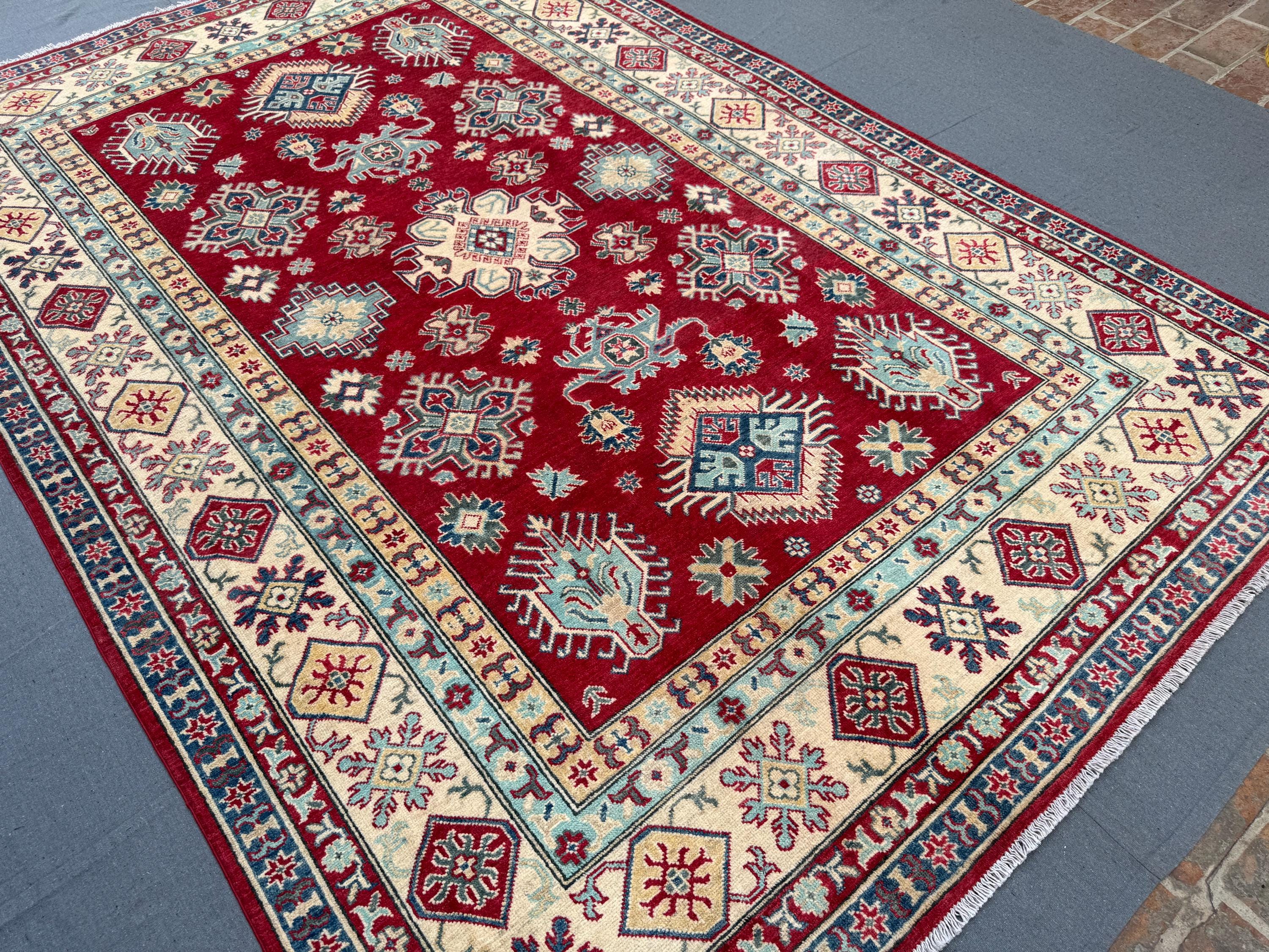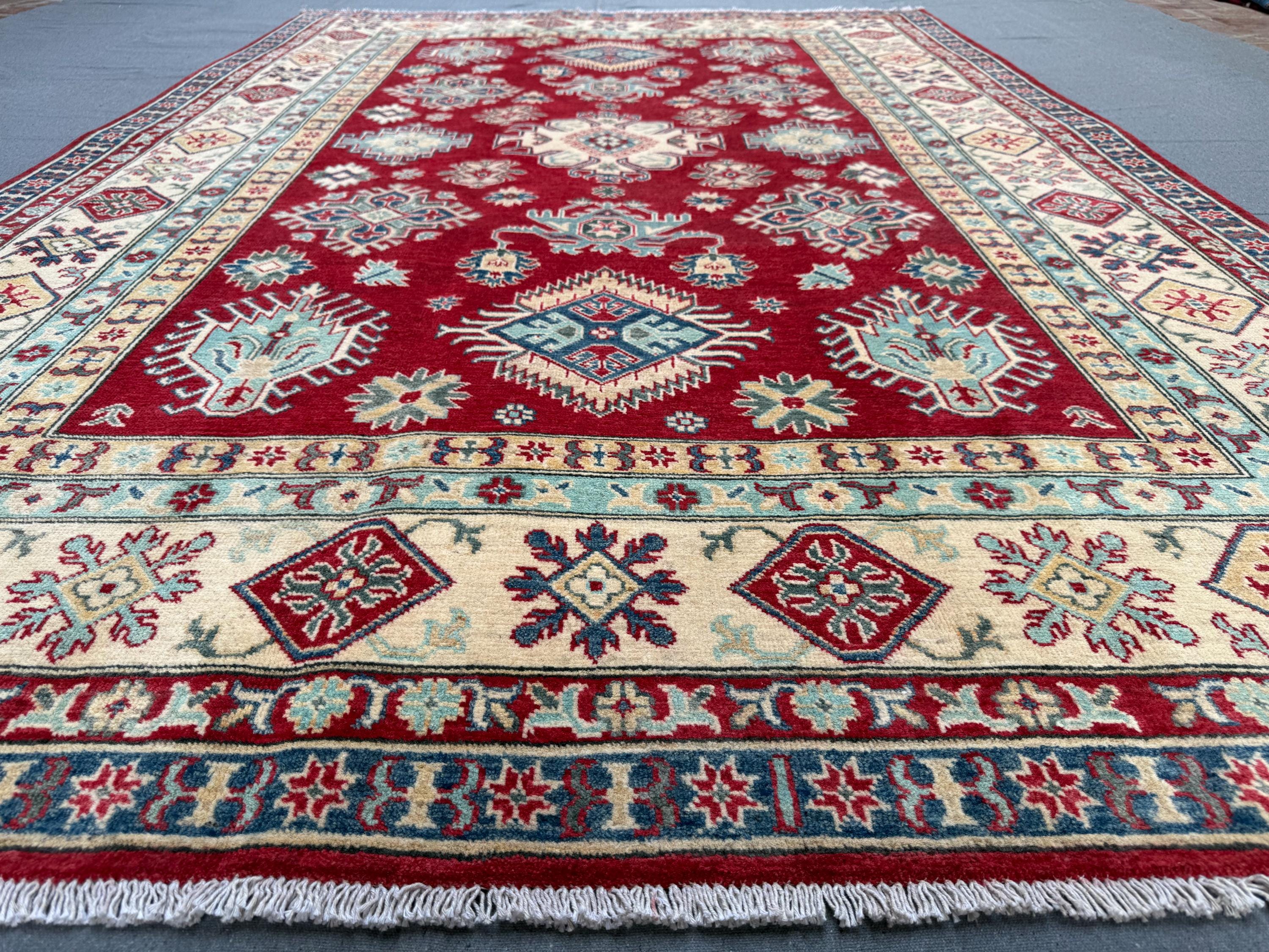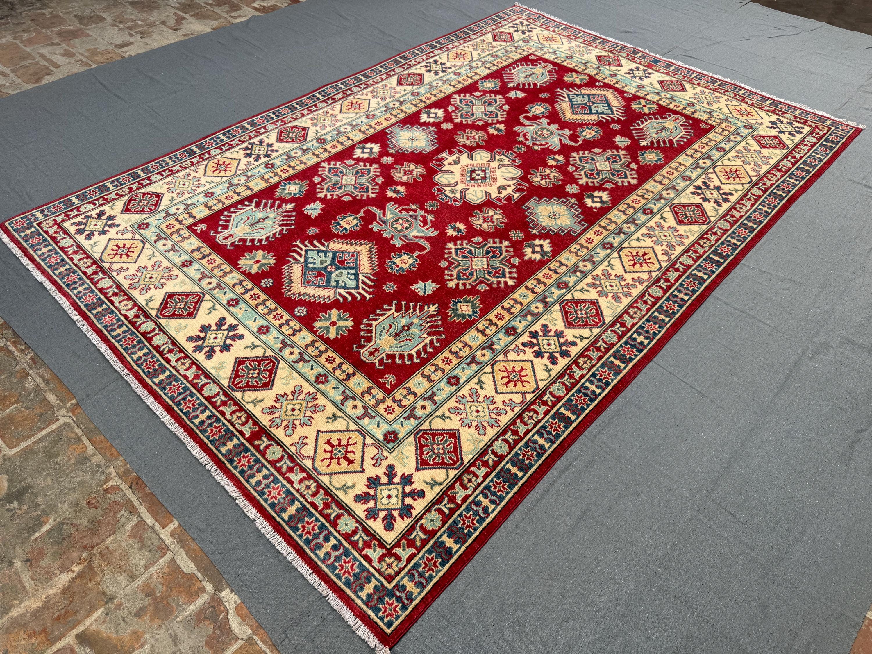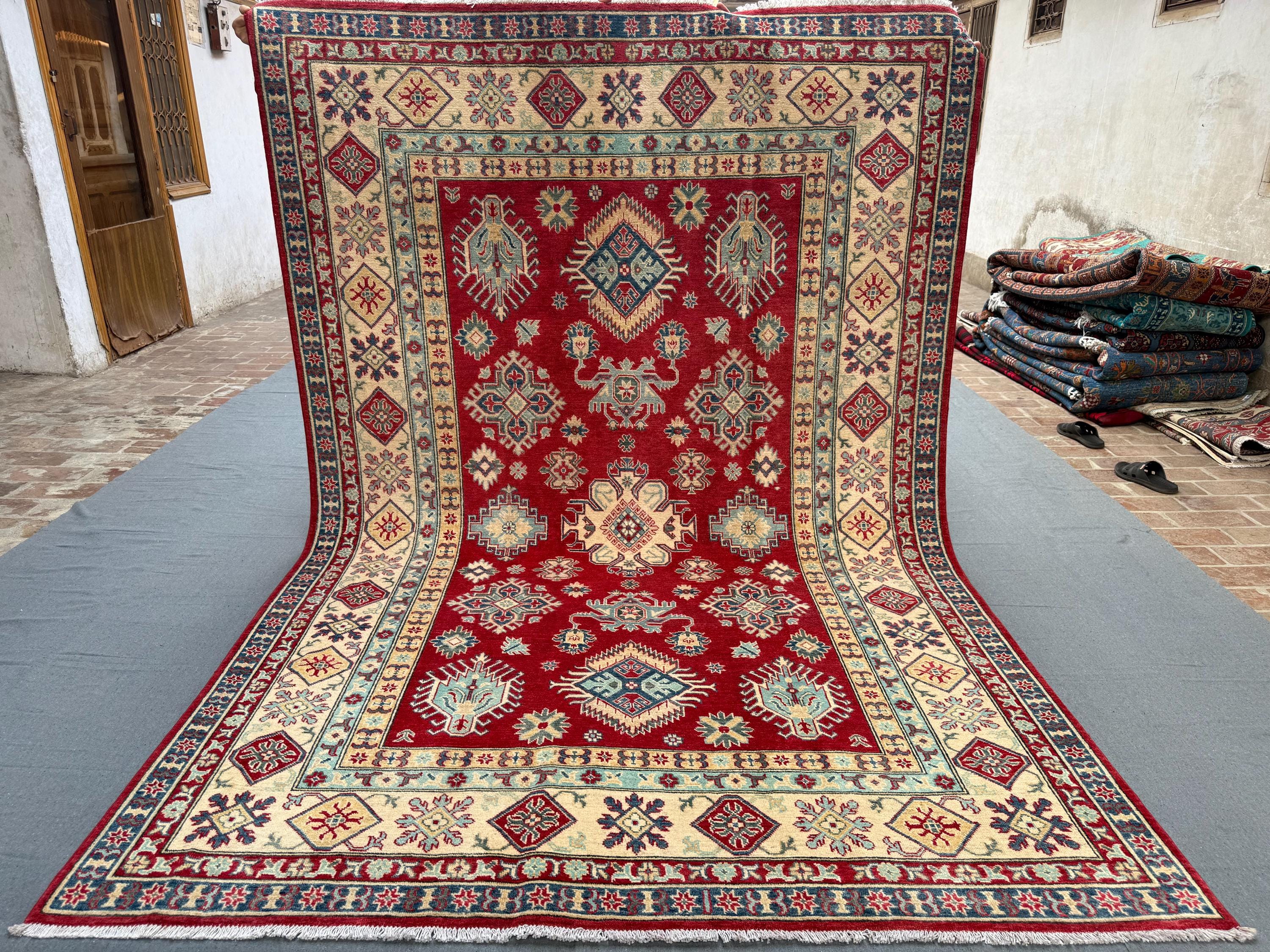 Kazak Rug 6.7x9.9 ft Hand-Knotted Wool Afghan Carpet, Red and Ivory Geometric Area Rug, Traditional Tribal Wool Floor Décor