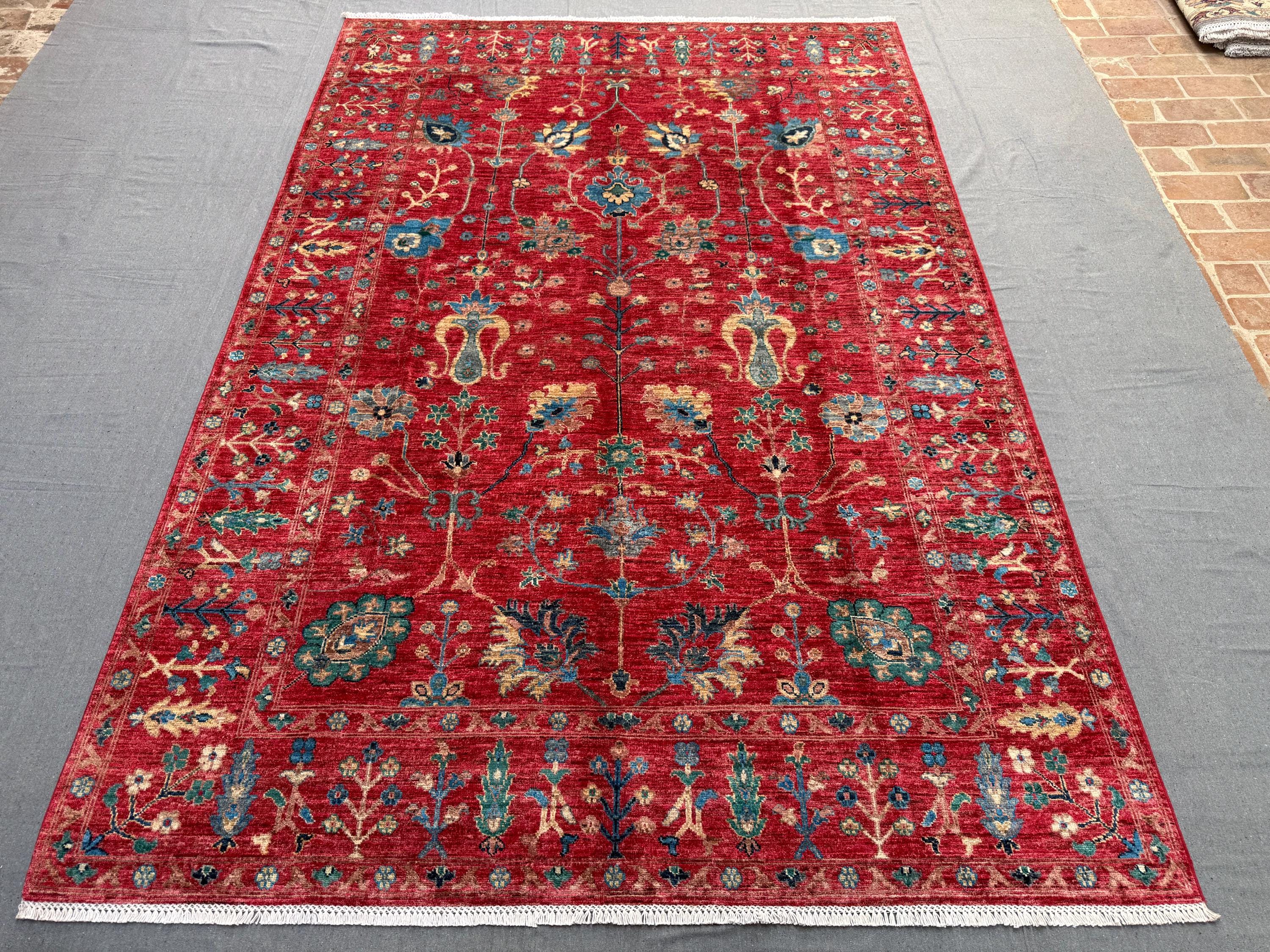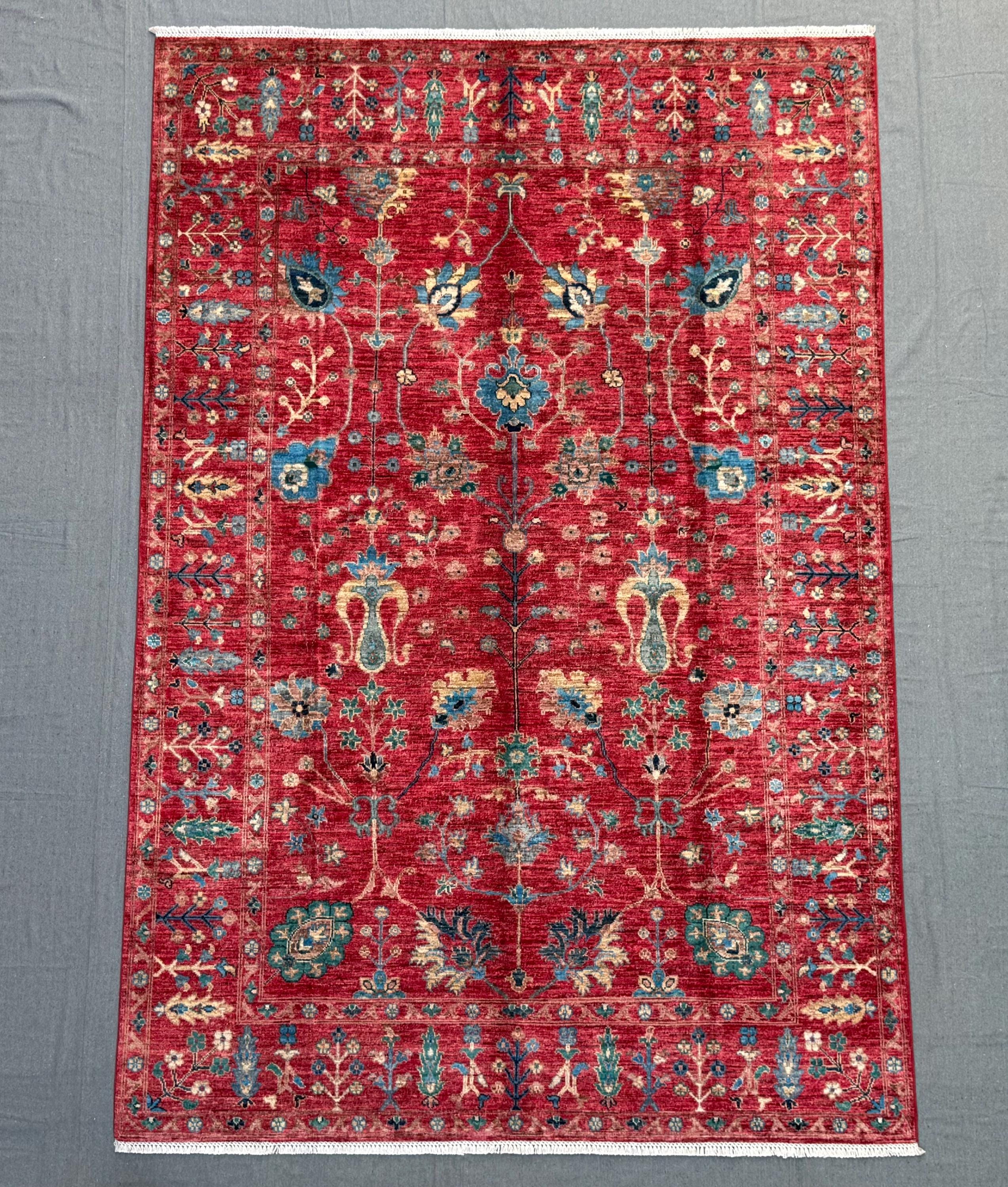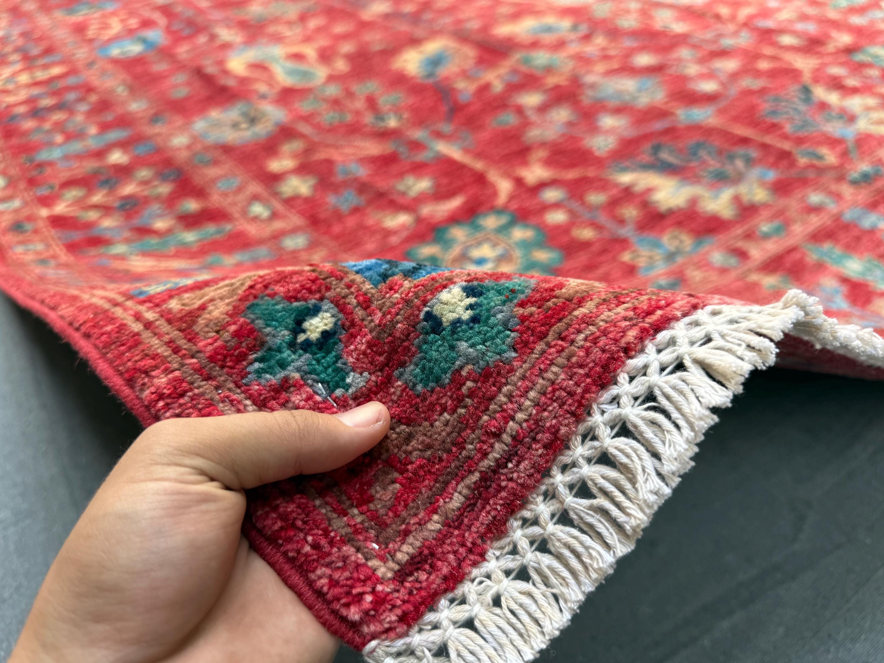 Ruby Red Sultani Rug 6x10 ft Handmade Wool Tribal Floral Carpet, Vibrant Red Blue Oriental Area Rug for Living Room Decor