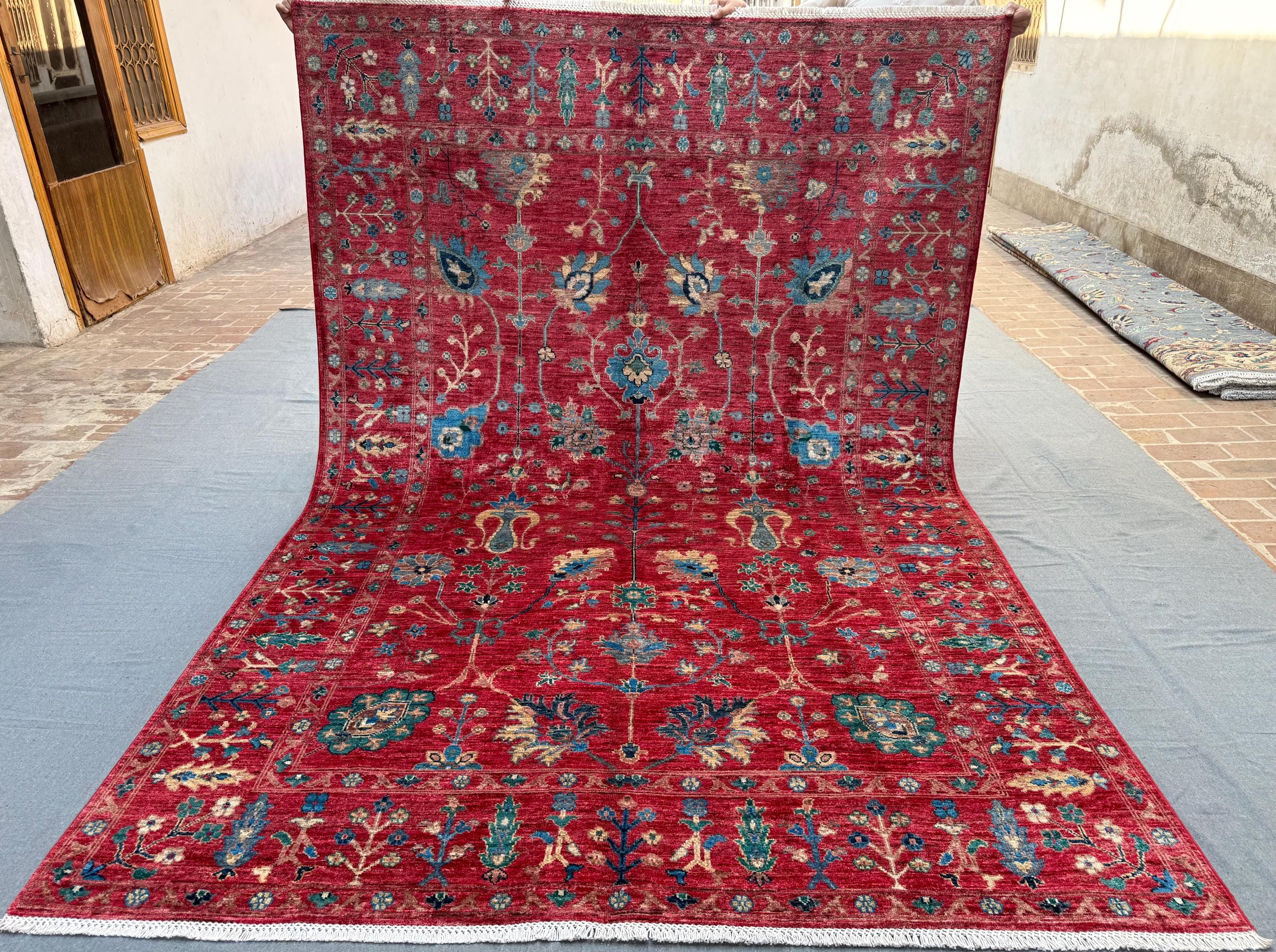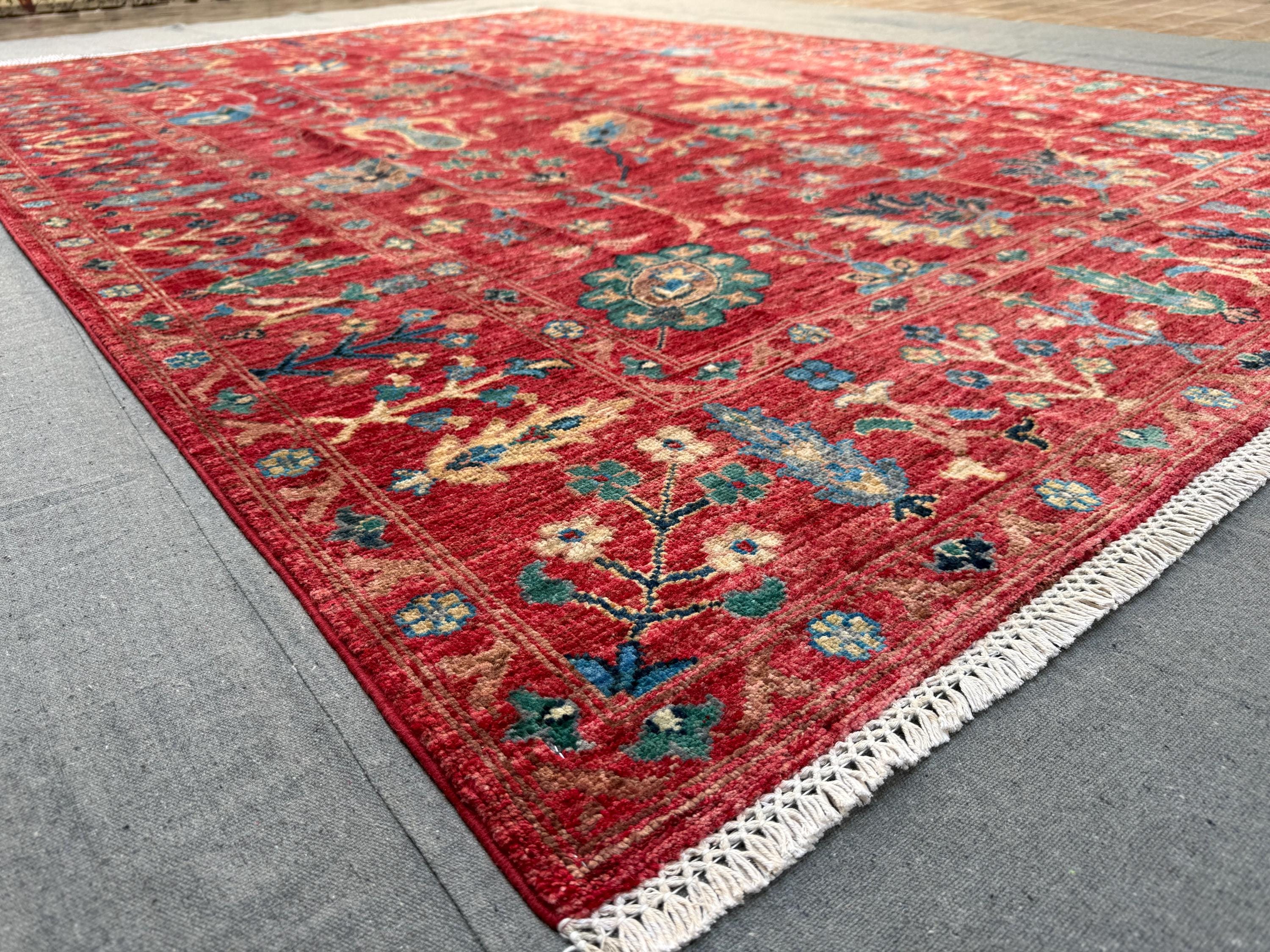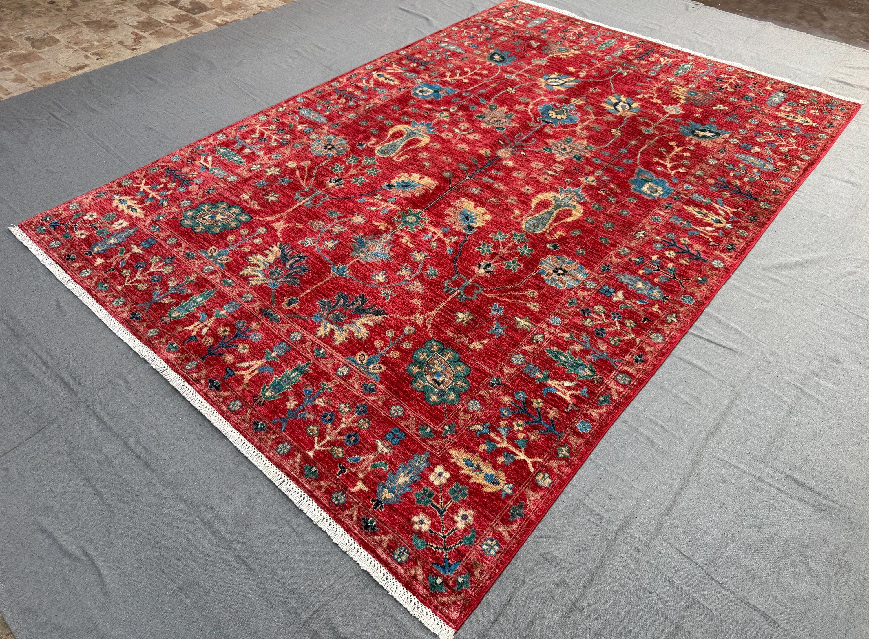 Ruby Red Sultani Rug 6x10 ft Handmade Wool Tribal Floral Carpet, Vibrant Red Blue Oriental Area Rug for Living Room Decor