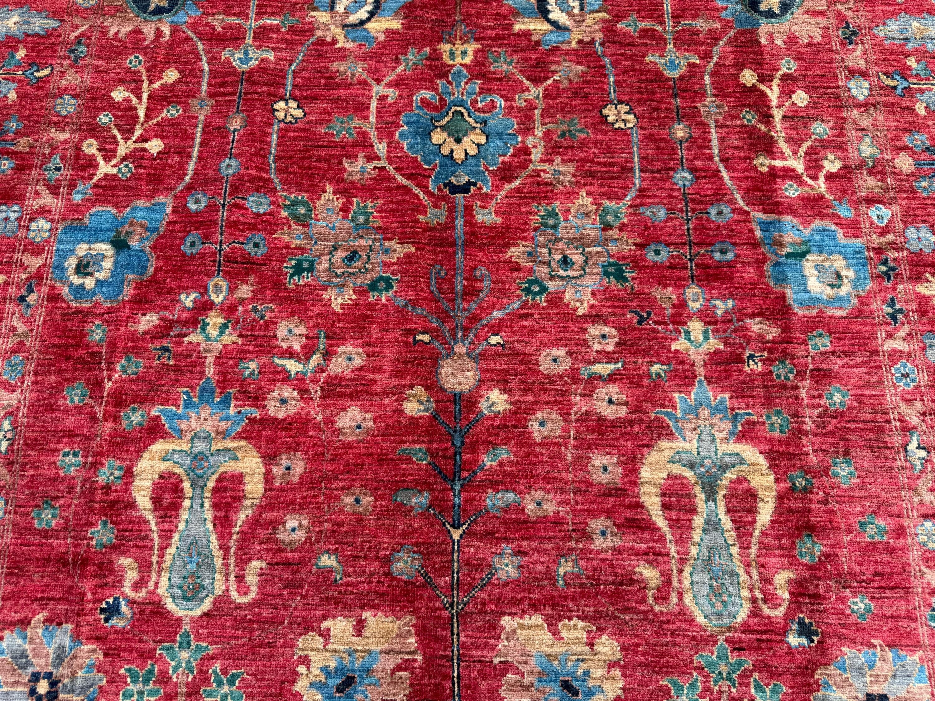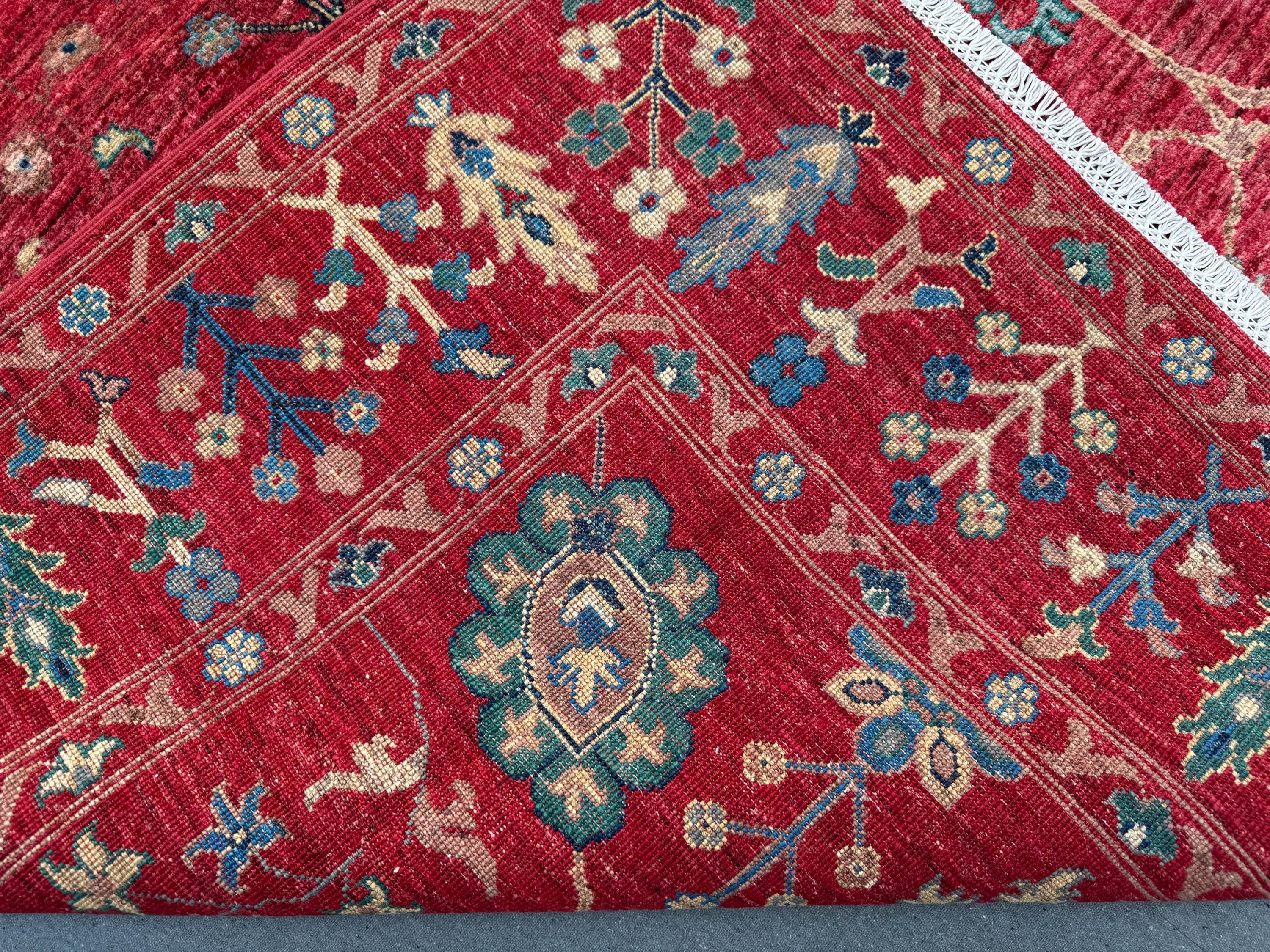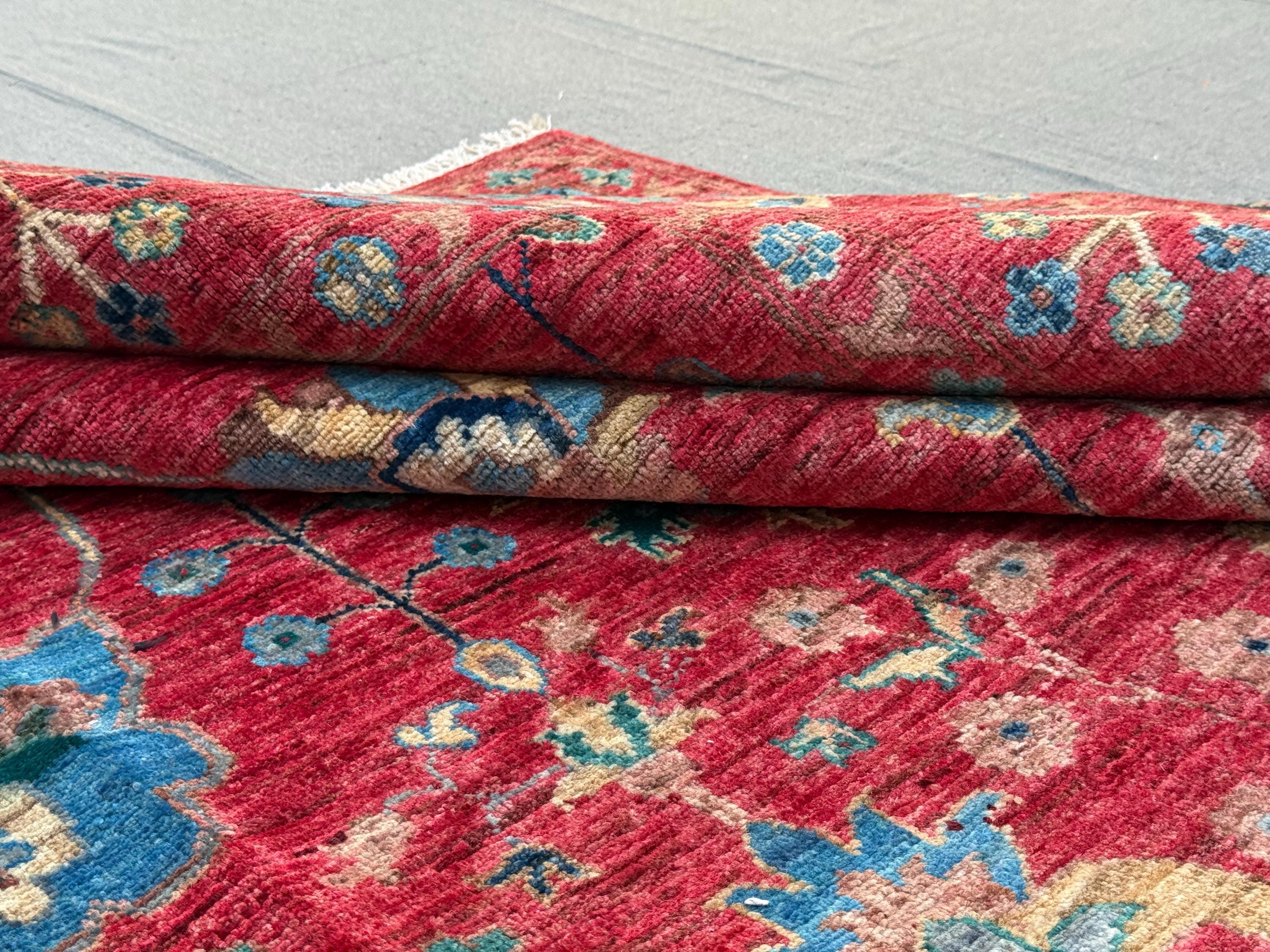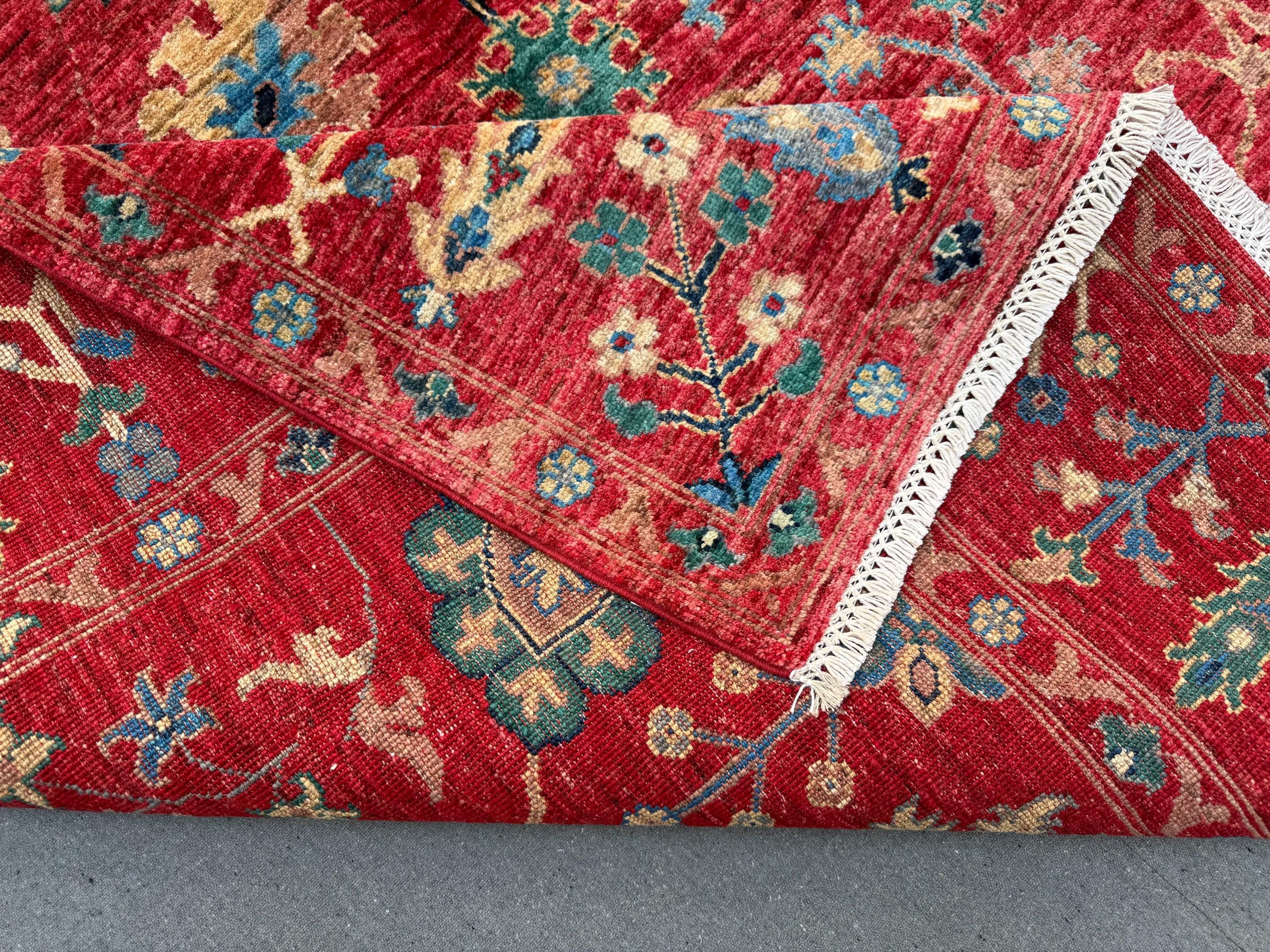 The intricate all-over pattern is hand-knotted by skilled artisans, creating texture, depth, and long-lasting durability. Its medium-low wool pile offers a soft feel underfoot while maintaining strength for high-traffic areas. The balance of red, teal, ivory, and earthy tones gives this Sultani rug a unique character loved by designers and collectors.