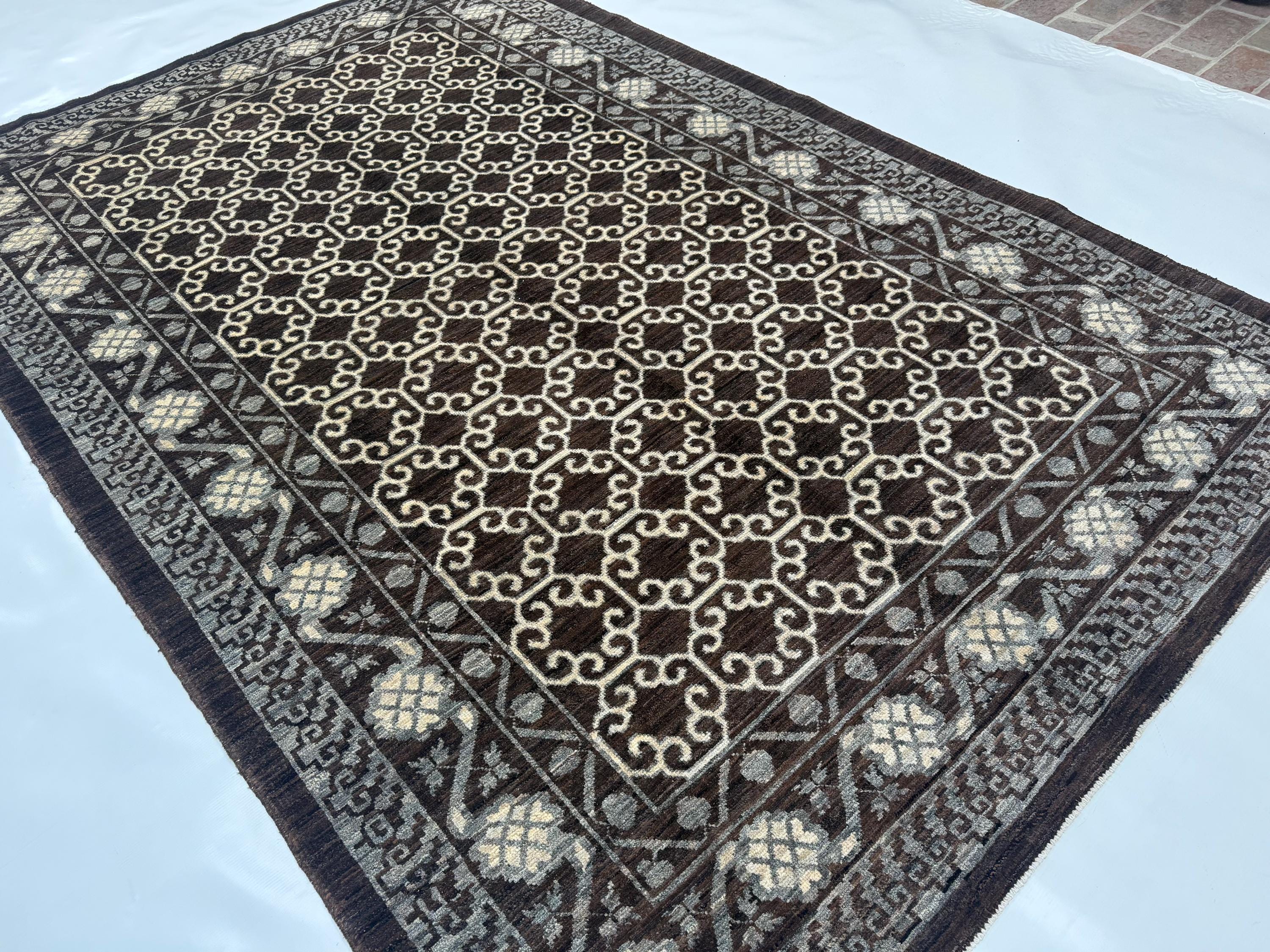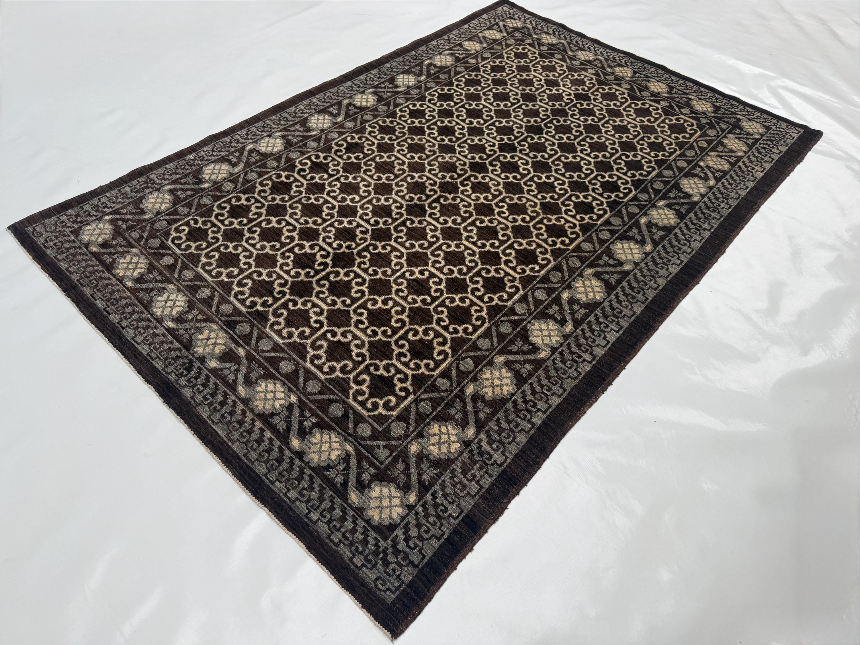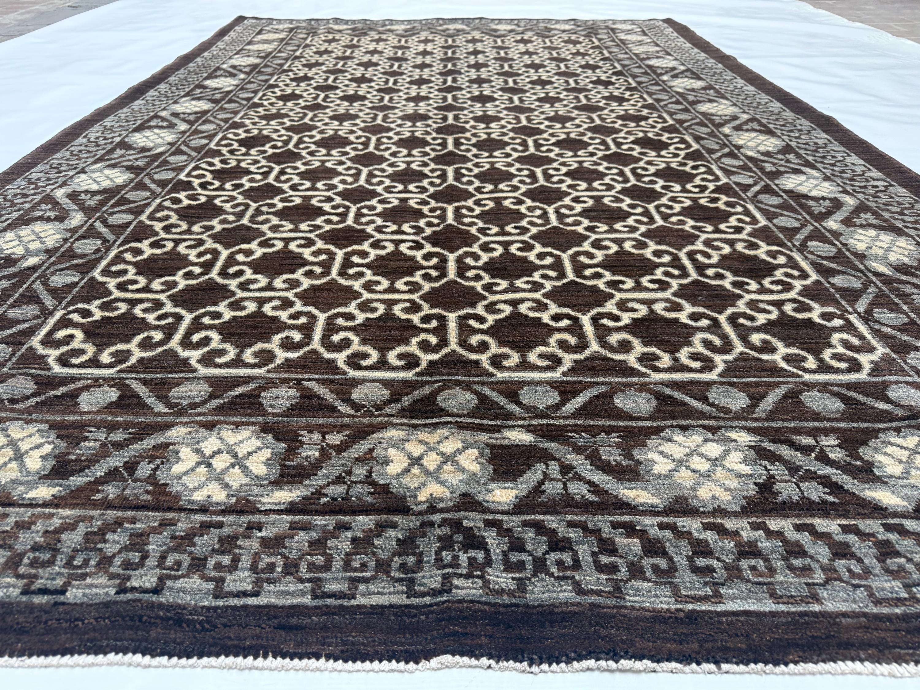 Elevate your space with this stunning Ziglair handmade wool rug, featuring a bold dark brown base and intricate ivory scrollwork in a repeating symmetrical layout. Crafted with precision by Afghan artisans, this 6x9 ft tribal-style carpet brings geometric harmony and rich earthy tones to any room—perfect for living areas, home offices, or dining spaces.