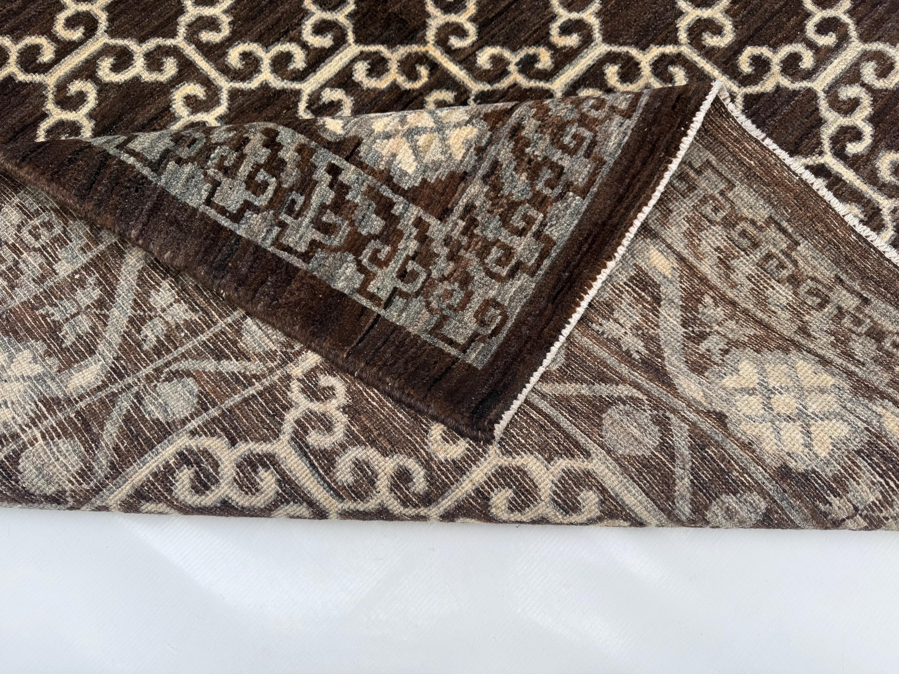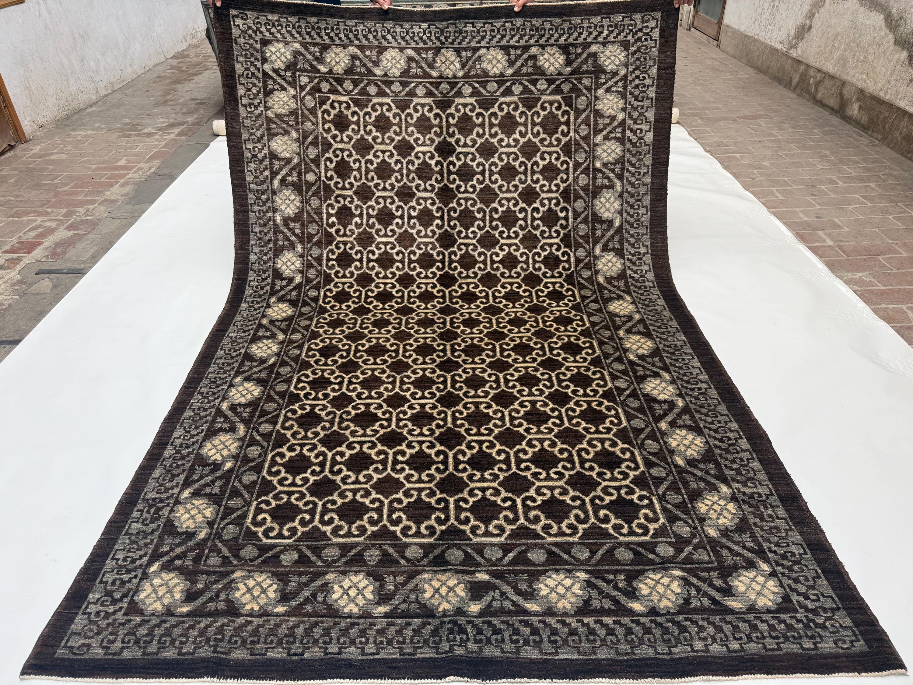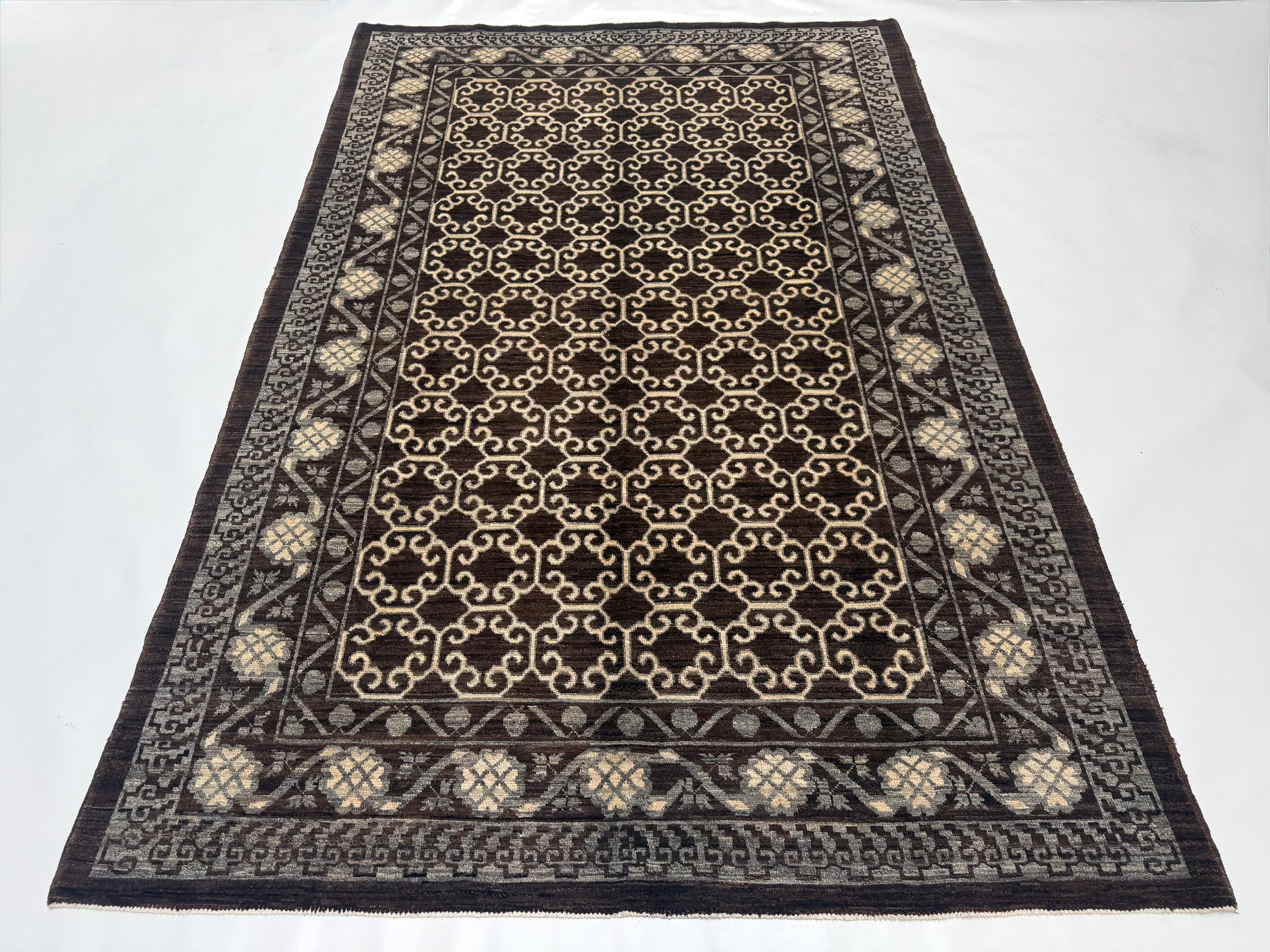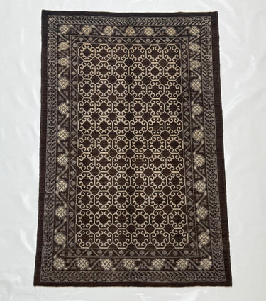 Elevate your space with this stunning Ziglair handmade wool rug, featuring a bold dark brown base and intricate ivory scrollwork in a repeating symmetrical layout. Crafted with precision by Afghan artisans, this 6x9 ft tribal-style carpet brings geometric harmony and rich earthy tones to any room—perfect for living areas, home offices, or dining spaces.
