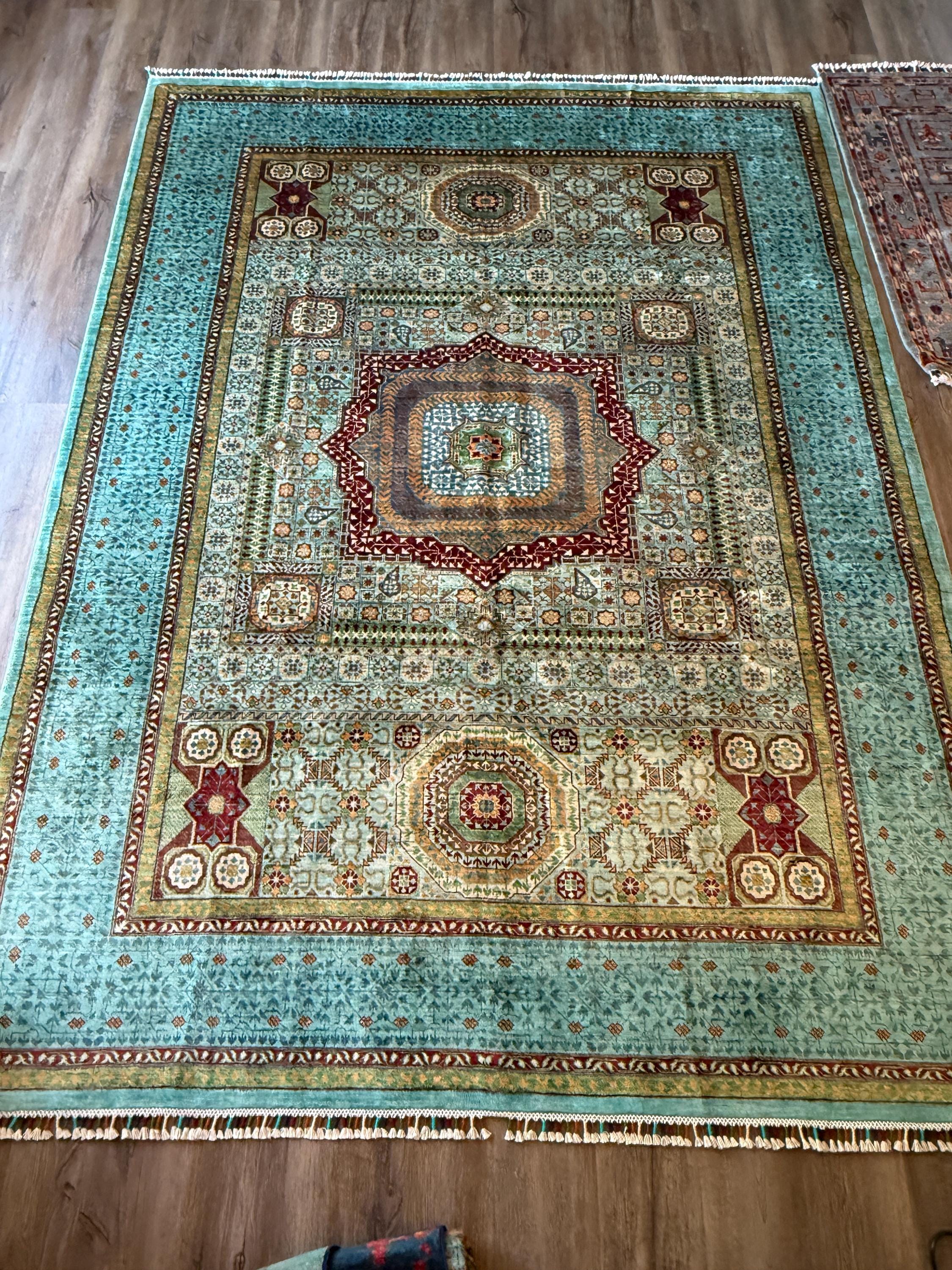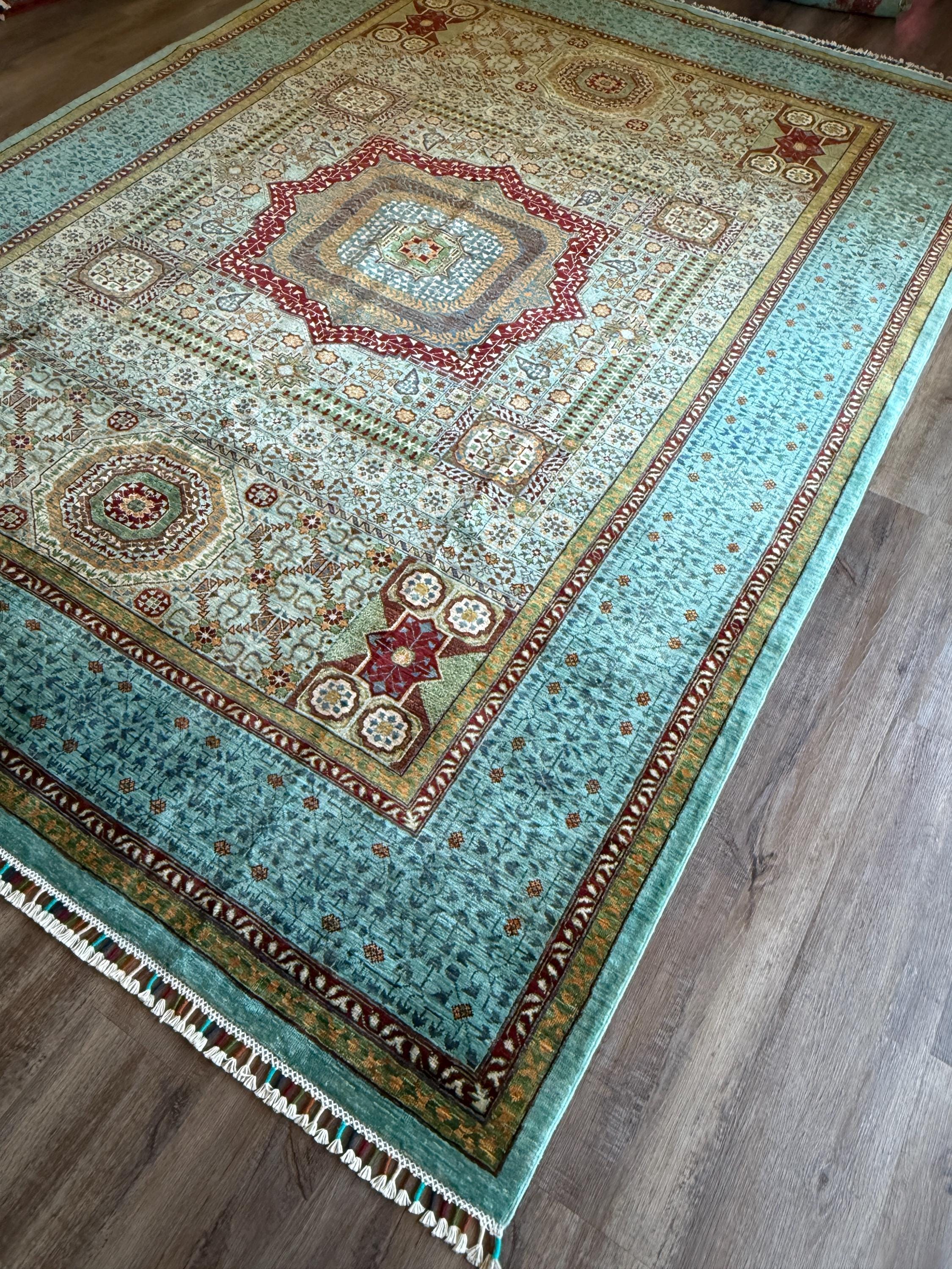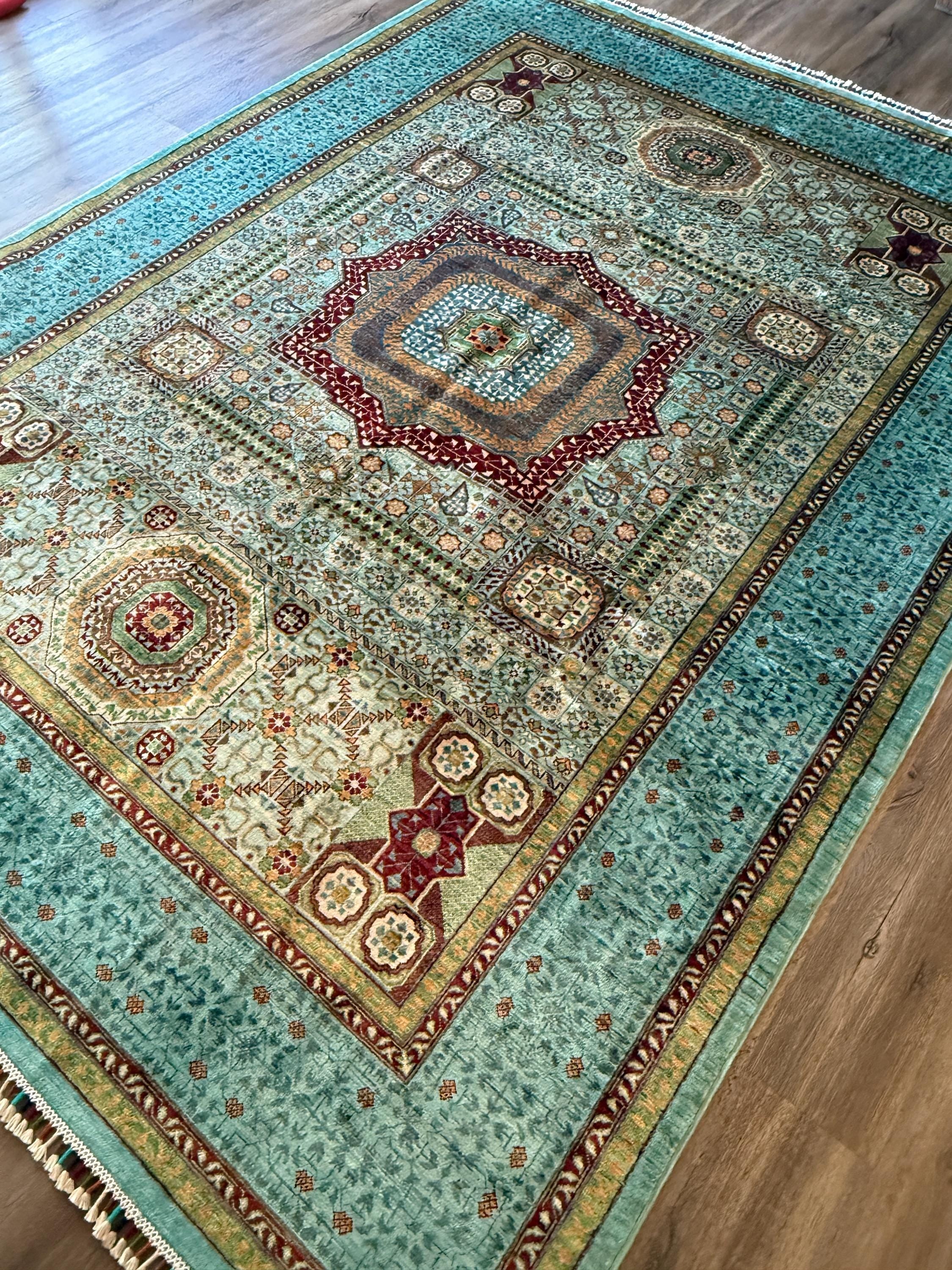 Handmade Mamluk Rug 6'11" × 9'6" | Afghan Wool Carpet | Large Oriental Geometric Area Rug with Medallion, Turquoise Red Design