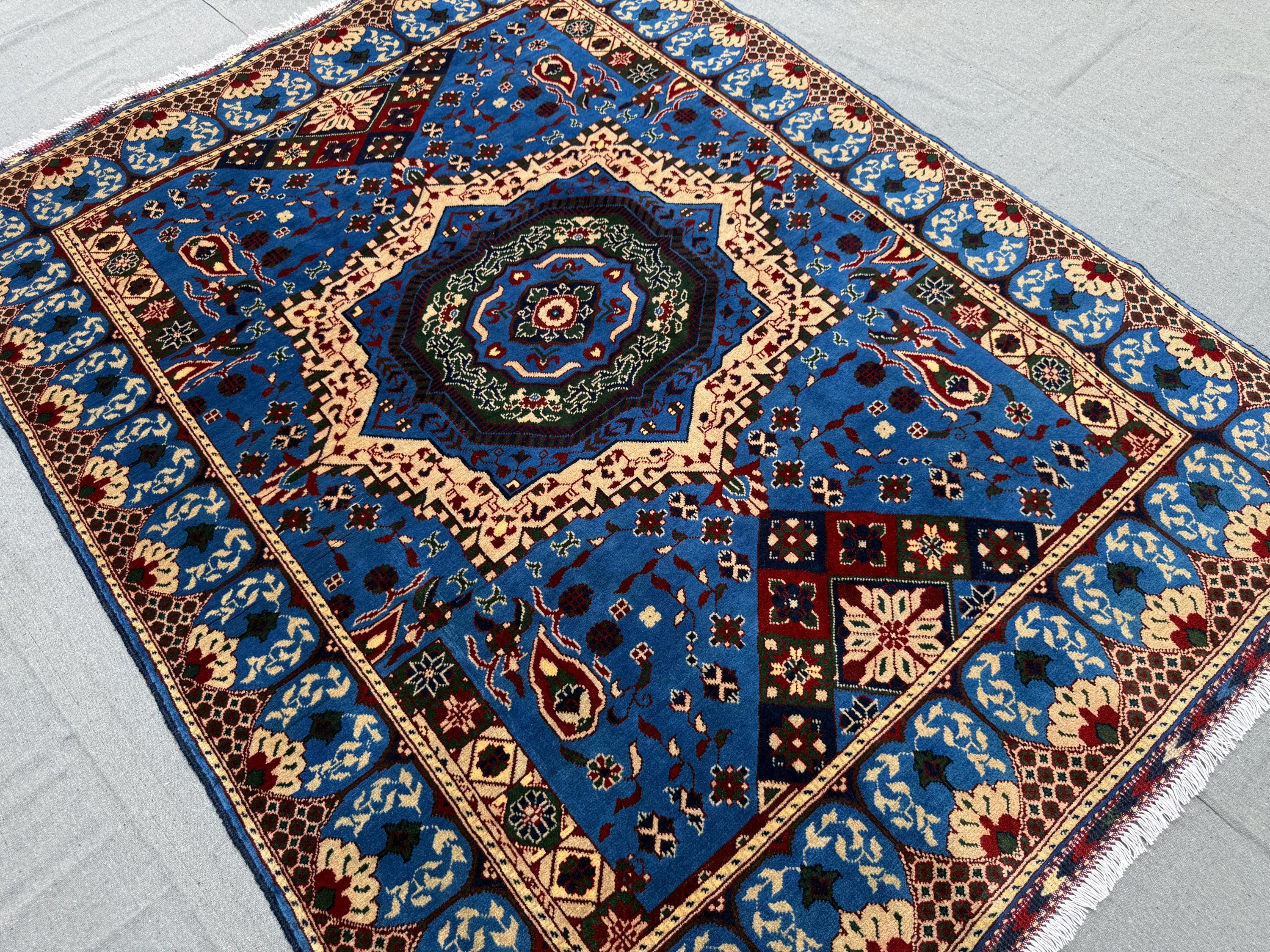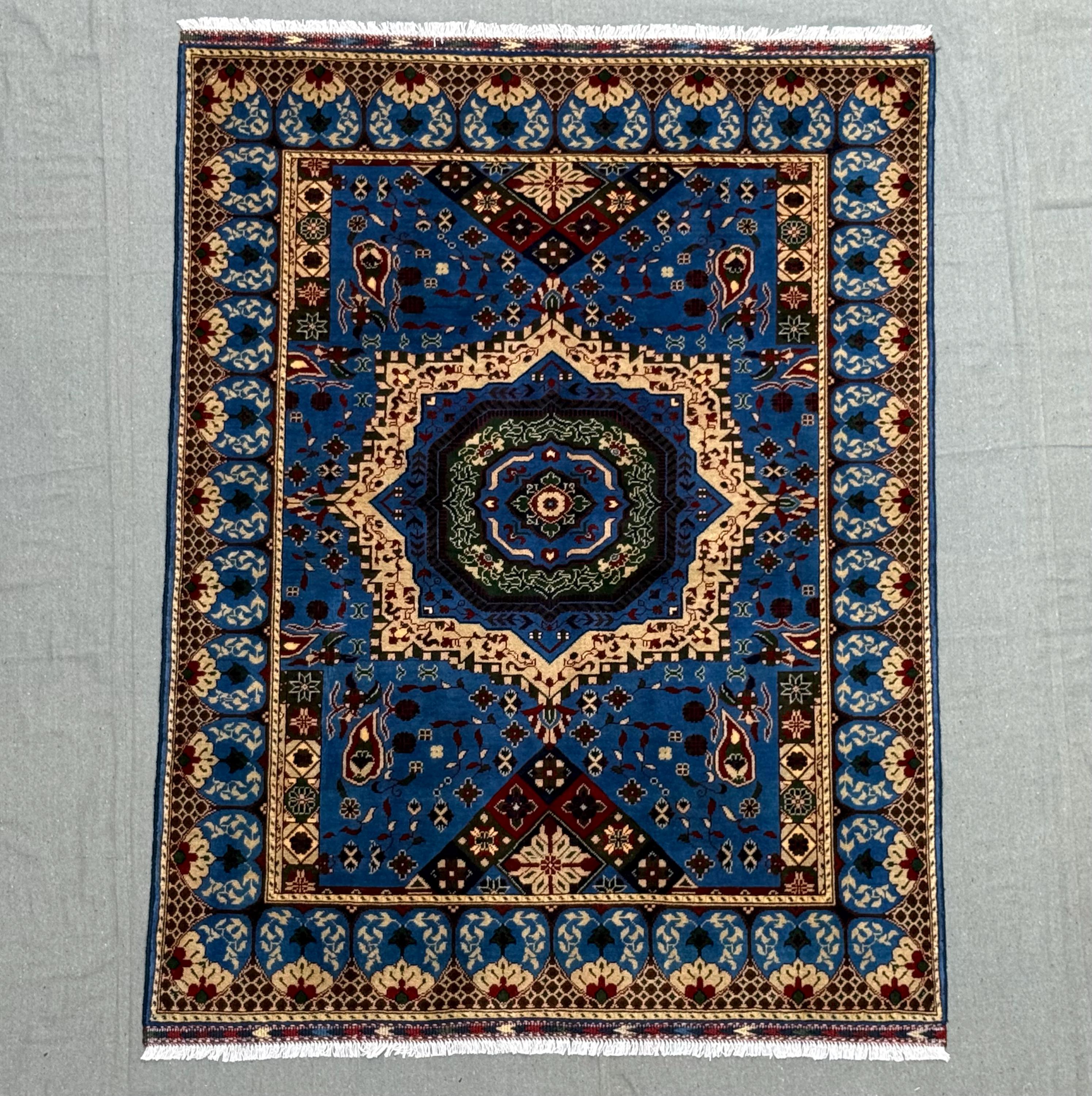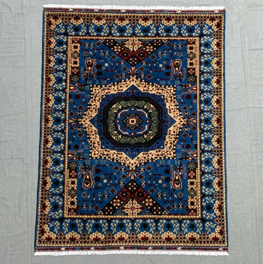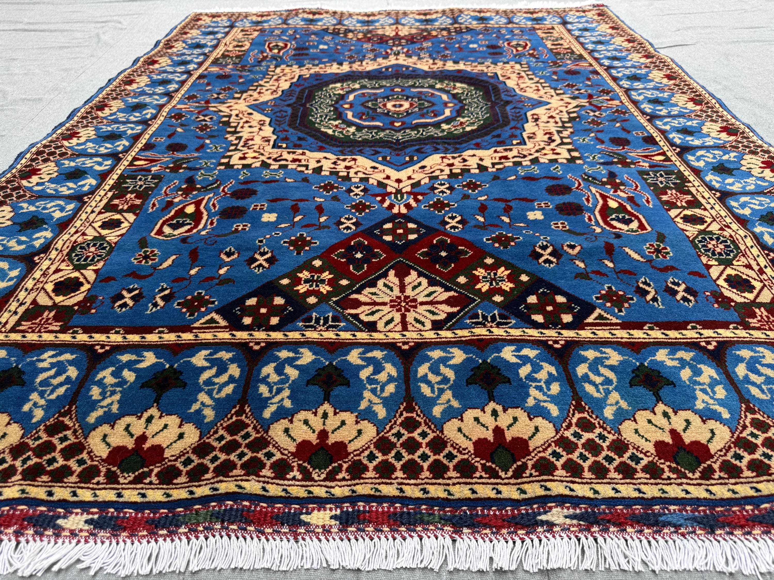 Mamluk Handmade Wool Rug 5x7 ft, Blue & Ivory Medallion Carpet, Luxury Hand-Knotted Oriental Wool Area Rug, Traditional Living Room Décor