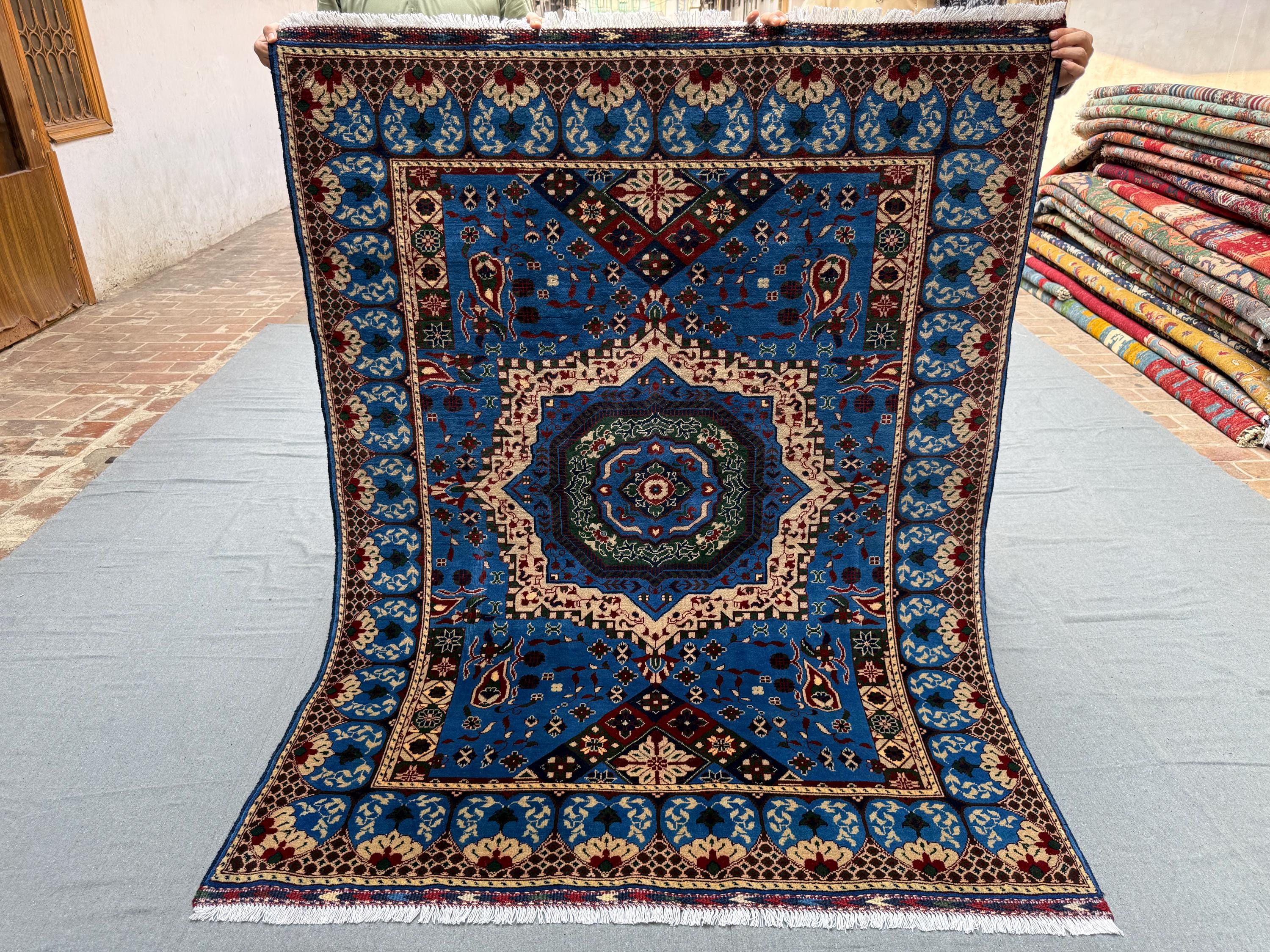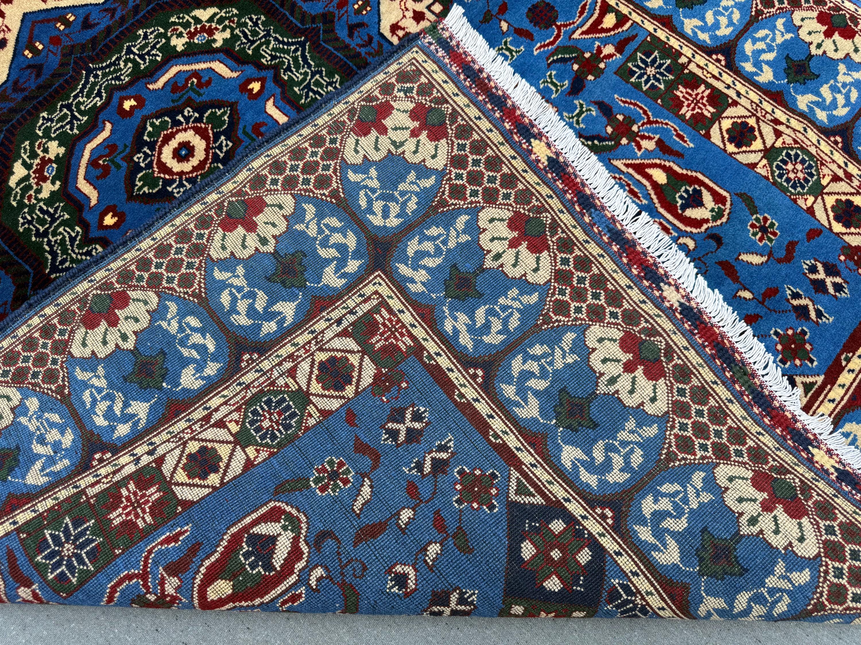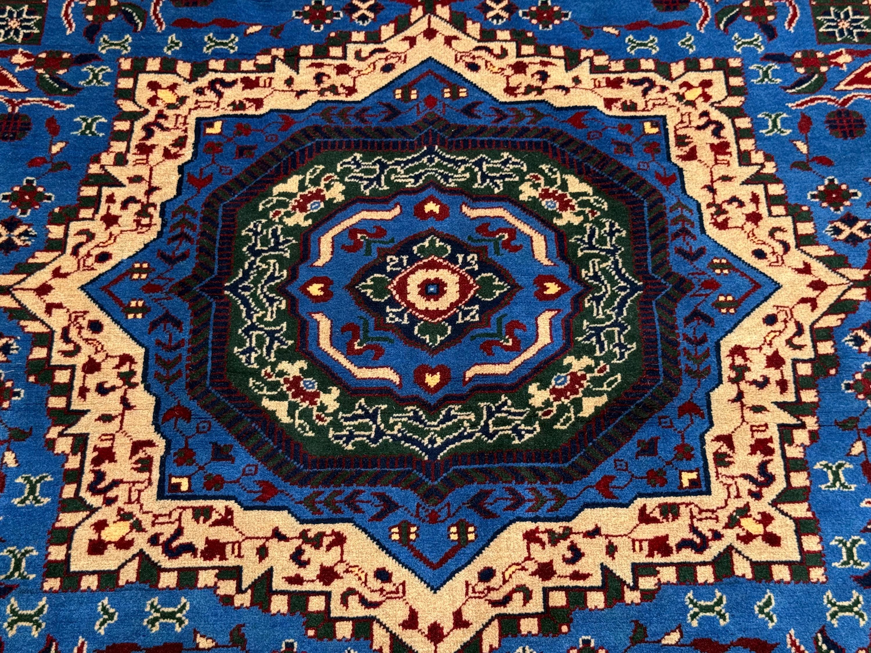 The Mumlook handmade wool rug is a striking centerpiece featuring a vivid blue field with a large central medallion framed by intricate floral and geometric motifs. Surrounded by elegant ivory and patterned borders, this rug exudes timeless charm and cultural artistry.