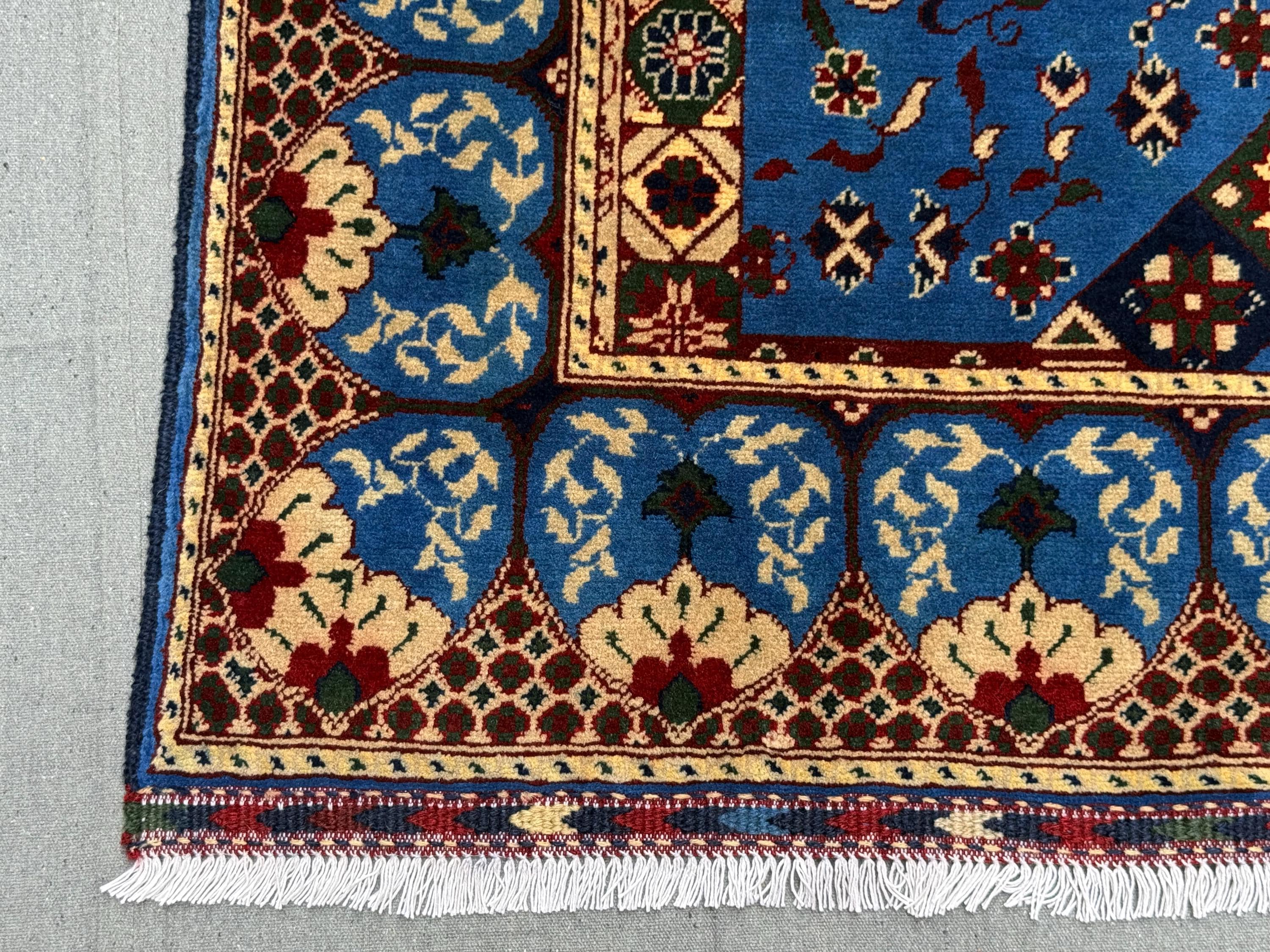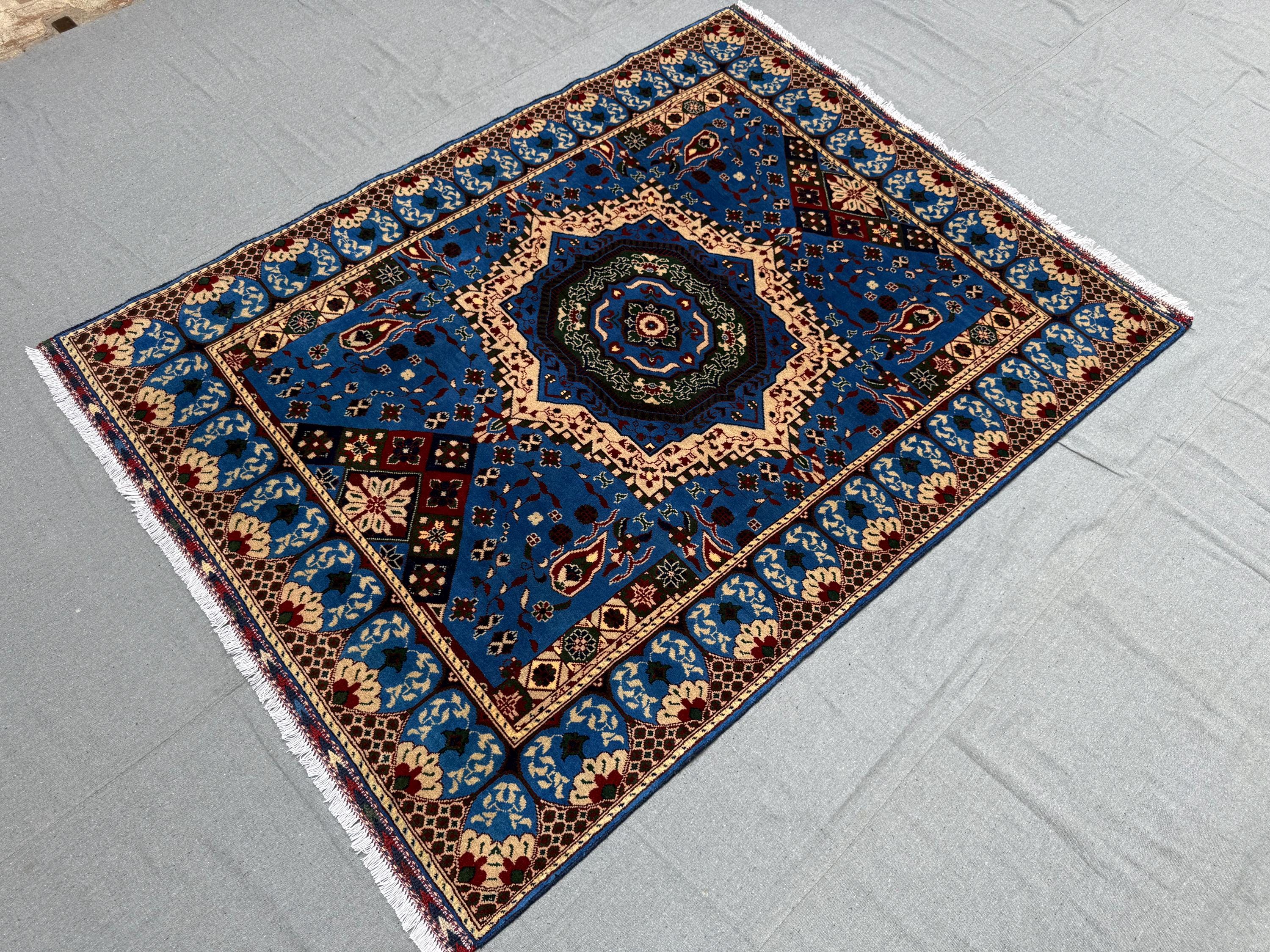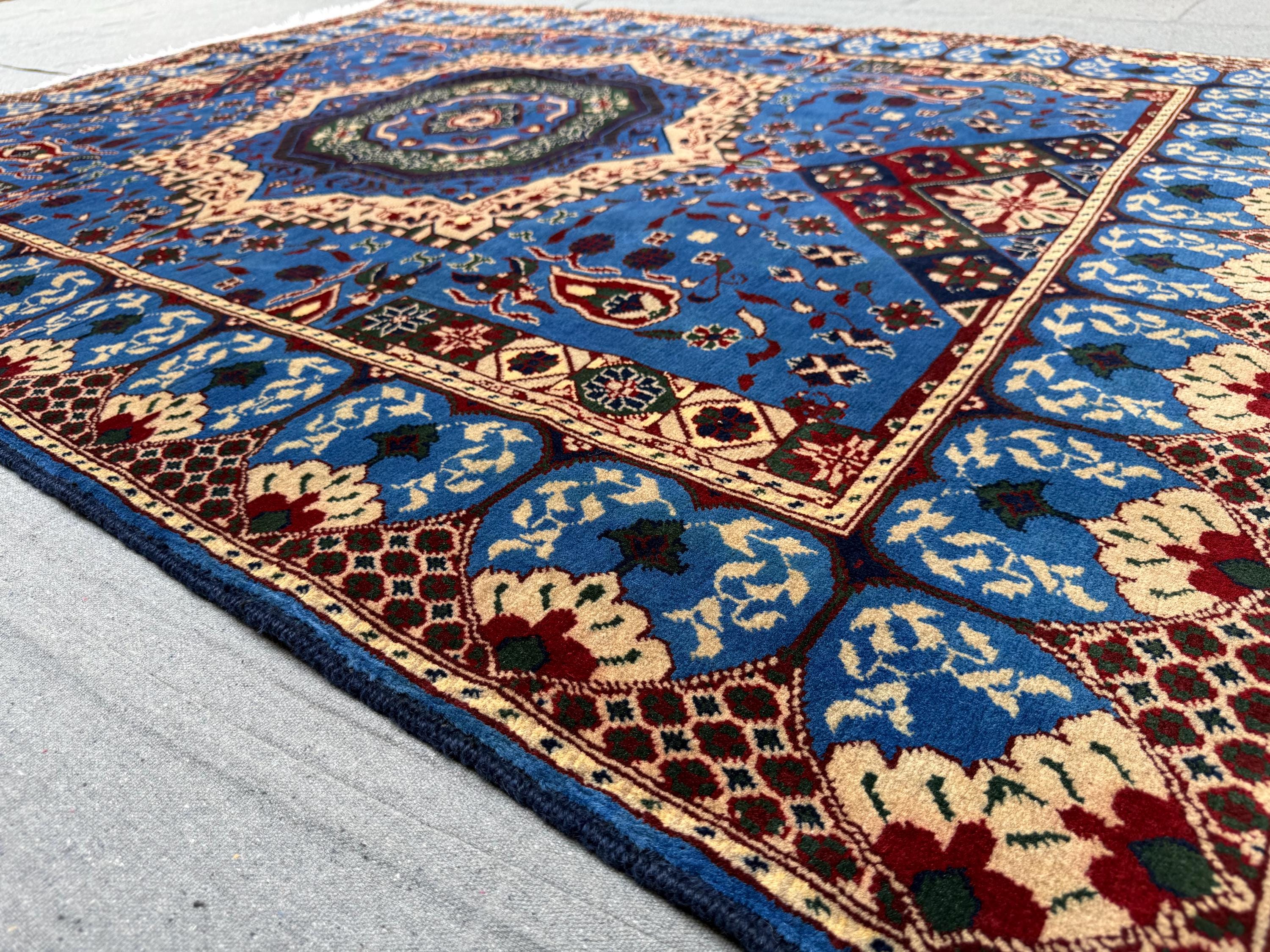 The Mumlook handmade wool rug is a striking centerpiece featuring a vivid blue field with a large central medallion framed by intricate floral and geometric motifs. Surrounded by elegant ivory and patterned borders, this rug exudes timeless charm and cultural artistry.