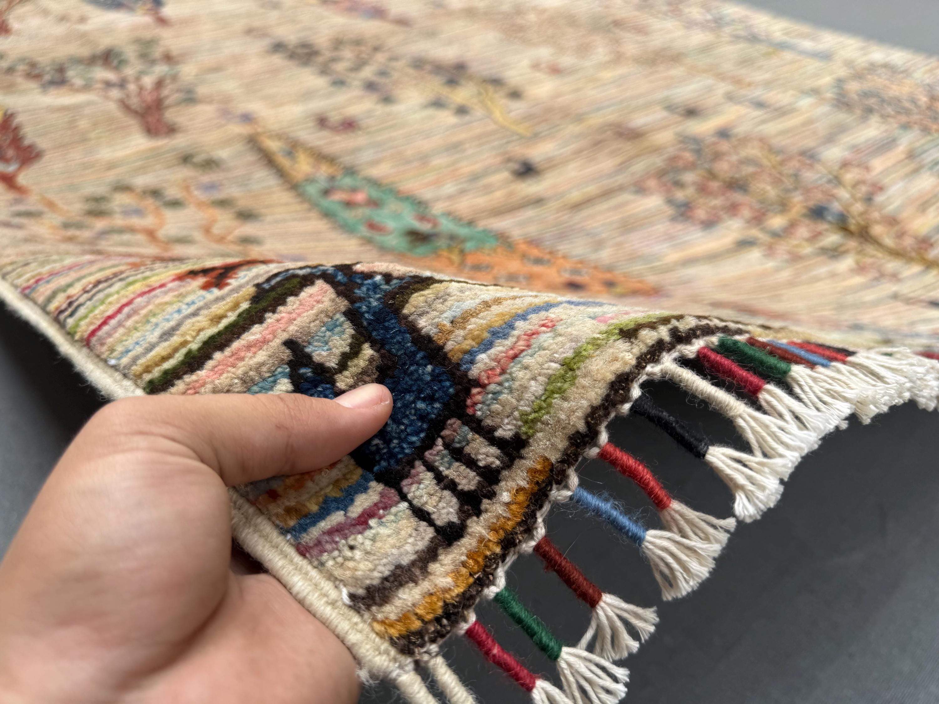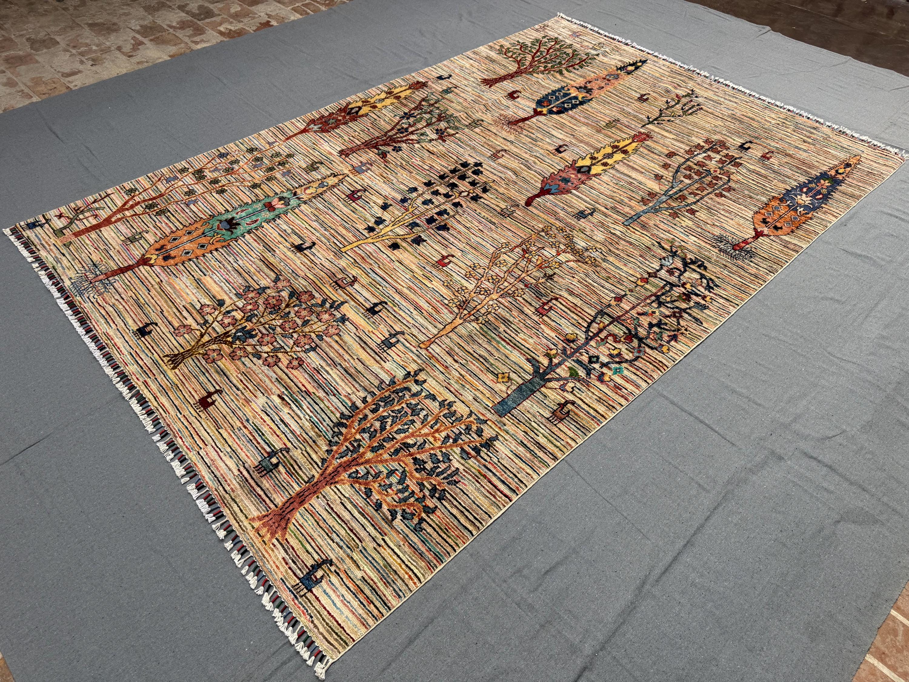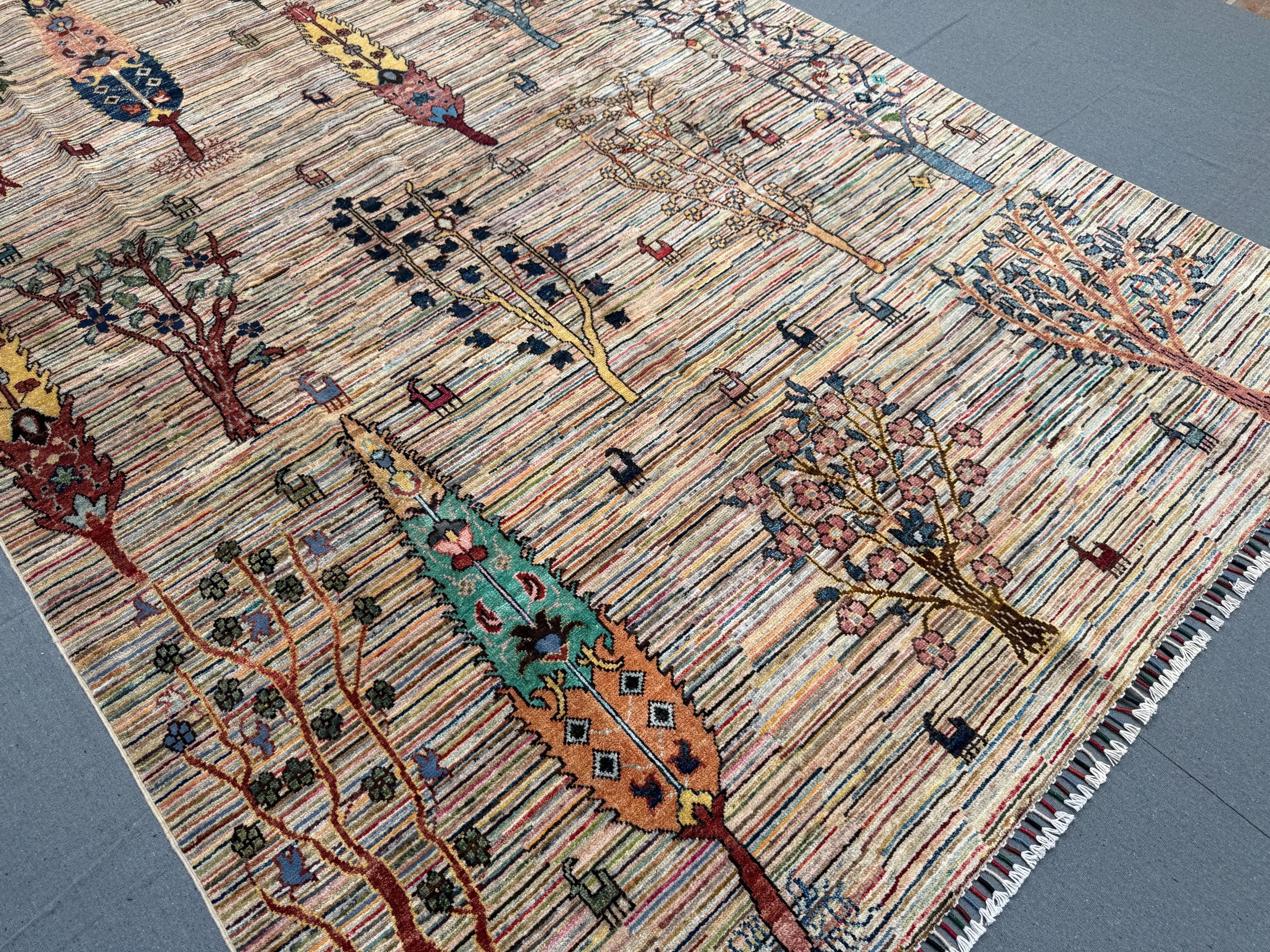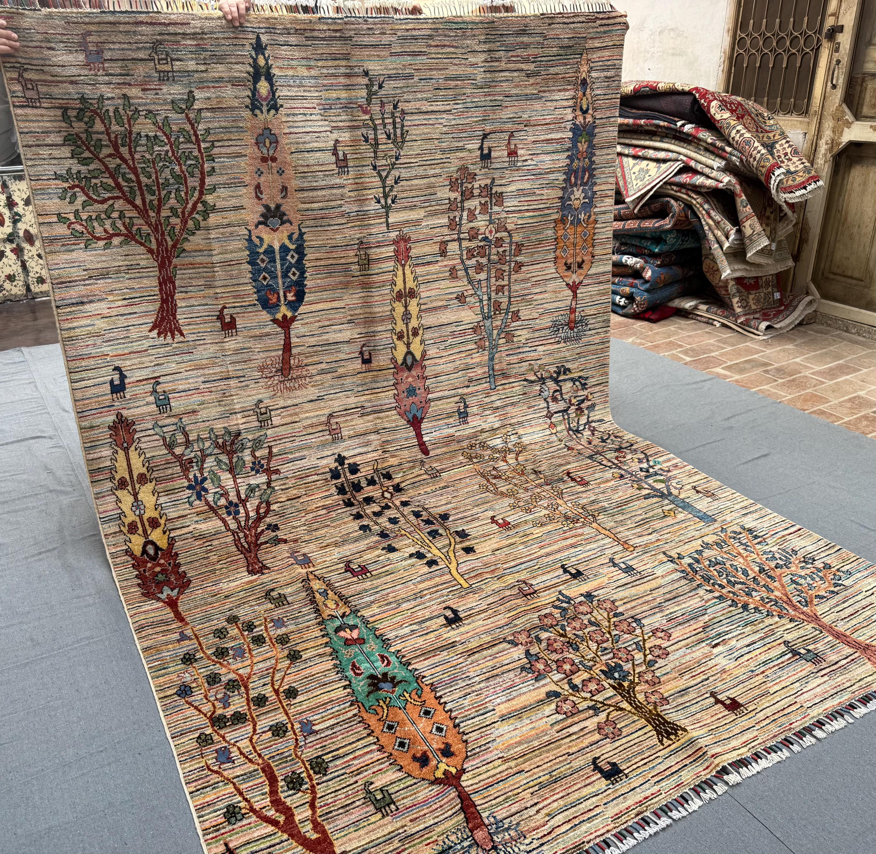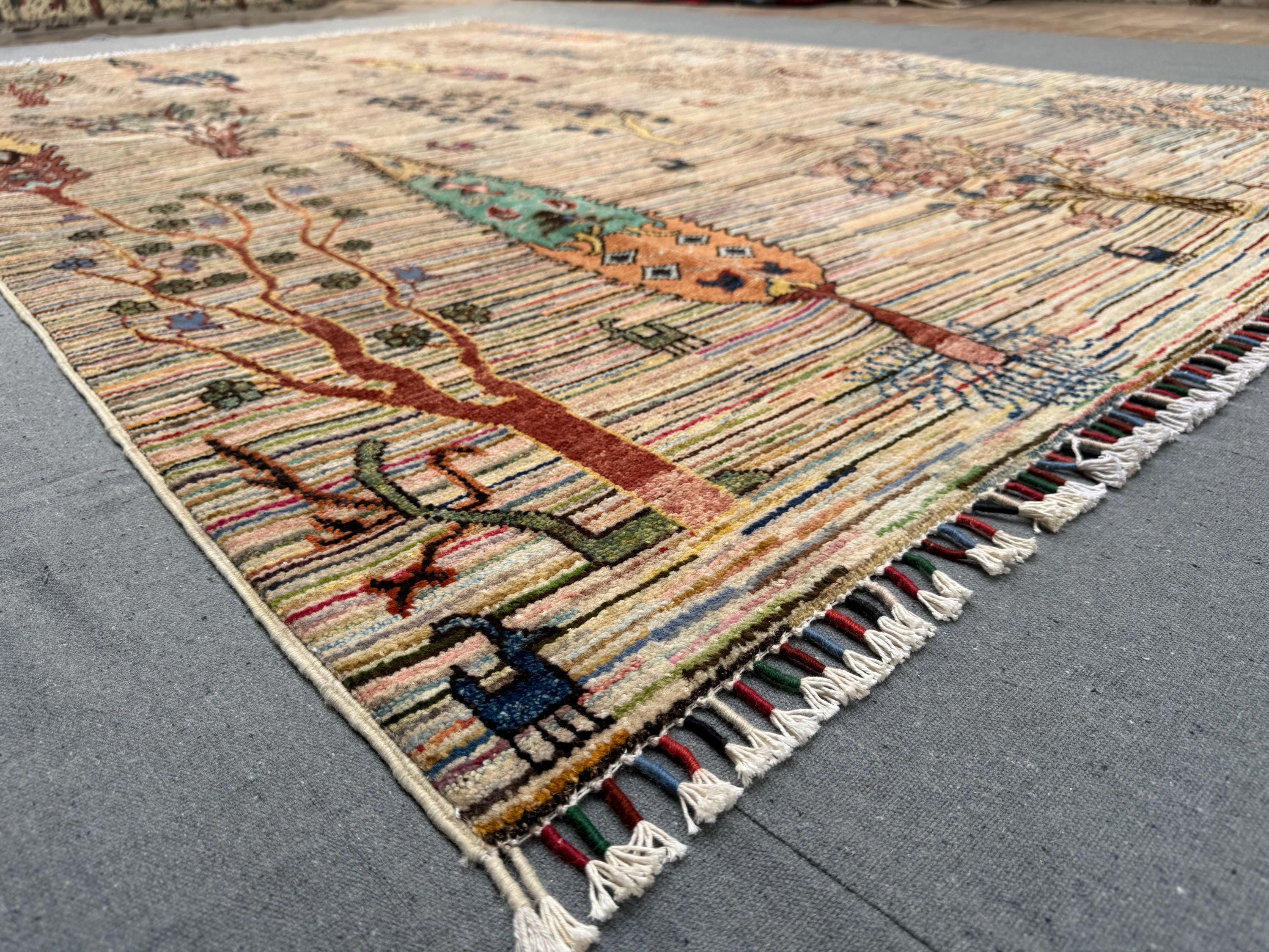 Bring warmth and artistry to your home with this 6.6x9.8 Tree of Life floral rug, beautifully decorated with nature-inspired motifs. The soft beige background is adorned with colorful trees, birds, and animals, symbolizing harmony, growth, and life — a timeless design that blends traditional craftsmanship with modern aesthetics.