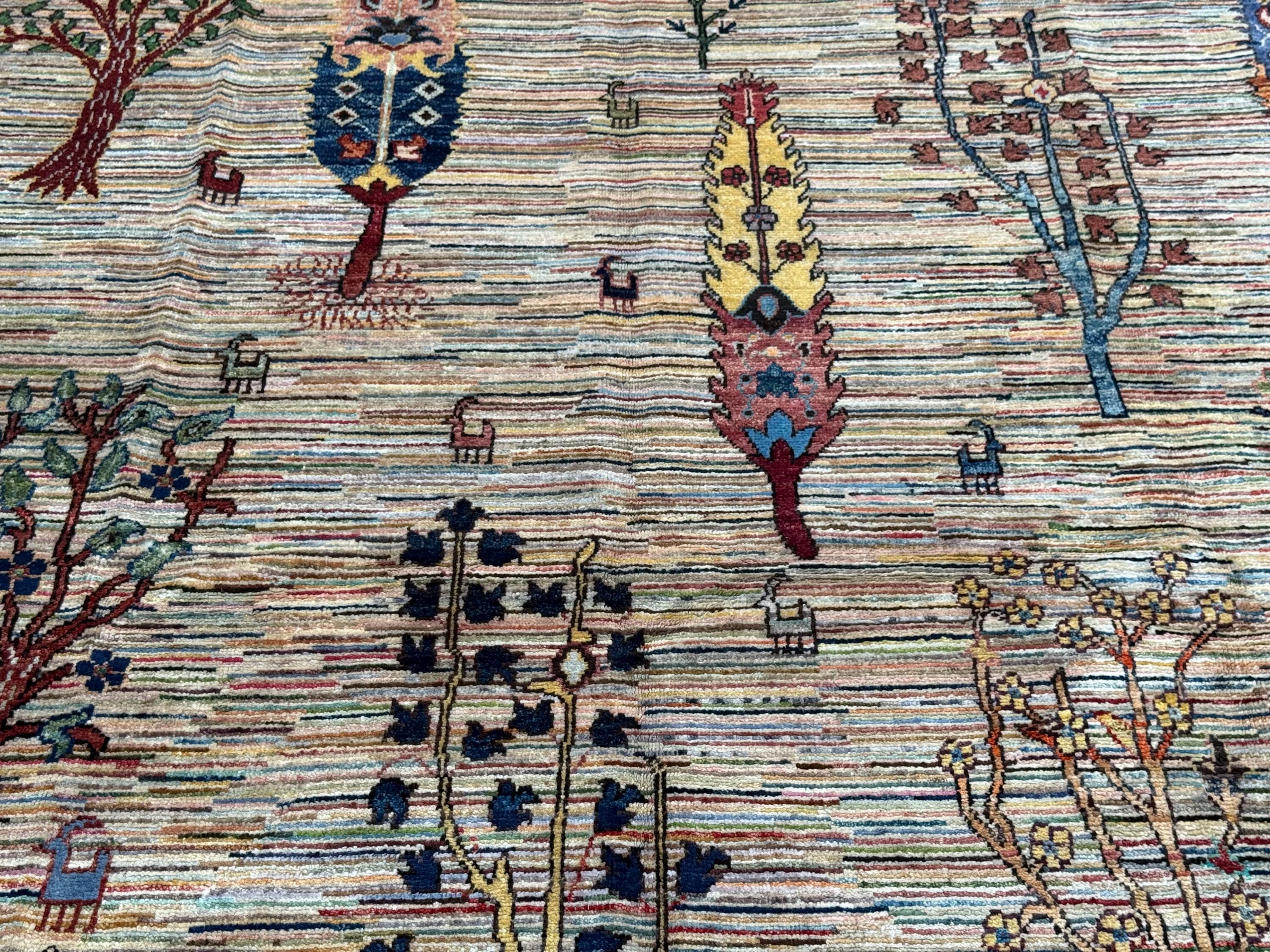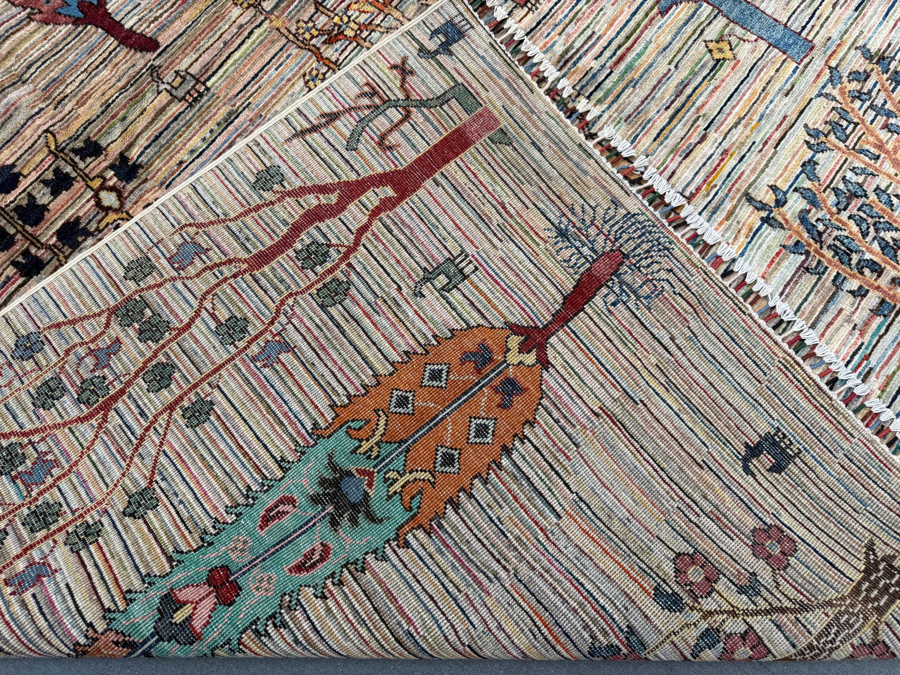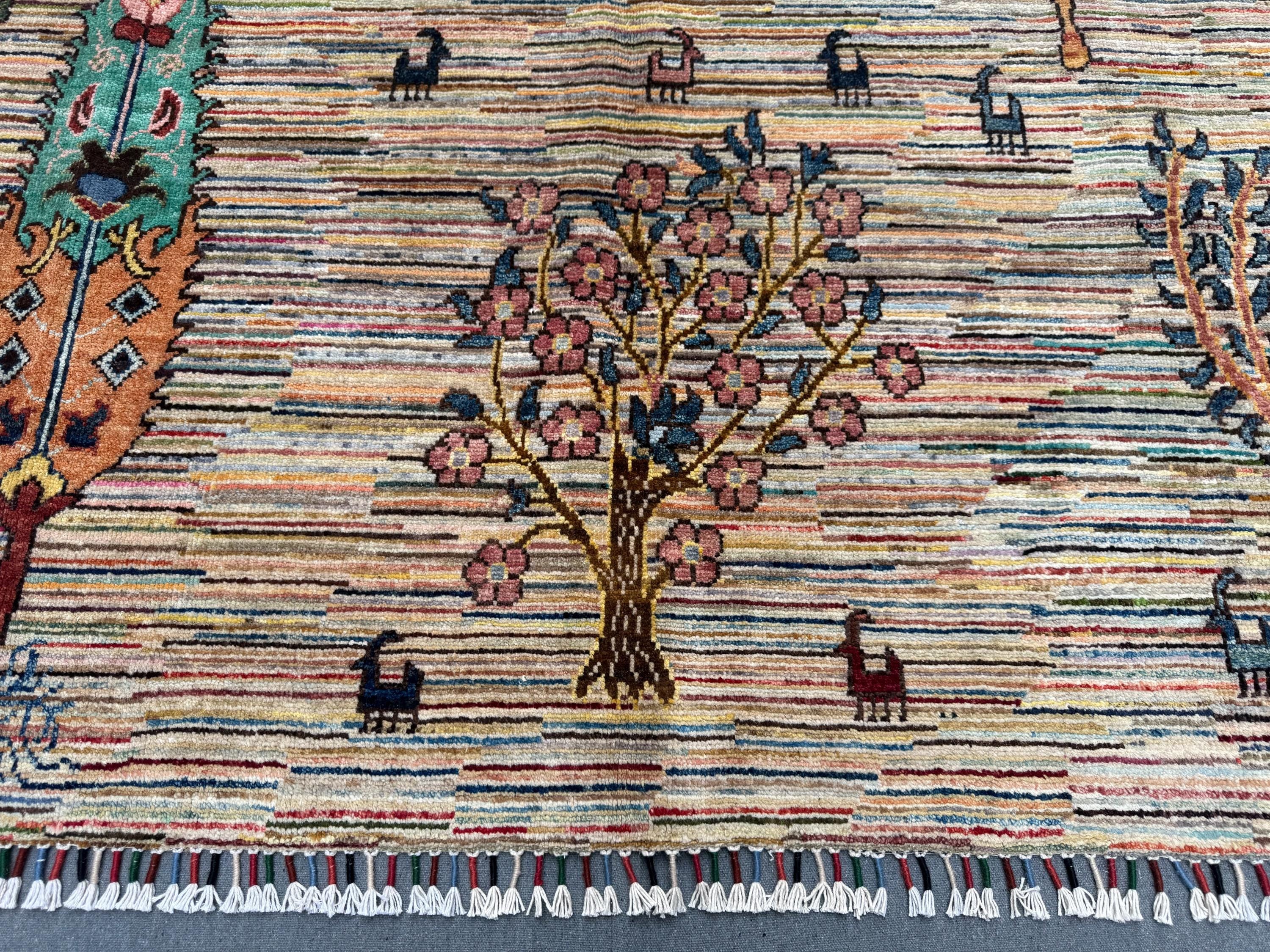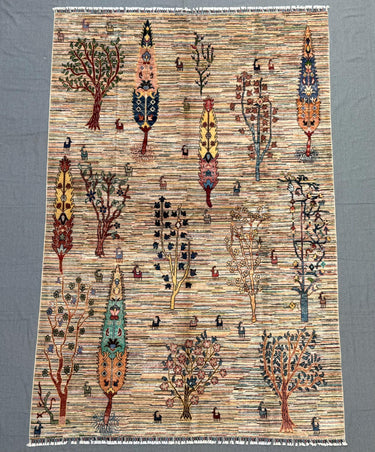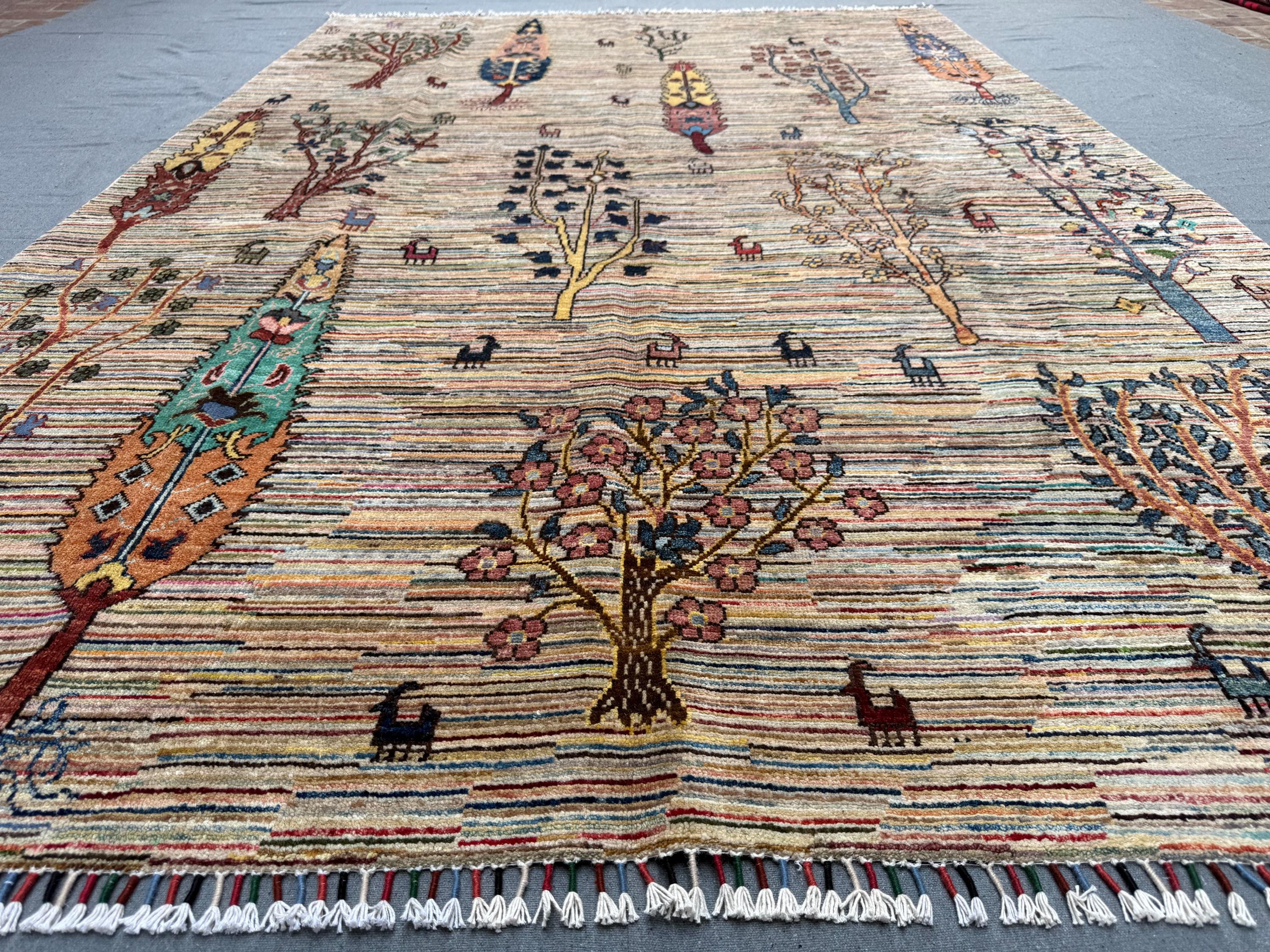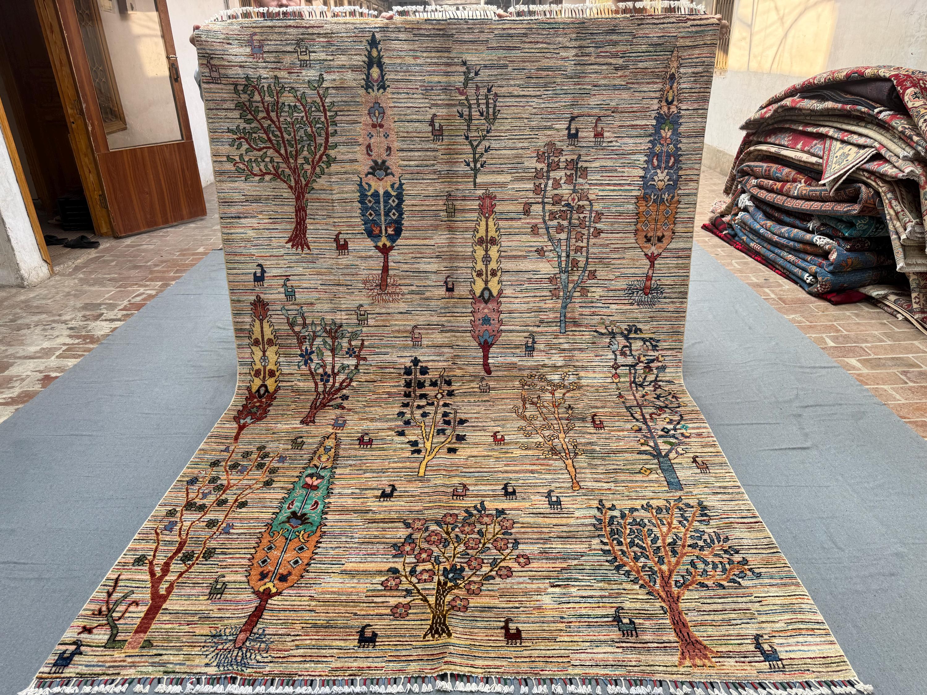 Bring warmth and artistry to your home with this 6.6x9.8 Tree of Life floral rug, beautifully decorated with nature-inspired motifs. The soft beige background is adorned with colorful trees, birds, and animals, symbolizing harmony, growth, and life — a timeless design that blends traditional craftsmanship with modern aesthetics.