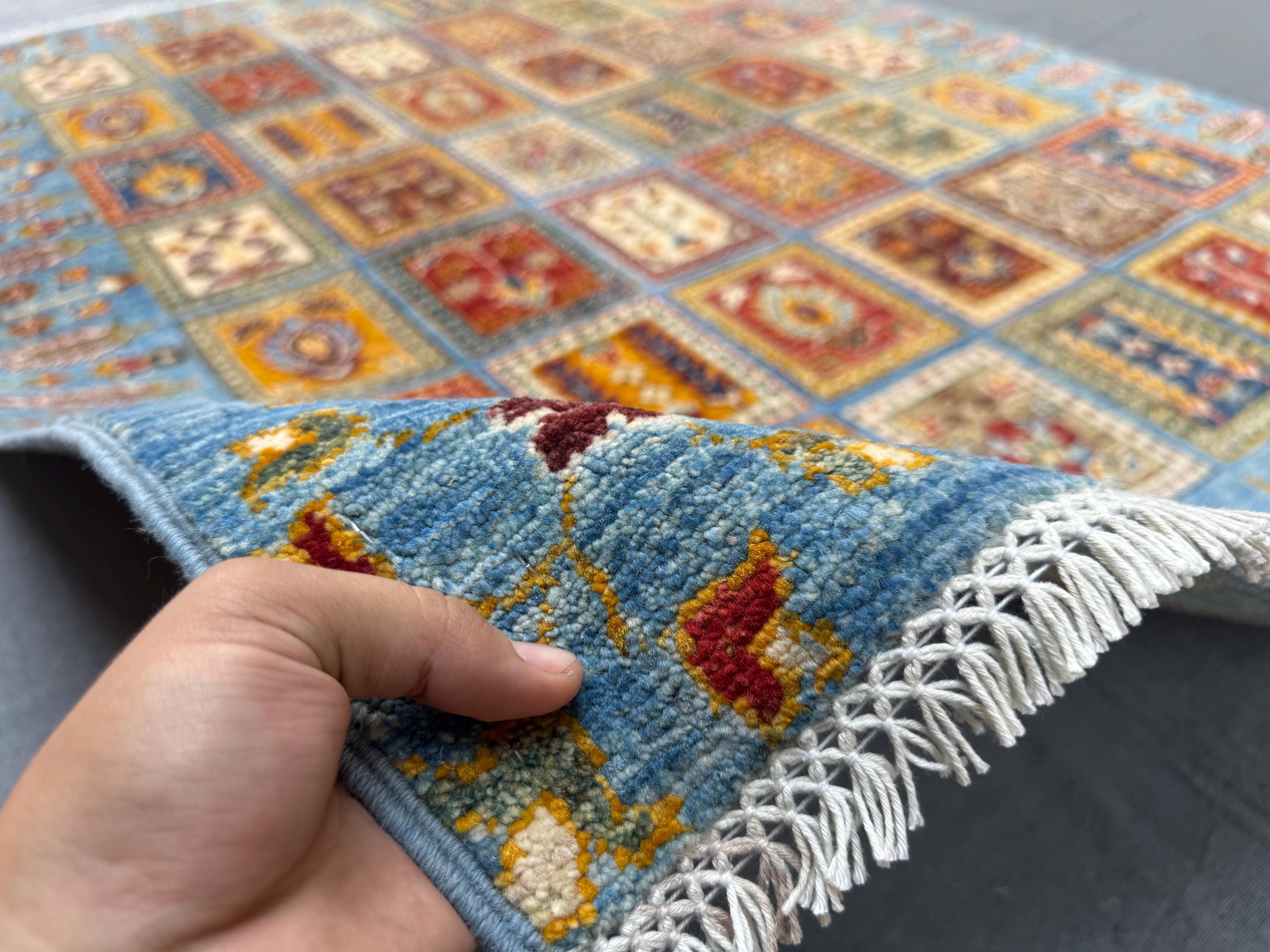Each square displays a different floral or geometric motif, showcasing the craftsmanship and heritage of traditional Afghan weaving. The surrounding aqua blue border with floral accents brings balance and harmony to the overall composition.