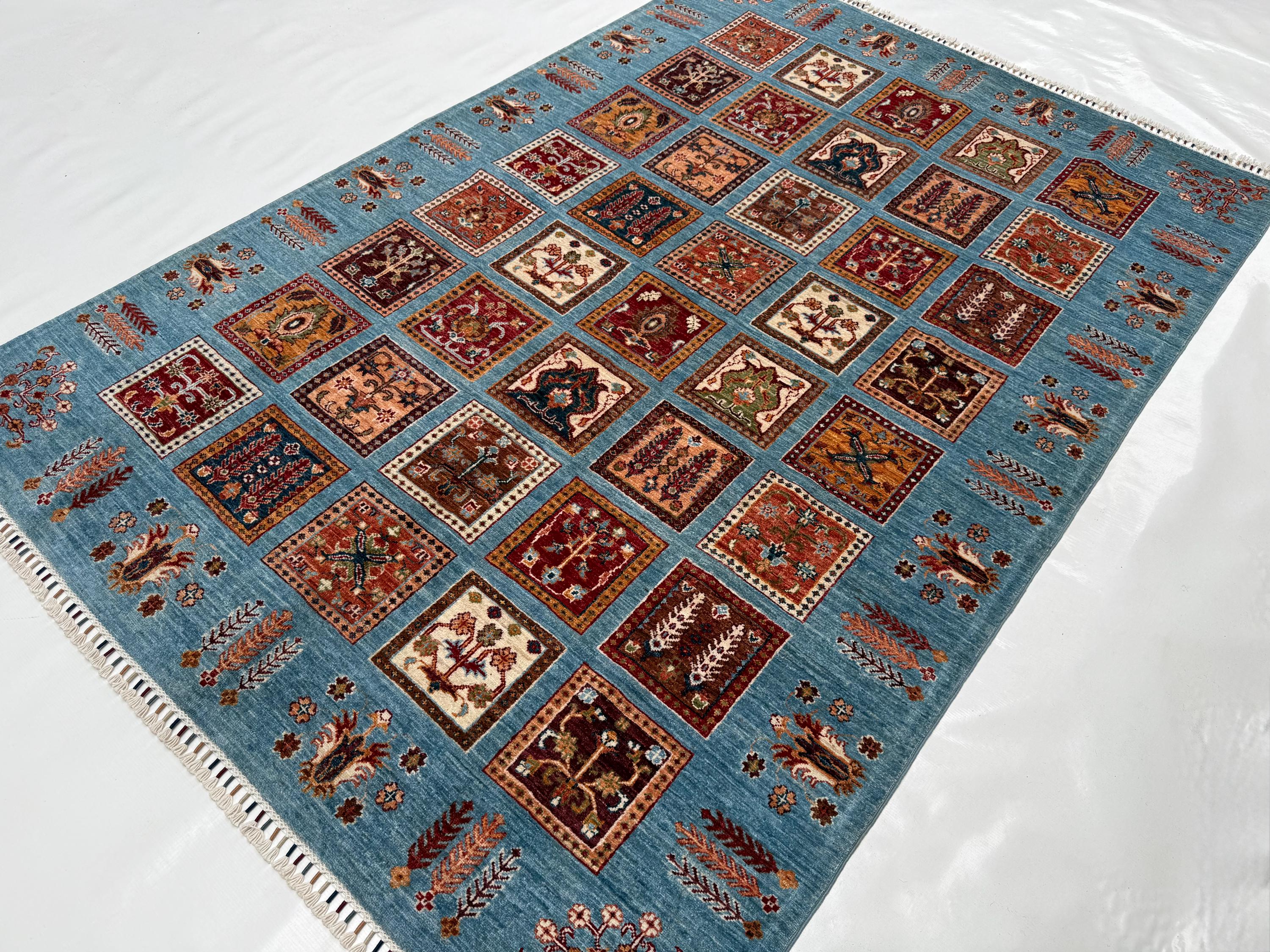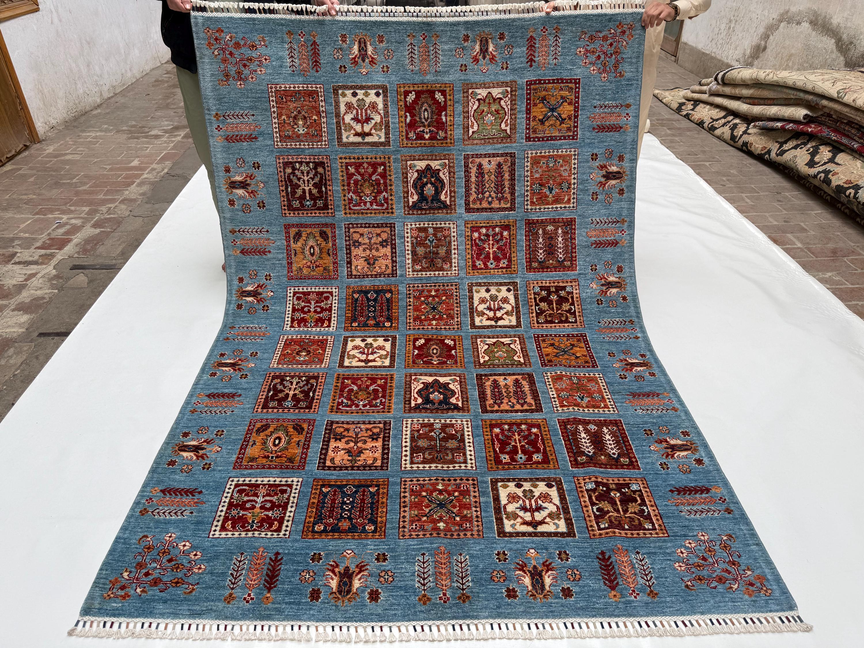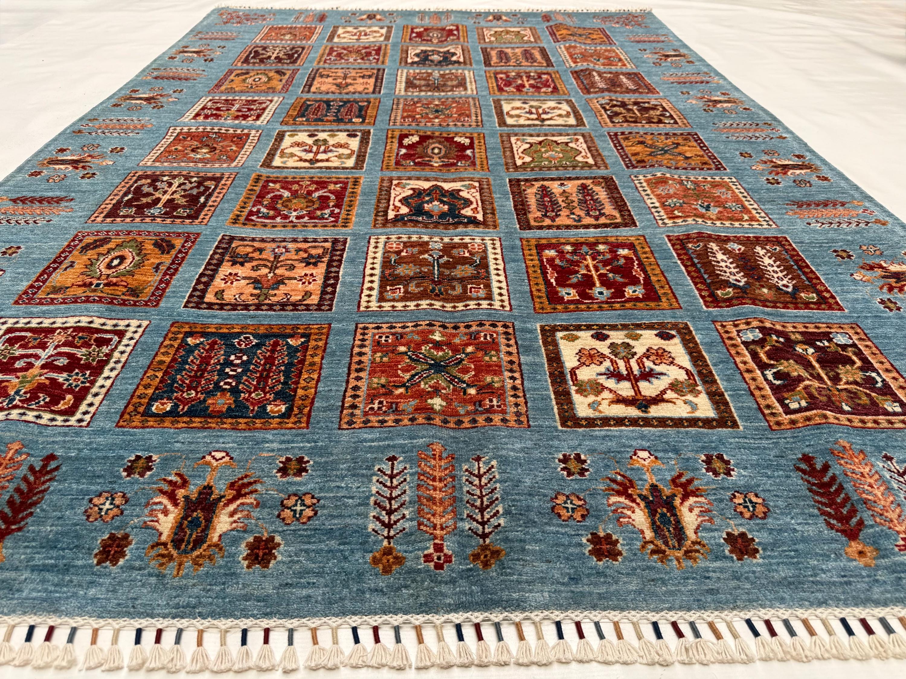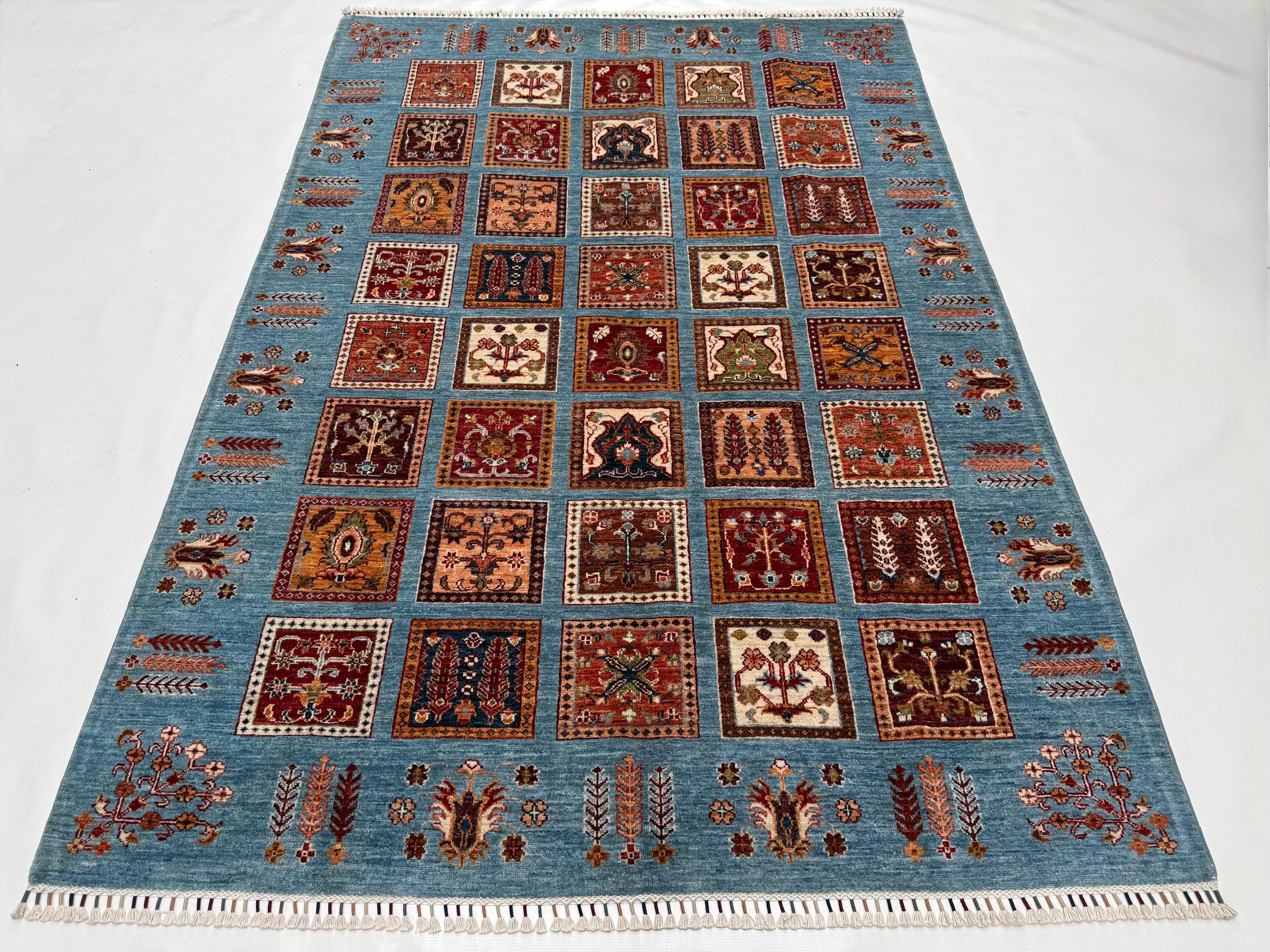 Bakhtiari Area Rug 6x8 ft, Blue Garden Panel Oriental Rug, Traditional Square Motif Wool Rug for Living Room Decor