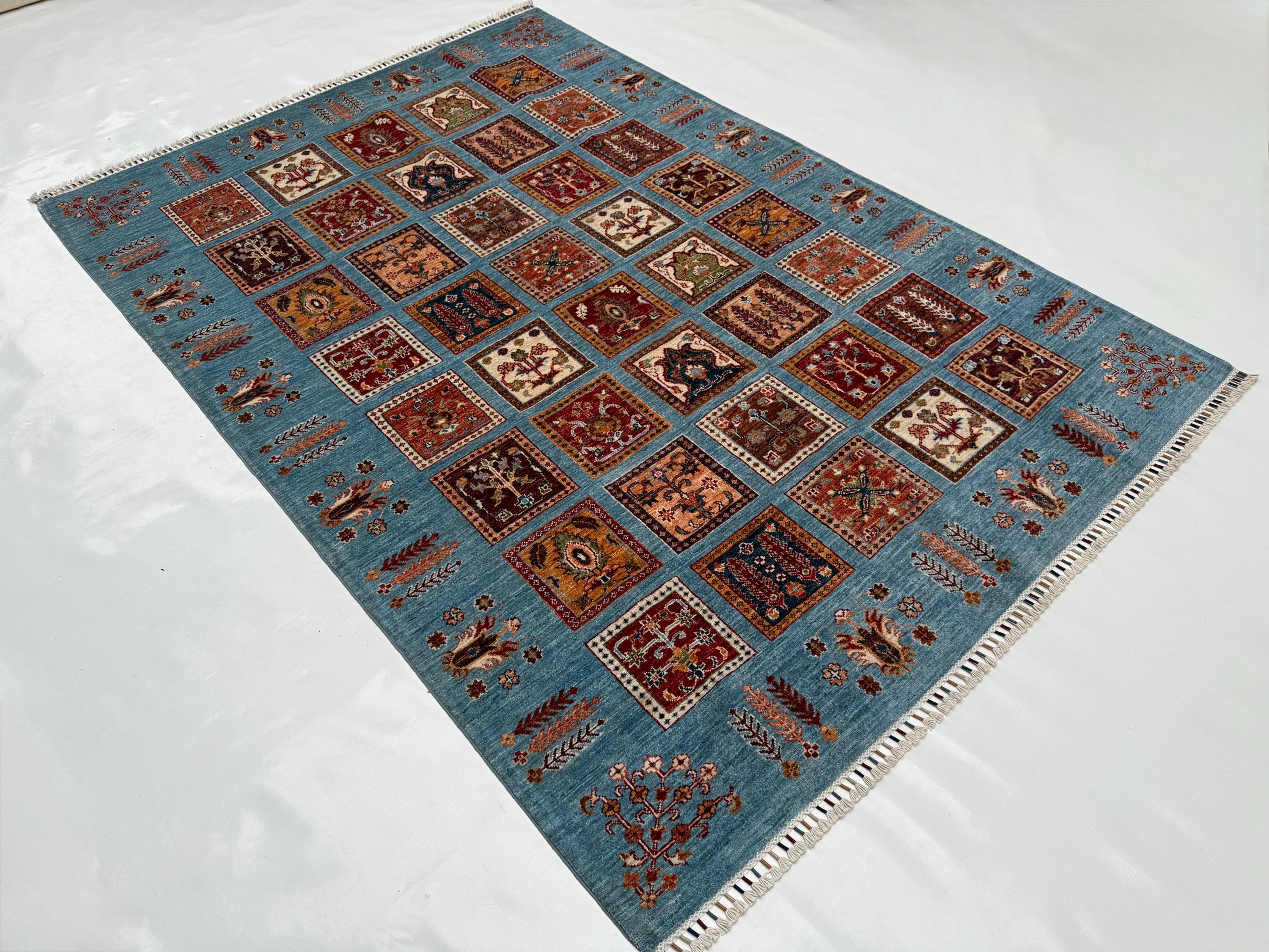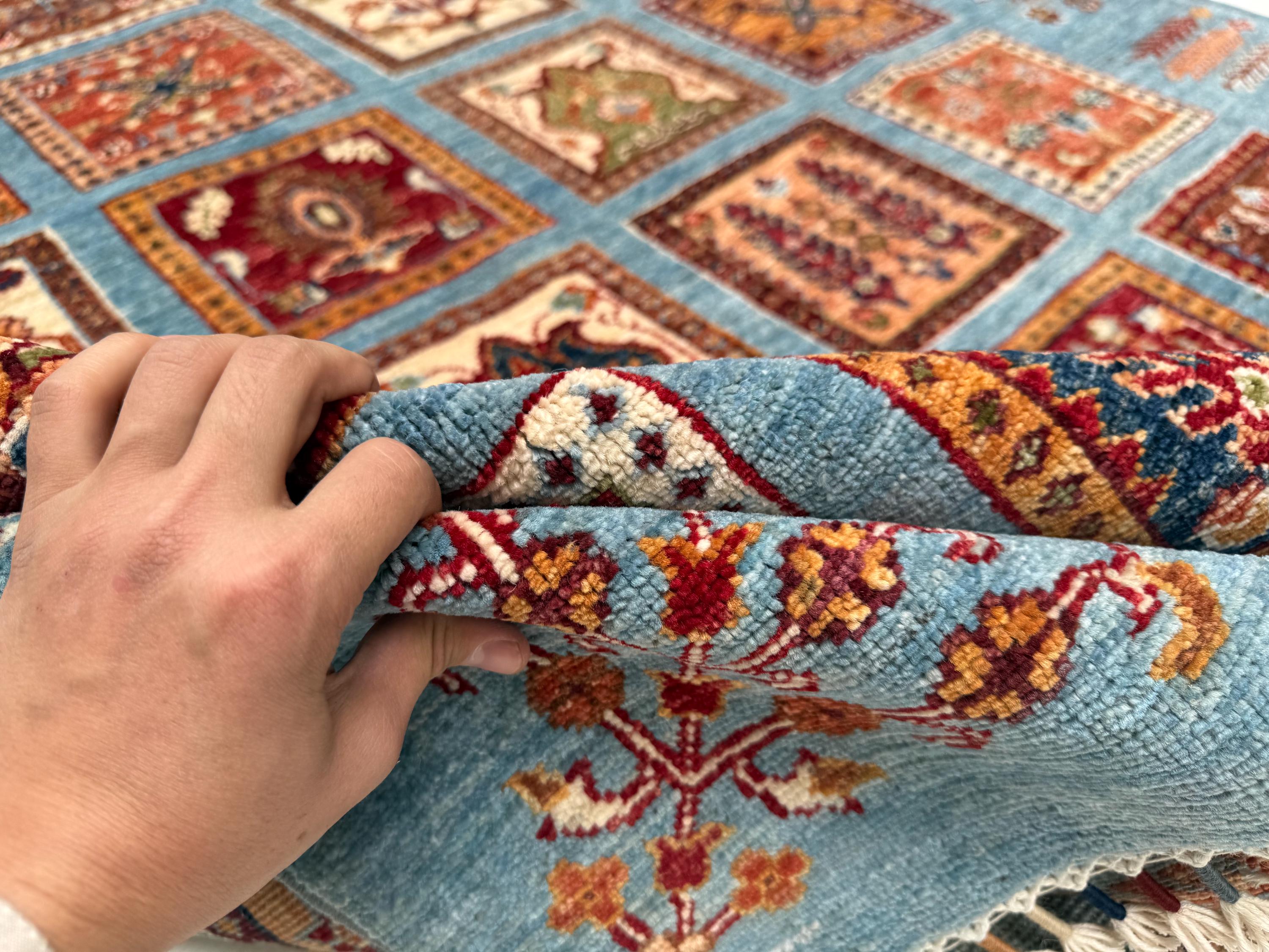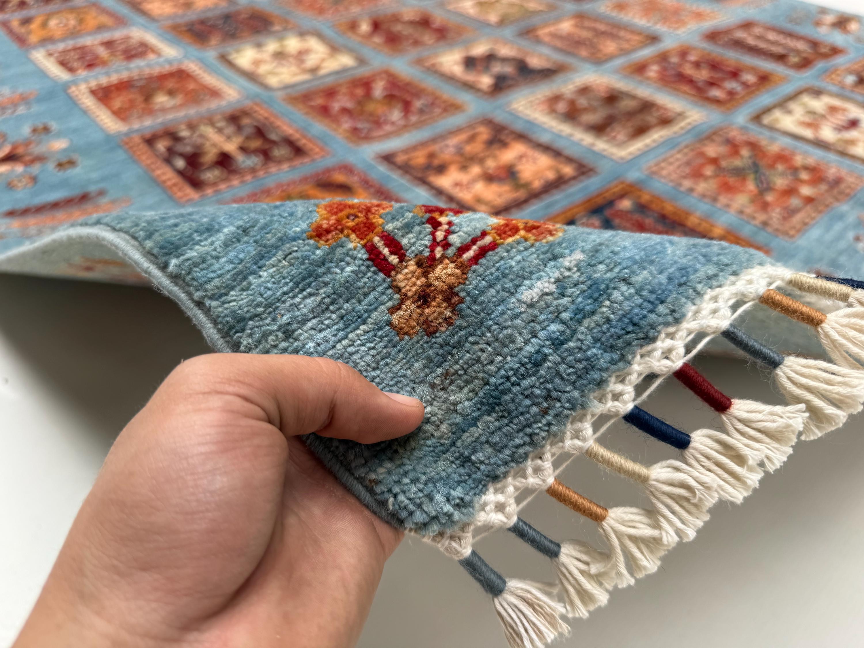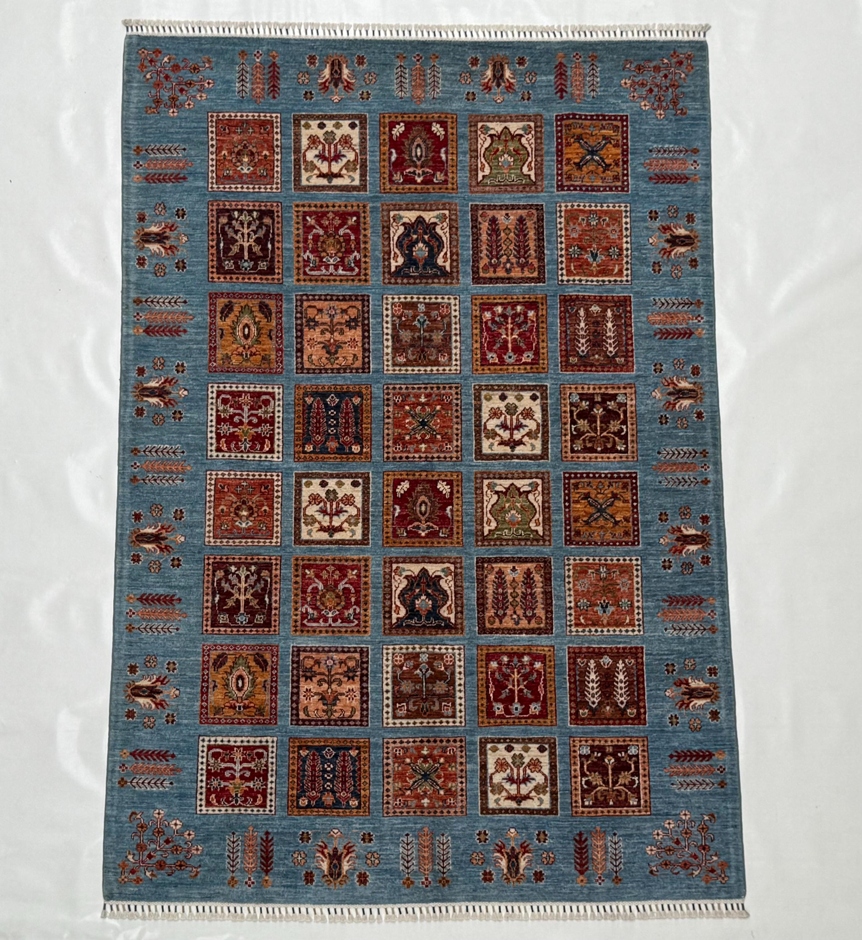 Bakhtiari Area Rug 6x8 ft, Blue Garden Panel Oriental Rug, Traditional Square Motif Wool Rug for Living Room Decor