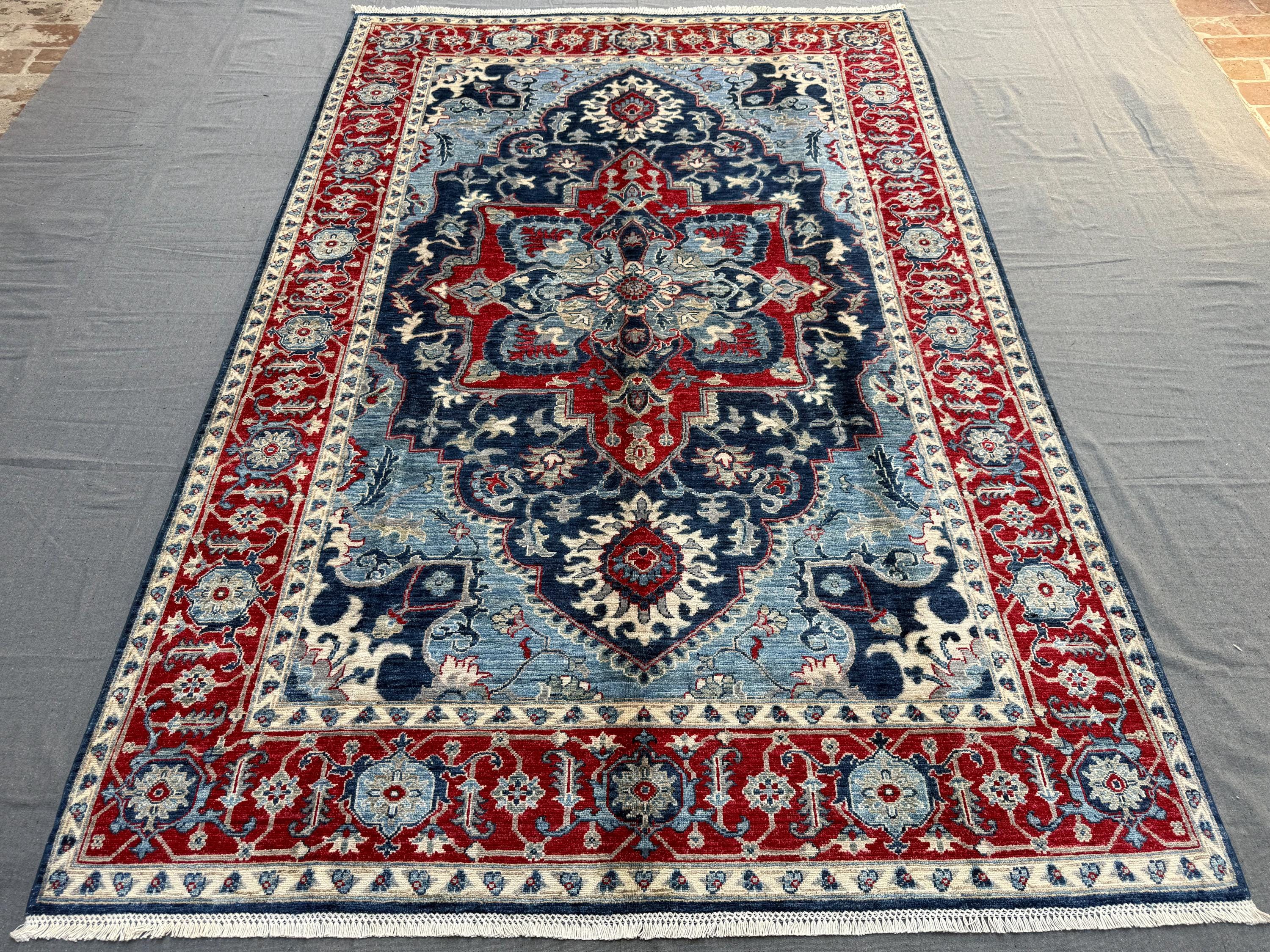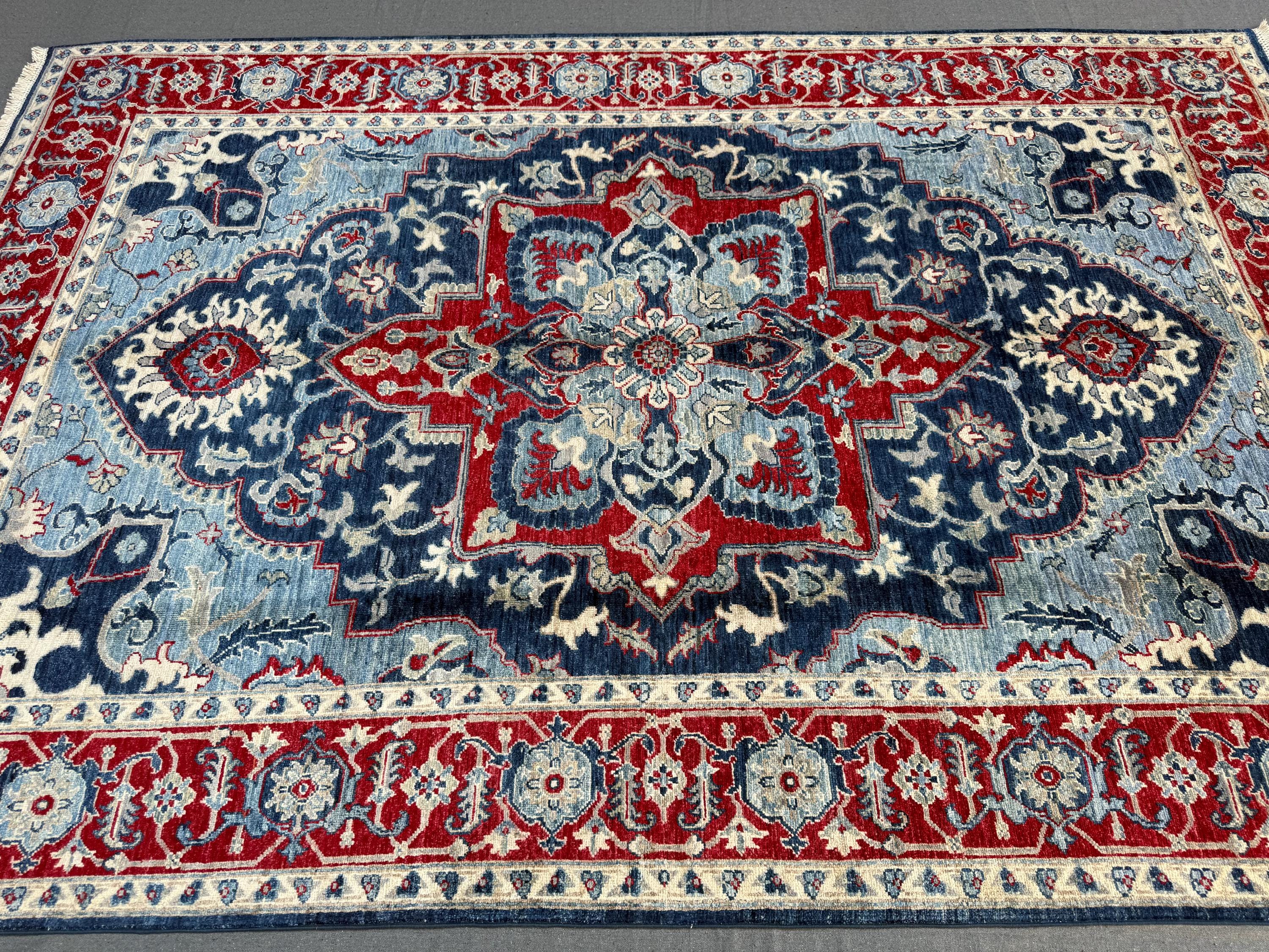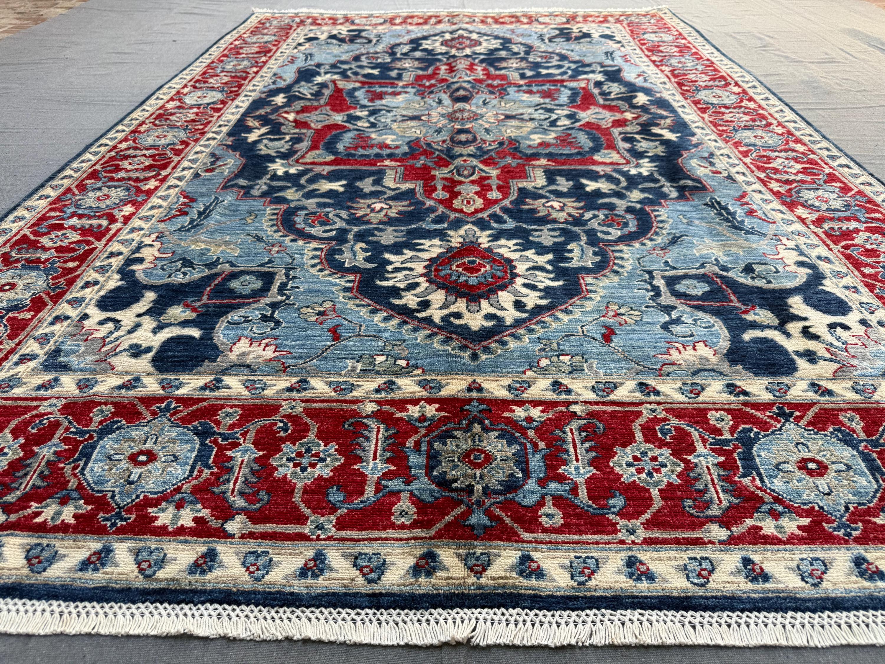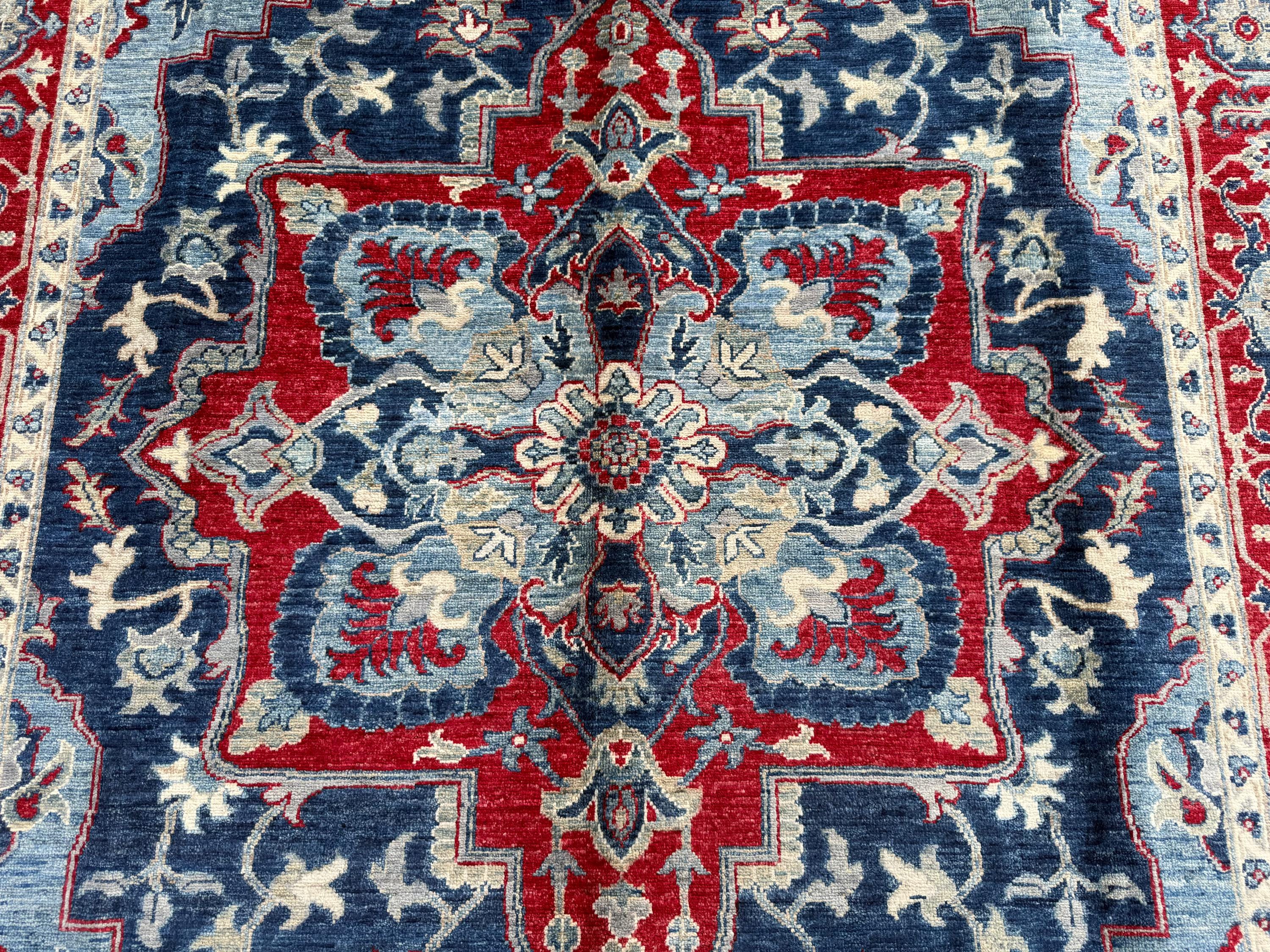 Blue & Red Heriz Rug 6x9 ft Handmade Wool Geometric Medallion Carpet, Navy Sky Blue Area Rug with Ivory Accents