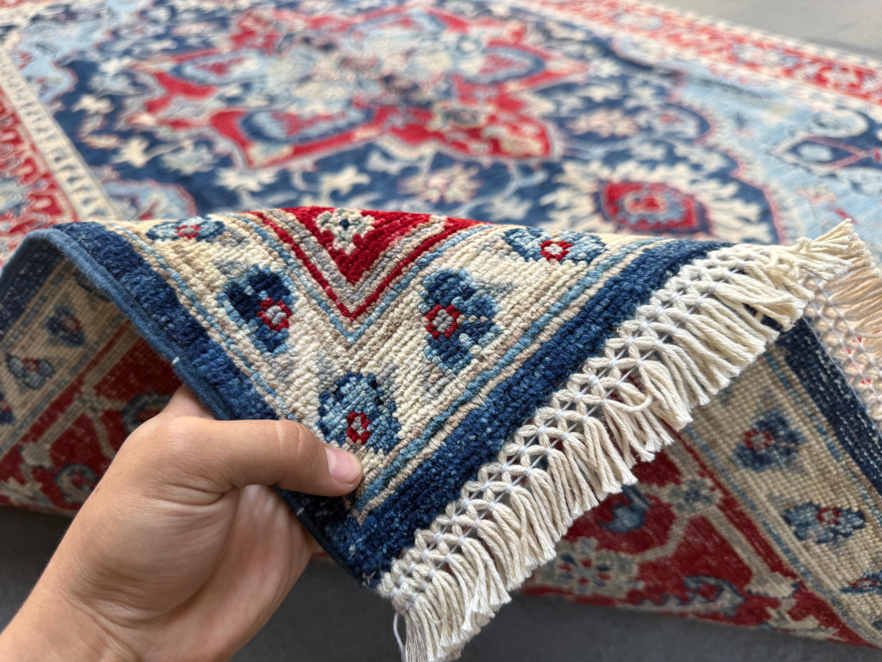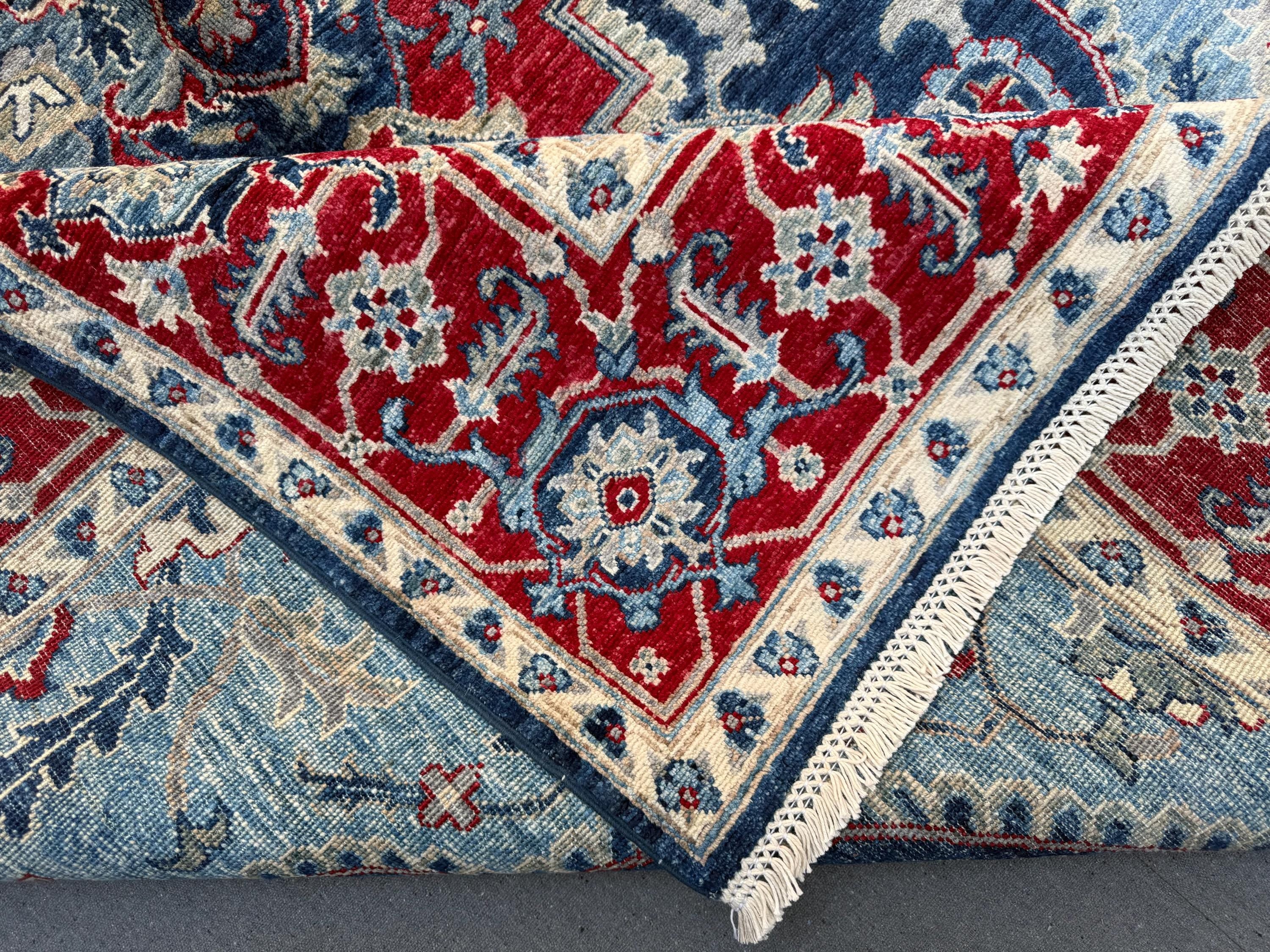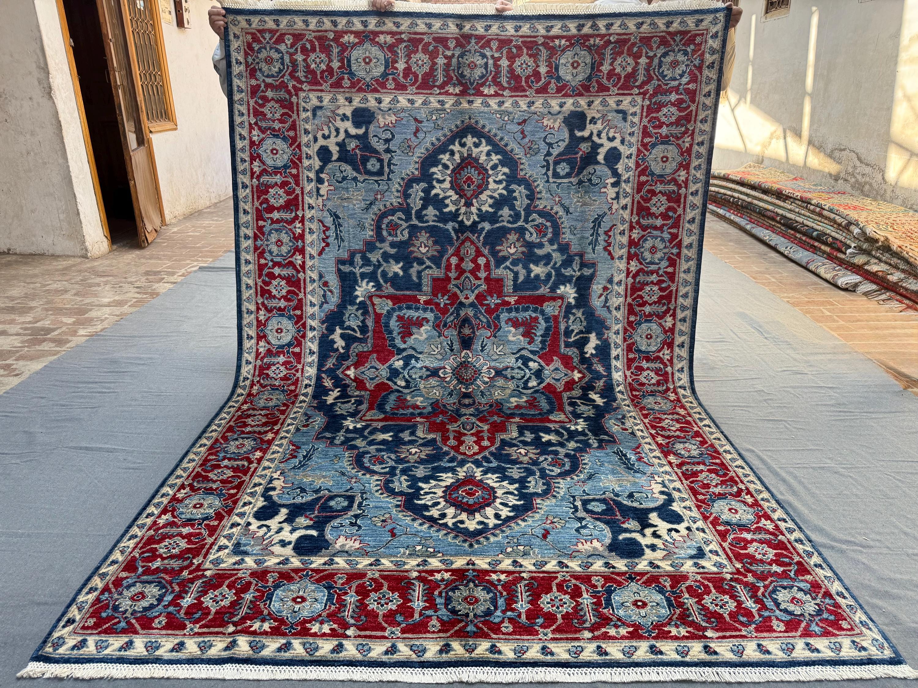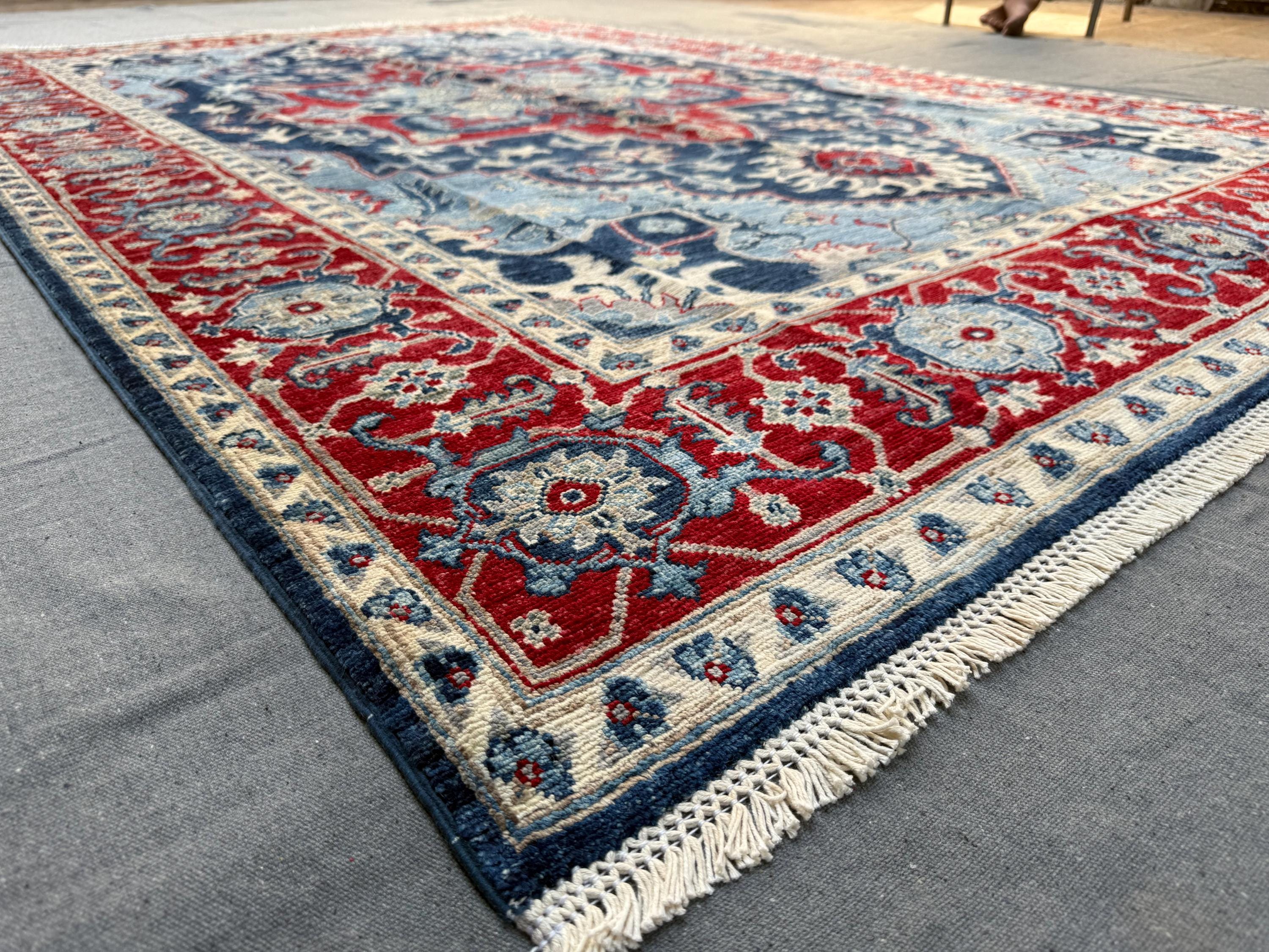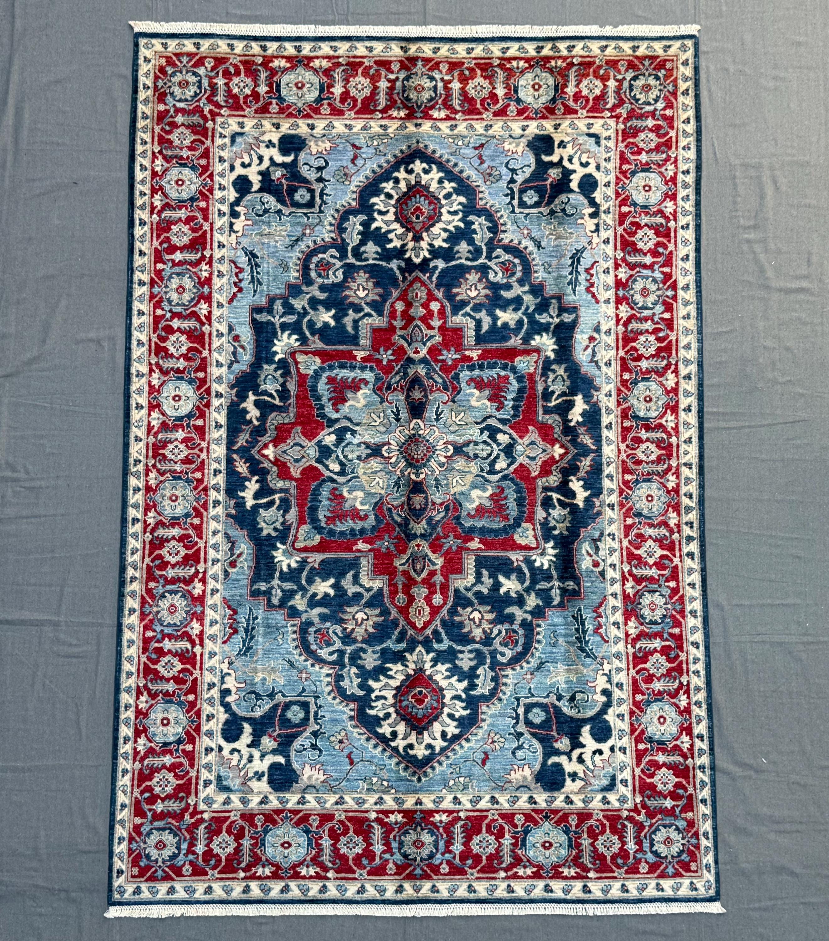Blue & Red Heriz Rug 6x9 ft Handmade Wool Geometric Medallion Carpet, Navy Sky Blue Area Rug with Ivory Accents