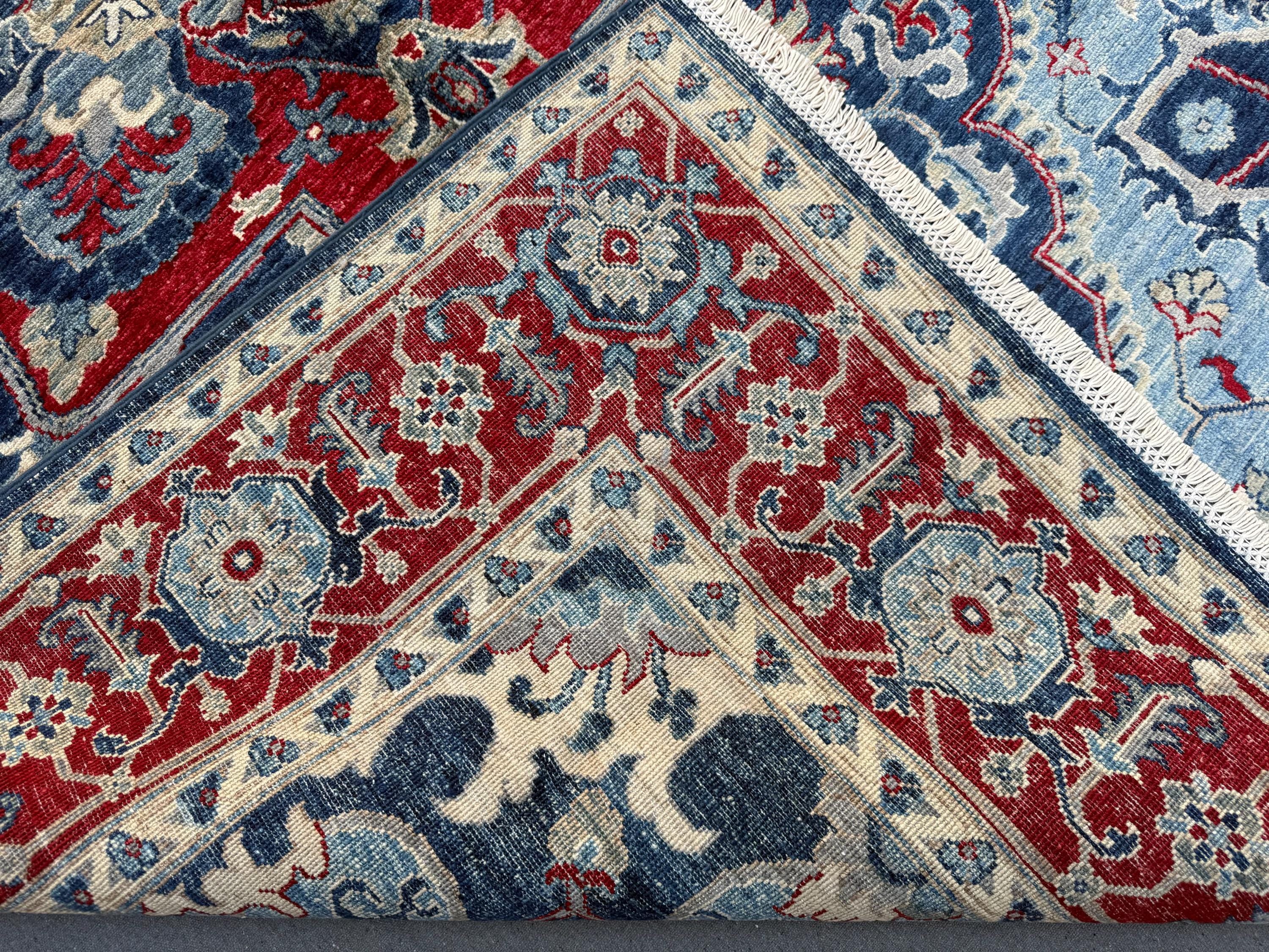 The center medallion bursts with layered shades of red and blue, framed by detailed floral borders and crisp ivory highlights. Hand-knotted from durable wool, this rug provides long-lasting beauty while remaining soft underfoot, making it ideal for both decorative and everyday use.