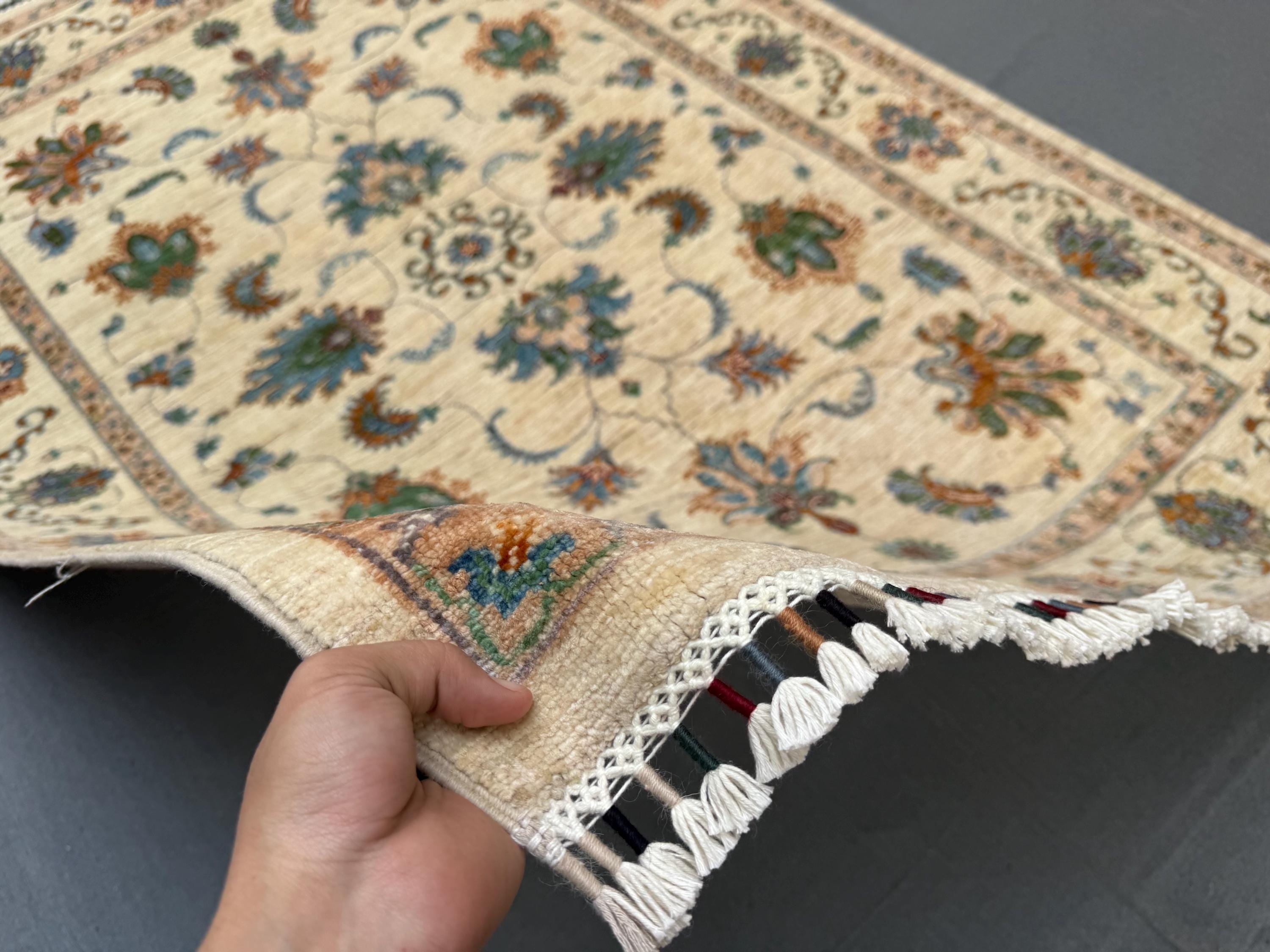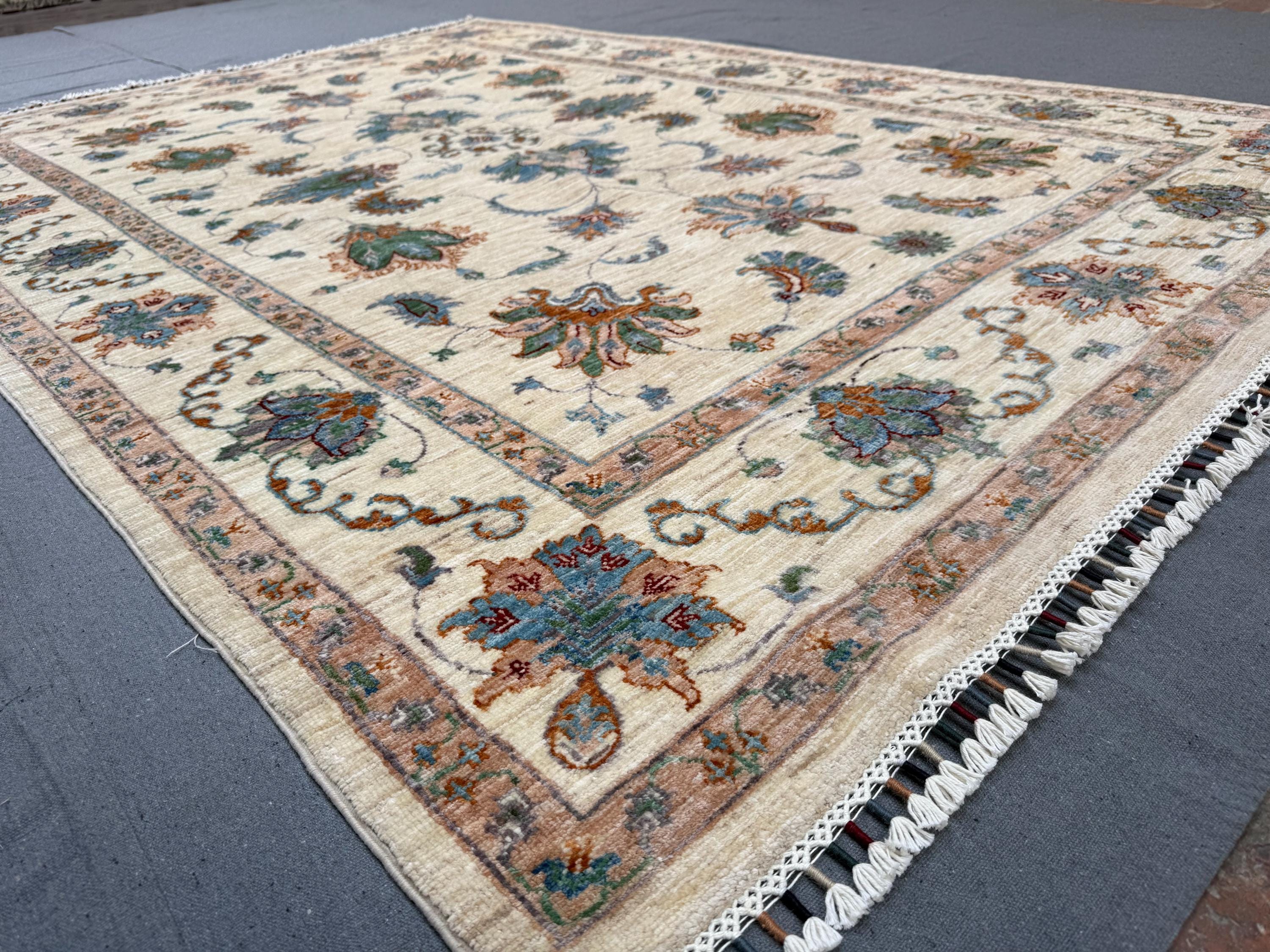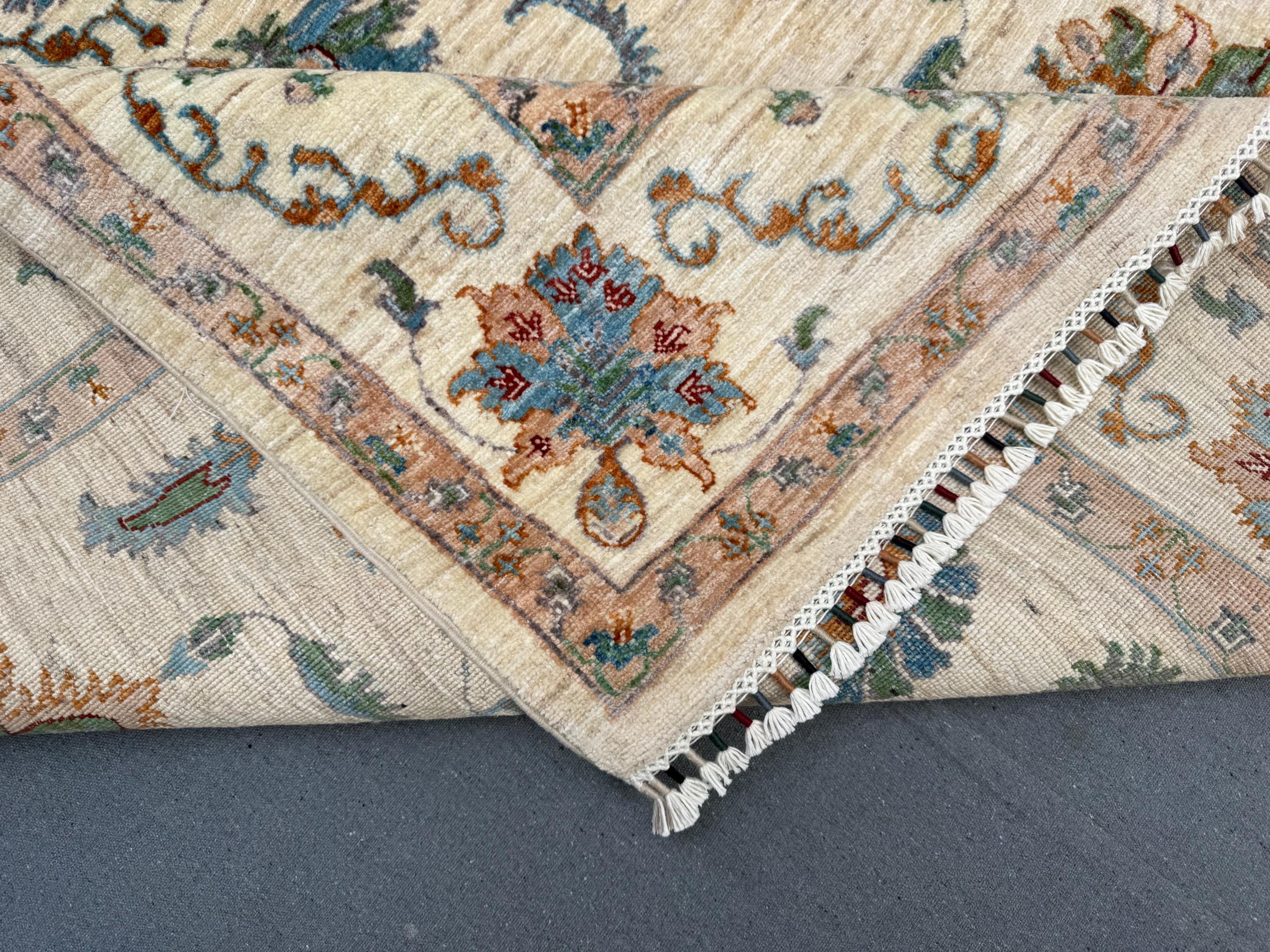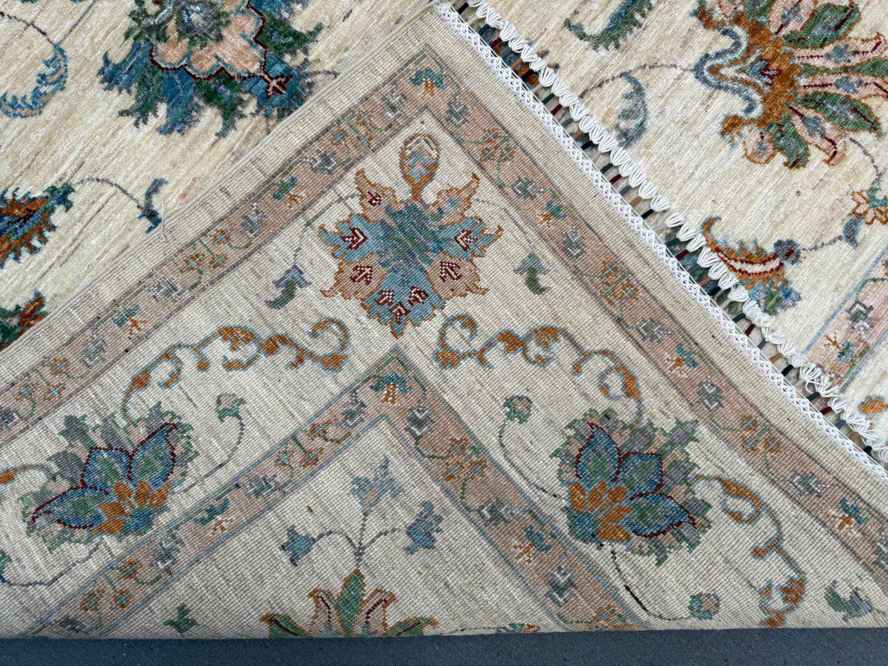 Bring elegance, softness, and timeless beauty to your home with this handmade Chobi rug, featuring a warm ivory background decorated with detailed floral motifs in shades of blue, green, gold, and rust. The balanced layout, scrolling vines, and delicate border give this piece a refined and classic feel that suits any décor.