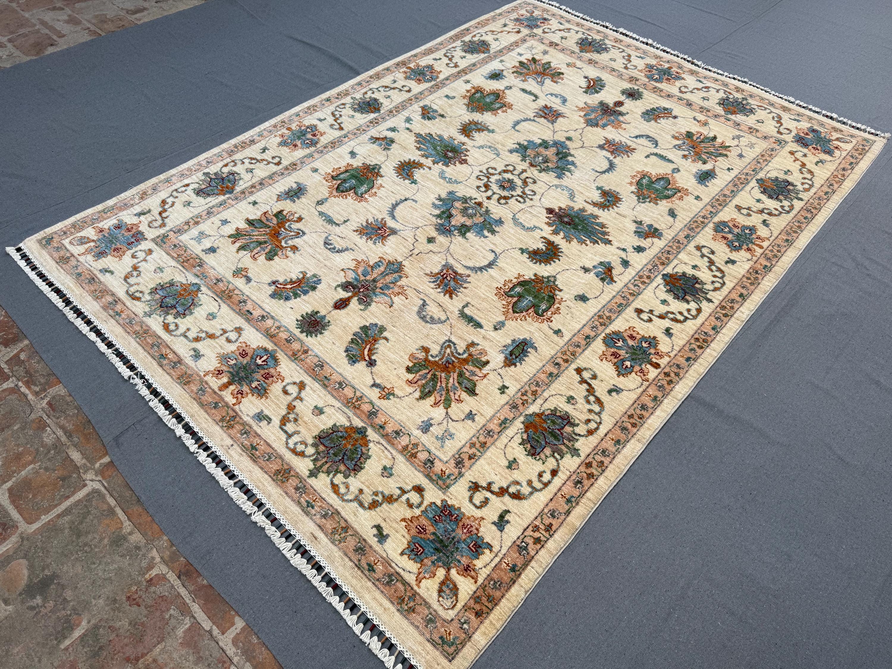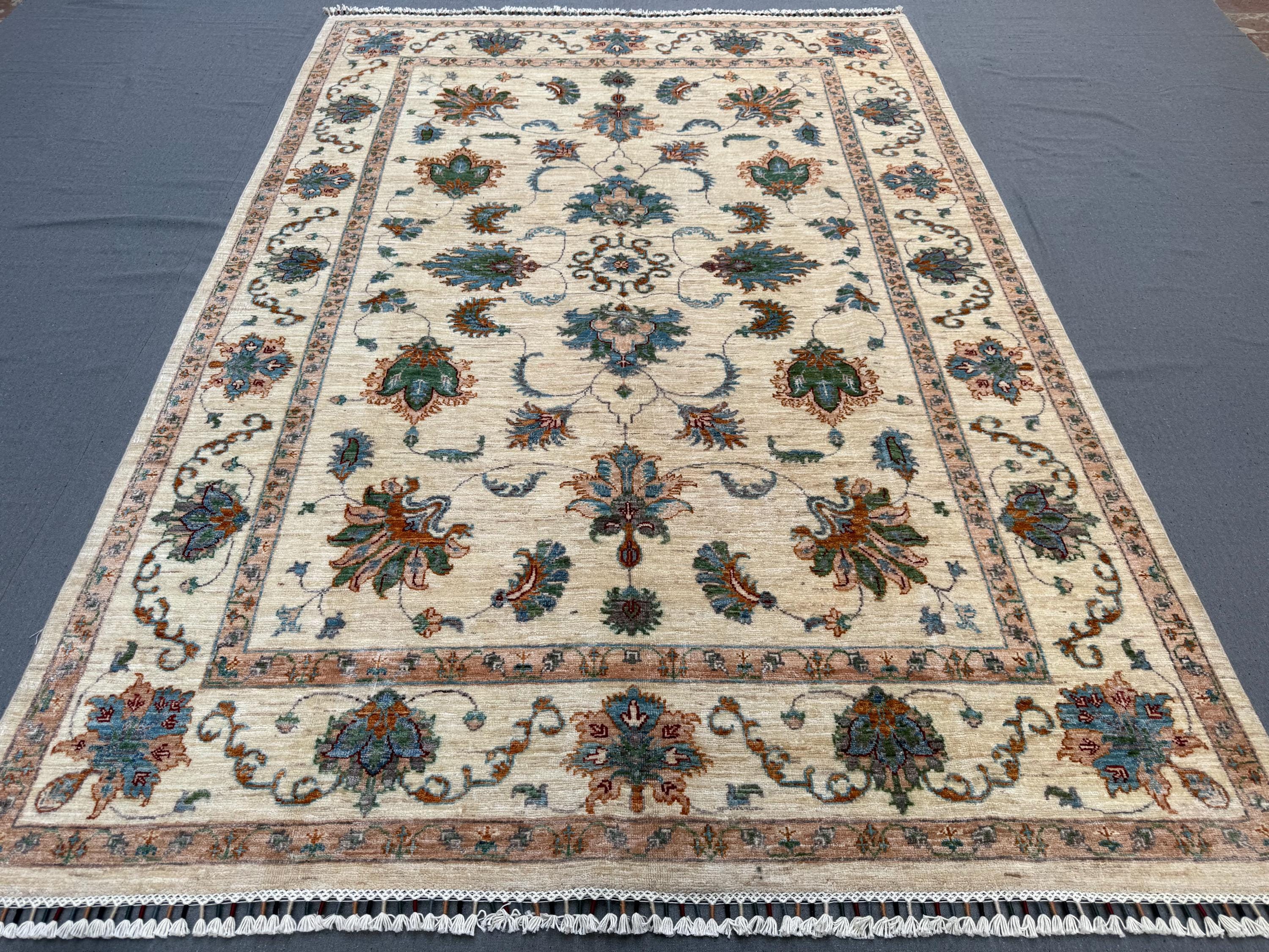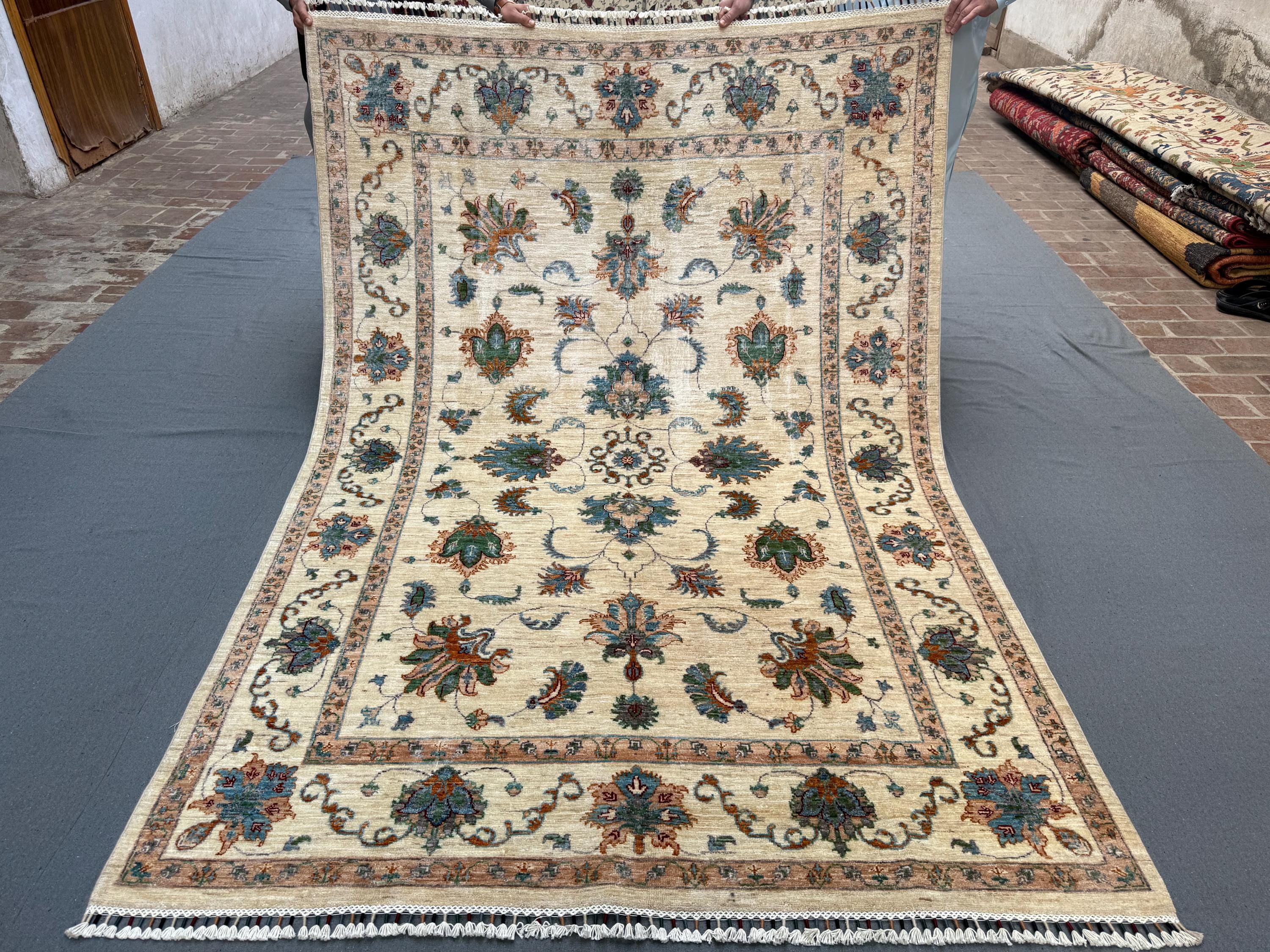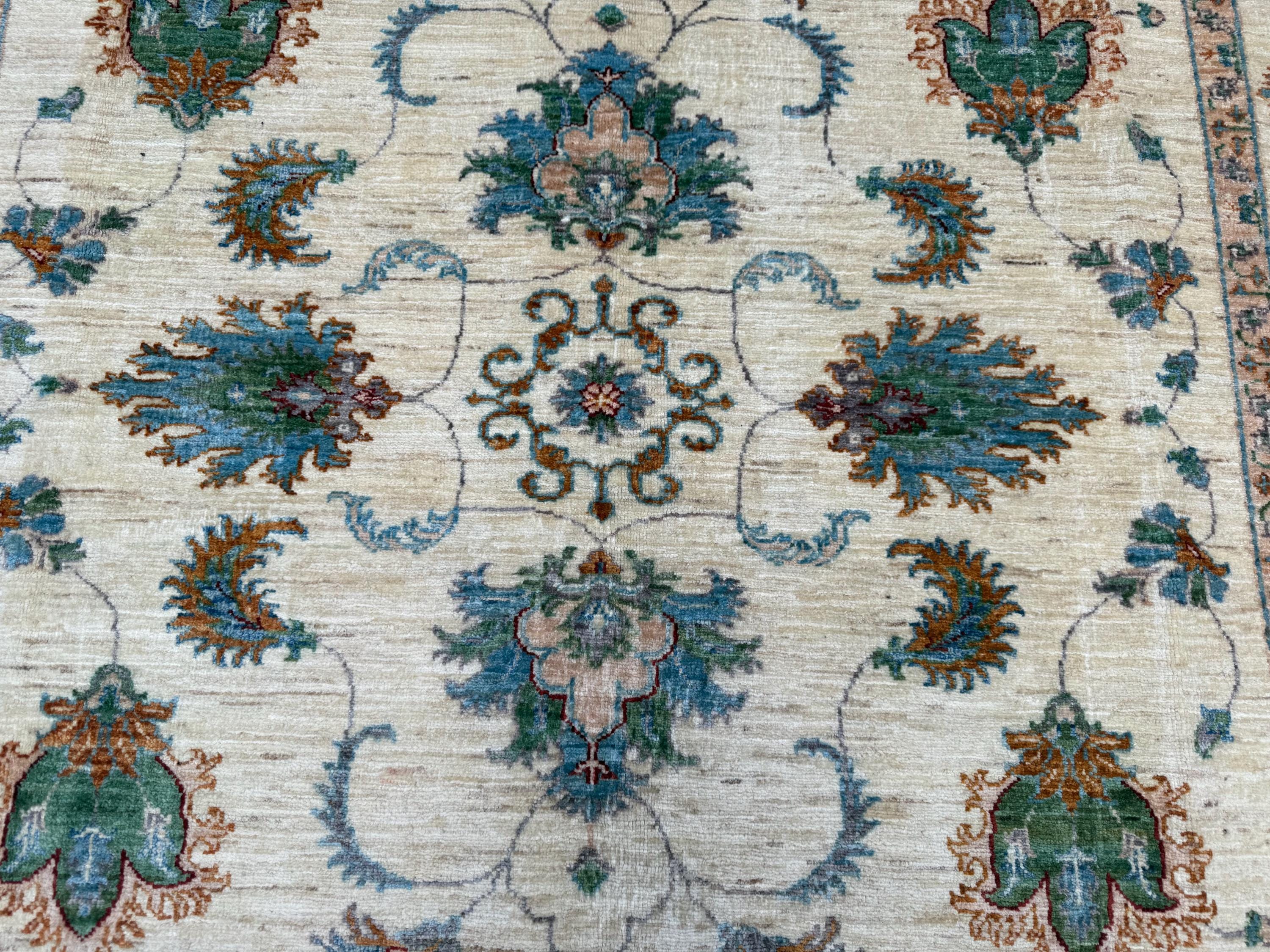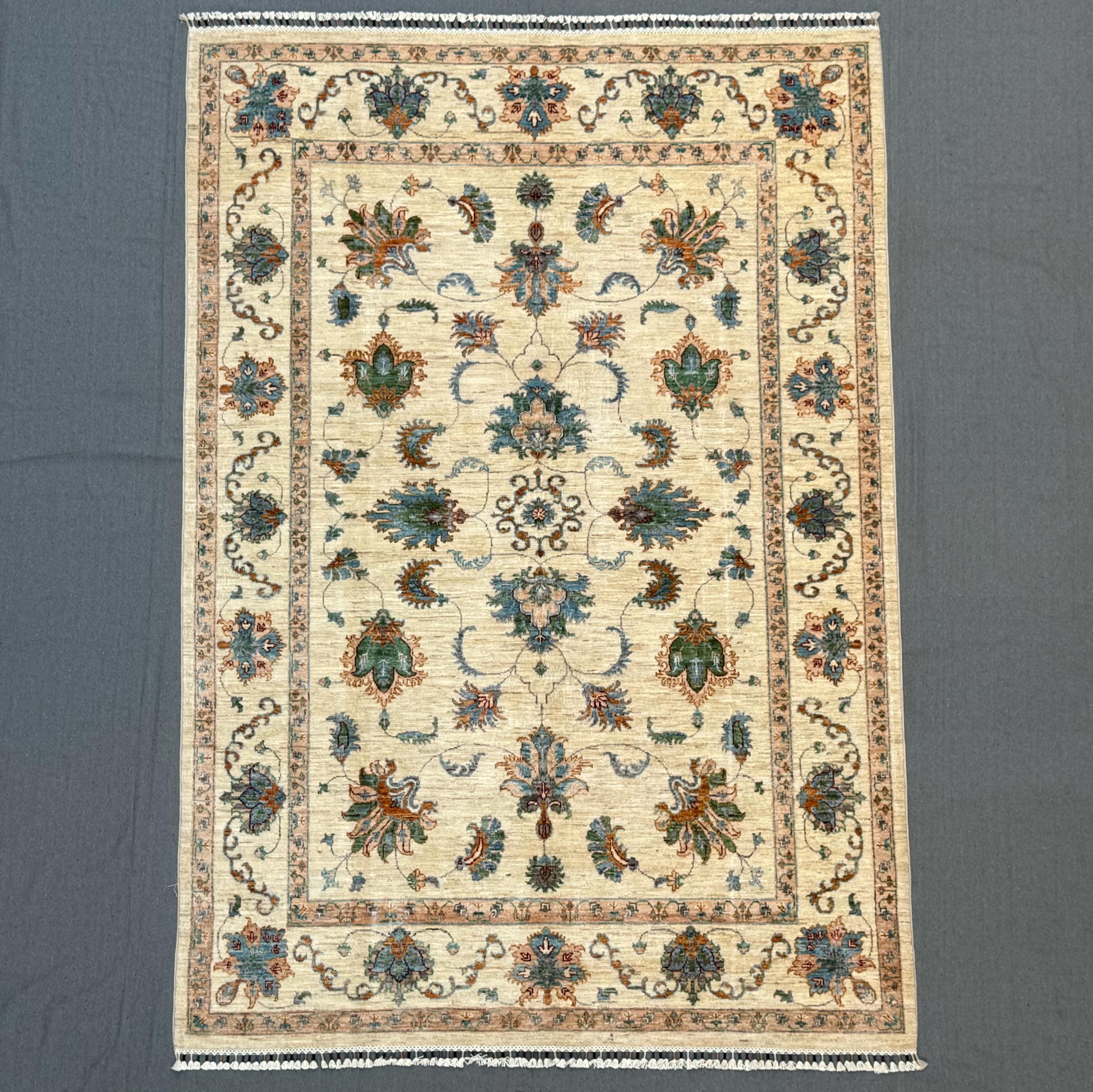 Handmade Chobi Rug 6x8 ft Ivory Wool Area Carpet with Blue & Green Floral Motifs Elegant Soft-Tone Design for Living Room Home Decor