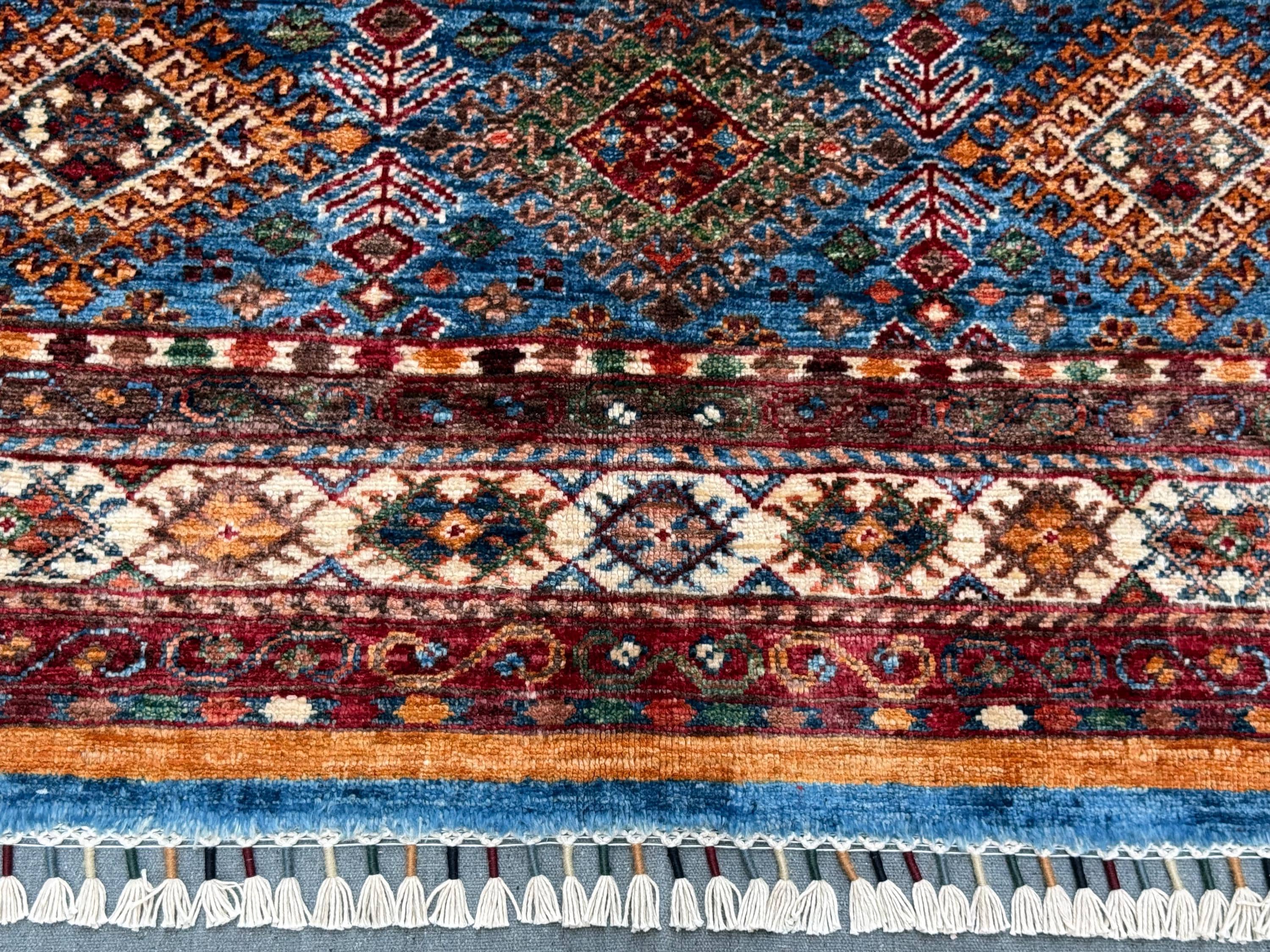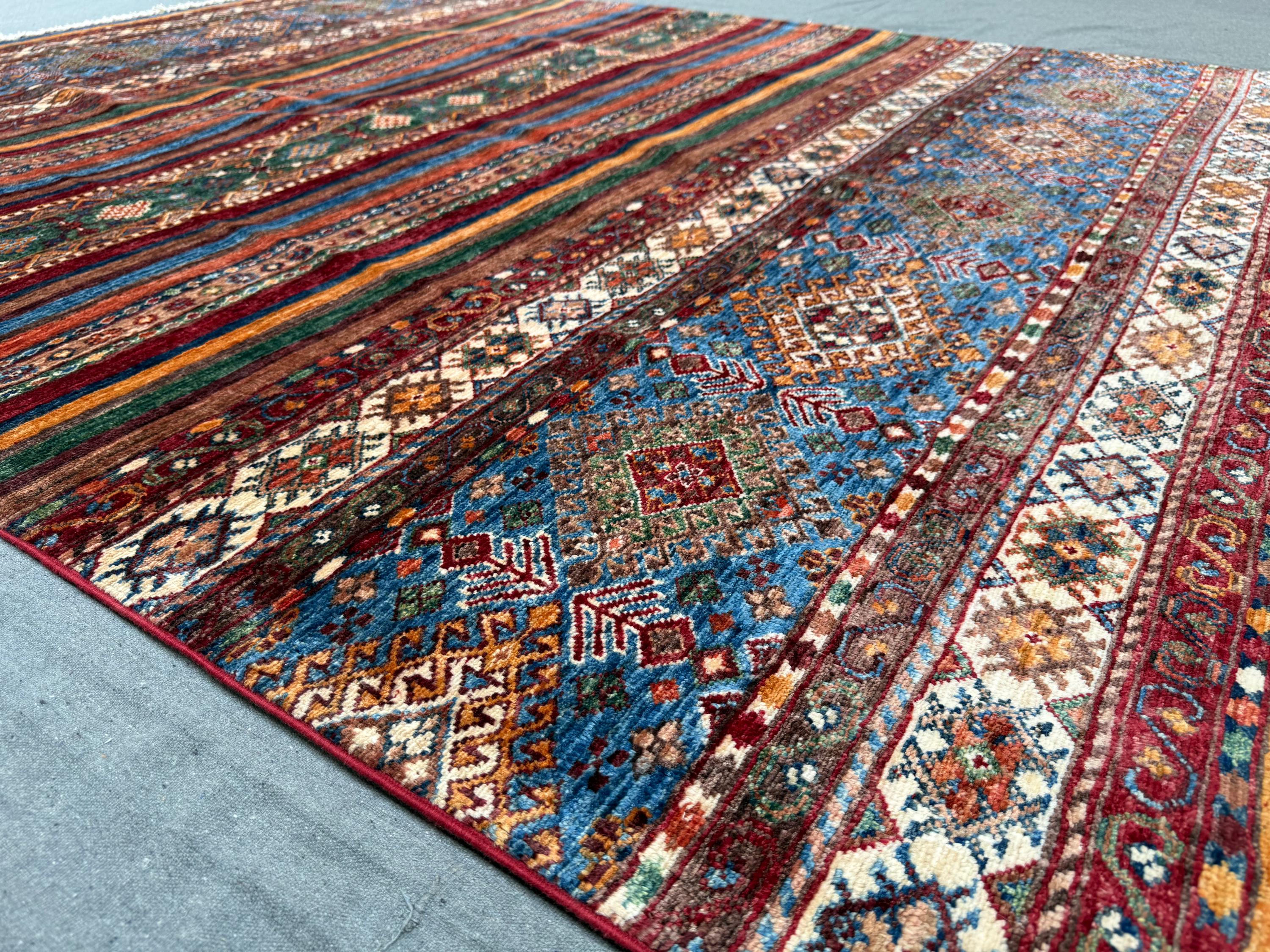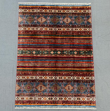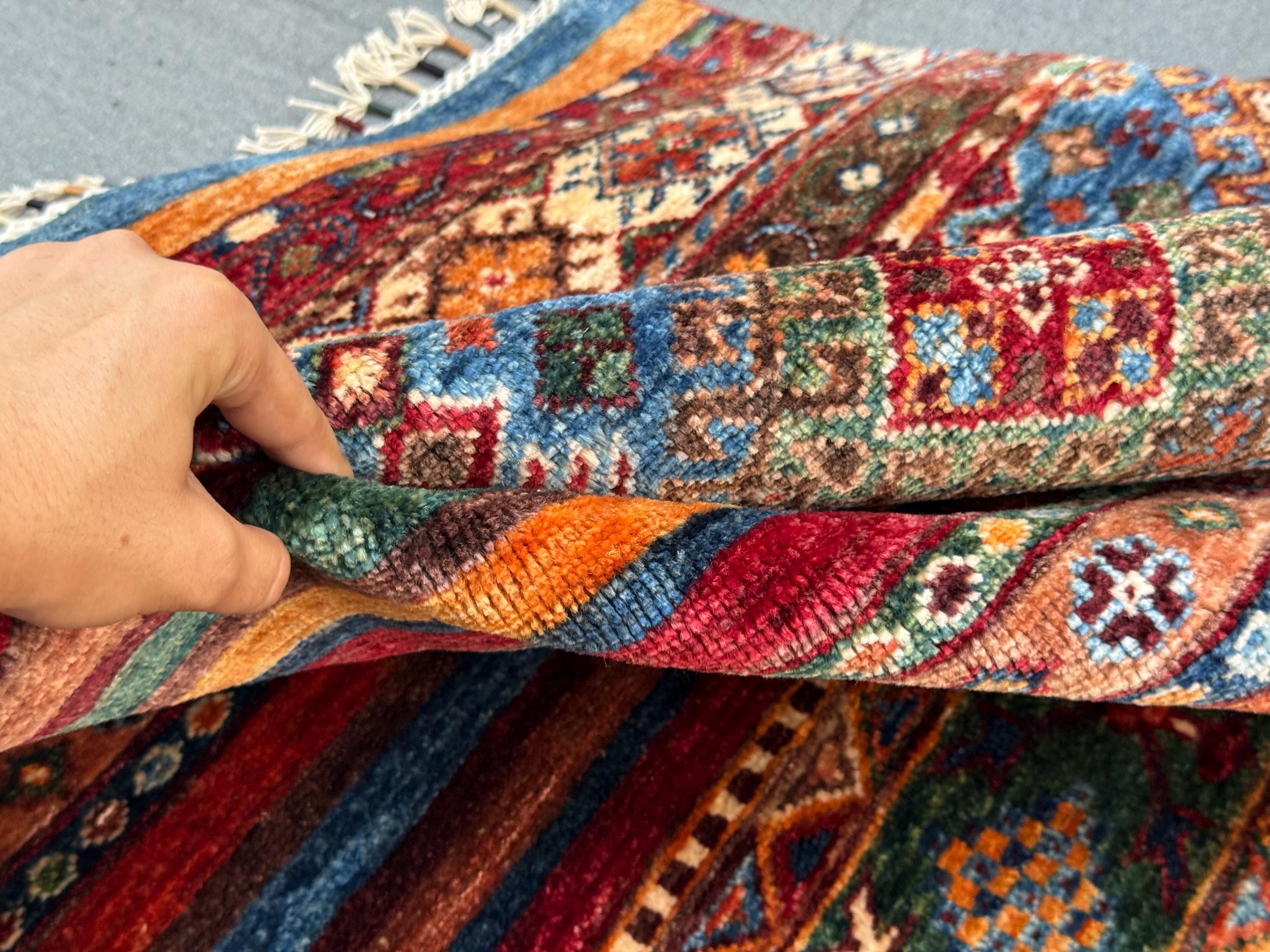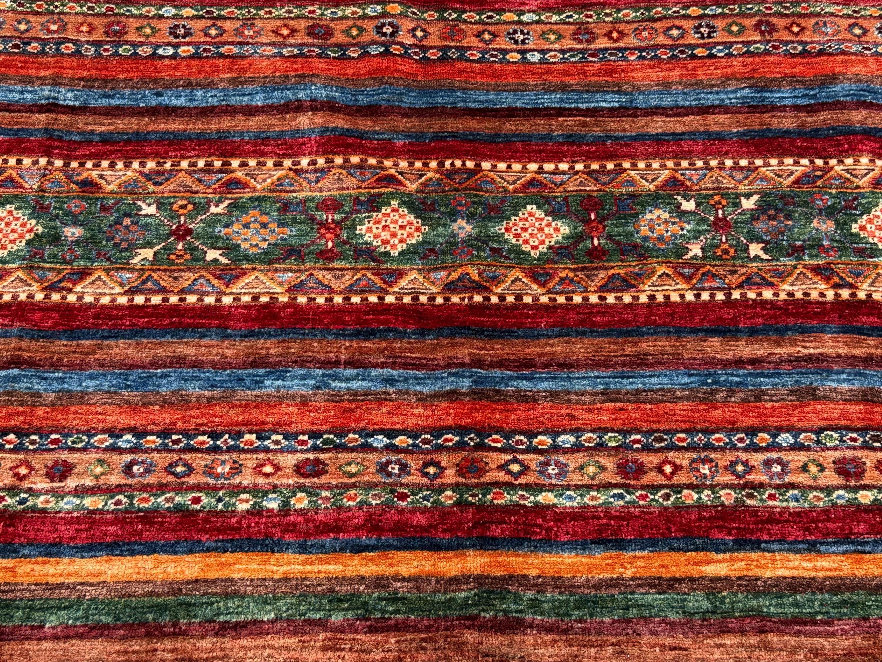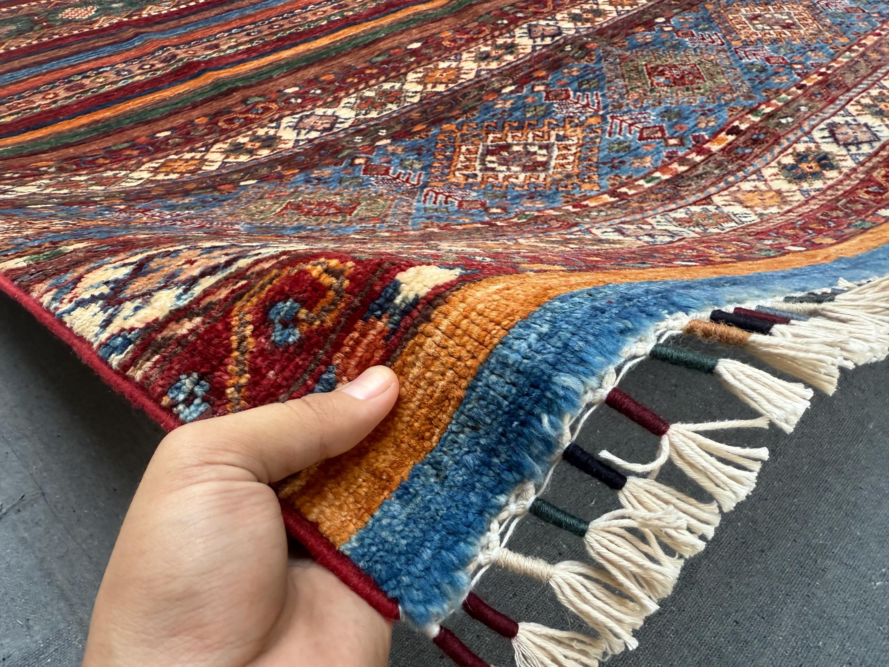 Add a touch of color and character to your home with this handmade Khorjin Modern rug, featuring a captivating blend of traditional tribal motifs and modern striped patterns.