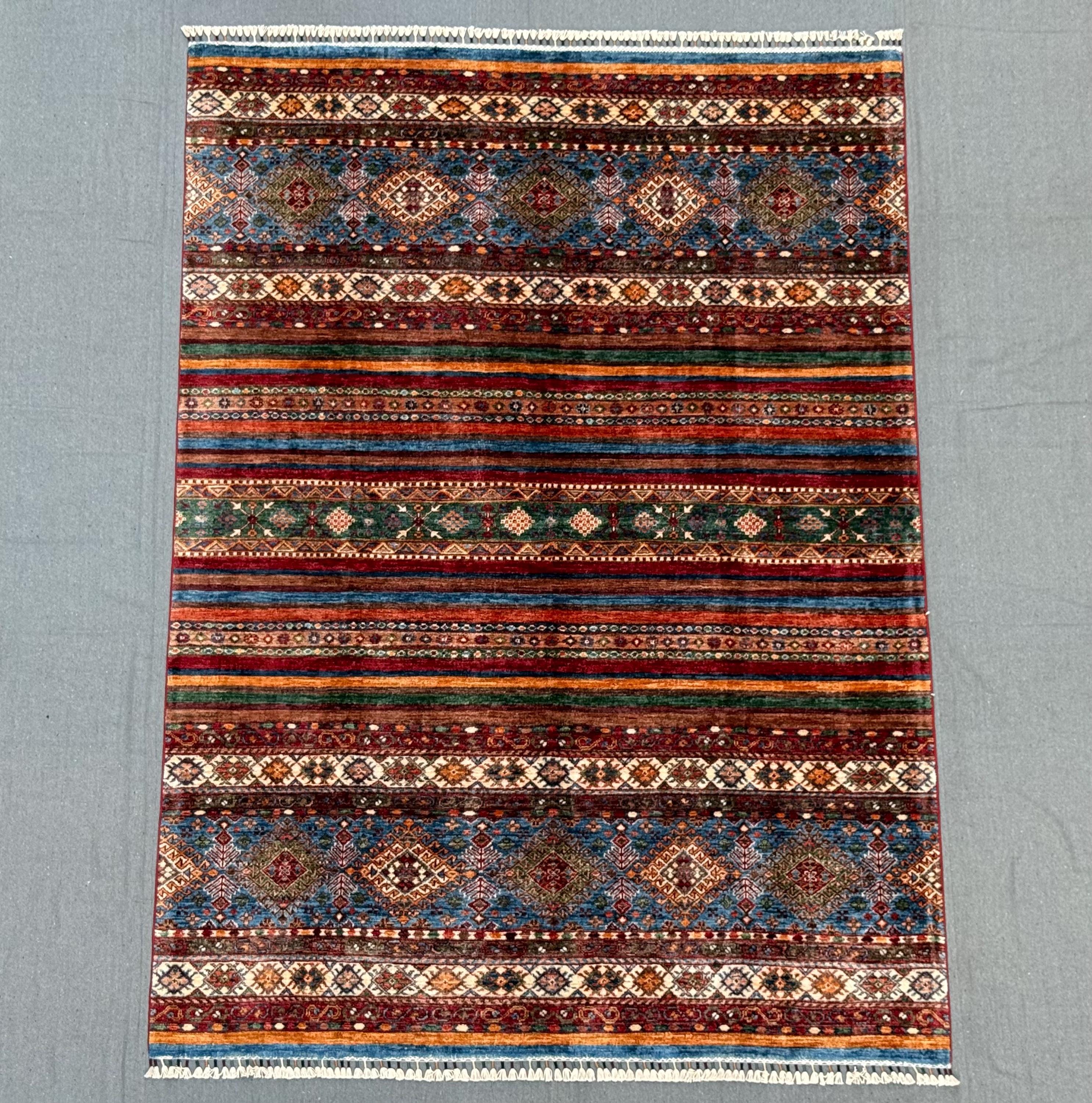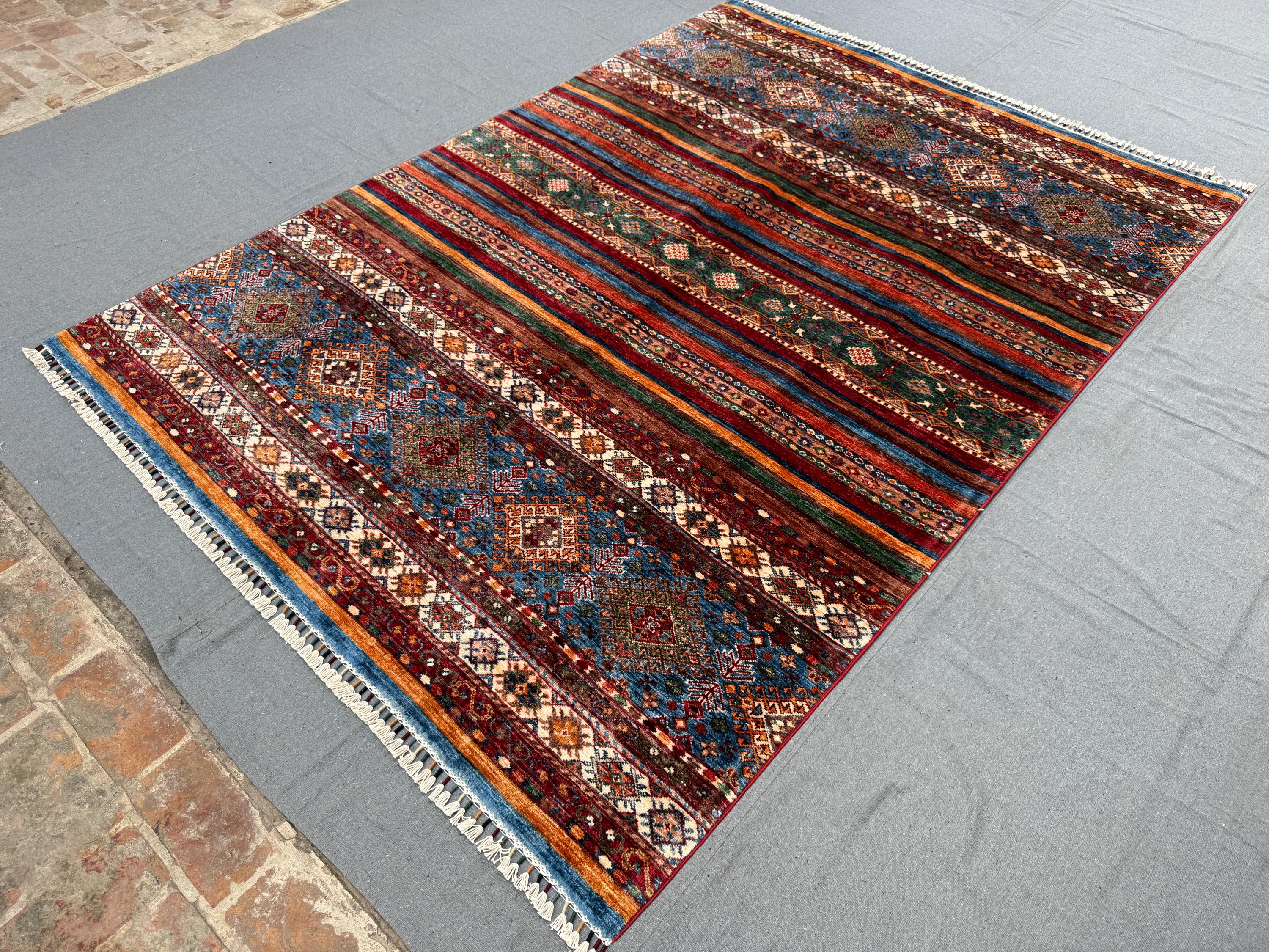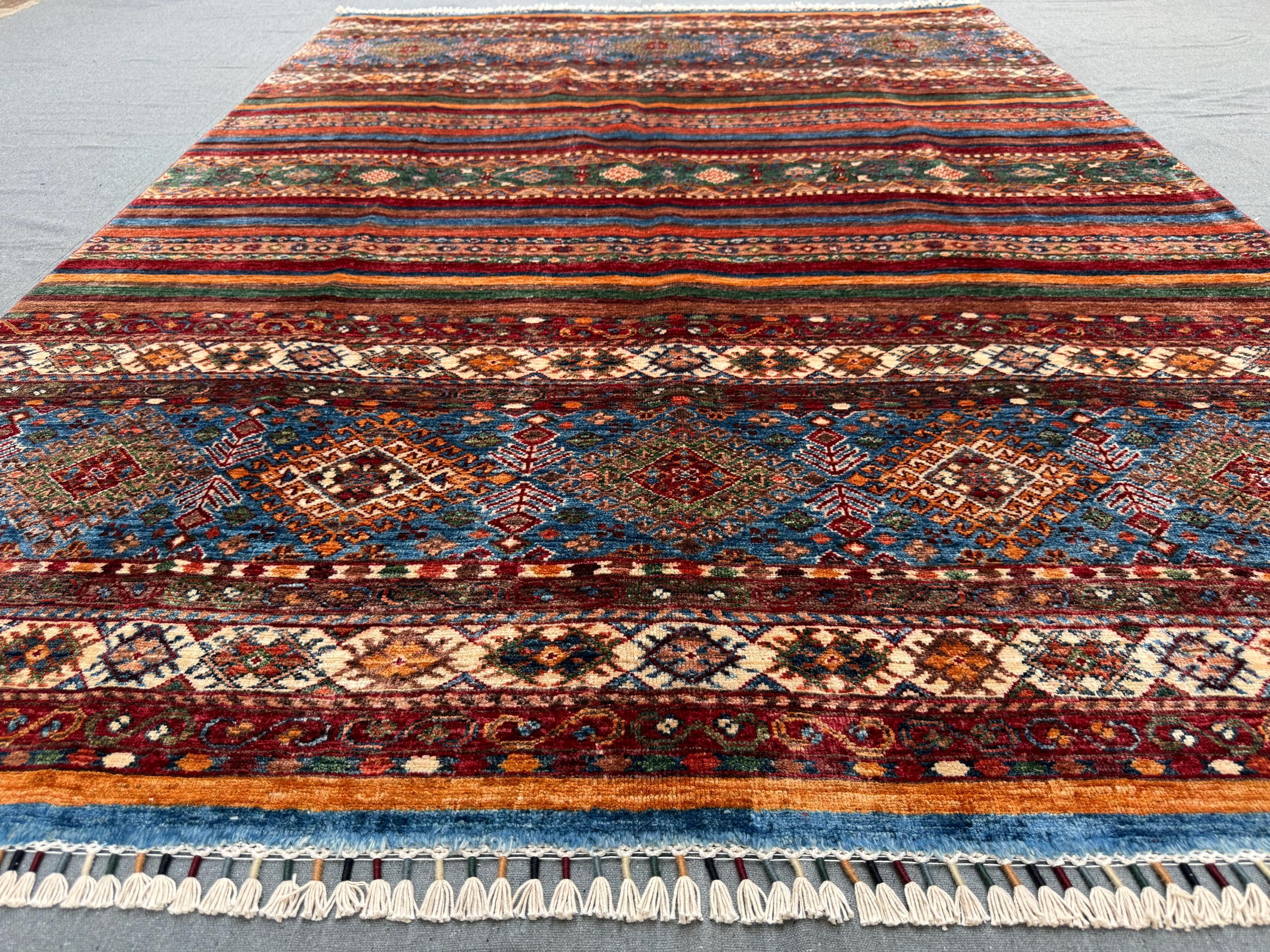Handmade Khorjin Modern Rug 6x8 | Colorful Wool Tribal Area Rug | Striped Boho Carpet | Hand Knotted Modern Living Room Wool Rug