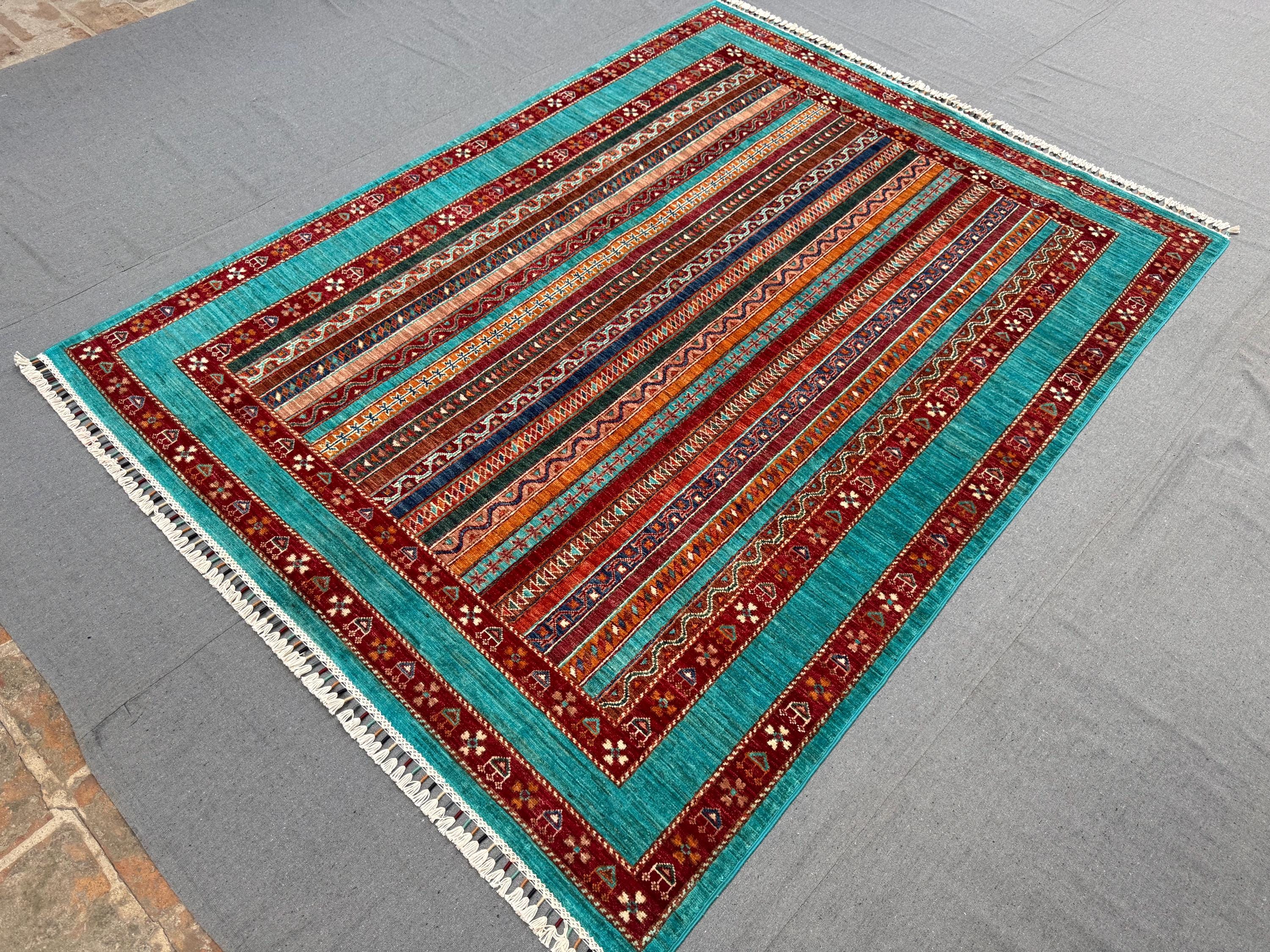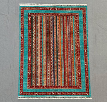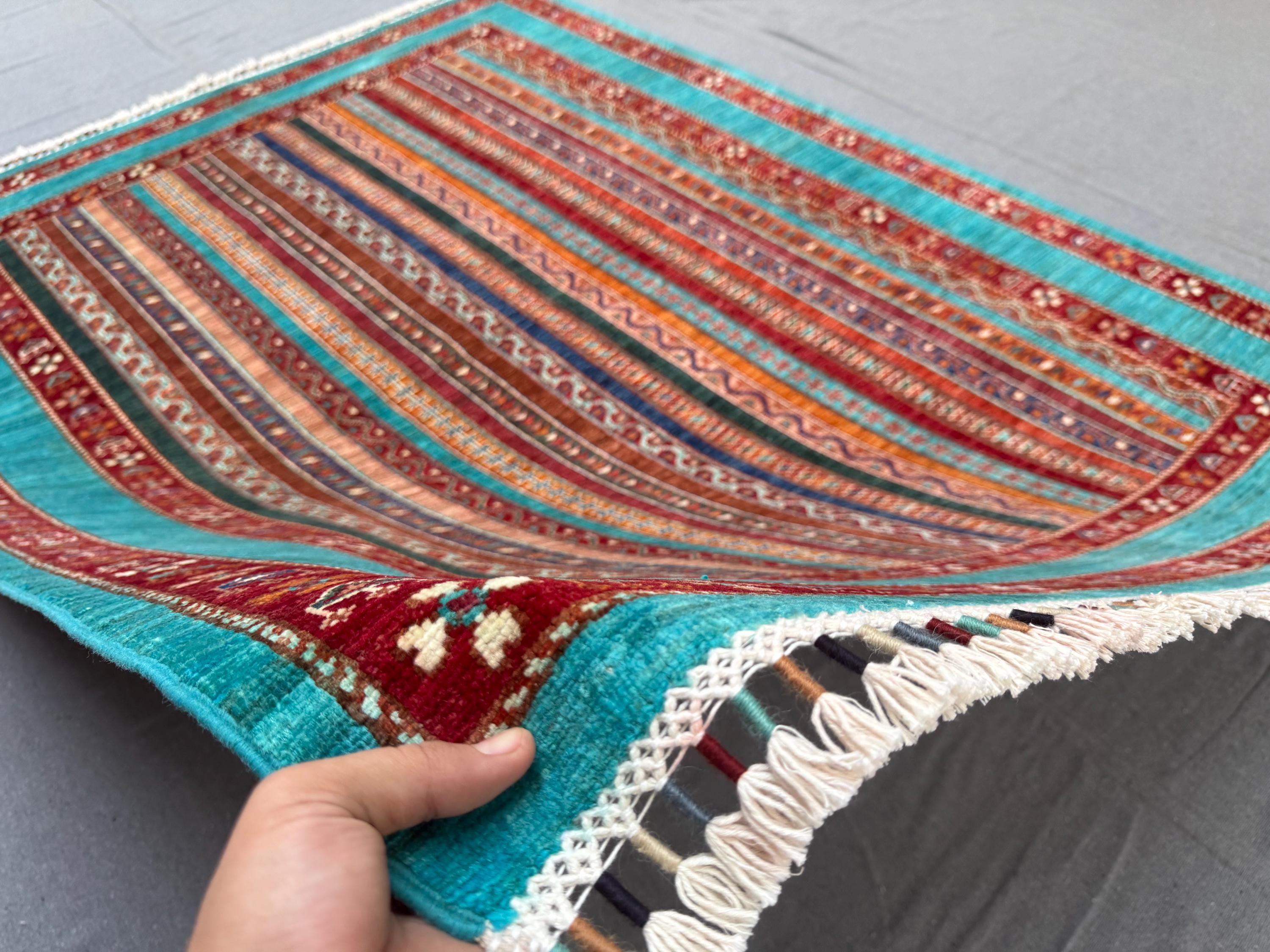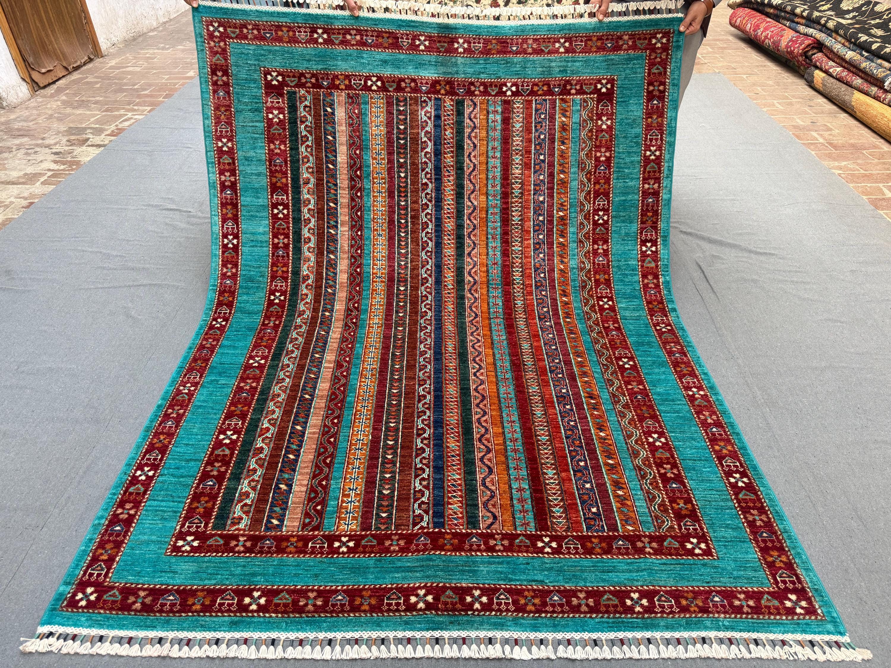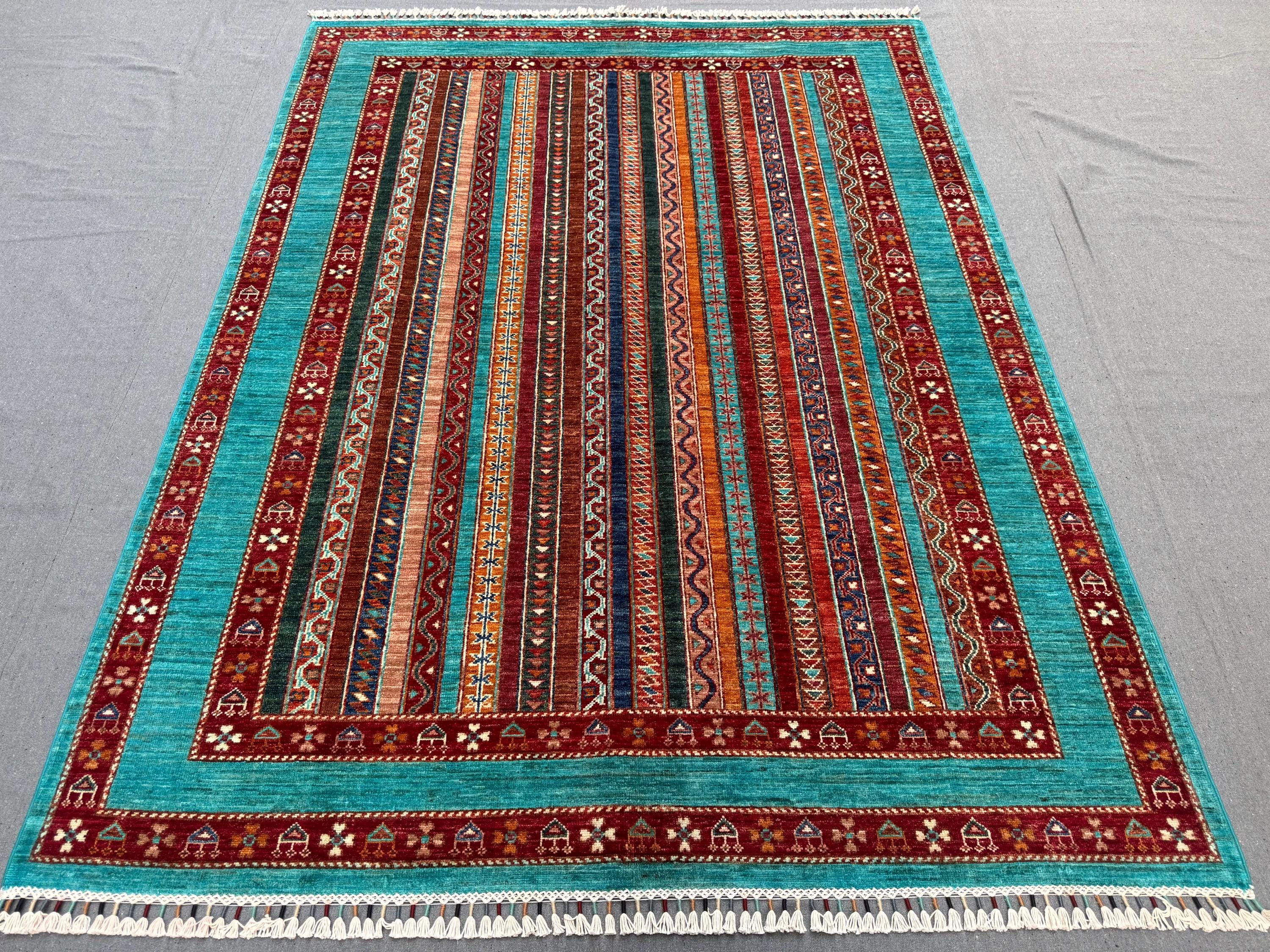 Handmade Shawl Rug 5x7 ft Colorful Striped Wool Area Carpet with Turquoise Border Boho Vibrant Design for Living Room & Home Decor