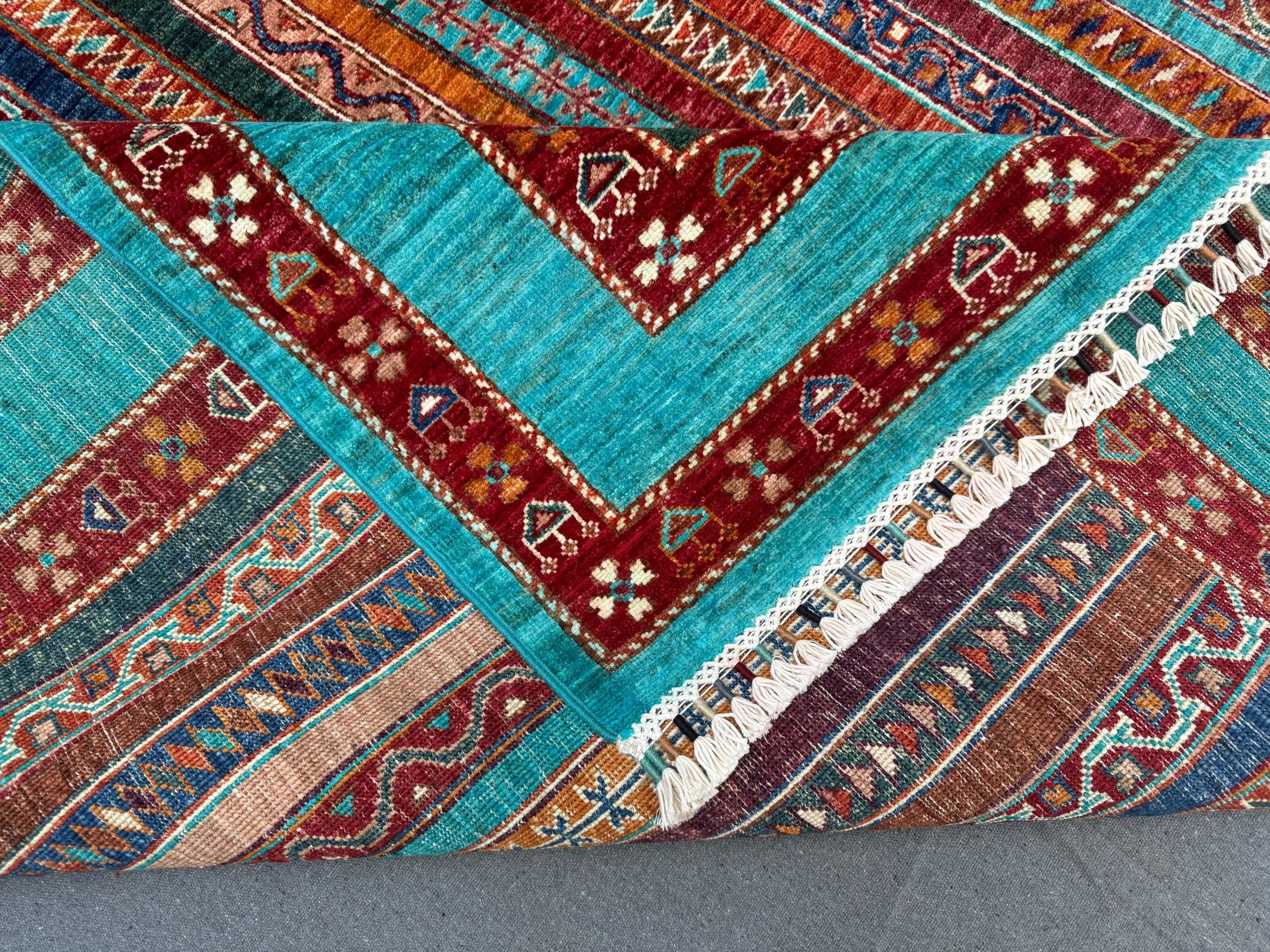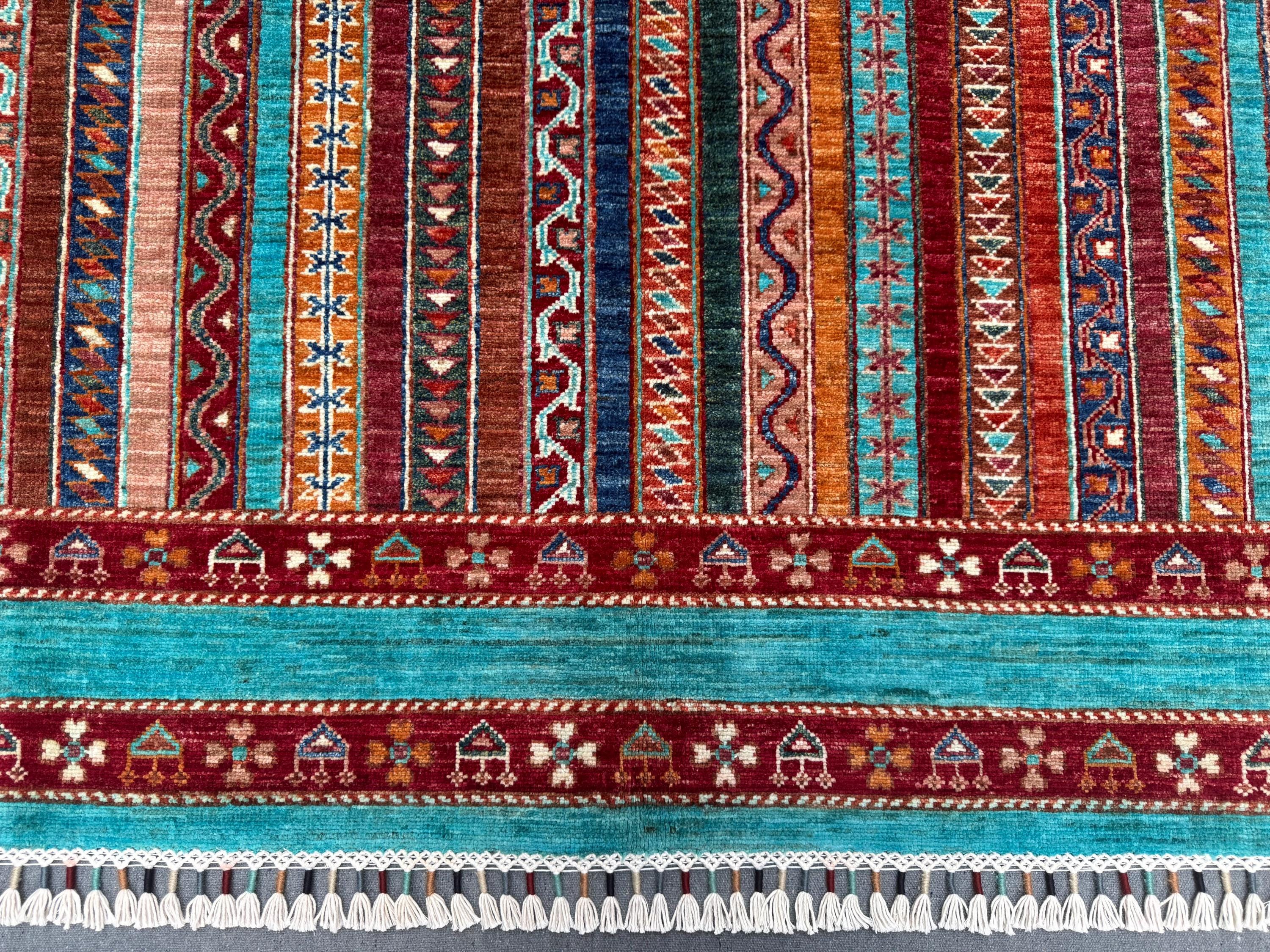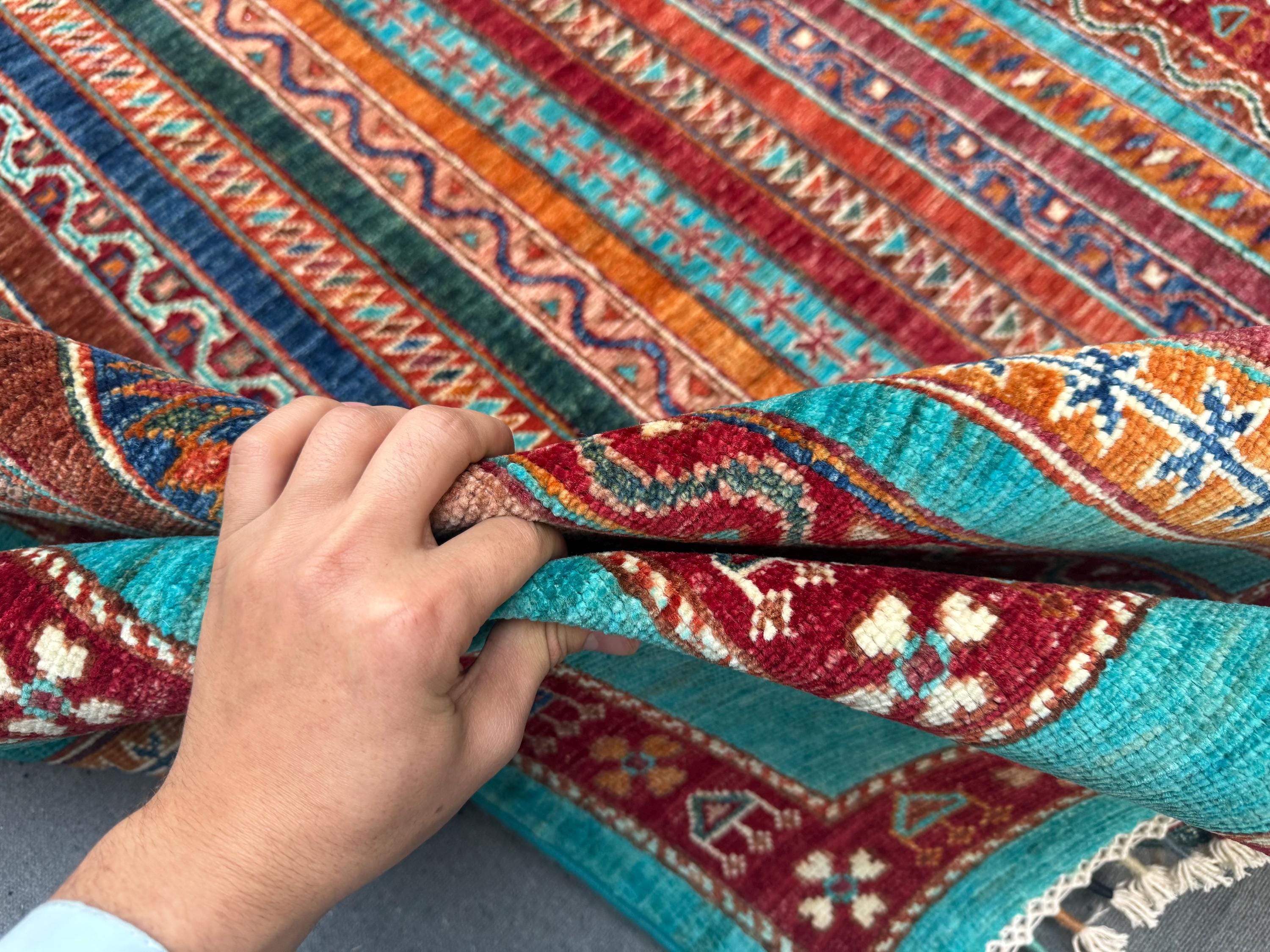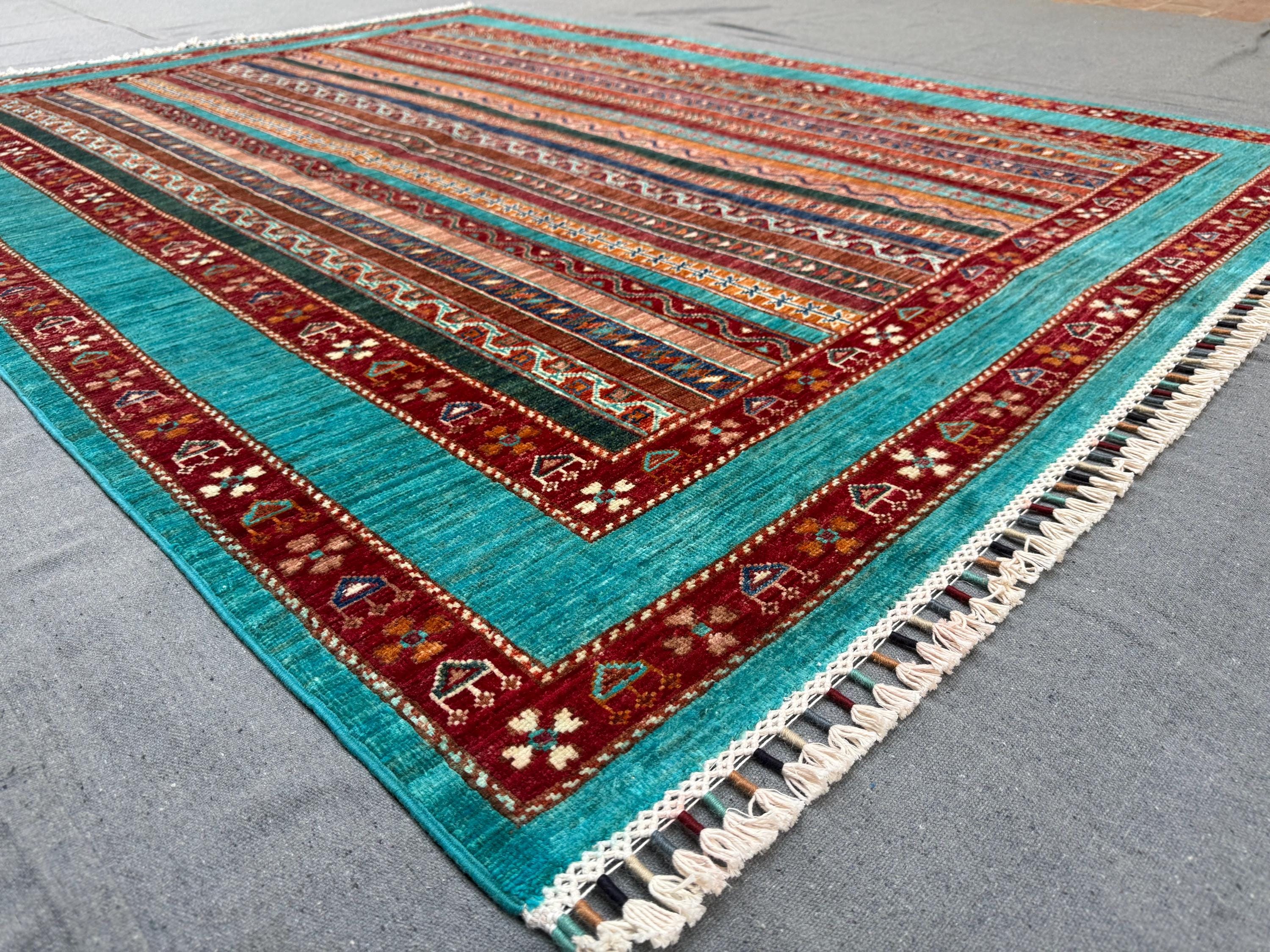 Handmade Shawl Rug 5x7 ft Colorful Striped Wool Area Carpet with Turquoise Border Boho Vibrant Design for Living Room & Home Decor