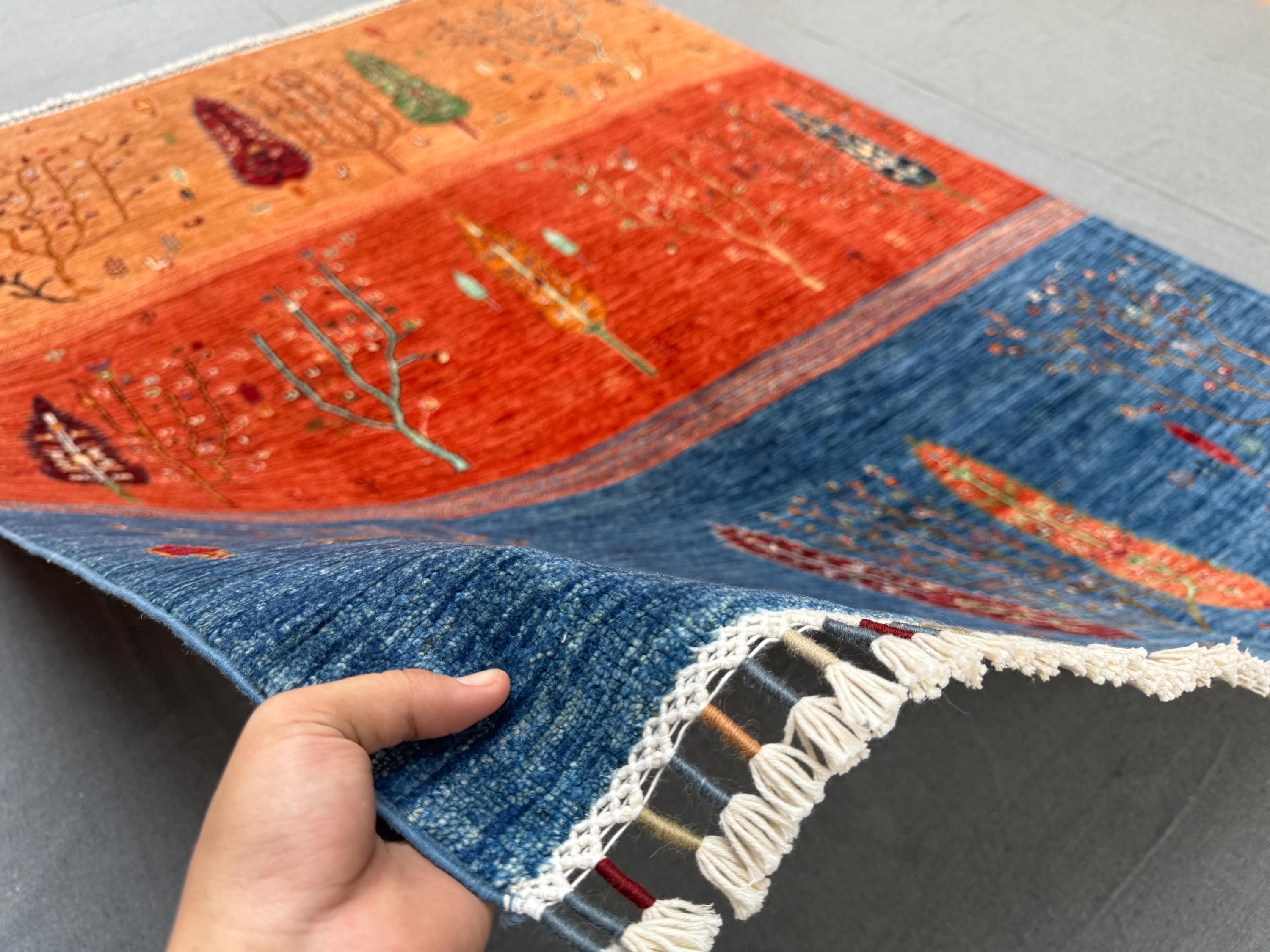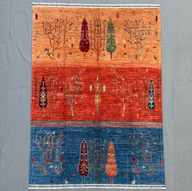 The bold gradient background gives the rug a modern, boho feel, while the detailed trees add a touch of storytelling and craftsmanship. Woven from soft, durable wool, this rug feels warm underfoot and adds a rich, textured look to any space.