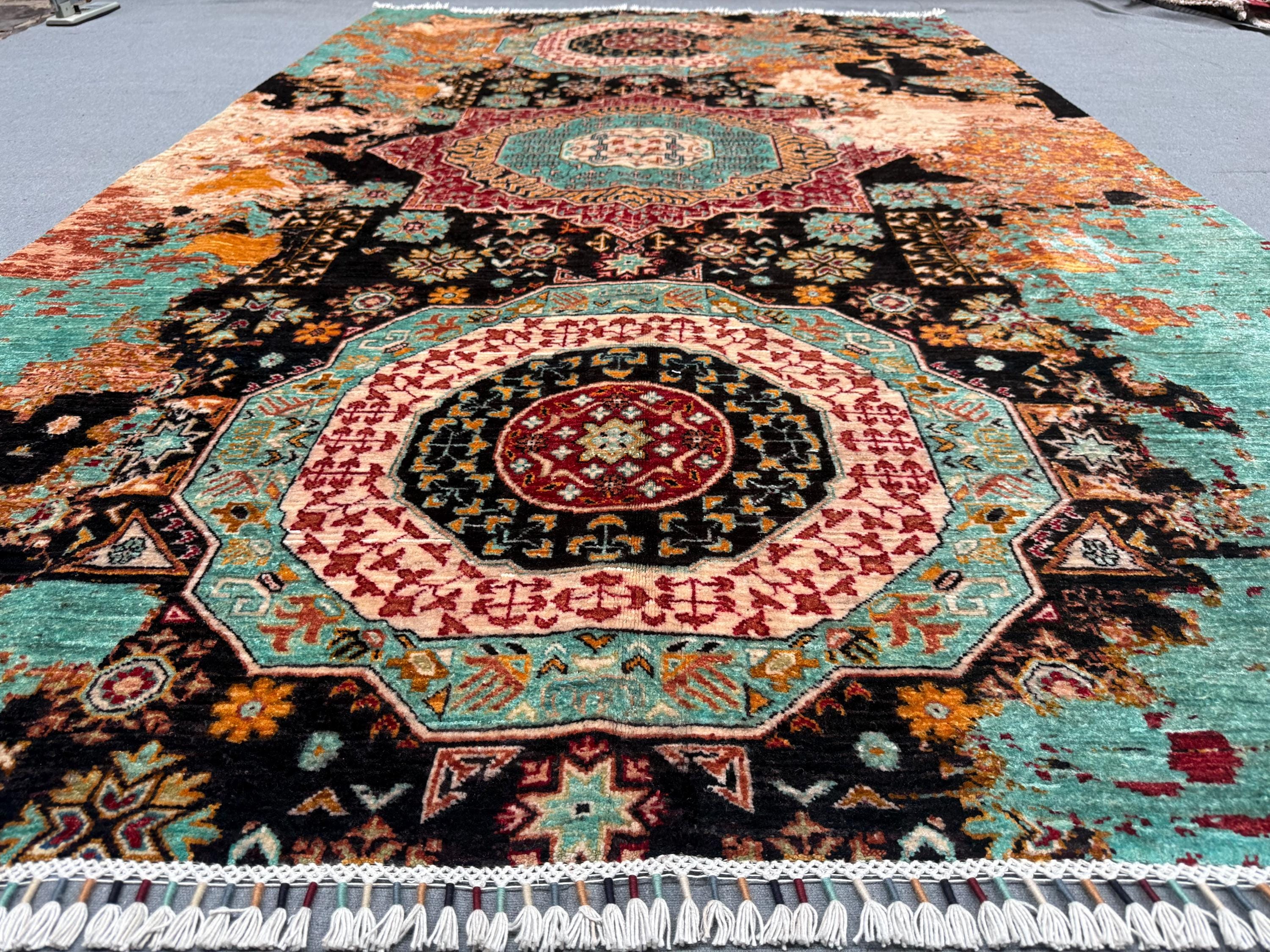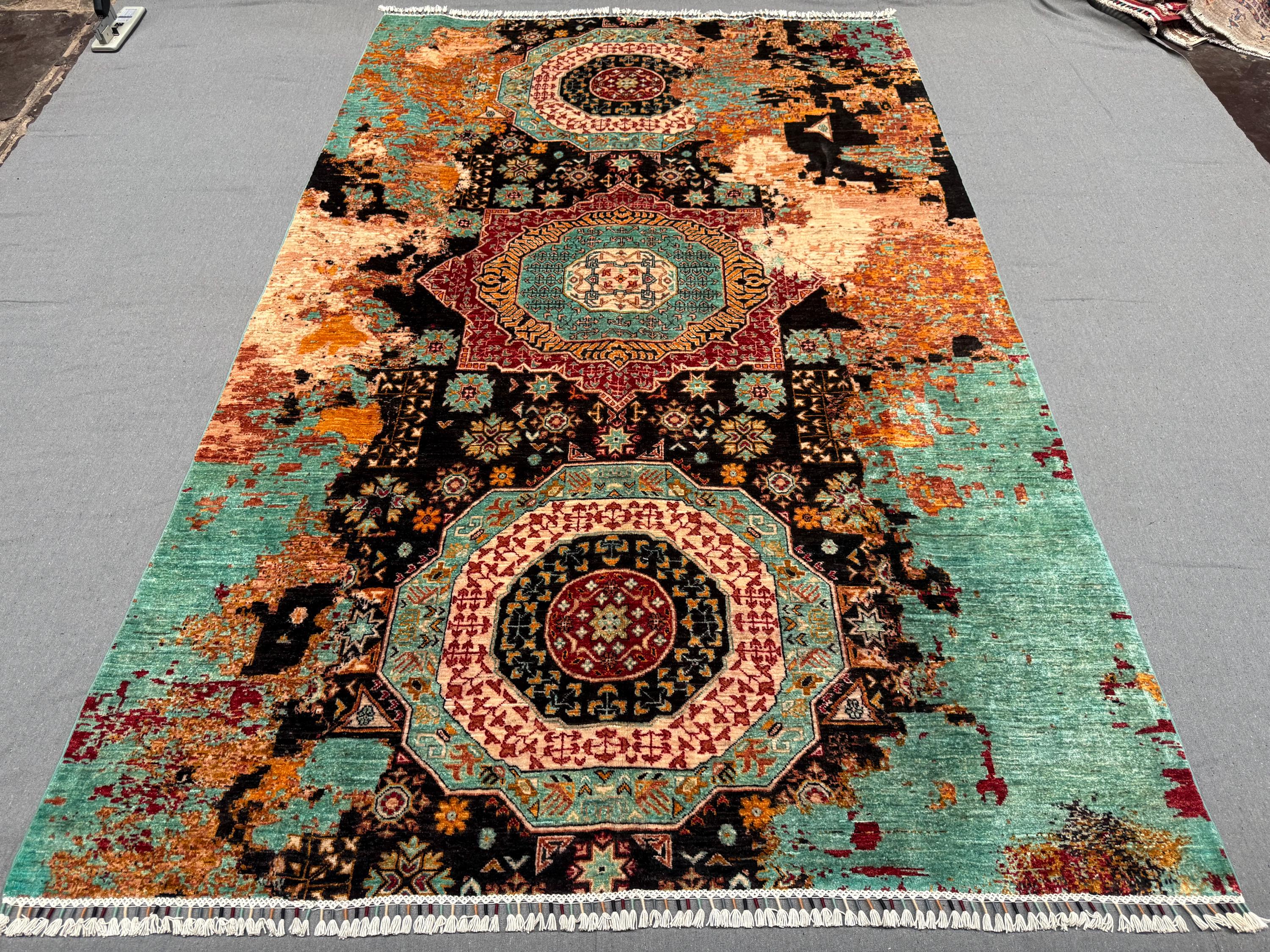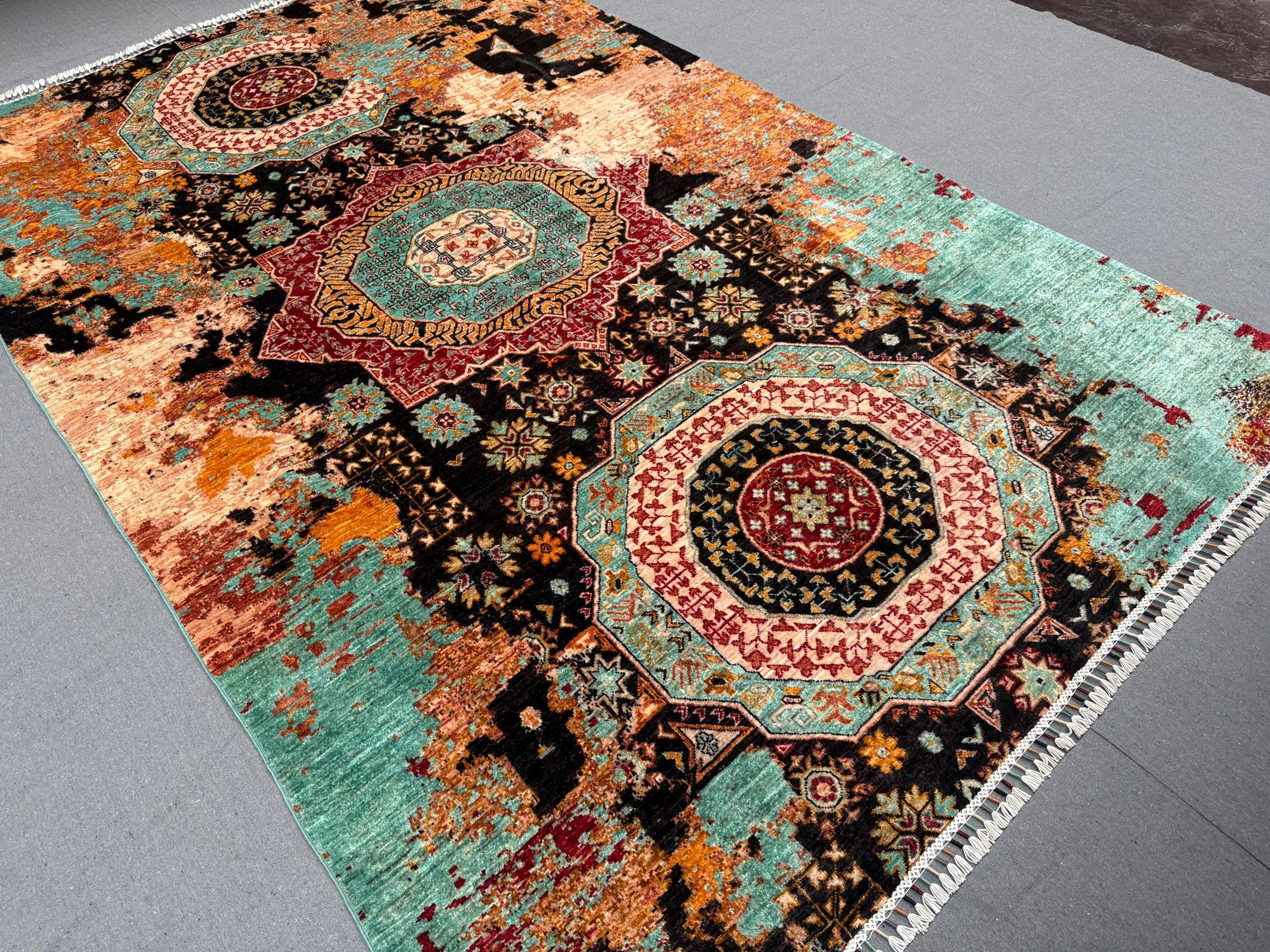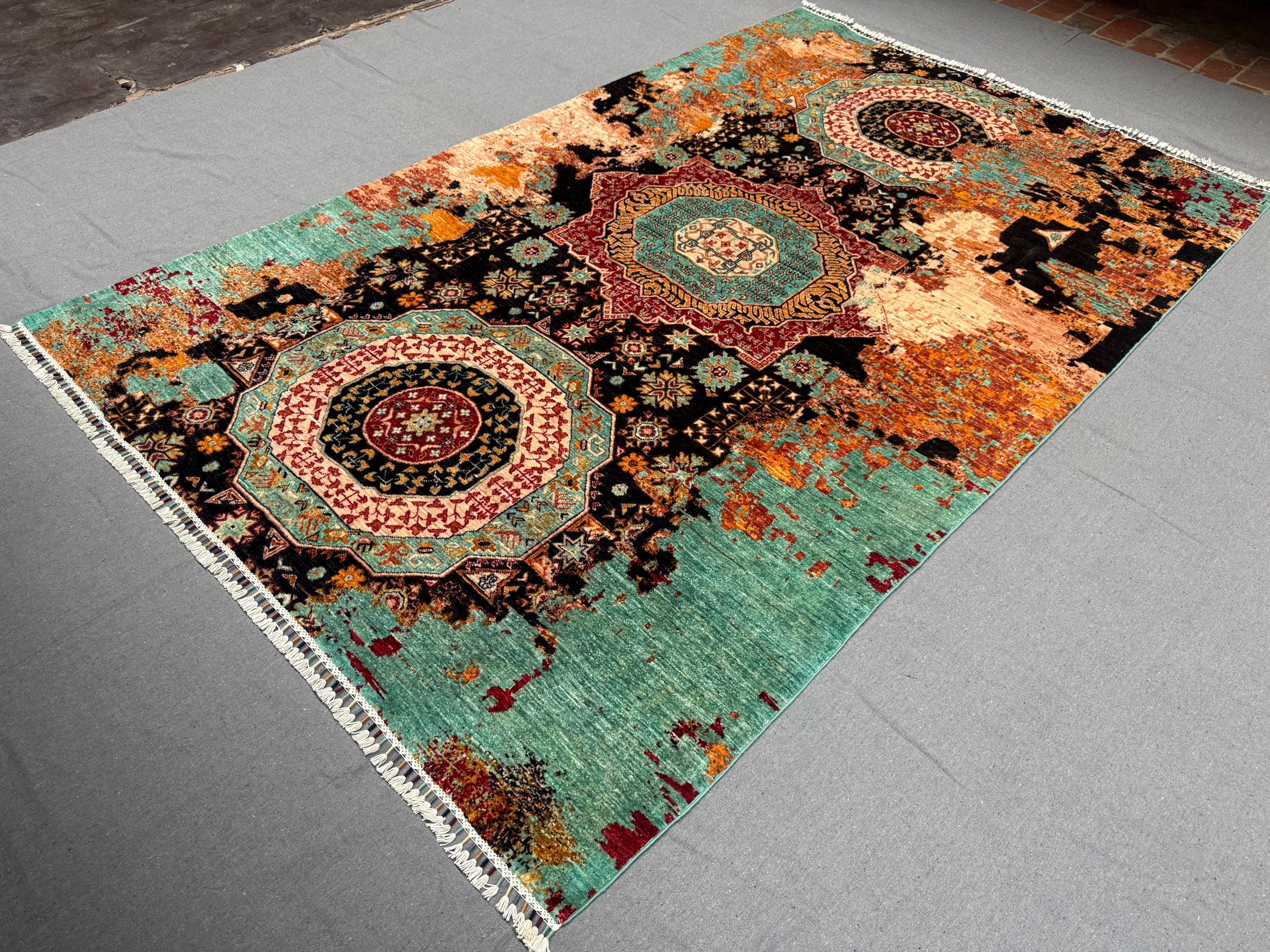 This handmade Mamluk rug blends traditional geometric medallions with a bold distressed design, creating a dramatic and artistic centerpiece. Rich tones of teal, rust, burgundy, black, cream, and gold form a vibrant, textured background around layered Mamluk medallions, giving the rug both depth and modern flair.